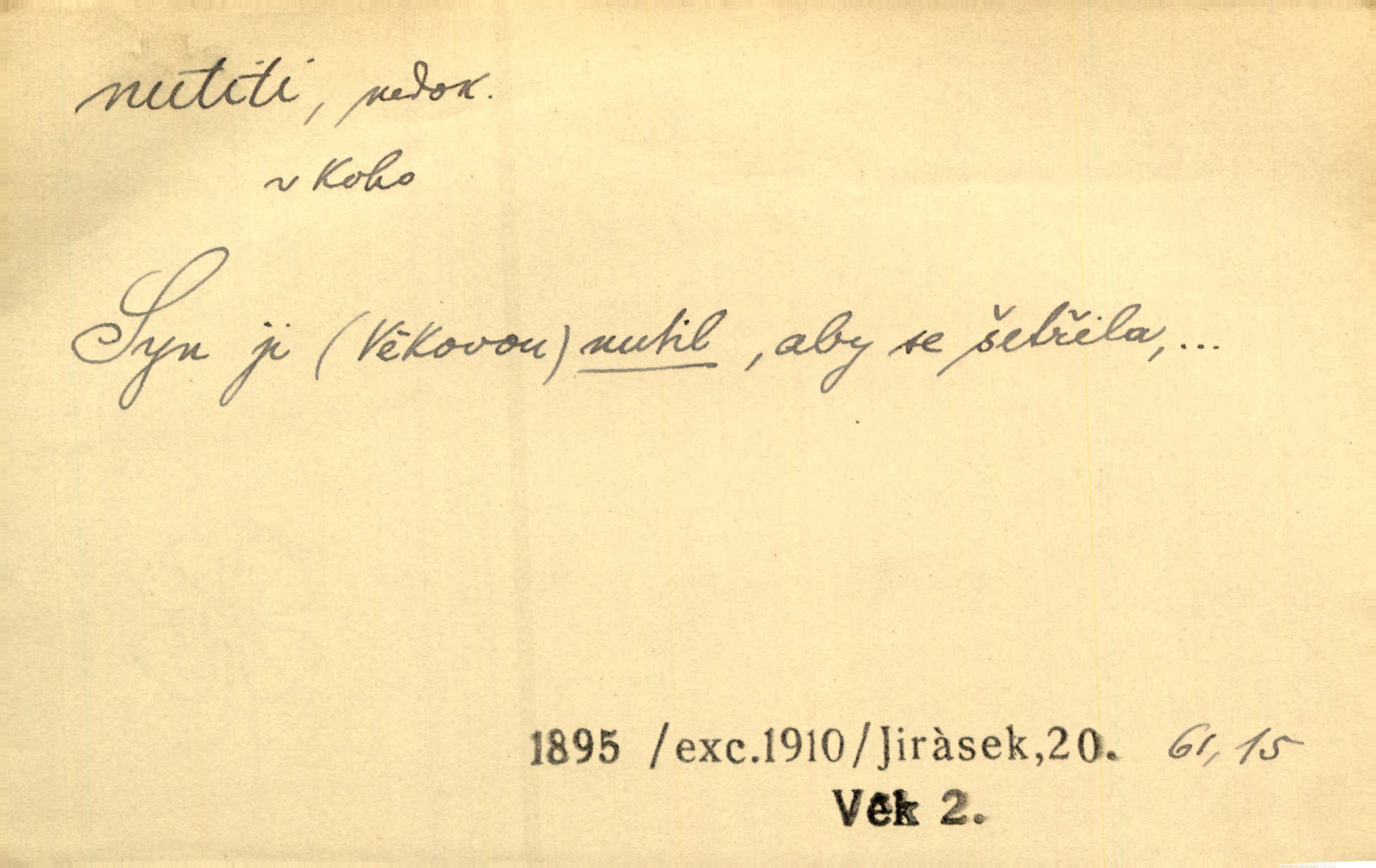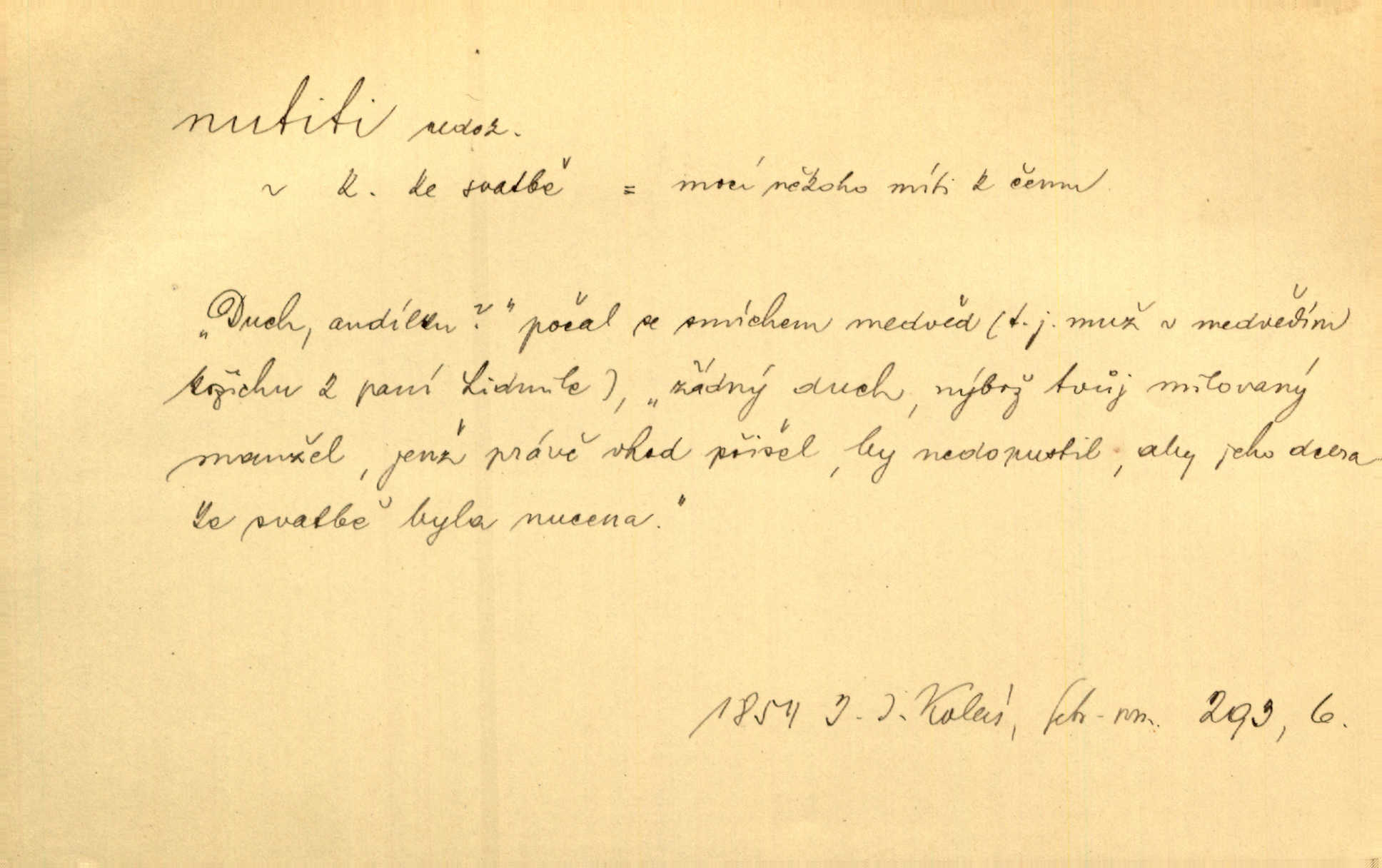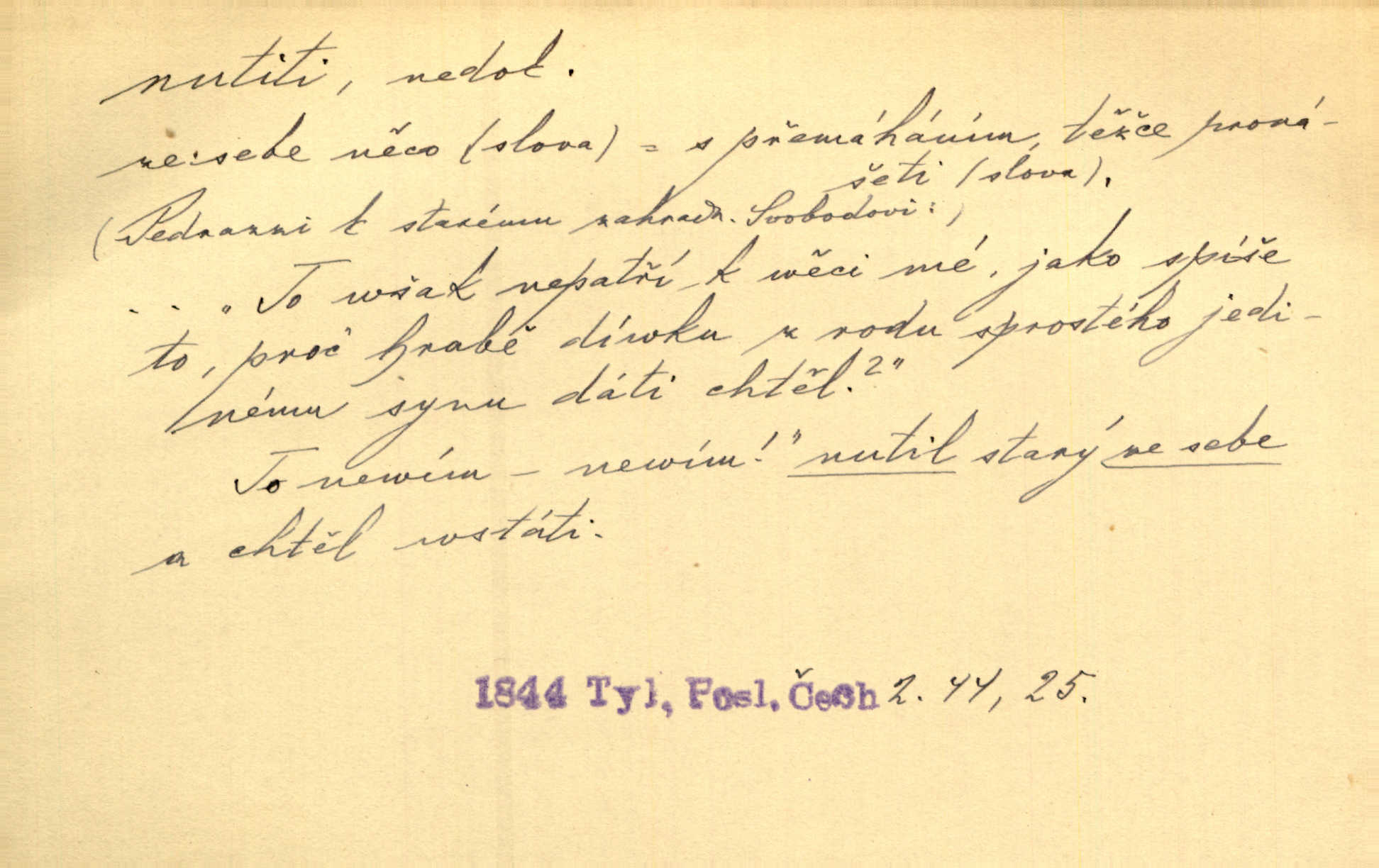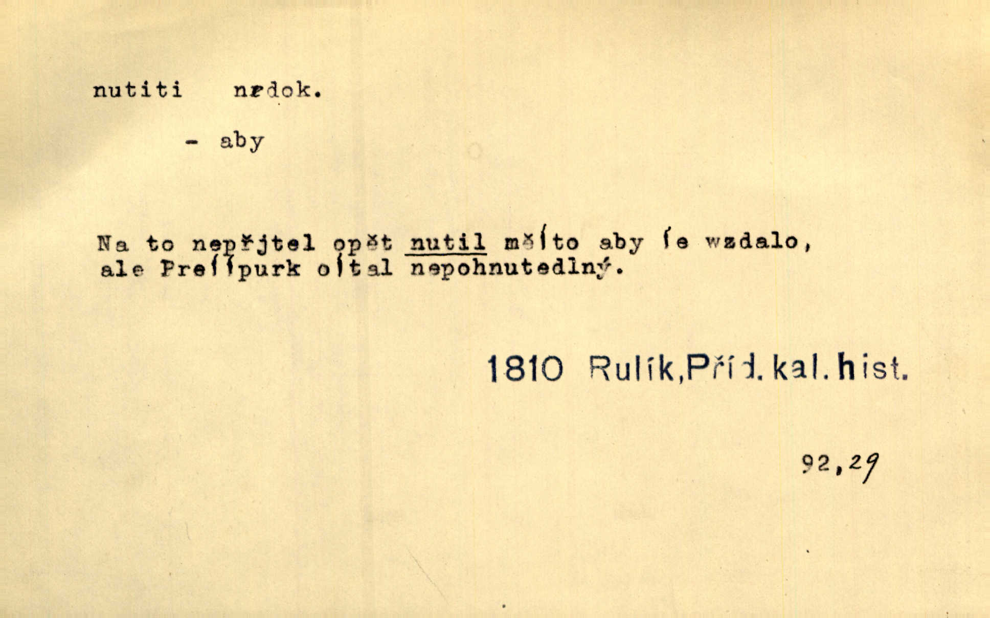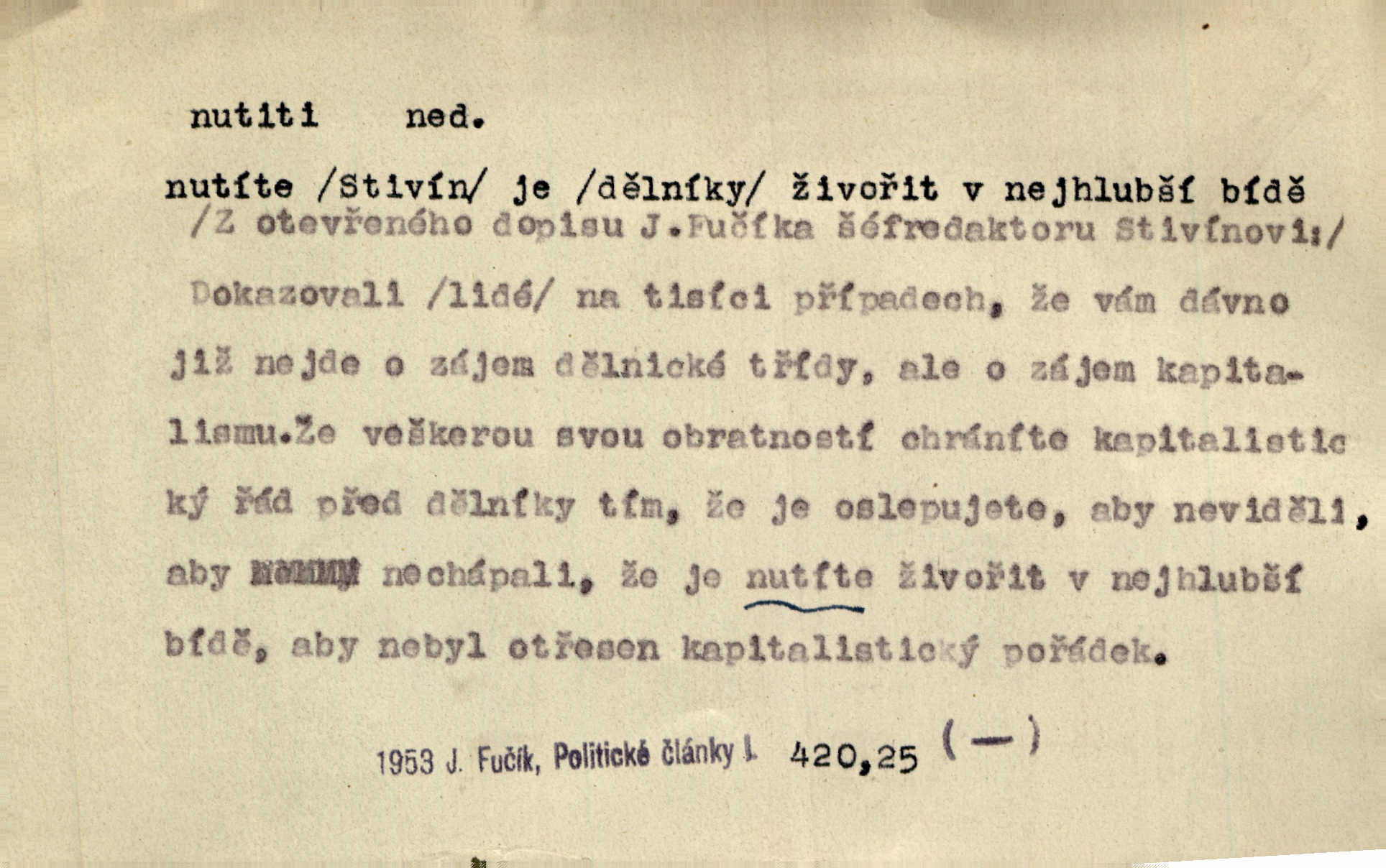 - nutiti ned. (koho k čemu, do čeho, kam a pod.) důtklivě, naléhavě, důrazně pobízeti, vybízeti, vésti. „Nechte mě, nenuťte mě,“ bránila se kamarádkám, nutícím ji k tanci. V. Mrš. Pouhá nouze, strach před škodou nutí jej [člověka] k chytrosti. Durd. Nedopustil, aby jeho dcera ke svatbě byla nucena. J. J. Kol. Škoda je Ješka; nerozuma otec, že ho k té ochechuli nutí. Jan. To už byl tak její [hostinské] „zvyk“, nutit do pití a do hry. V. Mrš. [Hospodáři] cpou do dýmek a nutí hosty do piva. Just. Později si školu sám zamiloval, a již nebylo třeba, aby ho do ní nutili. Prav. První [maminčin milenec] zmizl a do druhýho bába maminku nutila. Čap. Ch. [Caterina] nutila jej zpět na divan, konejšila jej slovy a polibky. Zey. Matku jsem neměl, a poručník na řemeslo nutil. Jir. „Sedláčkové“ aby o zadržené ouroky nebyli nuceni. Pal. Kdo u Štěpánů jen jednou pojedl, nutil ženu, aby se pozeptala, jak Helena to ono strojí. Prav. Vrchnost musila lidi nutit, aby se na opuštěných živnostech usazovali. Jir. I nepřítele nutil klekat k nohoum svým. Jan. Nucen byl, na několik okamžení se posadit na kamennou lavičku musil. Květy. Jsem nucena s tebou mluviti, jak dívka mluviti snad nemá. Zey. Nespokojenost v zemi tak velice se byla rozmohla, že císař nucena se viděl vyjednávati s ní. Pal. Doktor neodpověděl, Bohutínský byl nucen pokračovati. Arb. D (co komu) naléhavě nabízeti. Posadili jej za stůl a nutili mu plný talíř polévky. Wolk. [Pensista] doma kaktusy pěstuje a jeden exemplář mi nutí v úsměvu. Sova. D (co odkud, kam) s překonáváním obtíží, překážek, odporu, nesnází vykonávati, prováděti, dosahovati, někam n. odněkud dostávati a pod. Nutil kolem rtů rozpustilý úsměv. Svob. Voral kývaje nutil smích. Rais. Přemáhal zlost a nutil do sebe zbytek kávy. Herrm. Ret v úsměv nutí [Hus]. Špind. „To nevím — nevím!“ nutil starý ze sebe a chtěl vstáti. Tyl. „Ano, to je plátno,“ nutila domácí paní ze sebe v rozpacích. Ner. Zaťukal — zaprosil, po případě i zahromoval si náš kancelista na Fáfka i na ostatní podobné šosáčky a nutil z nich, čeho právě potřeboval: podpisy, staré obleky, cupaninu, peníze — jako čaroděj! Štech. Stál tu [před otcem]‚ jako stává obviněnec před soudem, když nutí z něho výpověď přisvědčující. Třeb. D nutiti se (do čeho, k čemu, kam a pod.) s námahou, s přemáháním obtíží o něco usilovati, snažiti se. „Dívku beze věna? — Toho za našich dob nebývá,“ nutila se hraběnka k žertu. Bozd. Já myslím, že se Olšovský k tomu velice nutil, a to mne urazilo. Pfleg. Musila se k němu ještě teď tak nutit. Svět. Králenec se nutil do úsměvu. Hol. Neměla zájmu na politice, nutila se do toho. R. Svob. V duchu se zalekl, ale nutil se, aby jeho hlas zněl přísně. Jir. Antikvář, maje knihu s tolika stran již zamluvenou, nutil se, aby ji koupil. Stroup. Děvče se nutilo, a ač její kuchyňské vědomosti nebyly příliš rozšířeny, přece dovedla všecko ku spokojenosti starého Procházky. Pfleg. „Na vyčištění svého domu budeme muset asi rukou statečně přiložiti“. „Budeme se nutiti dost a dost“. Ehrenb.
