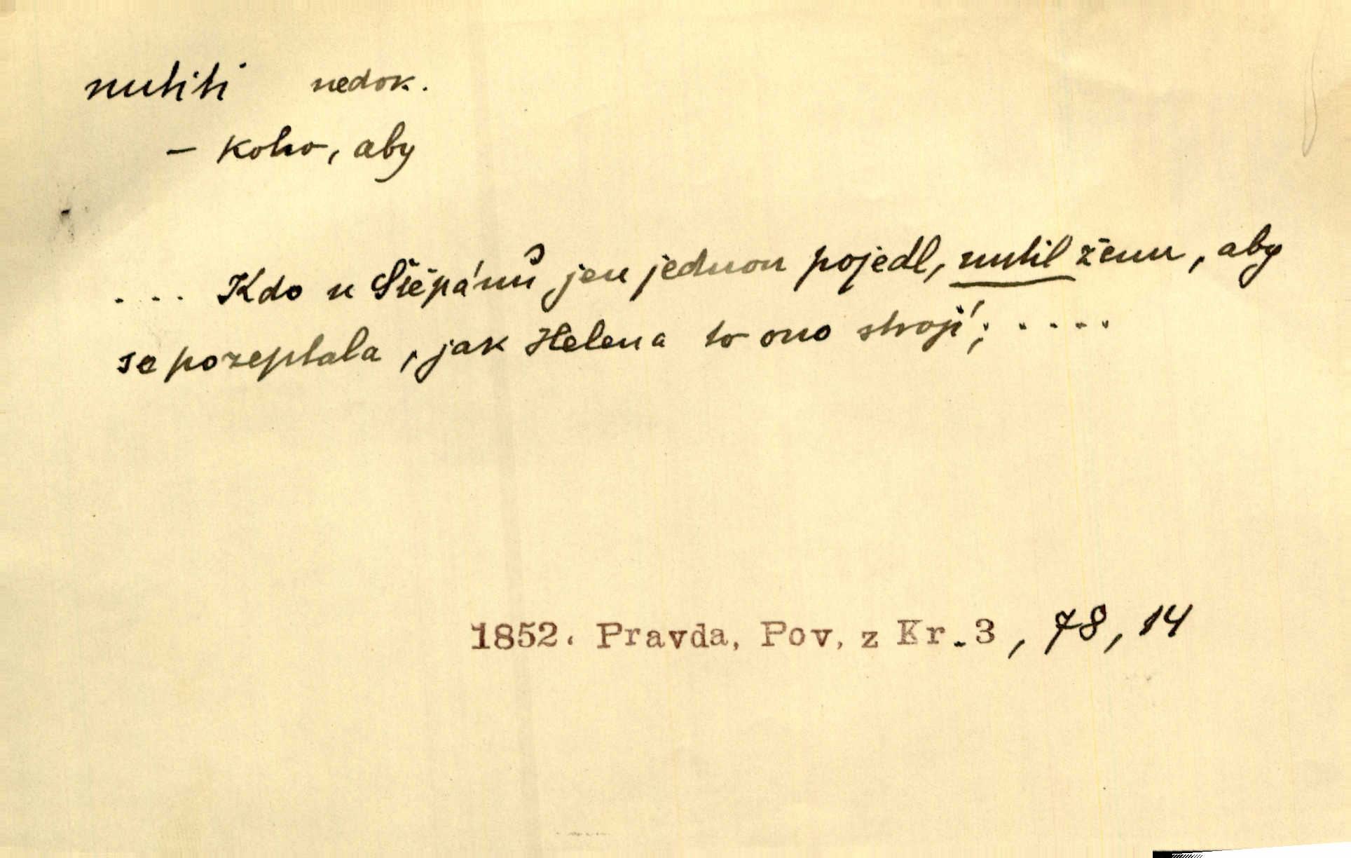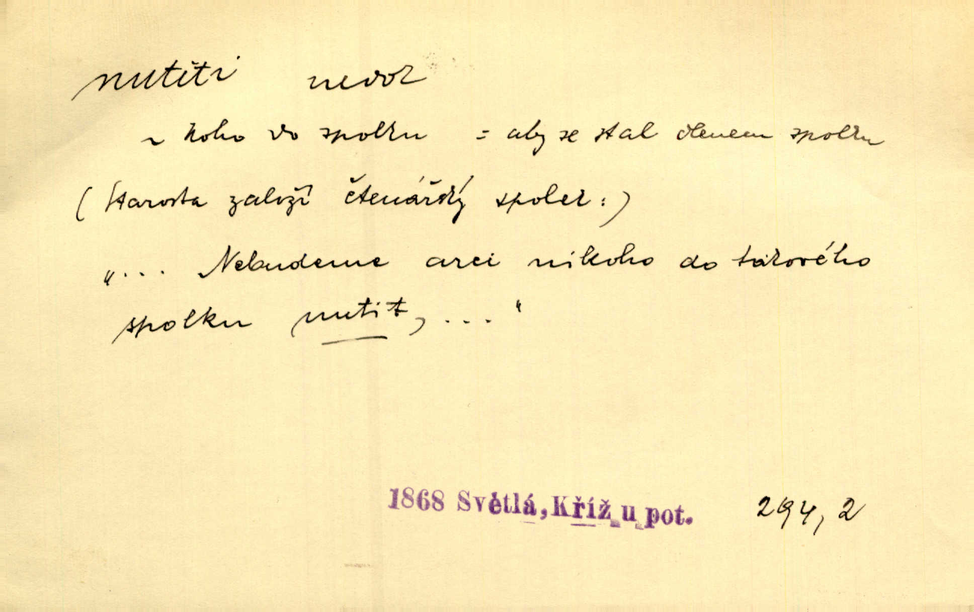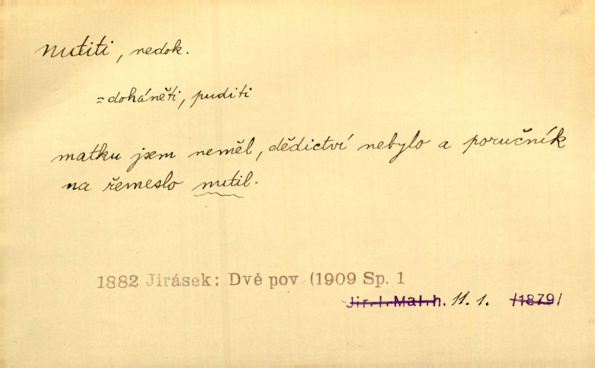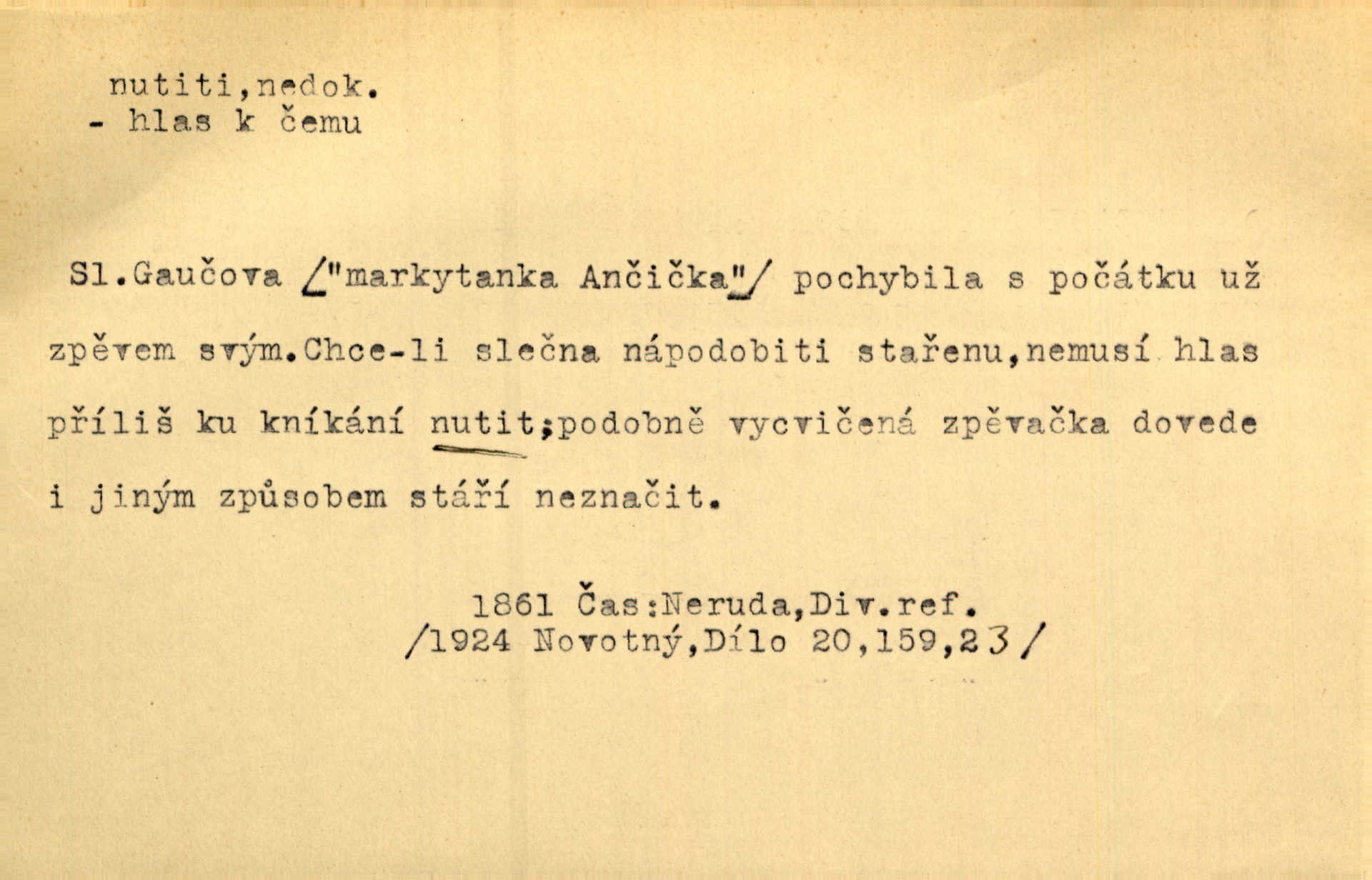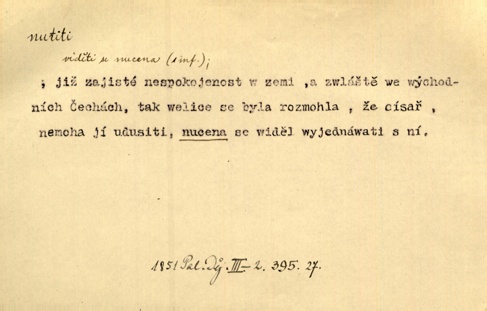 - nutiti ned. (koho k čemu, do čeho, kam a pod.) důtklivě, naléhavě, důrazně pobízeti, vybízeti, vésti. „Nechte mě, nenuťte mě,“ bránila se kamarádkám, nutícím ji k tanci. V. Mrš. Pouhá nouze, strach před škodou nutí jej [člověka] k chytrosti. Durd. Nedopustil, aby jeho dcera ke svatbě byla nucena. J. J. Kol. Škoda je Ješka; nerozuma otec, že ho k té ochechuli nutí. Jan. To už byl tak její [hostinské] „zvyk“, nutit do pití a do hry. V. Mrš. [Hospodáři] cpou do dýmek a nutí hosty do piva. Just. Později si školu sám zamiloval, a již nebylo třeba, aby ho do ní nutili. Prav. První [maminčin milenec] zmizl a do druhýho bába maminku nutila. Čap. Ch. [Caterina] nutila jej zpět na divan, konejšila jej slovy a polibky. Zey. Matku jsem neměl, a poručník na řemeslo nutil. Jir. „Sedláčkové“ aby o zadržené ouroky nebyli nuceni. Pal. Kdo u Štěpánů jen jednou pojedl, nutil ženu, aby se pozeptala, jak Helena to ono strojí. Prav. Vrchnost musila lidi nutit, aby se na opuštěných živnostech usazovali. Jir. I nepřítele nutil klekat k nohoum svým. Jan. Nucen byl, na několik okamžení se posadit na kamennou lavičku musil. Květy. Jsem nucena s tebou mluviti, jak dívka mluviti snad nemá. Zey. Nespokojenost v zemi tak velice se byla rozmohla, že císař nucena se viděl vyjednávati s ní. Pal. Doktor neodpověděl, Bohutínský byl nucen pokračovati. Arb. D (co komu) naléhavě nabízeti. Posadili jej za stůl a nutili mu plný talíř polévky. Wolk. [Pensista] doma kaktusy pěstuje a jeden exemplář mi nutí v úsměvu. Sova. D (co odkud, kam) s překonáváním obtíží, překážek, odporu, nesnází vykonávati, prováděti, dosahovati, někam n. odněkud dostávati a pod. Nutil kolem rtů rozpustilý úsměv. Svob. Voral kývaje nutil smích. Rais. Přemáhal zlost a nutil do sebe zbytek kávy. Herrm. Ret v úsměv nutí [Hus]. Špind. „To nevím — nevím!“ nutil starý ze sebe a chtěl vstáti. Tyl. „Ano, to je plátno,“ nutila domácí paní ze sebe v rozpacích. Ner. Zaťukal — zaprosil, po případě i zahromoval si náš kancelista na Fáfka i na ostatní podobné šosáčky a nutil z nich, čeho právě potřeboval: podpisy, staré obleky, cupaninu, peníze — jako čaroděj! Štech. Stál tu [před otcem]‚ jako stává obviněnec před soudem, když nutí z něho výpověď přisvědčující. Třeb. D nutiti se (do čeho, k čemu, kam a pod.) s námahou, s přemáháním obtíží o něco usilovati, snažiti se. „Dívku beze věna? — Toho za našich dob nebývá,“ nutila se hraběnka k žertu. Bozd. Já myslím, že se Olšovský k tomu velice nutil, a to mne urazilo. Pfleg. Musila se k němu ještě teď tak nutit. Svět. Králenec se nutil do úsměvu. Hol. Neměla zájmu na politice, nutila se do toho. R. Svob. V duchu se zalekl, ale nutil se, aby jeho hlas zněl přísně. Jir. Antikvář, maje knihu s tolika stran již zamluvenou, nutil se, aby ji koupil. Stroup. Děvče se nutilo, a ač její kuchyňské vědomosti nebyly příliš rozšířeny, přece dovedla všecko ku spokojenosti starého Procházky. Pfleg. „Na vyčištění svého domu budeme muset asi rukou statečně přiložiti“. „Budeme se nutiti dost a dost“. Ehrenb.