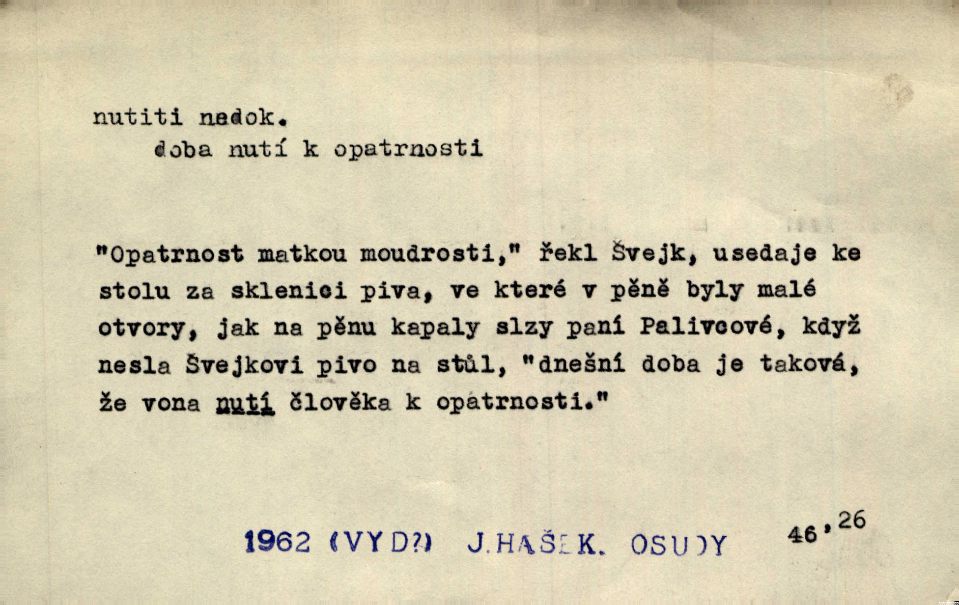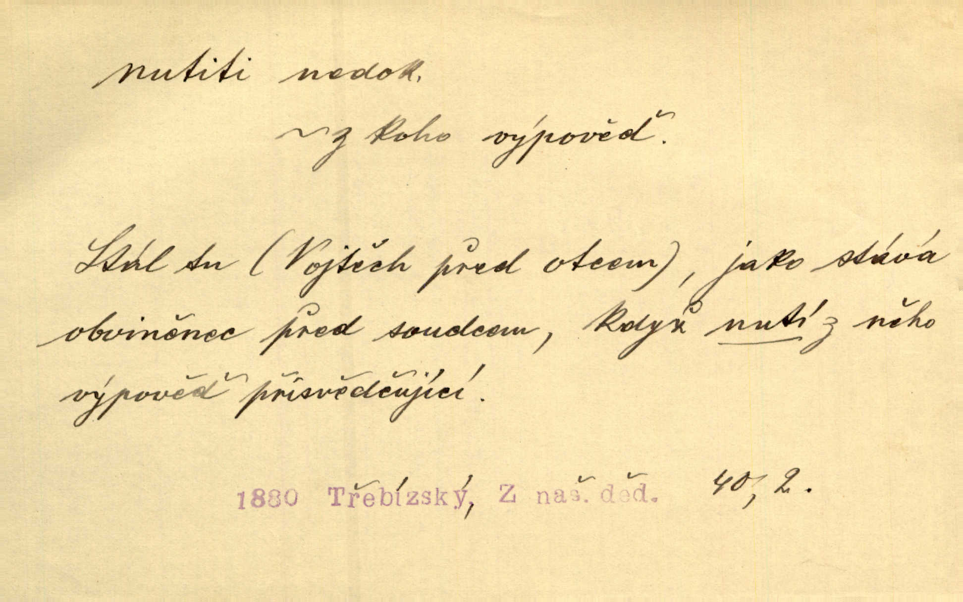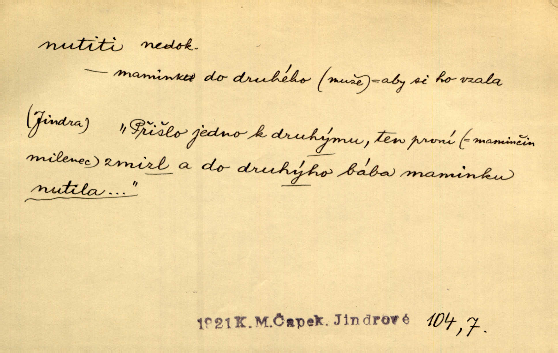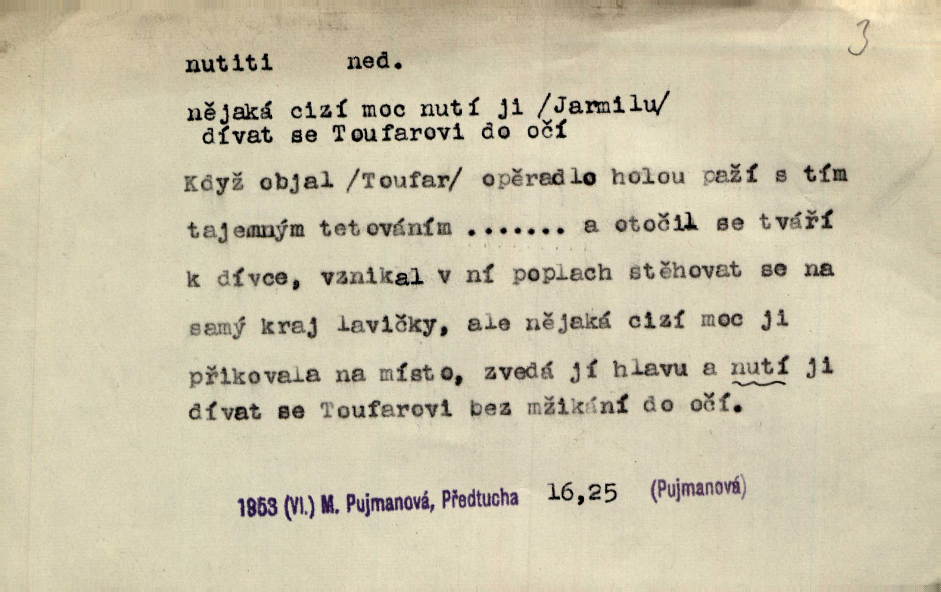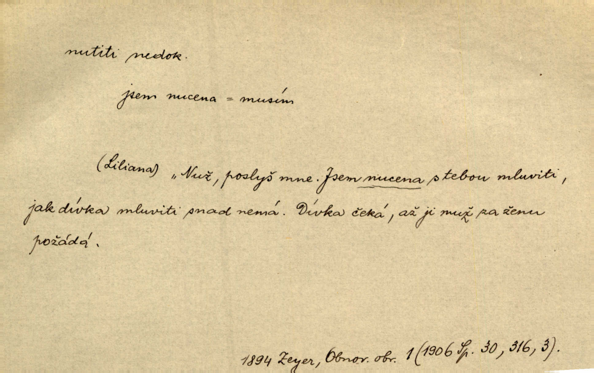 - nutiti ned. (koho k čemu, do čeho, kam a pod.) důtklivě, naléhavě, důrazně pobízeti, vybízeti, vésti. „Nechte mě, nenuťte mě,“ bránila se kamarádkám, nutícím ji k tanci. V. Mrš. Pouhá nouze, strach před škodou nutí jej [člověka] k chytrosti. Durd. Nedopustil, aby jeho dcera ke svatbě byla nucena. J. J. Kol. Škoda je Ješka; nerozuma otec, že ho k té ochechuli nutí. Jan. To už byl tak její [hostinské] „zvyk“, nutit do pití a do hry. V. Mrš. [Hospodáři] cpou do dýmek a nutí hosty do piva. Just. Později si školu sám zamiloval, a již nebylo třeba, aby ho do ní nutili. Prav. První [maminčin milenec] zmizl a do druhýho bába maminku nutila. Čap. Ch. [Caterina] nutila jej zpět na divan, konejšila jej slovy a polibky. Zey. Matku jsem neměl, a poručník na řemeslo nutil. Jir. „Sedláčkové“ aby o zadržené ouroky nebyli nuceni. Pal. Kdo u Štěpánů jen jednou pojedl, nutil ženu, aby se pozeptala, jak Helena to ono strojí. Prav. Vrchnost musila lidi nutit, aby se na opuštěných živnostech usazovali. Jir. I nepřítele nutil klekat k nohoum svým. Jan. Nucen byl, na několik okamžení se posadit na kamennou lavičku musil. Květy. Jsem nucena s tebou mluviti, jak dívka mluviti snad nemá. Zey. Nespokojenost v zemi tak velice se byla rozmohla, že císař nucena se viděl vyjednávati s ní. Pal. Doktor neodpověděl, Bohutínský byl nucen pokračovati. Arb. D (co komu) naléhavě nabízeti. Posadili jej za stůl a nutili mu plný talíř polévky. Wolk. [Pensista] doma kaktusy pěstuje a jeden exemplář mi nutí v úsměvu. Sova. D (co odkud, kam) s překonáváním obtíží, překážek, odporu, nesnází vykonávati, prováděti, dosahovati, někam n. odněkud dostávati a pod. Nutil kolem rtů rozpustilý úsměv. Svob. Voral kývaje nutil smích. Rais. Přemáhal zlost a nutil do sebe zbytek kávy. Herrm. Ret v úsměv nutí [Hus]. Špind. „To nevím — nevím!“ nutil starý ze sebe a chtěl vstáti. Tyl. „Ano, to je plátno,“ nutila domácí paní ze sebe v rozpacích. Ner. Zaťukal — zaprosil, po případě i zahromoval si náš kancelista na Fáfka i na ostatní podobné šosáčky a nutil z nich, čeho právě potřeboval: podpisy, staré obleky, cupaninu, peníze — jako čaroděj! Štech. Stál tu [před otcem]‚ jako stává obviněnec před soudem, když nutí z něho výpověď přisvědčující. Třeb. D nutiti se (do čeho, k čemu, kam a pod.) s námahou, s přemáháním obtíží o něco usilovati, snažiti se. „Dívku beze věna? — Toho za našich dob nebývá,“ nutila se hraběnka k žertu. Bozd. Já myslím, že se Olšovský k tomu velice nutil, a to mne urazilo. Pfleg. Musila se k němu ještě teď tak nutit. Svět. Králenec se nutil do úsměvu. Hol. Neměla zájmu na politice, nutila se do toho. R. Svob. V duchu se zalekl, ale nutil se, aby jeho hlas zněl přísně. Jir. Antikvář, maje knihu s tolika stran již zamluvenou, nutil se, aby ji koupil. Stroup. Děvče se nutilo, a ač její kuchyňské vědomosti nebyly příliš rozšířeny, přece dovedla všecko ku spokojenosti starého Procházky. Pfleg. „Na vyčištění svého domu budeme muset asi rukou statečně přiložiti“. „Budeme se nutiti dost a dost“. Ehrenb.