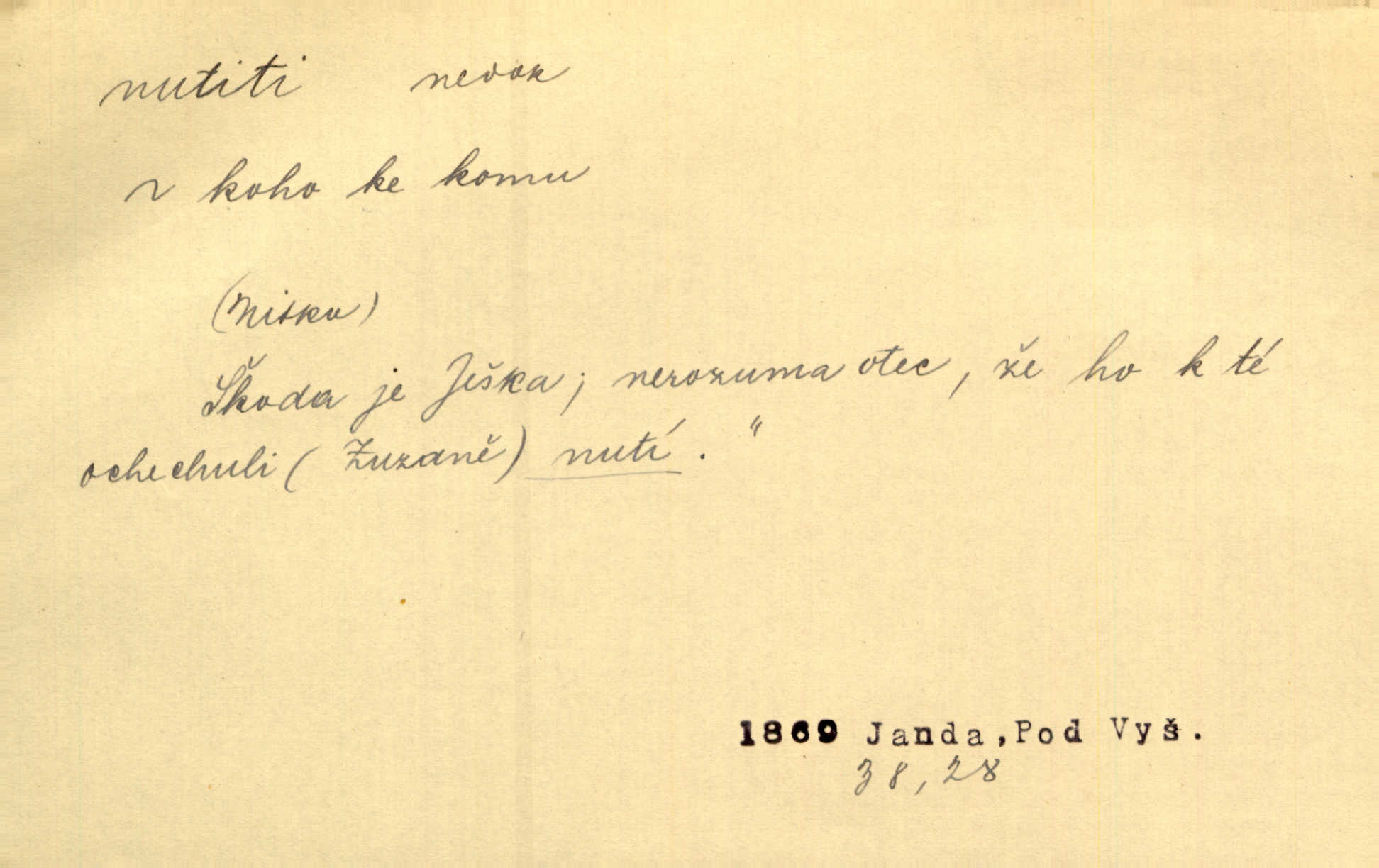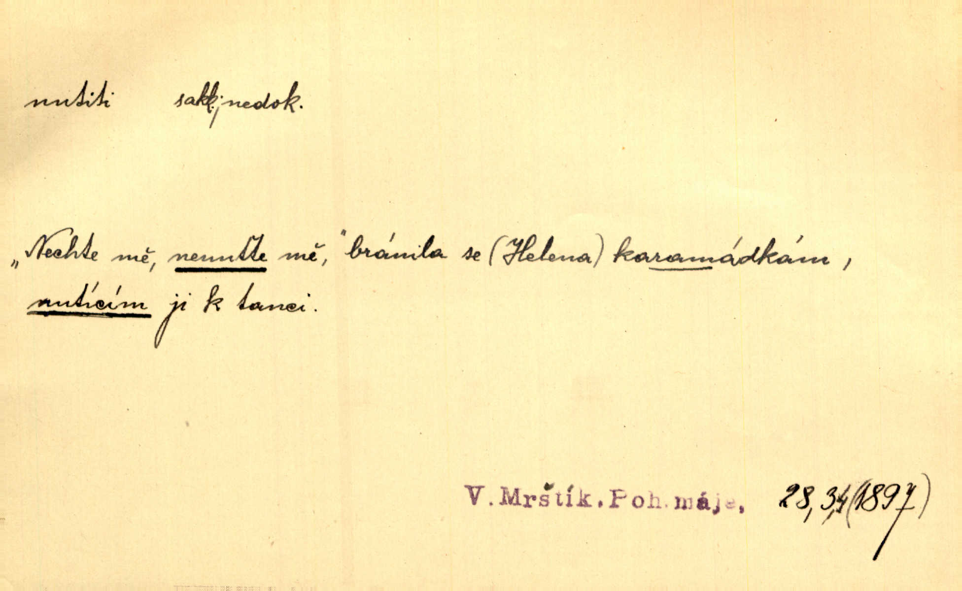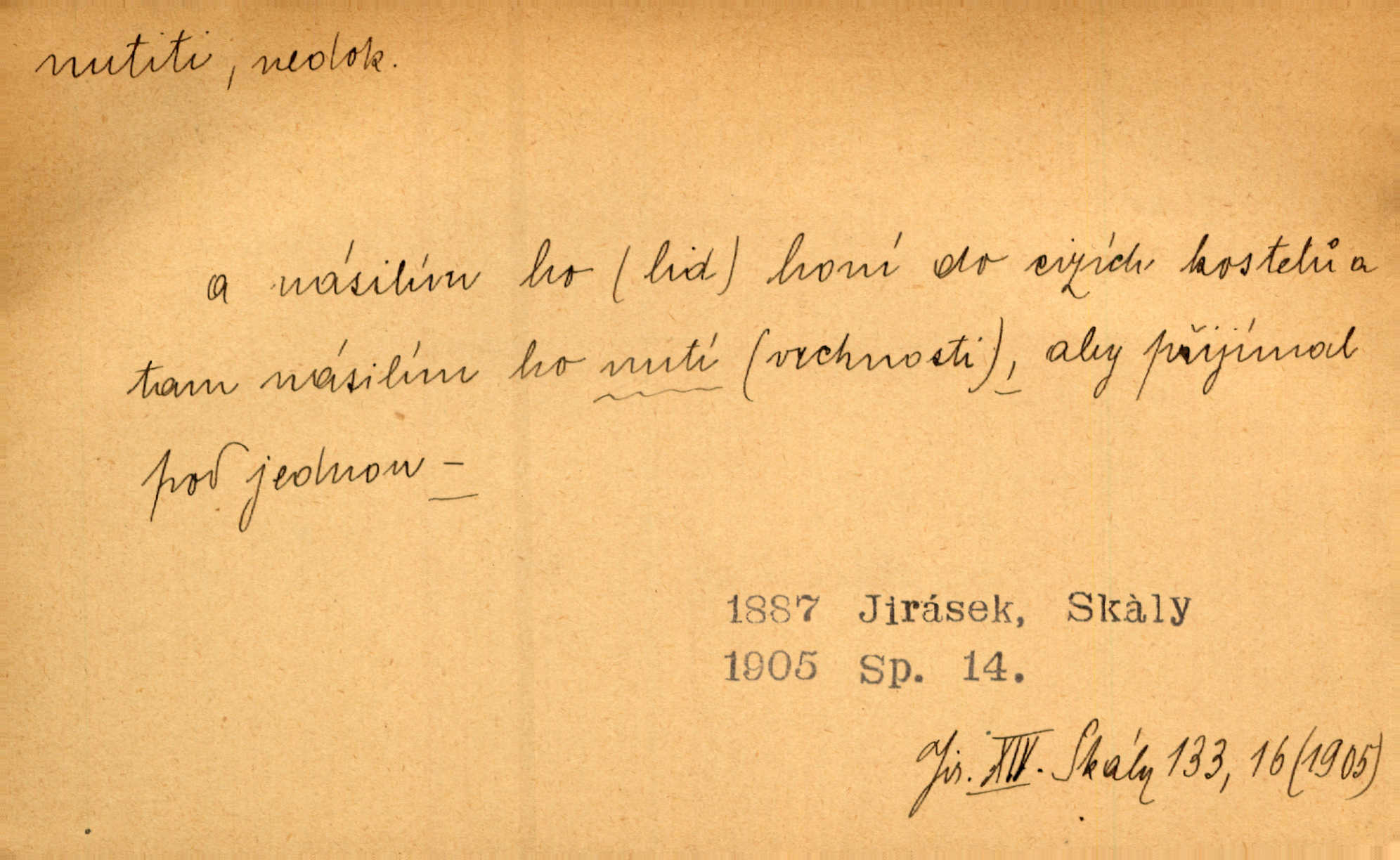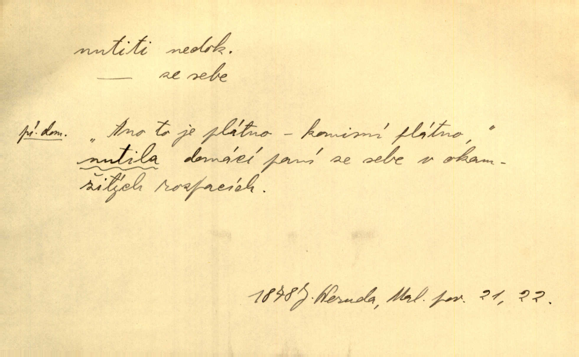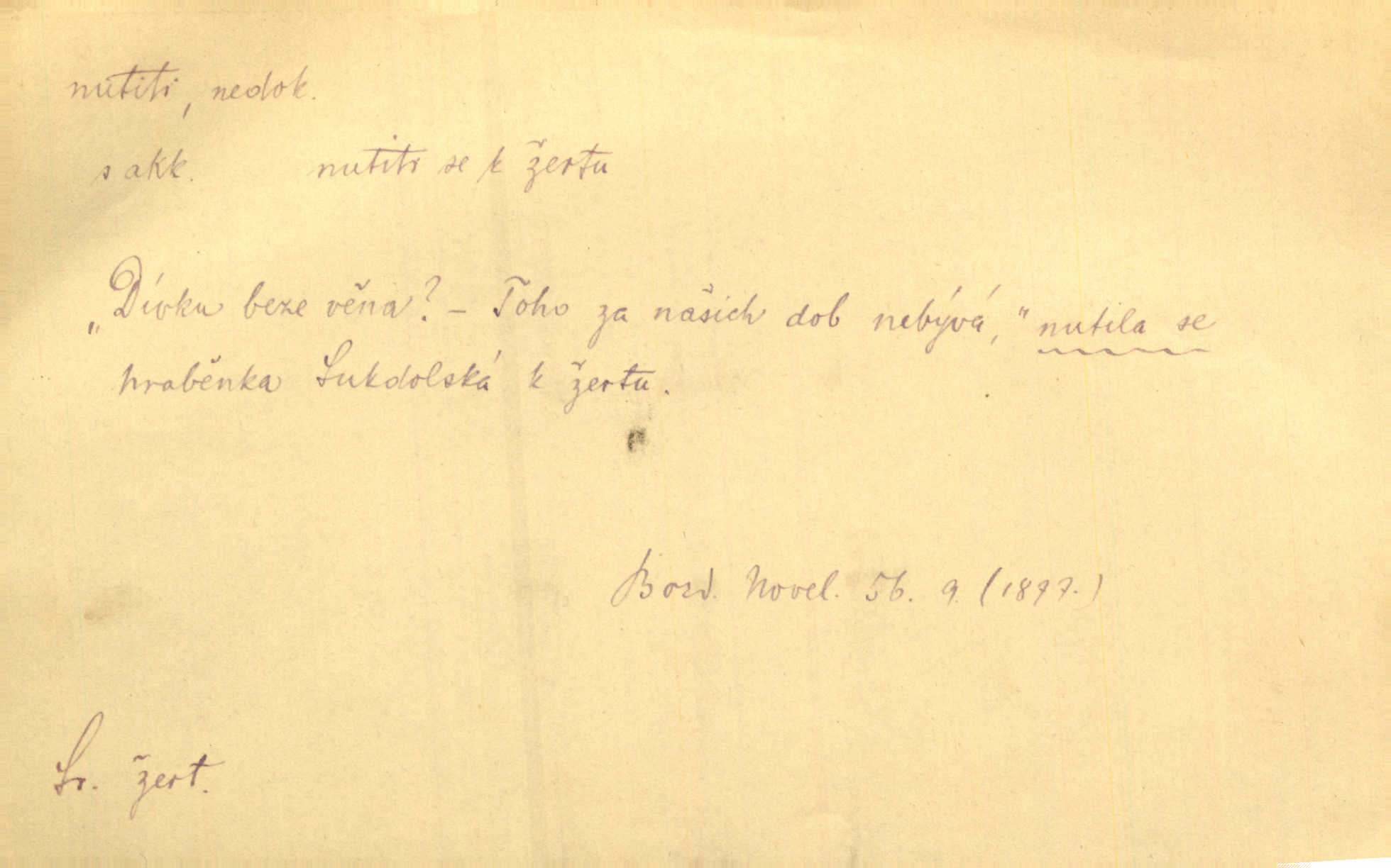 - nutiti ned. (koho k čemu, do čeho, kam a pod.) důtklivě, naléhavě, důrazně pobízeti, vybízeti, vésti. „Nechte mě, nenuťte mě,“ bránila se kamarádkám, nutícím ji k tanci. V. Mrš. Pouhá nouze, strach před škodou nutí jej [člověka] k chytrosti. Durd. Nedopustil, aby jeho dcera ke svatbě byla nucena. J. J. Kol. Škoda je Ješka; nerozuma otec, že ho k té ochechuli nutí. Jan. To už byl tak její [hostinské] „zvyk“, nutit do pití a do hry. V. Mrš. [Hospodáři] cpou do dýmek a nutí hosty do piva. Just. Později si školu sám zamiloval, a již nebylo třeba, aby ho do ní nutili. Prav. První [maminčin milenec] zmizl a do druhýho bába maminku nutila. Čap. Ch. [Caterina] nutila jej zpět na divan, konejšila jej slovy a polibky. Zey. Matku jsem neměl, a poručník na řemeslo nutil. Jir. „Sedláčkové“ aby o zadržené ouroky nebyli nuceni. Pal. Kdo u Štěpánů jen jednou pojedl, nutil ženu, aby se pozeptala, jak Helena to ono strojí. Prav. Vrchnost musila lidi nutit, aby se na opuštěných živnostech usazovali. Jir. I nepřítele nutil klekat k nohoum svým. Jan. Nucen byl, na několik okamžení se posadit na kamennou lavičku musil. Květy. Jsem nucena s tebou mluviti, jak dívka mluviti snad nemá. Zey. Nespokojenost v zemi tak velice se byla rozmohla, že císař nucena se viděl vyjednávati s ní. Pal. Doktor neodpověděl, Bohutínský byl nucen pokračovati. Arb. D (co komu) naléhavě nabízeti. Posadili jej za stůl a nutili mu plný talíř polévky. Wolk. [Pensista] doma kaktusy pěstuje a jeden exemplář mi nutí v úsměvu. Sova. D (co odkud, kam) s překonáváním obtíží, překážek, odporu, nesnází vykonávati, prováděti, dosahovati, někam n. odněkud dostávati a pod. Nutil kolem rtů rozpustilý úsměv. Svob. Voral kývaje nutil smích. Rais. Přemáhal zlost a nutil do sebe zbytek kávy. Herrm. Ret v úsměv nutí [Hus]. Špind. „To nevím — nevím!“ nutil starý ze sebe a chtěl vstáti. Tyl. „Ano, to je plátno,“ nutila domácí paní ze sebe v rozpacích. Ner. Zaťukal — zaprosil, po případě i zahromoval si náš kancelista na Fáfka i na ostatní podobné šosáčky a nutil z nich, čeho právě potřeboval: podpisy, staré obleky, cupaninu, peníze — jako čaroděj! Štech. Stál tu [před otcem]‚ jako stává obviněnec před soudem, když nutí z něho výpověď přisvědčující. Třeb. D nutiti se (do čeho, k čemu, kam a pod.) s námahou, s přemáháním obtíží o něco usilovati, snažiti se. „Dívku beze věna? — Toho za našich dob nebývá,“ nutila se hraběnka k žertu. Bozd. Já myslím, že se Olšovský k tomu velice nutil, a to mne urazilo. Pfleg. Musila se k němu ještě teď tak nutit. Svět. Králenec se nutil do úsměvu. Hol. Neměla zájmu na politice, nutila se do toho. R. Svob. V duchu se zalekl, ale nutil se, aby jeho hlas zněl přísně. Jir. Antikvář, maje knihu s tolika stran již zamluvenou, nutil se, aby ji koupil. Stroup. Děvče se nutilo, a ač její kuchyňské vědomosti nebyly příliš rozšířeny, přece dovedla všecko ku spokojenosti starého Procházky. Pfleg. „Na vyčištění svého domu budeme muset asi rukou statečně přiložiti“. „Budeme se nutiti dost a dost“. Ehrenb.