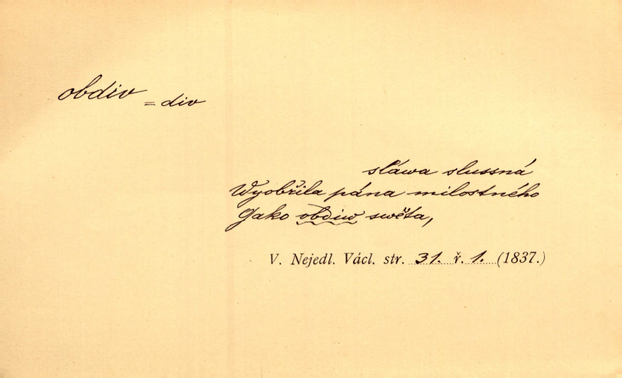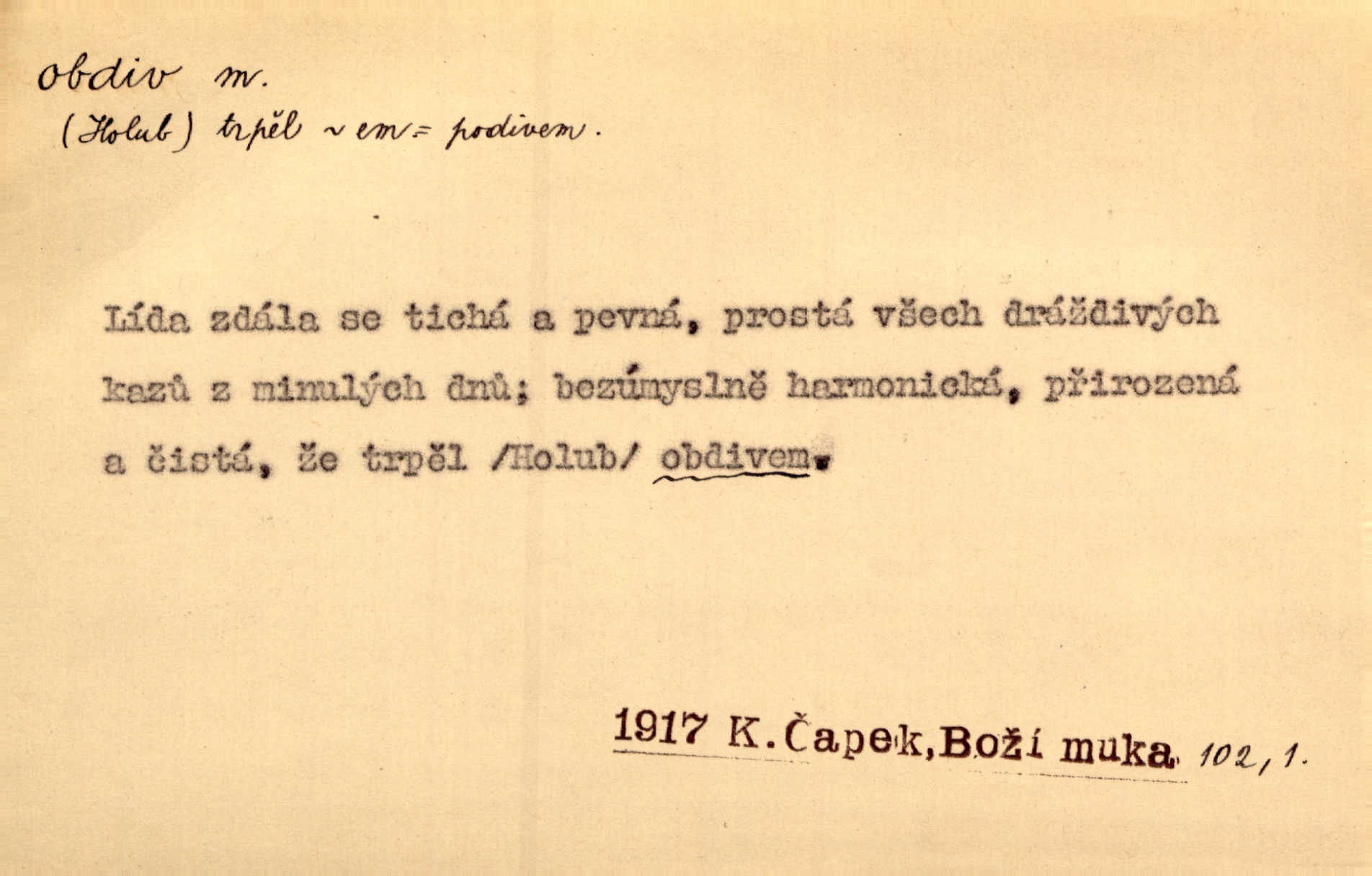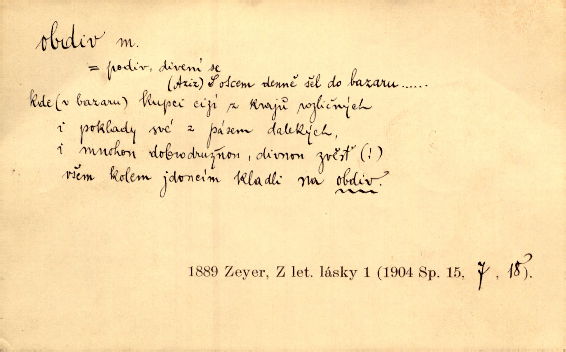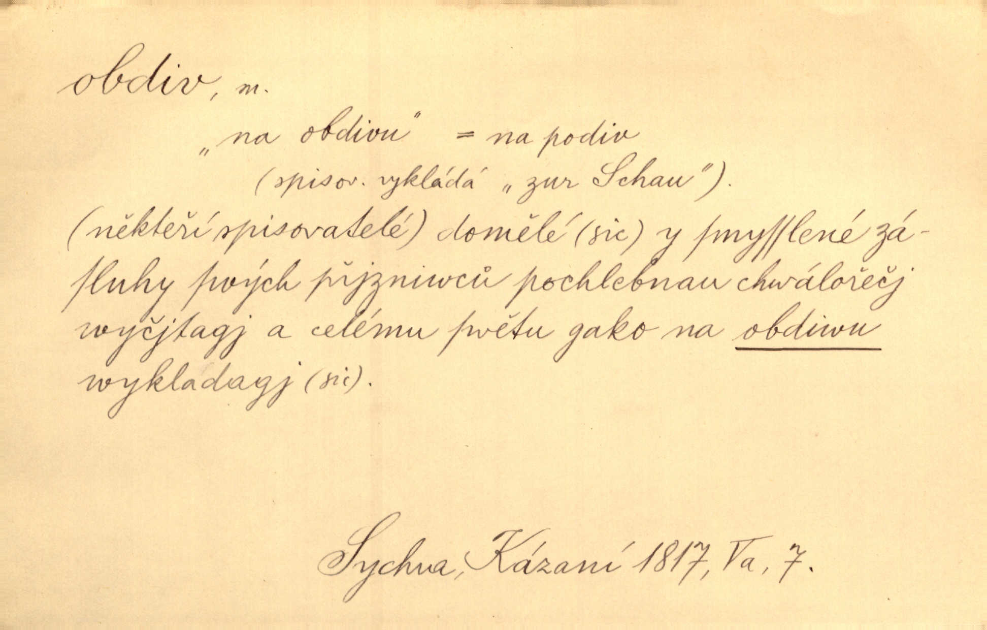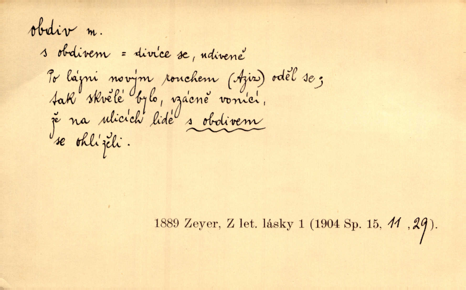 - obdiv, -u m. divení se něčemu, obdivování, podiv. Pan hejtman vyslovil svůj obdiv nad statečností svobodné paní. Jir. Obrazy docházely největší přízně a nejzasloužilejšího obdivu. V. Mrš. „Sakulentský pár koní,“ prohodil pantáta a obdivem nadmul rty. Rais.