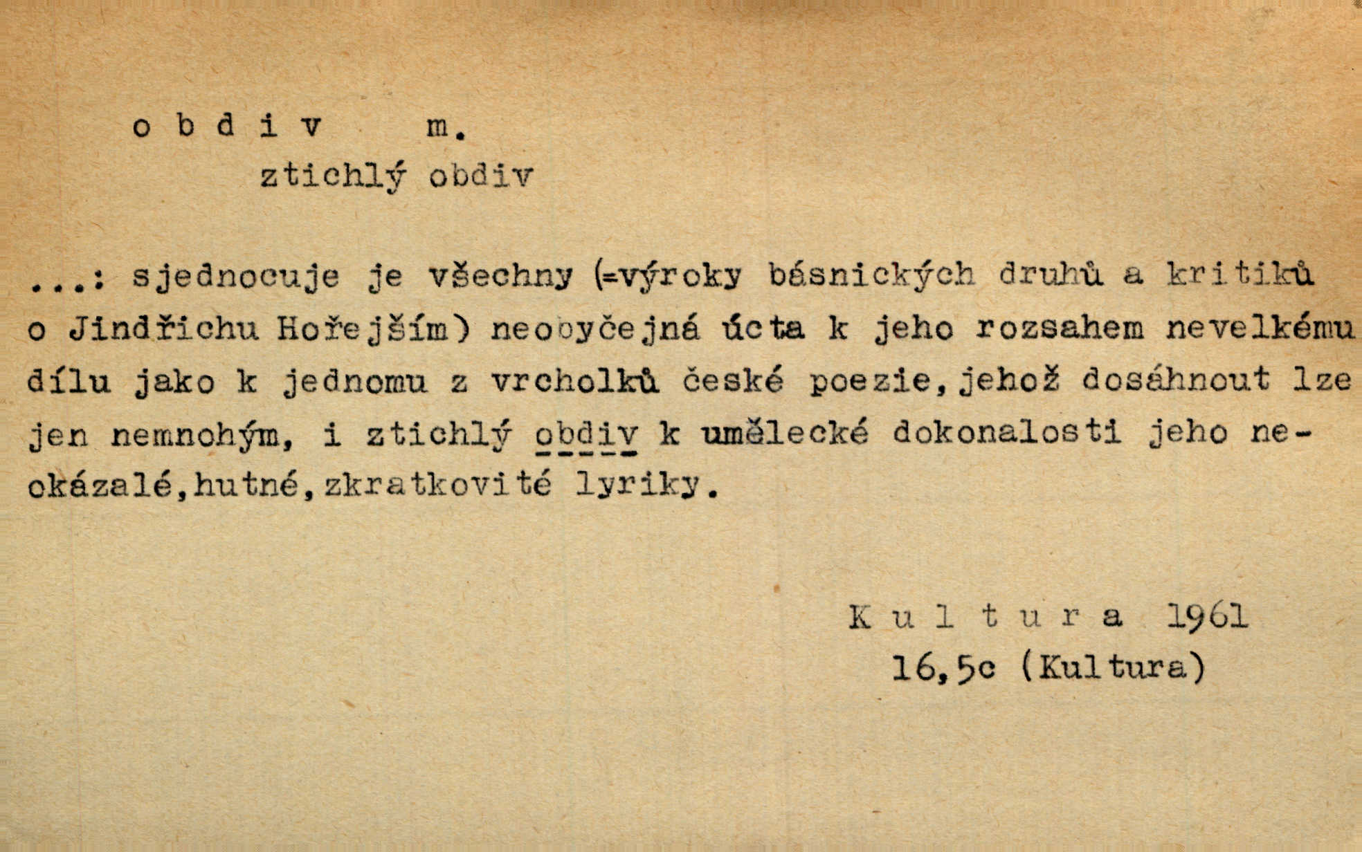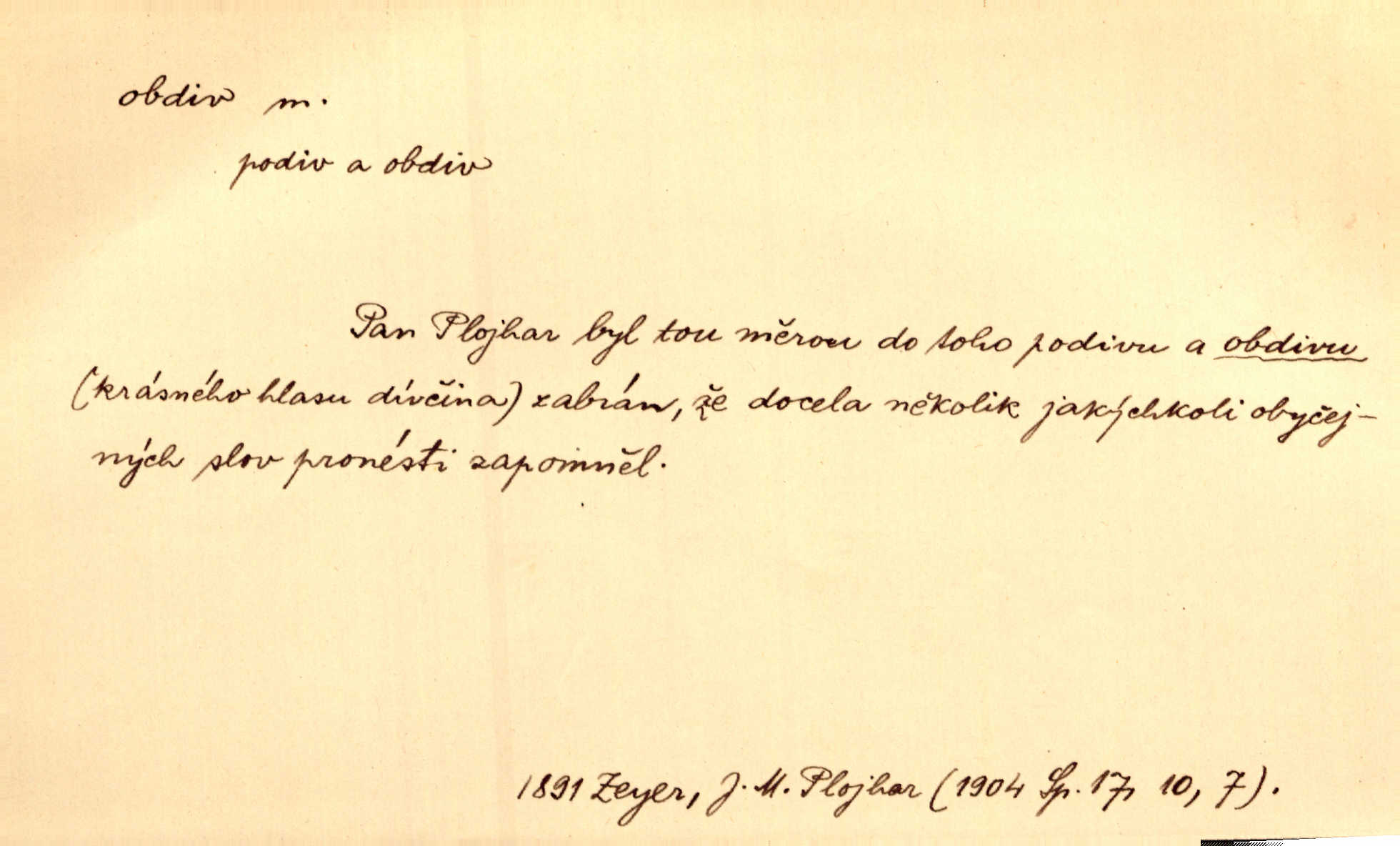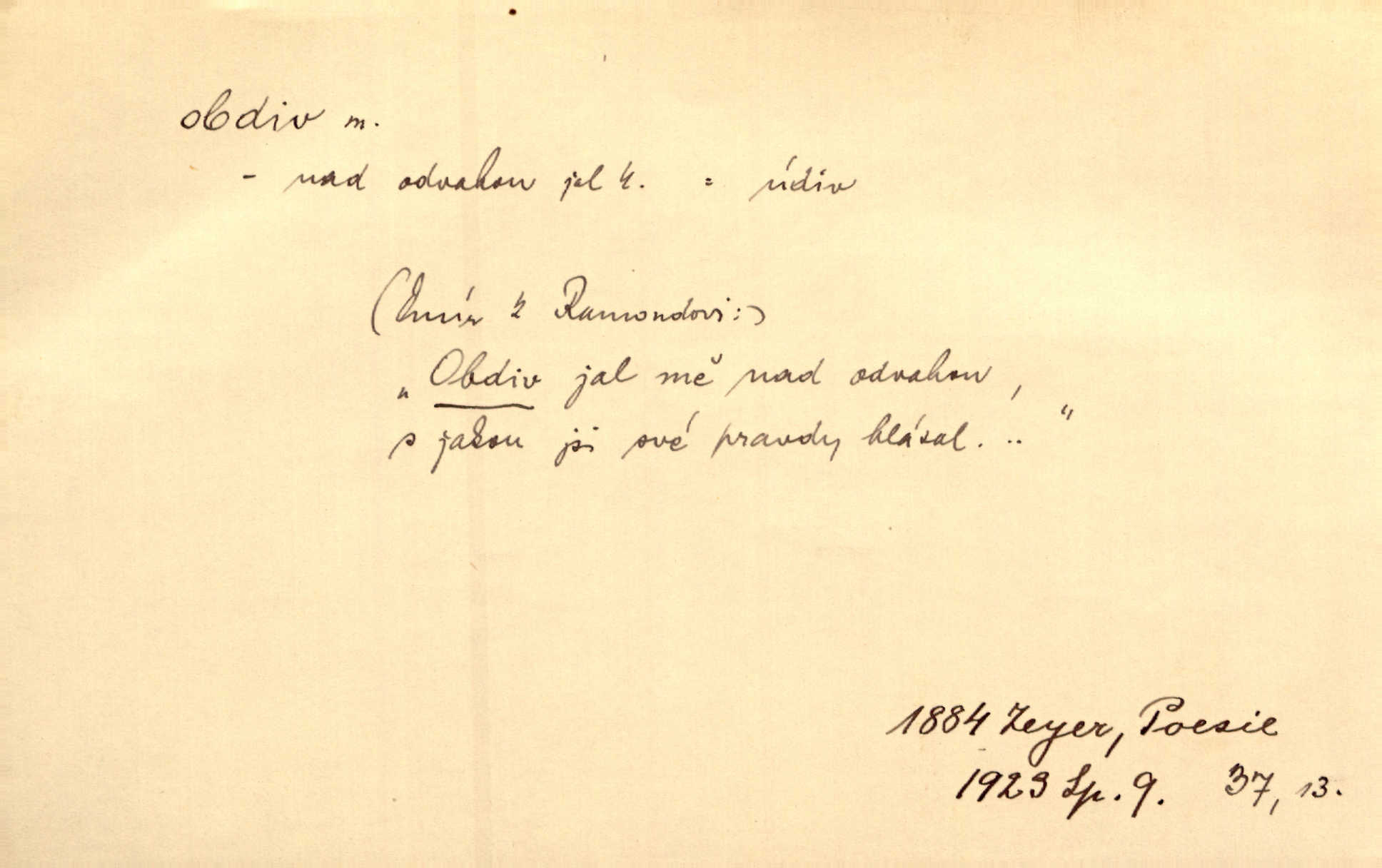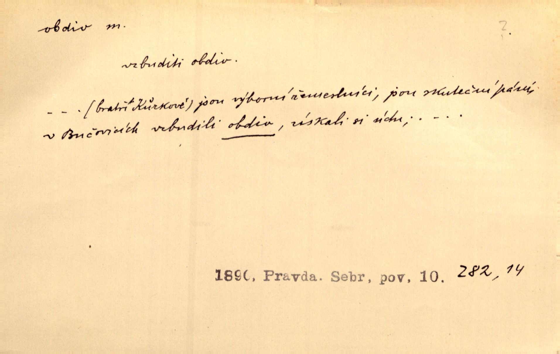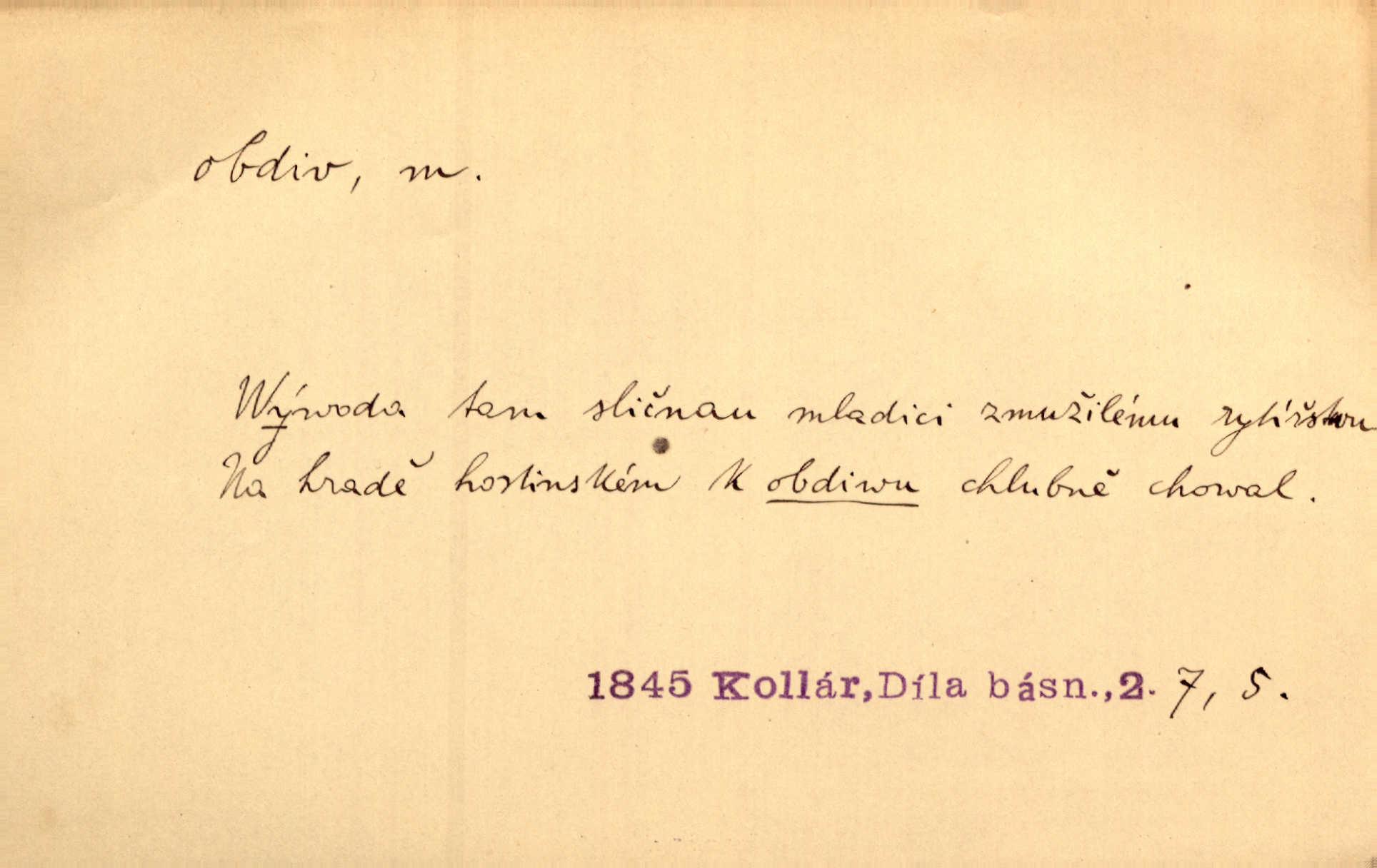 - obdiv, -u m. divení se něčemu, obdivování, podiv. Pan hejtman vyslovil svůj obdiv nad statečností svobodné paní. Jir. Obrazy docházely největší přízně a nejzasloužilejšího obdivu. V. Mrš. „Sakulentský pár koní,“ prohodil pantáta a obdivem nadmul rty. Rais.