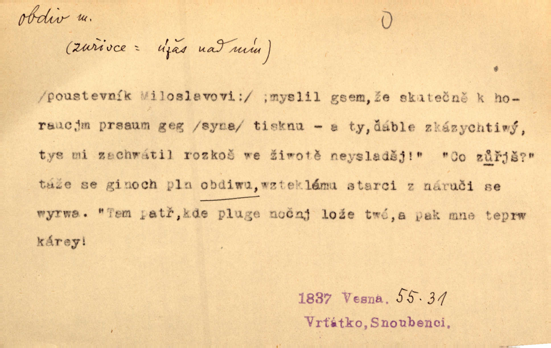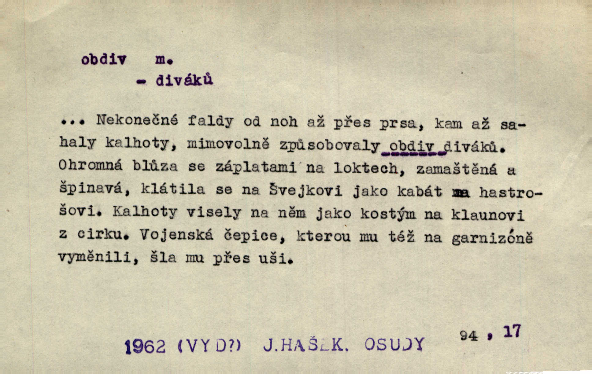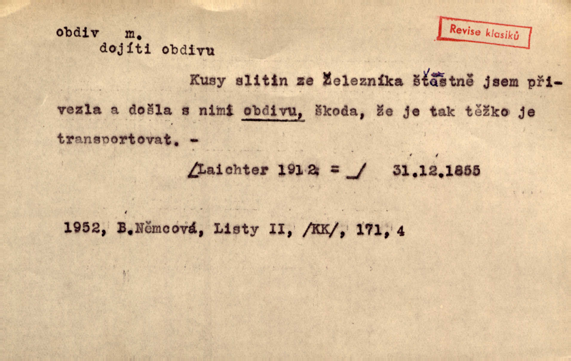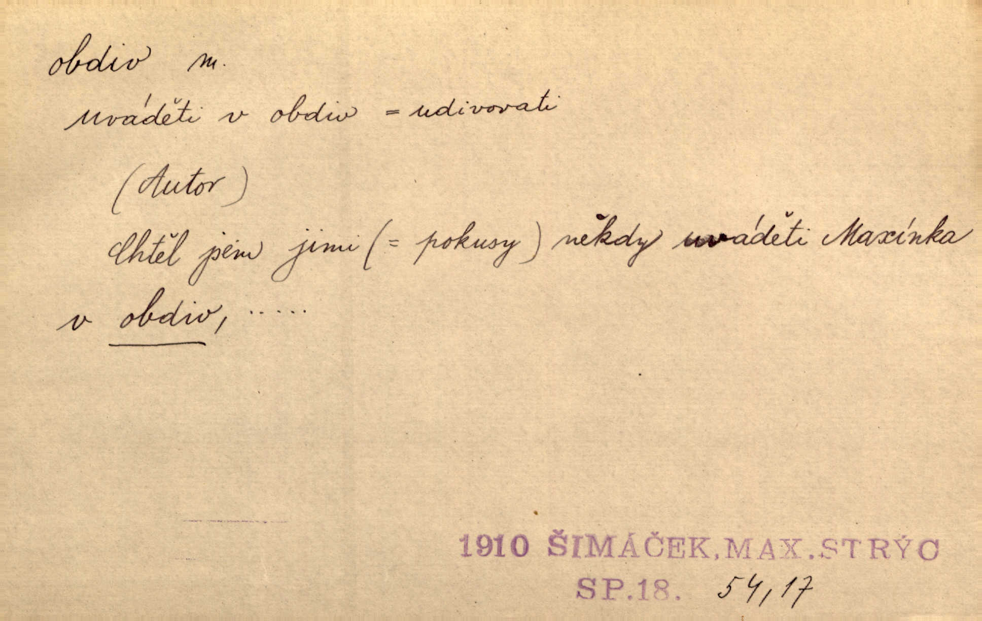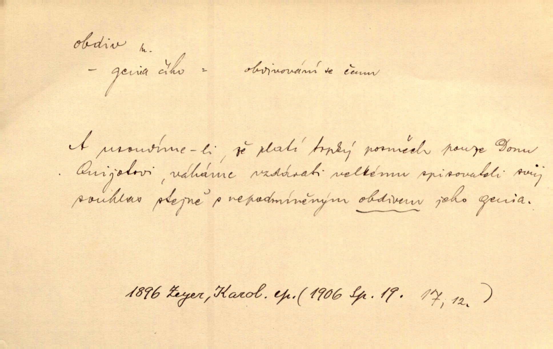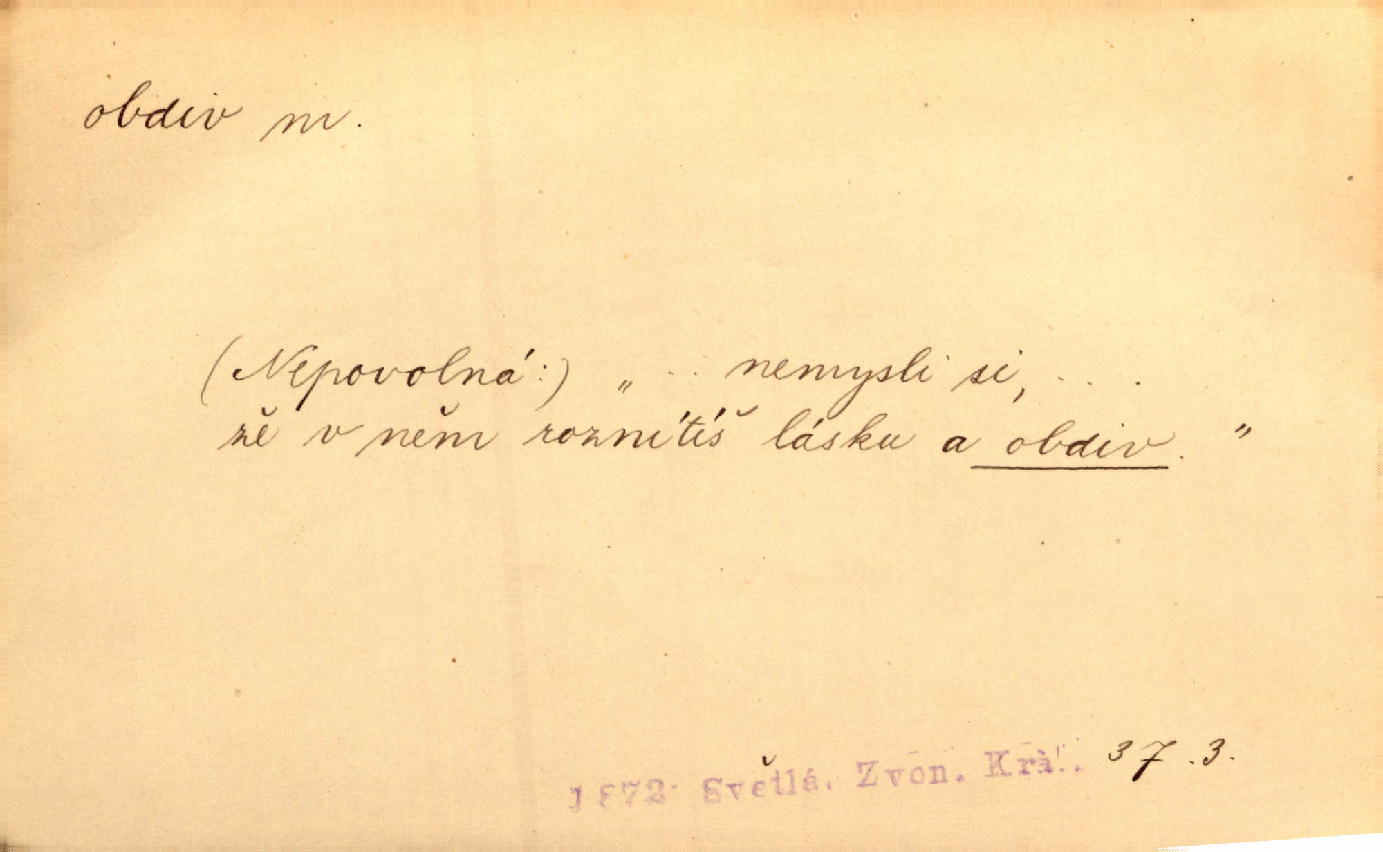- obdiv, -u m. divení se něčemu, obdivování, podiv. Pan hejtman vyslovil svůj obdiv nad statečností svobodné paní. Jir. Obrazy docházely největší přízně a nejzasloužilejšího obdivu. V. Mrš. „Sakulentský pár koní,“ prohodil pantáta a obdivem nadmul rty. Rais.