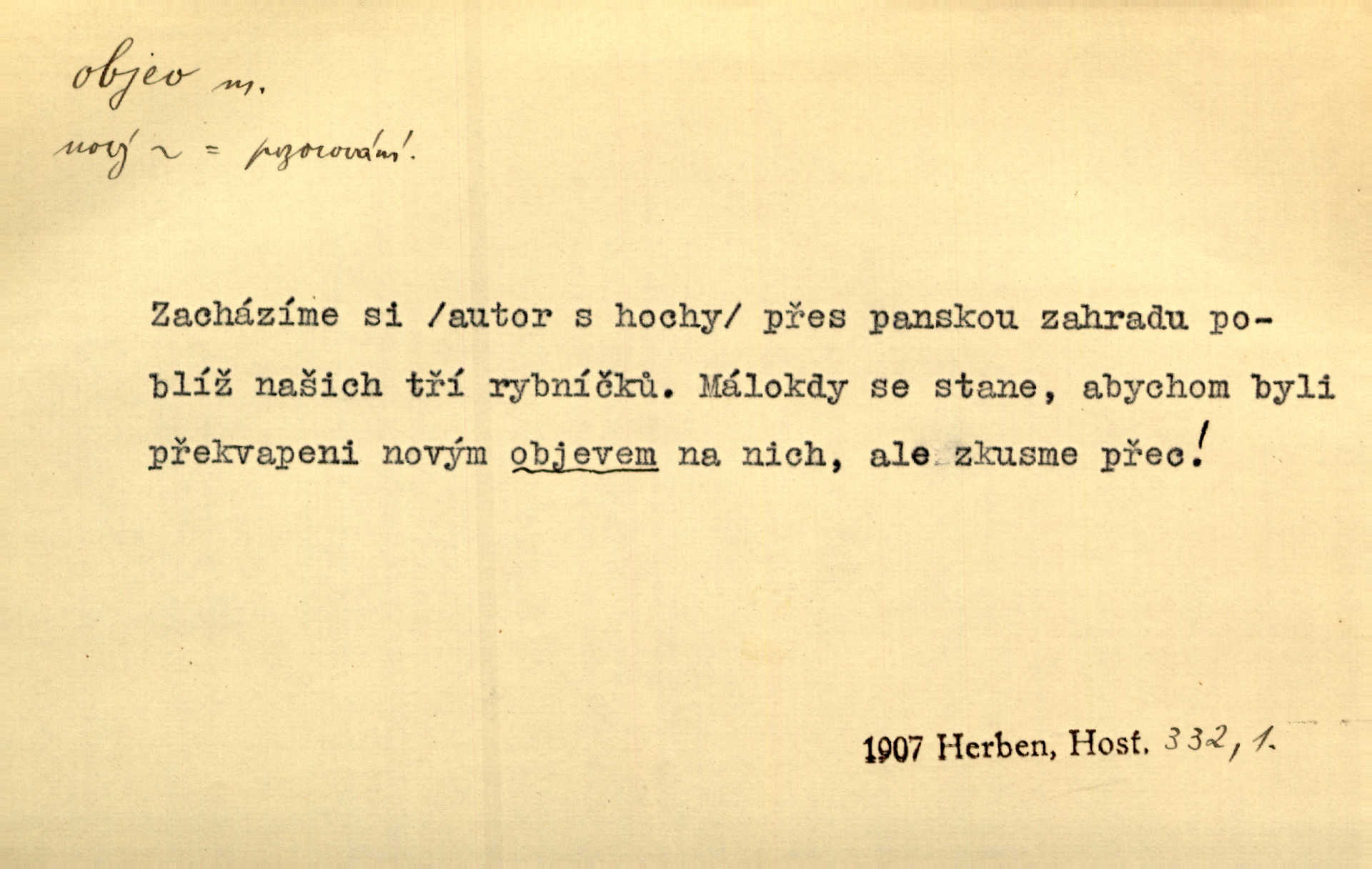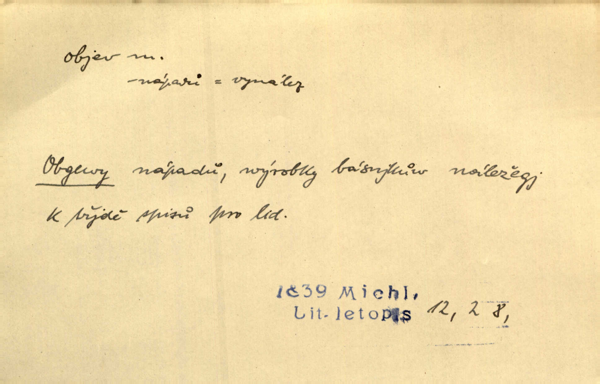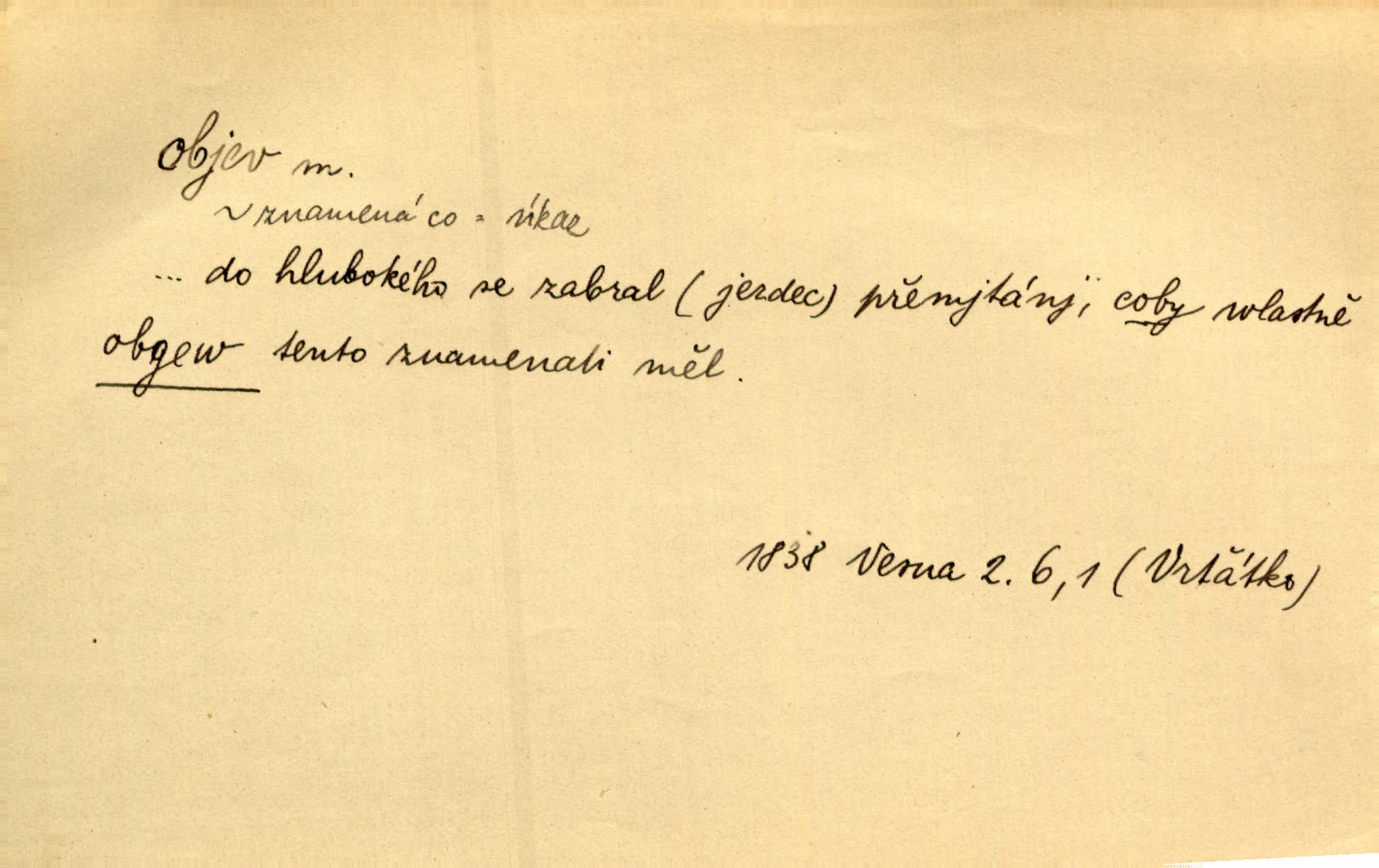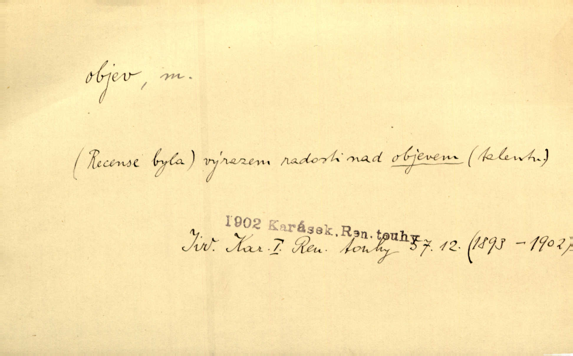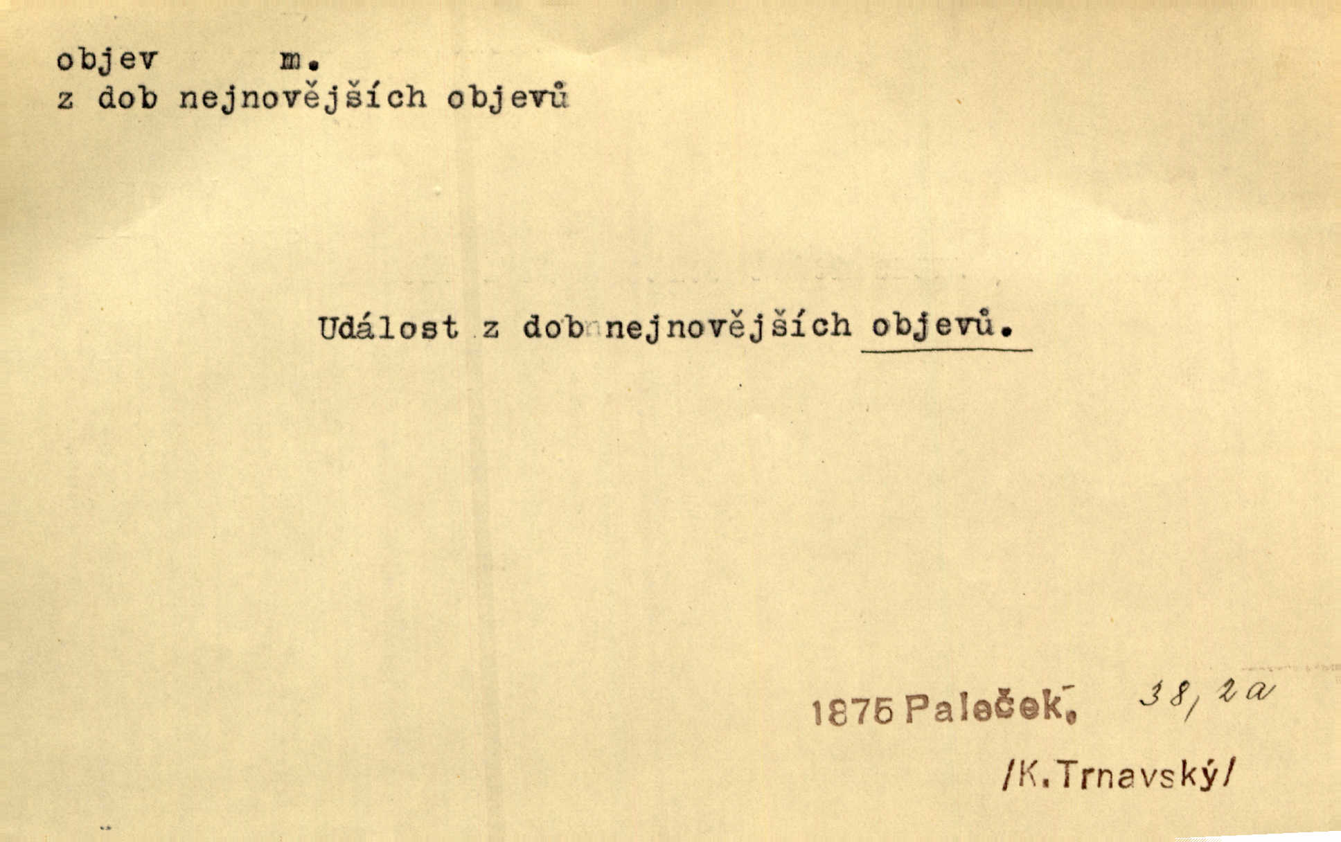 - objev, -u m. nález, odhalení něčeho, co dosud bylo neznámo n. o čem se nevědělo, objevení. Mapa objevů v Novém světě. Stroup. Celé město čekalo jakési objevy [o rodině tajemníkově]‚ ale sklamalo se. R. Svob. Byl to překvapující objev [pro spisovatele]‚ že Anglie je opravdu anglická. K. Čap. D Zř. objevení se, projev. Vzhlédla [Viola] k němu [muži] s láskou vroucí a zašla s ladným jitra objevem. O. Červ. První objev této změny jeho [Mohamedových] citů vidíme v nakládání jeho se Židy. Rieg. D Zř. zjev. [Hraběnka] uražena hrdopyšným objevem mladého vychovatele, nelibost svou sotva ukryla. Pfleg.