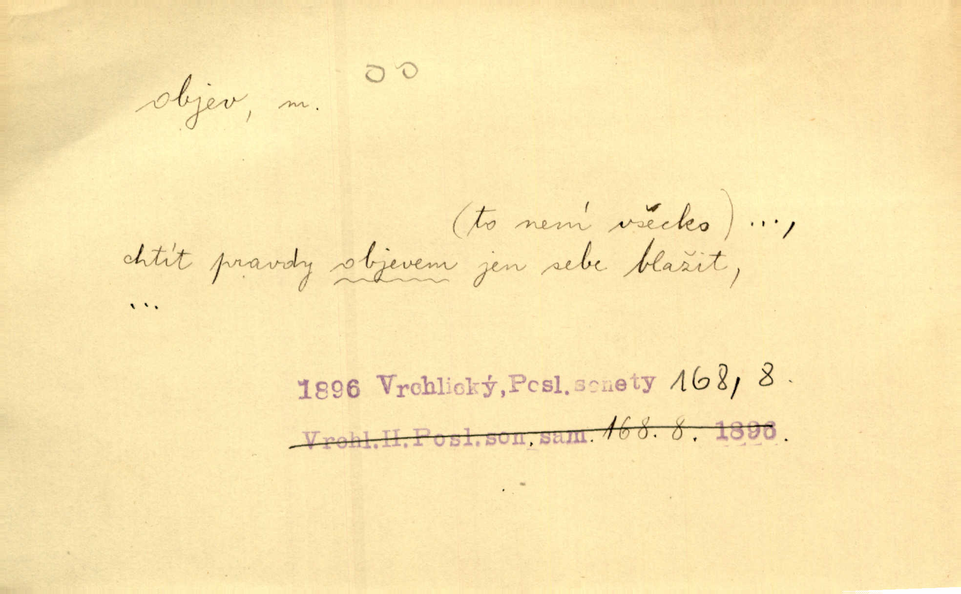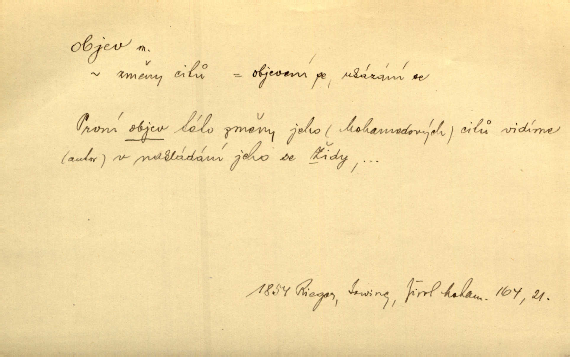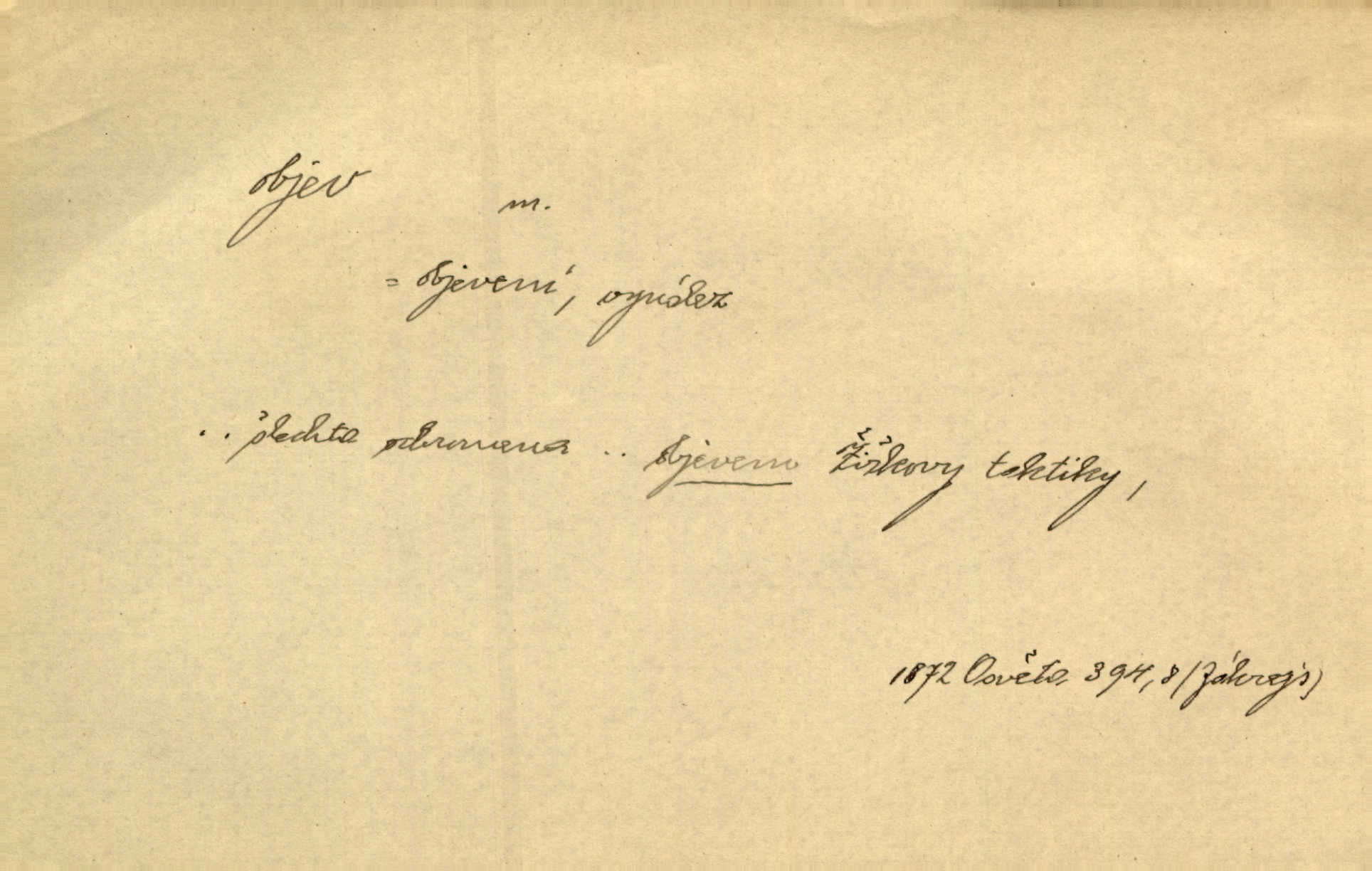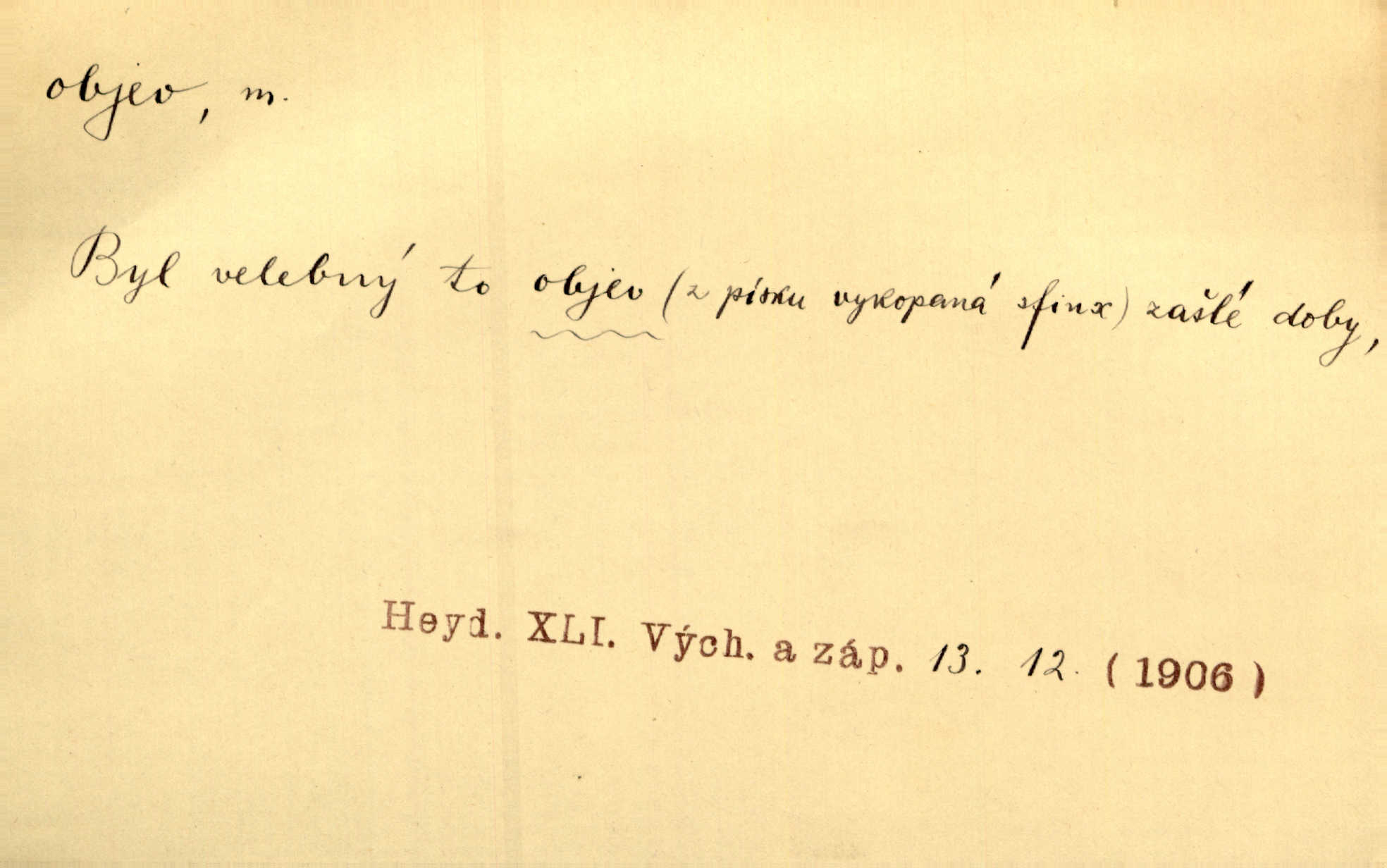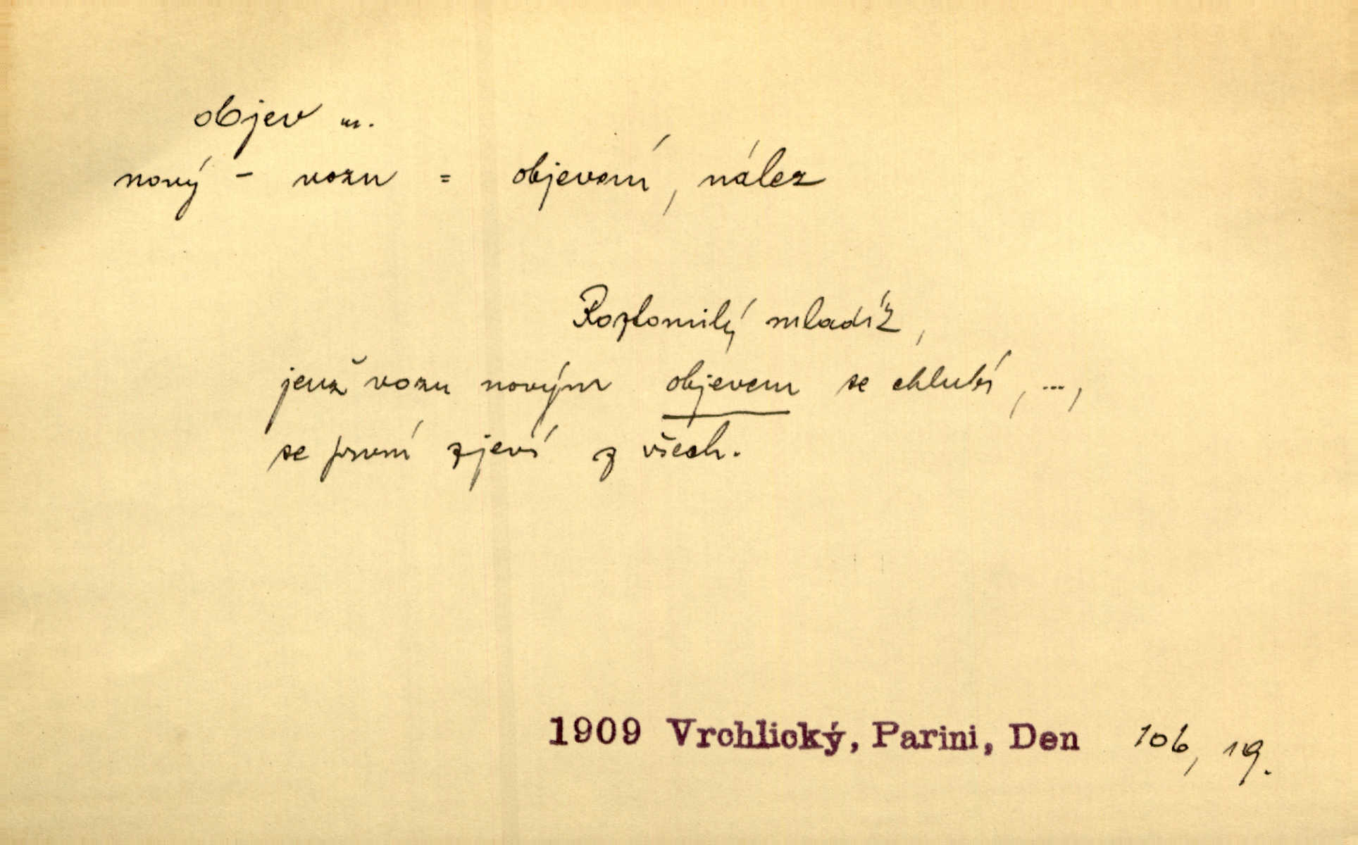 - objev, -u m. nález, odhalení něčeho, co dosud bylo neznámo n. o čem se nevědělo, objevení. Mapa objevů v Novém světě. Stroup. Celé město čekalo jakési objevy [o rodině tajemníkově]‚ ale sklamalo se. R. Svob. Byl to překvapující objev [pro spisovatele]‚ že Anglie je opravdu anglická. K. Čap. D Zř. objevení se, projev. Vzhlédla [Viola] k němu [muži] s láskou vroucí a zašla s ladným jitra objevem. O. Červ. První objev této změny jeho [Mohamedových] citů vidíme v nakládání jeho se Židy. Rieg. D Zř. zjev. [Hraběnka] uražena hrdopyšným objevem mladého vychovatele, nelibost svou sotva ukryla. Pfleg.