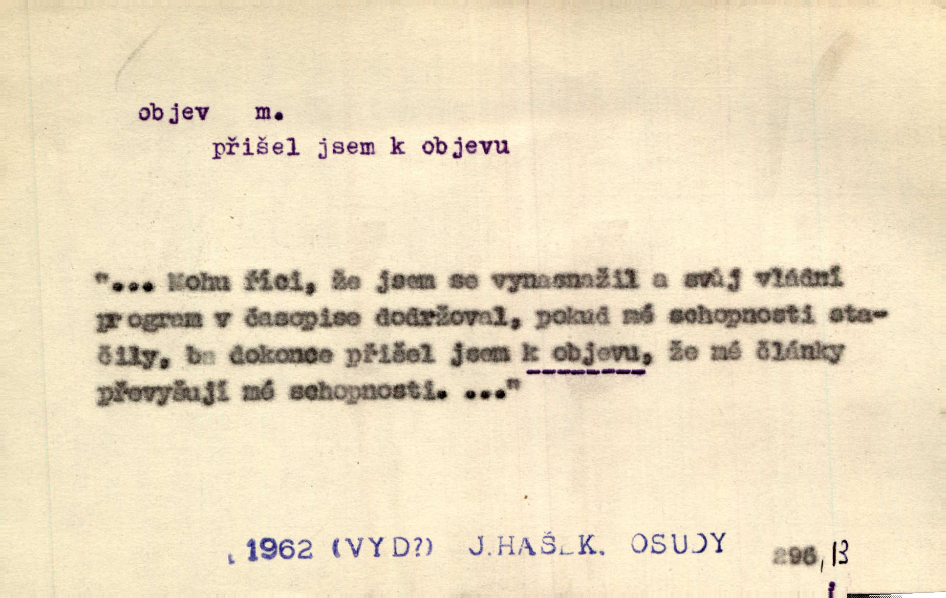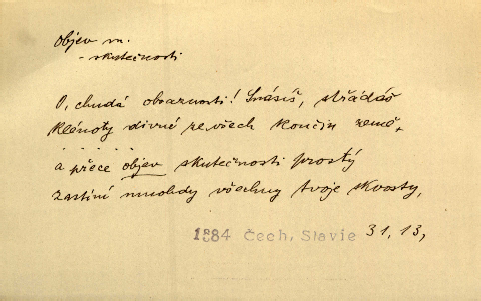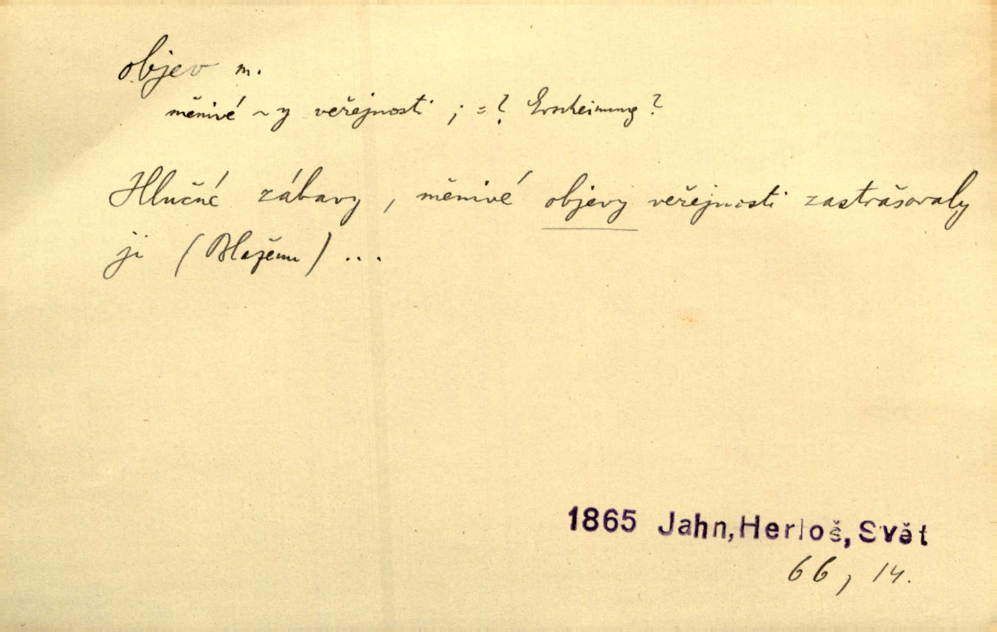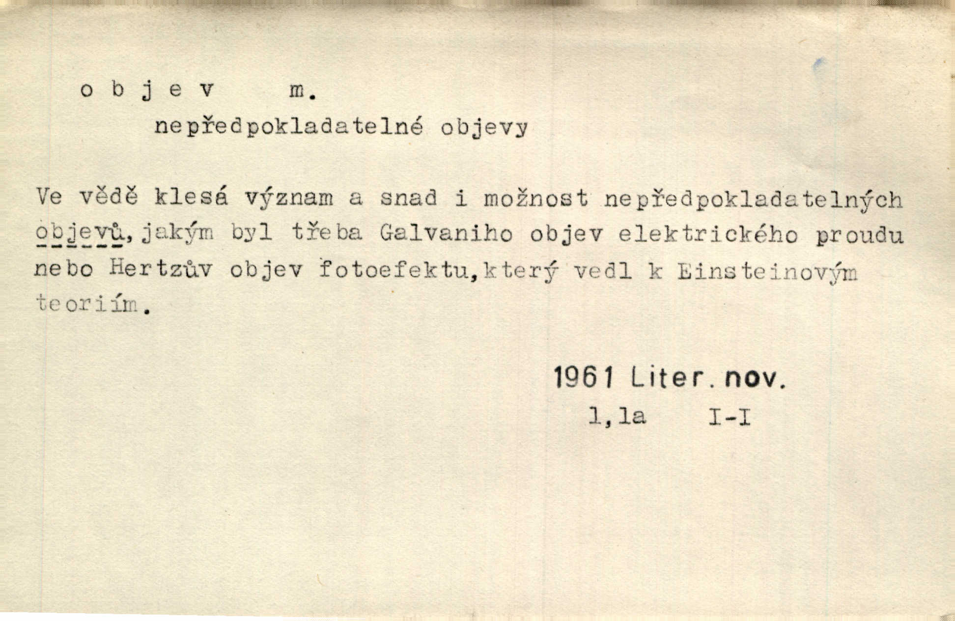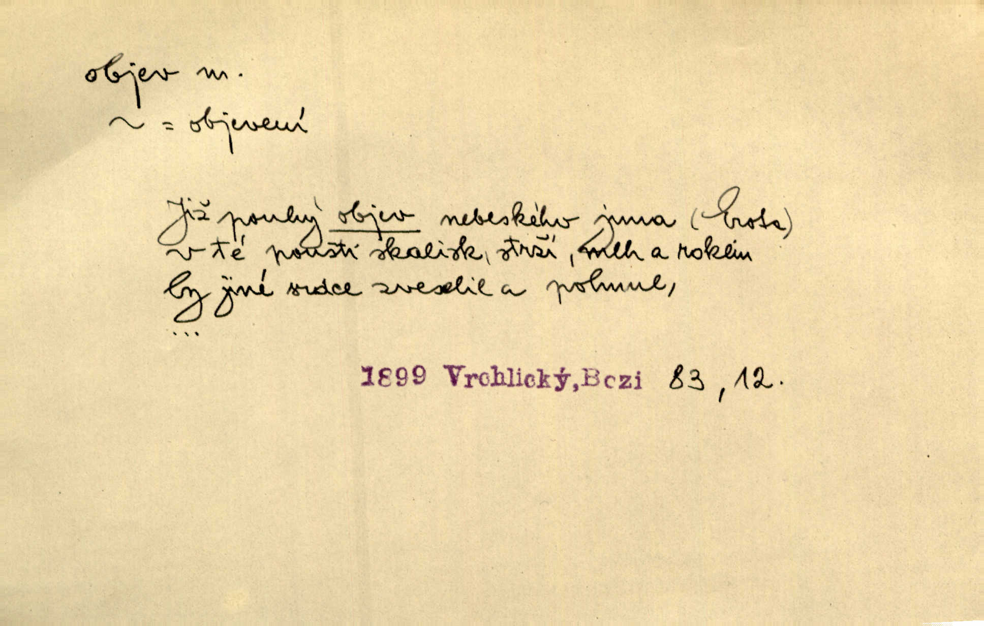 - objev, -u m. nález, odhalení něčeho, co dosud bylo neznámo n. o čem se nevědělo, objevení. Mapa objevů v Novém světě. Stroup. Celé město čekalo jakési objevy [o rodině tajemníkově]‚ ale sklamalo se. R. Svob. Byl to překvapující objev [pro spisovatele]‚ že Anglie je opravdu anglická. K. Čap. D Zř. objevení se, projev. Vzhlédla [Viola] k němu [muži] s láskou vroucí a zašla s ladným jitra objevem. O. Červ. První objev této změny jeho [Mohamedových] citů vidíme v nakládání jeho se Židy. Rieg. D Zř. zjev. [Hraběnka] uražena hrdopyšným objevem mladého vychovatele, nelibost svou sotva ukryla. Pfleg.