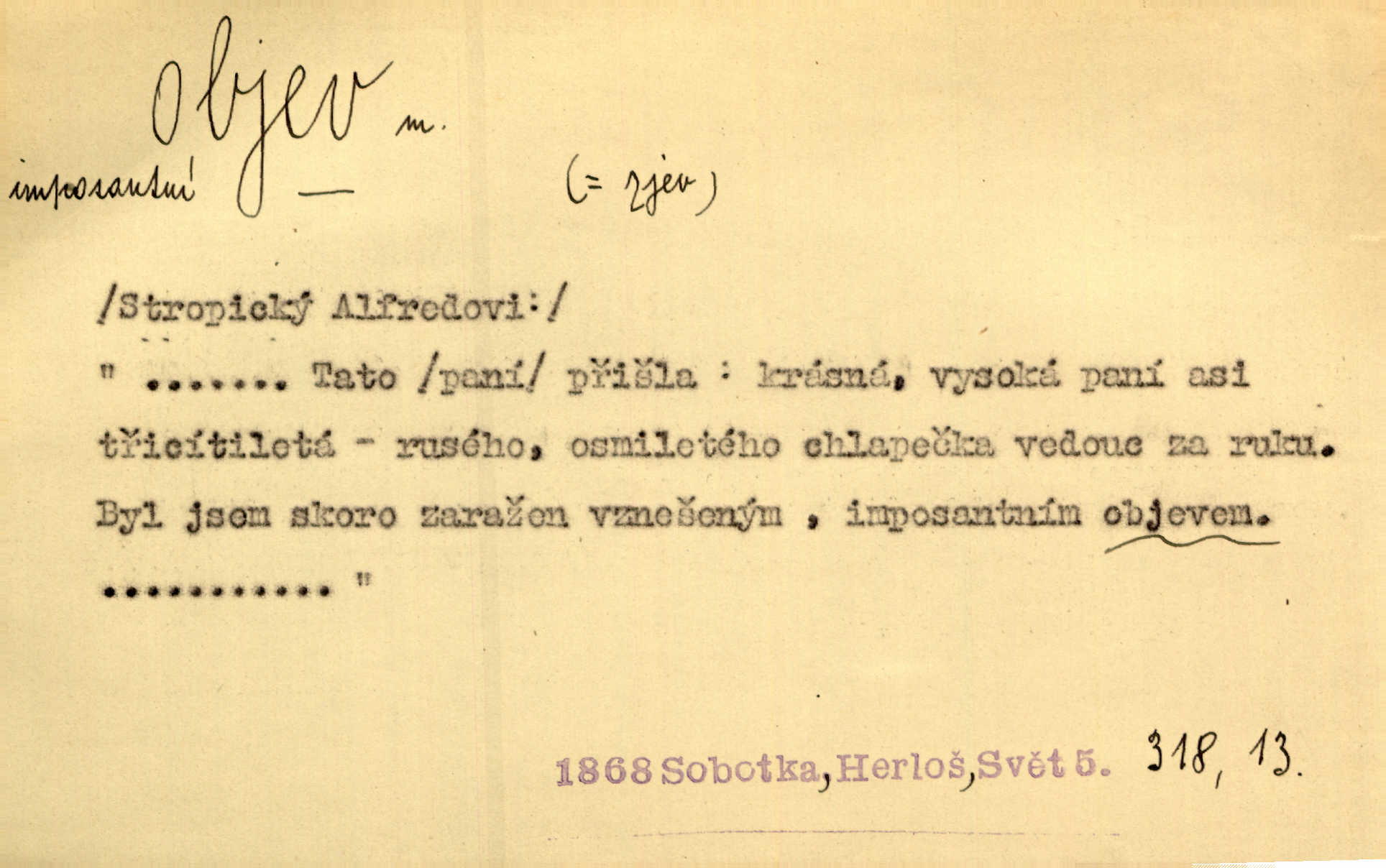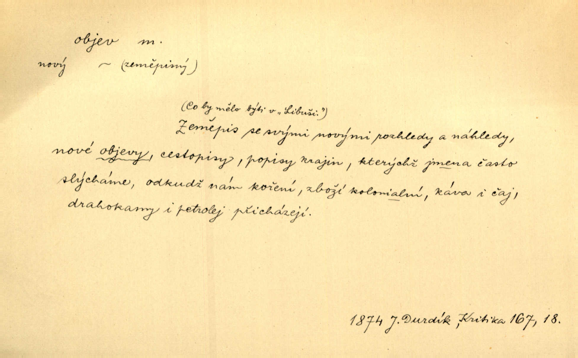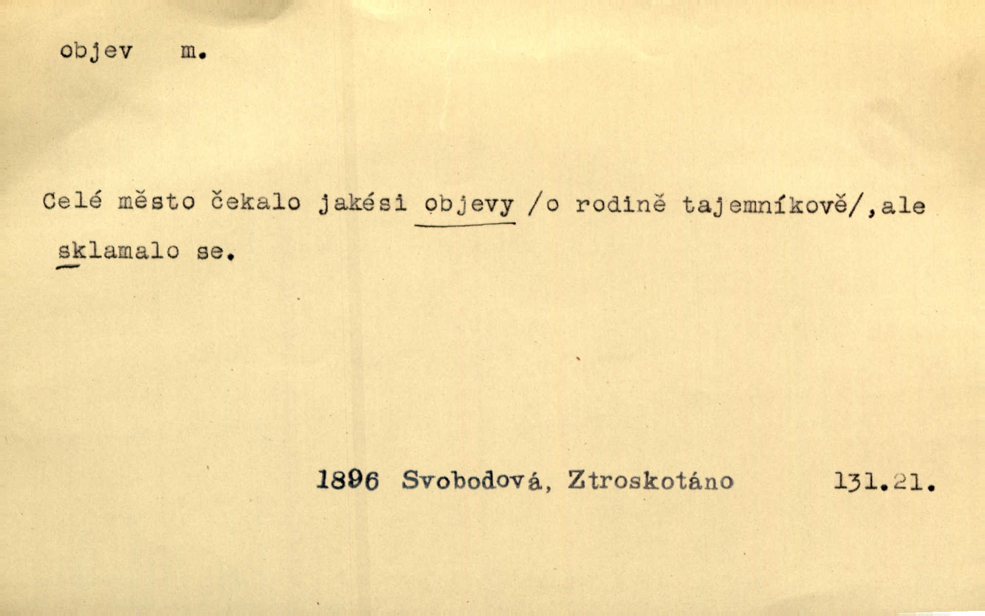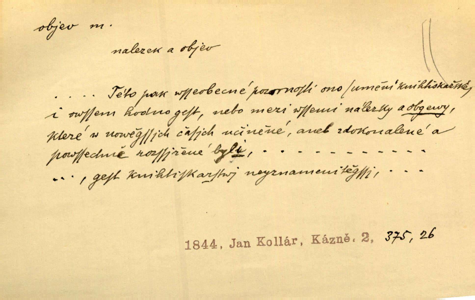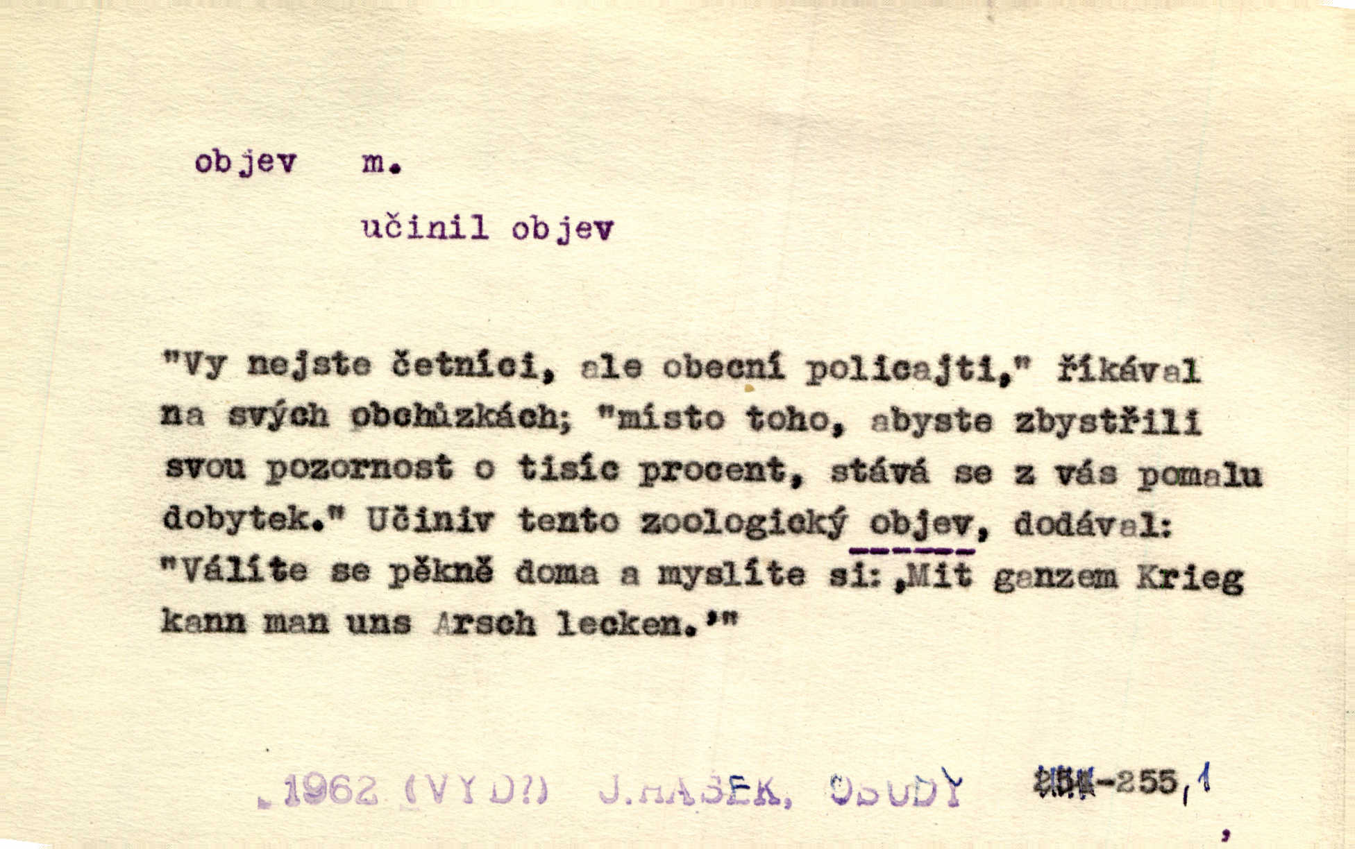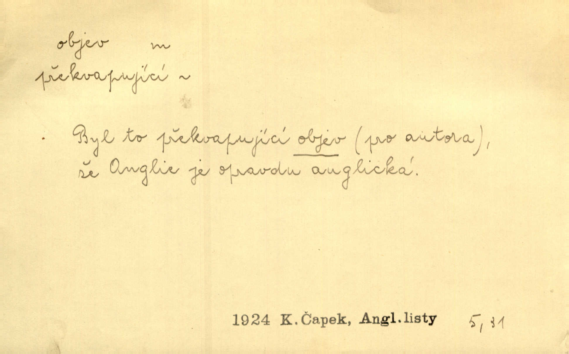 - objev, -u m. nález, odhalení něčeho, co dosud bylo neznámo n. o čem se nevědělo, objevení. Mapa objevů v Novém světě. Stroup. Celé město čekalo jakési objevy [o rodině tajemníkově]‚ ale sklamalo se. R. Svob. Byl to překvapující objev [pro spisovatele]‚ že Anglie je opravdu anglická. K. Čap. D Zř. objevení se, projev. Vzhlédla [Viola] k němu [muži] s láskou vroucí a zašla s ladným jitra objevem. O. Červ. První objev této změny jeho [Mohamedových] citů vidíme v nakládání jeho se Židy. Rieg. D Zř. zjev. [Hraběnka] uražena hrdopyšným objevem mladého vychovatele, nelibost svou sotva ukryla. Pfleg.