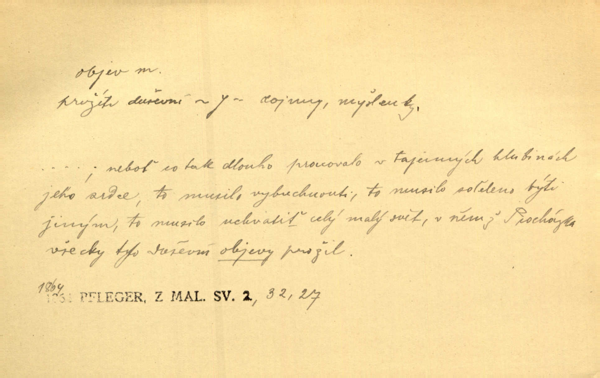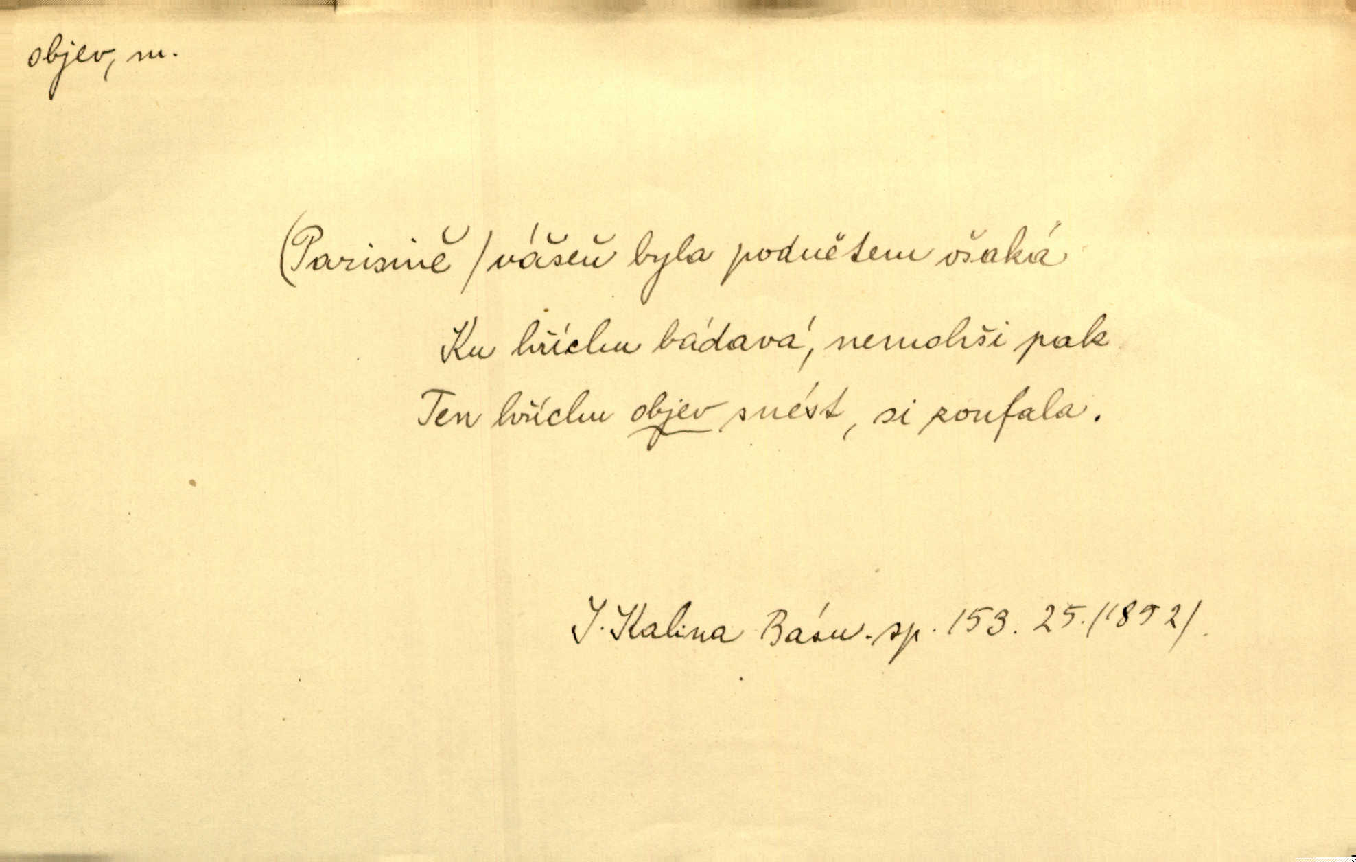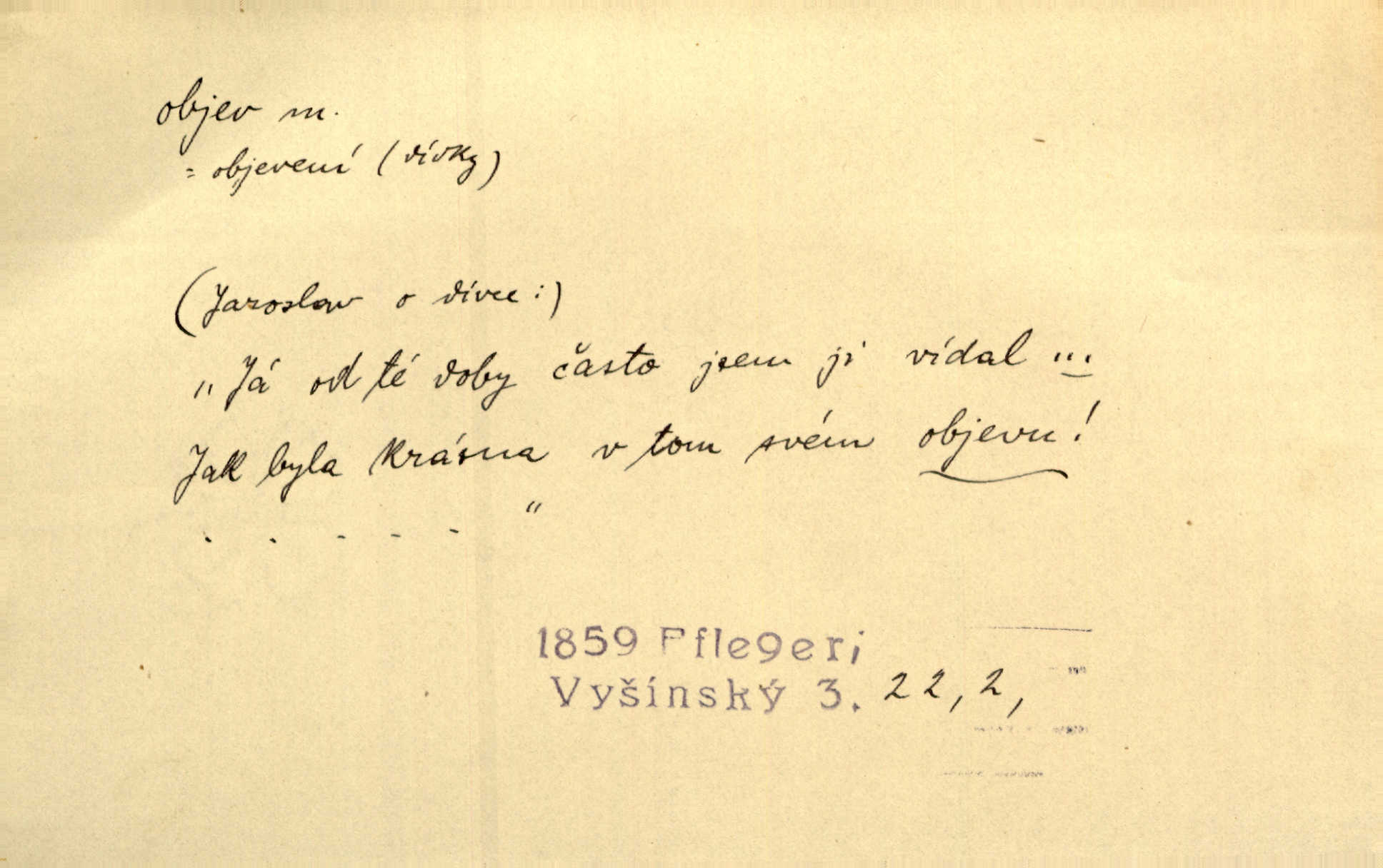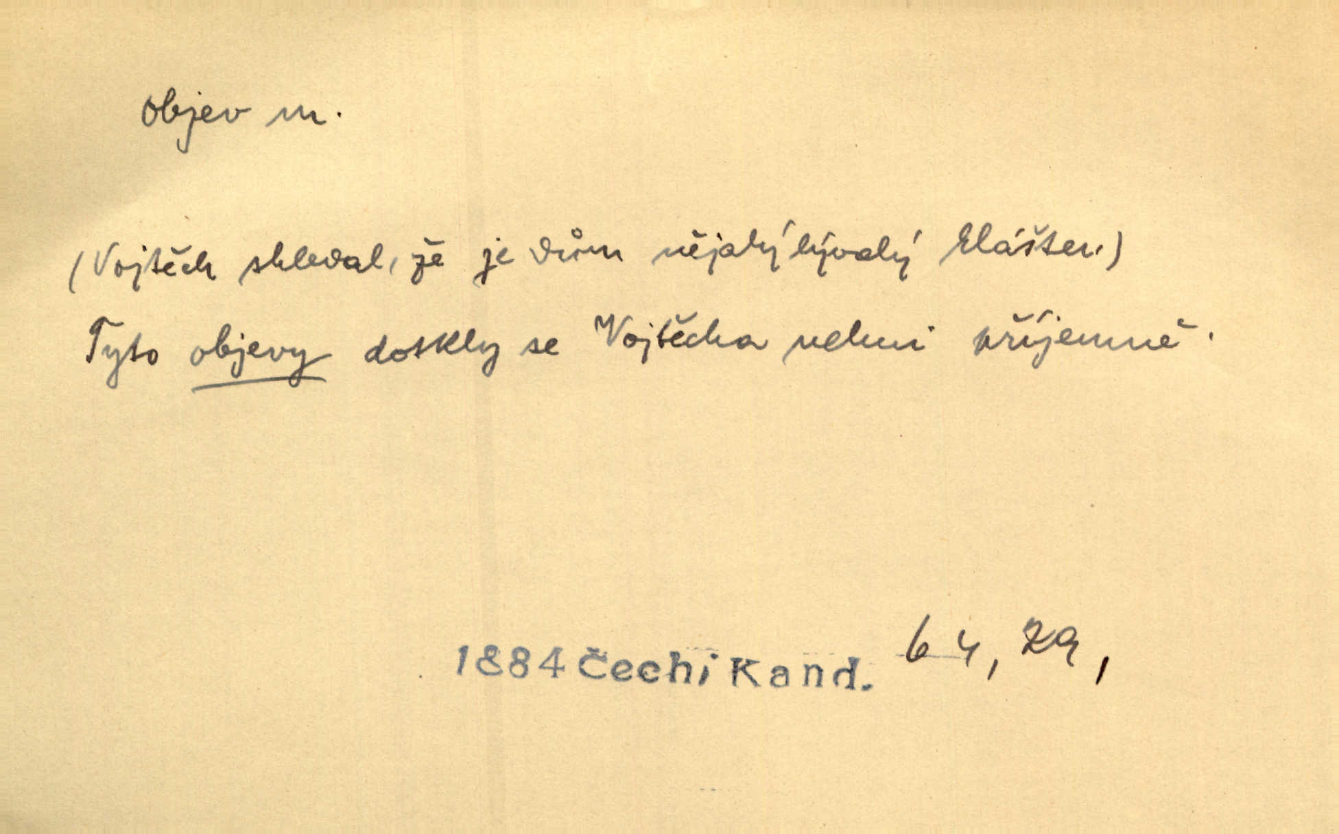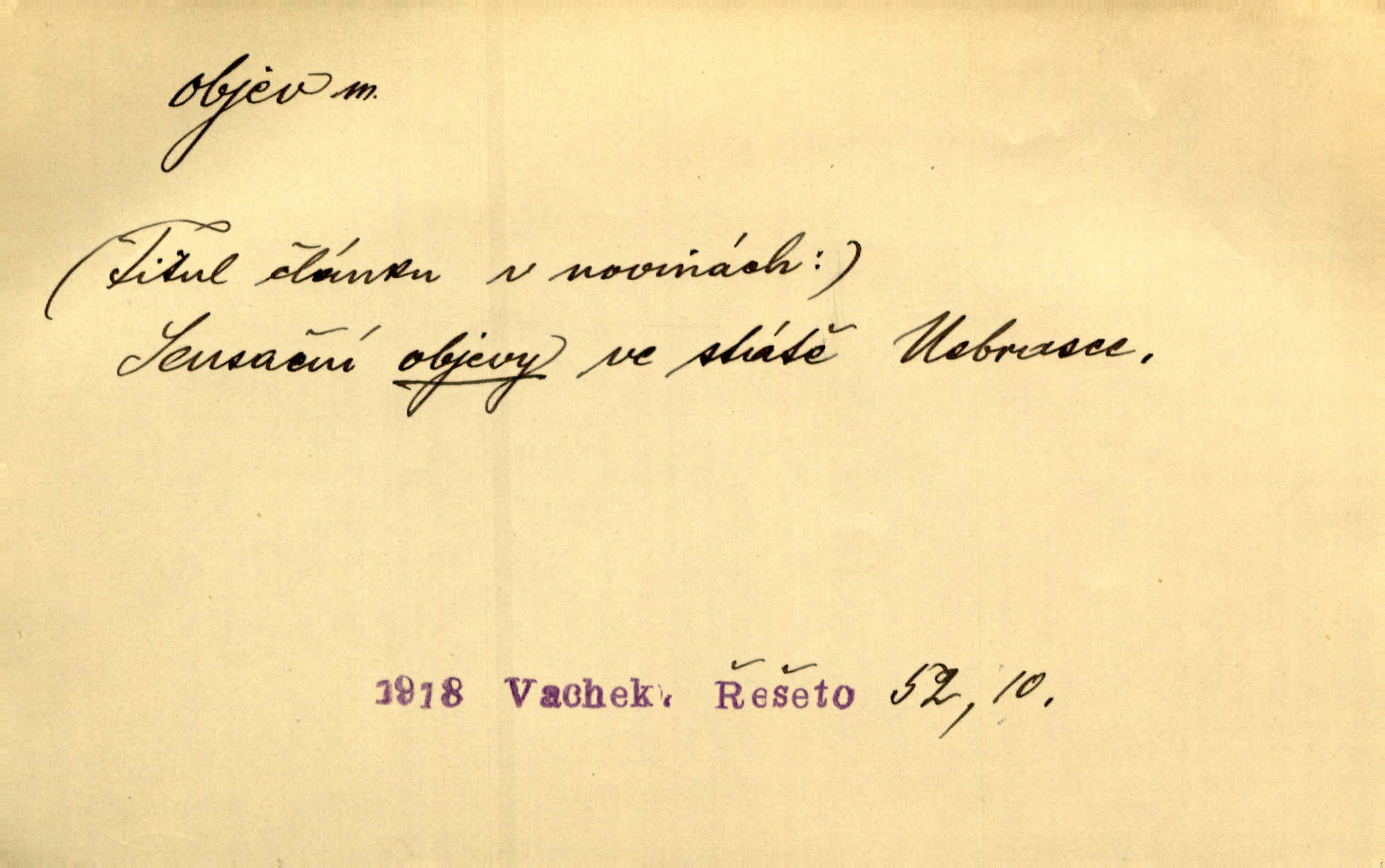 - objev, -u m. nález, odhalení něčeho, co dosud bylo neznámo n. o čem se nevědělo, objevení. Mapa objevů v Novém světě. Stroup. Celé město čekalo jakési objevy [o rodině tajemníkově]‚ ale sklamalo se. R. Svob. Byl to překvapující objev [pro spisovatele]‚ že Anglie je opravdu anglická. K. Čap. D Zř. objevení se, projev. Vzhlédla [Viola] k němu [muži] s láskou vroucí a zašla s ladným jitra objevem. O. Červ. První objev této změny jeho [Mohamedových] citů vidíme v nakládání jeho se Židy. Rieg. D Zř. zjev. [Hraběnka] uražena hrdopyšným objevem mladého vychovatele, nelibost svou sotva ukryla. Pfleg.
