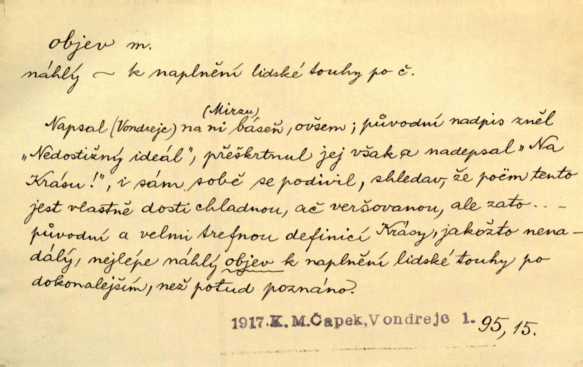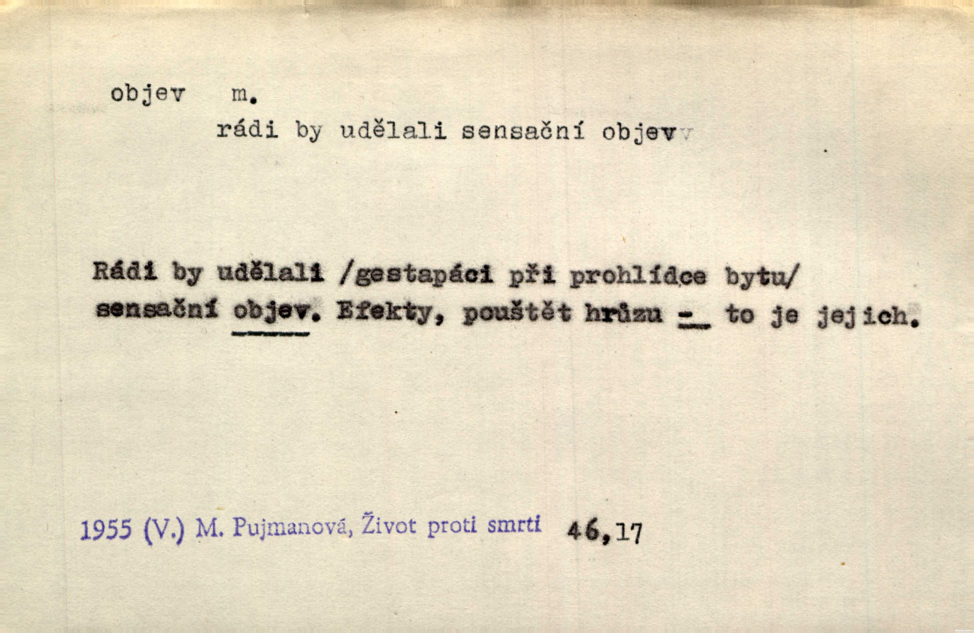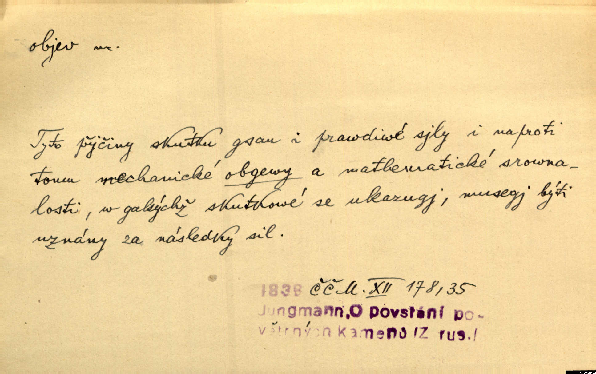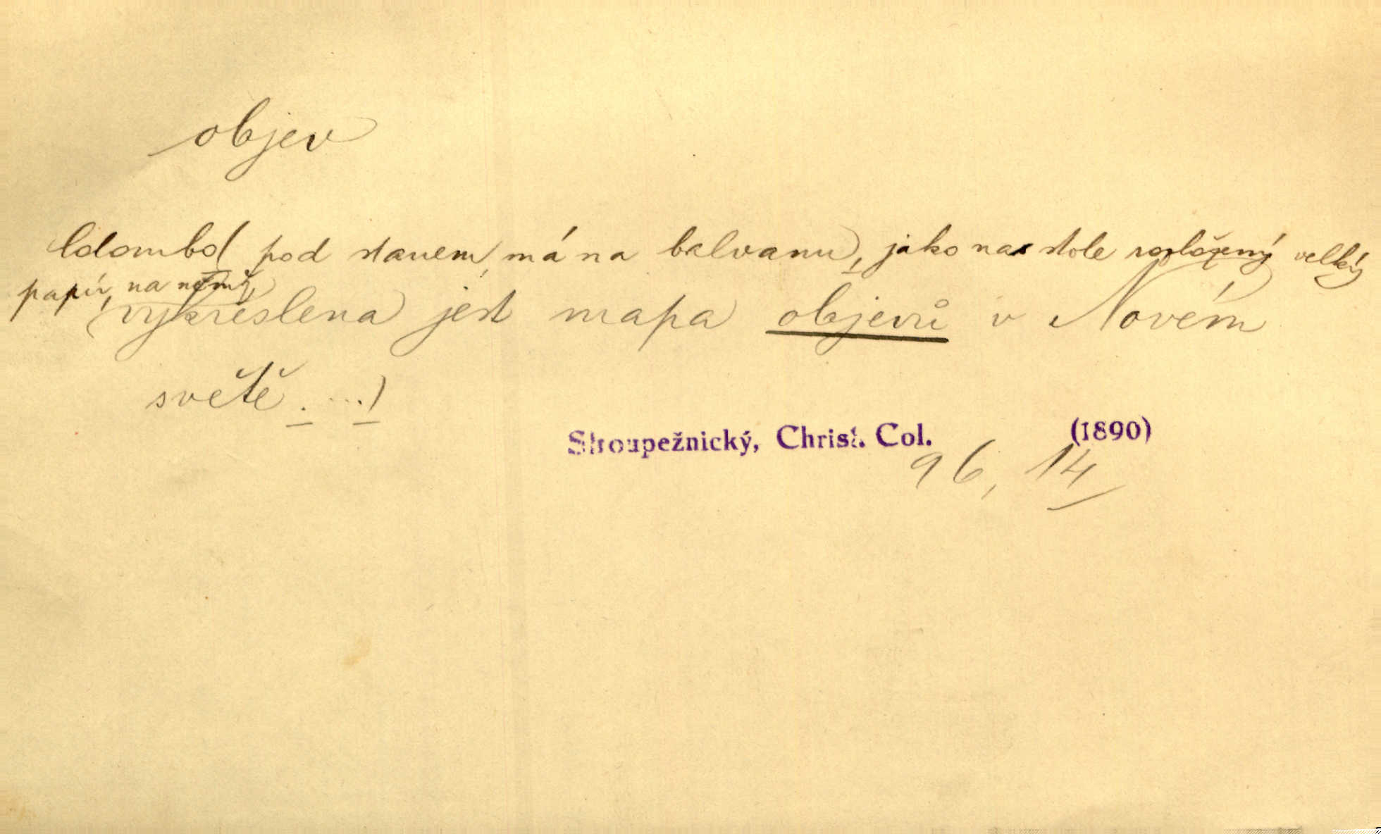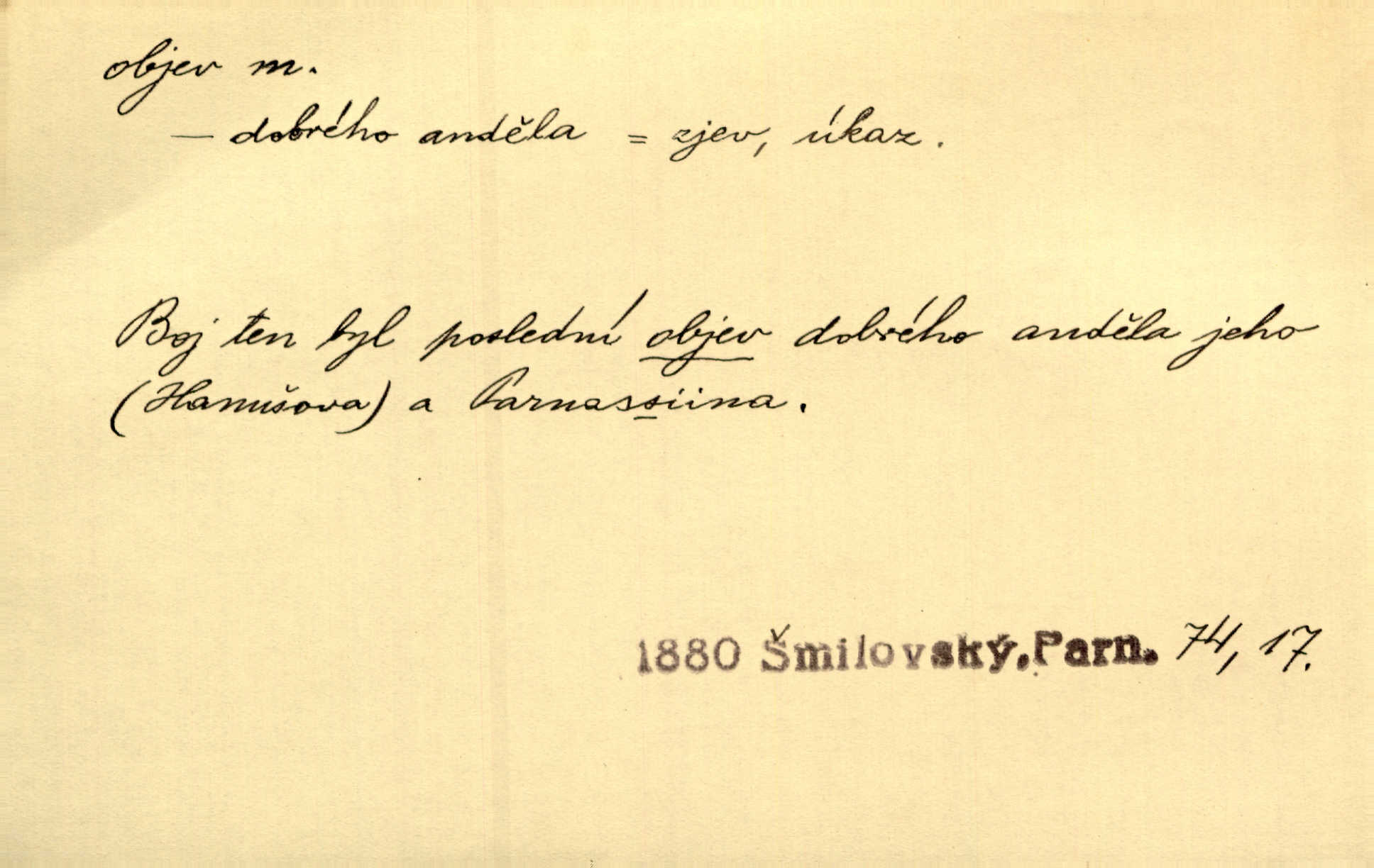 - objev, -u m. nález, odhalení něčeho, co dosud bylo neznámo n. o čem se nevědělo, objevení. Mapa objevů v Novém světě. Stroup. Celé město čekalo jakési objevy [o rodině tajemníkově]‚ ale sklamalo se. R. Svob. Byl to překvapující objev [pro spisovatele]‚ že Anglie je opravdu anglická. K. Čap. D Zř. objevení se, projev. Vzhlédla [Viola] k němu [muži] s láskou vroucí a zašla s ladným jitra objevem. O. Červ. První objev této změny jeho [Mohamedových] citů vidíme v nakládání jeho se Židy. Rieg. D Zř. zjev. [Hraběnka] uražena hrdopyšným objevem mladého vychovatele, nelibost svou sotva ukryla. Pfleg.