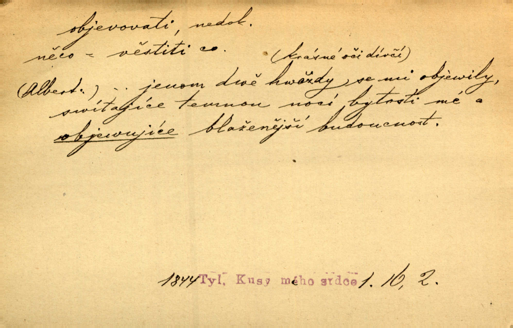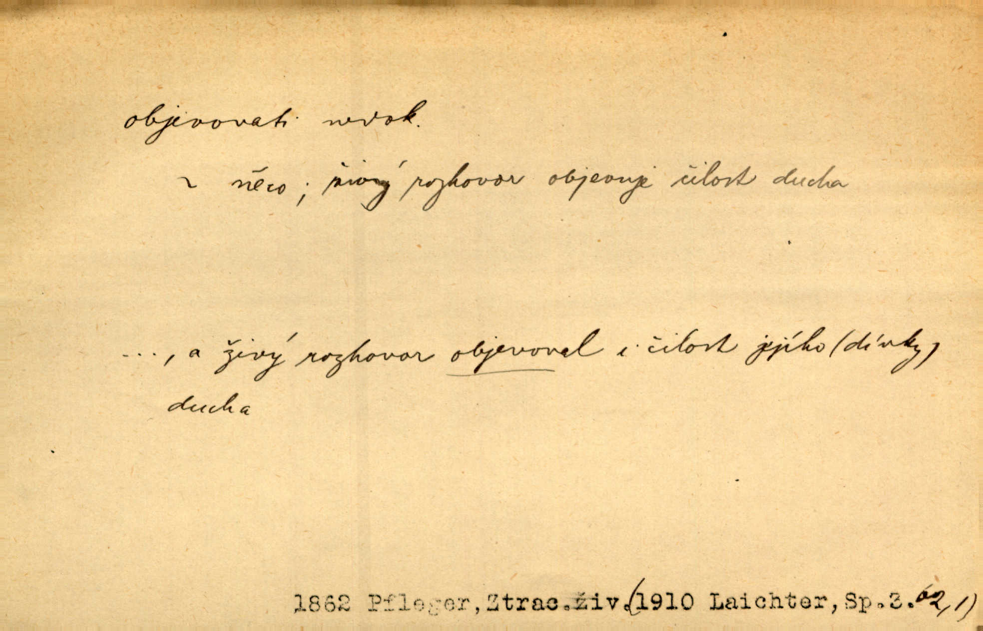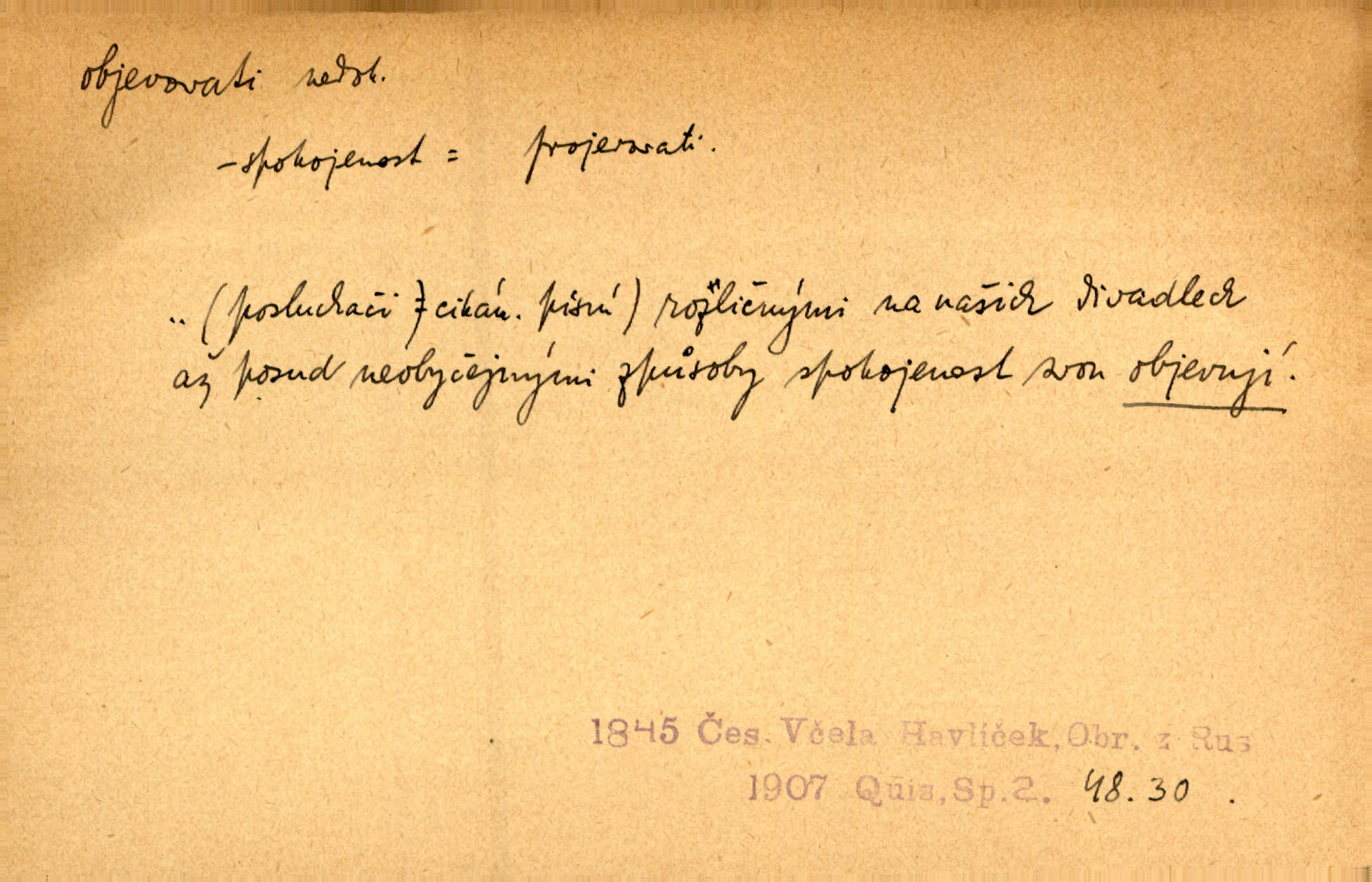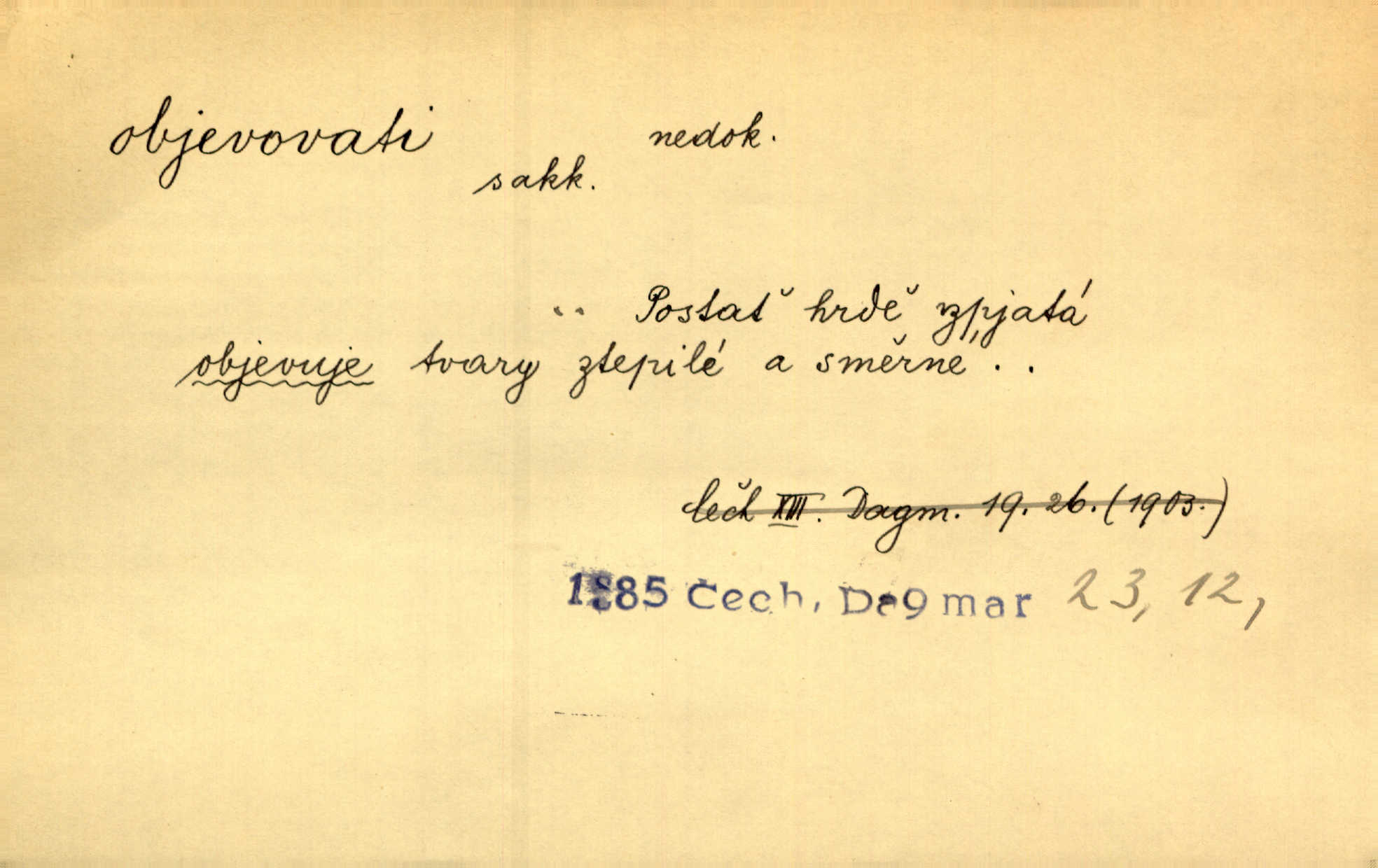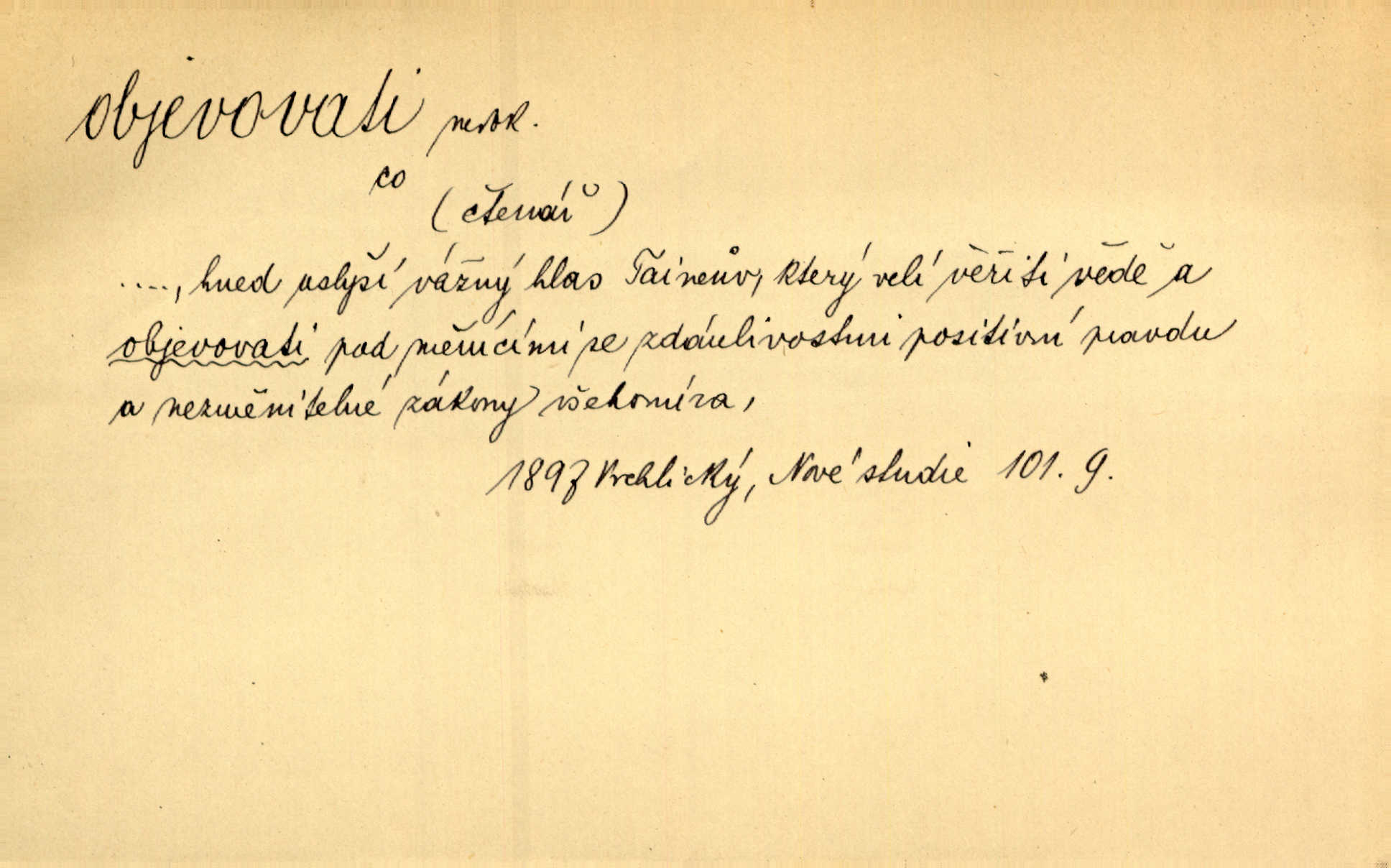 - objevovati ned. nalézati něco n. připadati na něco, co dosud bylo neznámo n. o čem se nevědělo. Objevoval nové její [manželčiny] nedostatky, jež mu dříve ušly. Vach. Objevoval v sobě úbytek duševních sil. Čech. D dávati najevo, projevovati, ukazovati. Sňal hluboko klobouk, objevuje šedou hlavu. R. Svob. Postať hrdě vypjatá objevuje tvary ztepilé a směrné. Čech. D objevovati se stávati se zjevným, ukazovati se, jeviti se, projevovati se, vyskytovati se. Východní obyčeje přikazují ženským, aby se veřejně bez hustých závojů neobjevovaly. Ner. Věřil [kněz] v objevování se duchů. Čech. Na zahradách počali se objevovati hospodáři v nových kalhotách a vestách. Rais. Otec můj se mi každou noc ve snu objevuje. Svět. Za horami sivé mraky se objevují. Pfleg. V „Sebrání básní a zpěvů“ r. 1795 objevuje se Jungmann poprvé obecenstvu českému. Zel. Vždy se mi objevovala Helena jako ubohá a vydrážděná nešťastnice. Svob. Poněvadž duši nikde nevidíme, soudíme o ní jen potud, pokud se nám v činnosti objevuje. Havl. V těchto sonetech se objevuje neobyčejná bohatost myšlénková. Vrch. [Županství dvorské] žádného trvání nemělo a po r. 1110 vícekrát se neobjevuje. H. Jireč. Kostlivec také v českých pověstech objevuje se co tanečník. Ner. Sloveso náviděti se objevuje i v jiných jazycích slovanských. Zub.