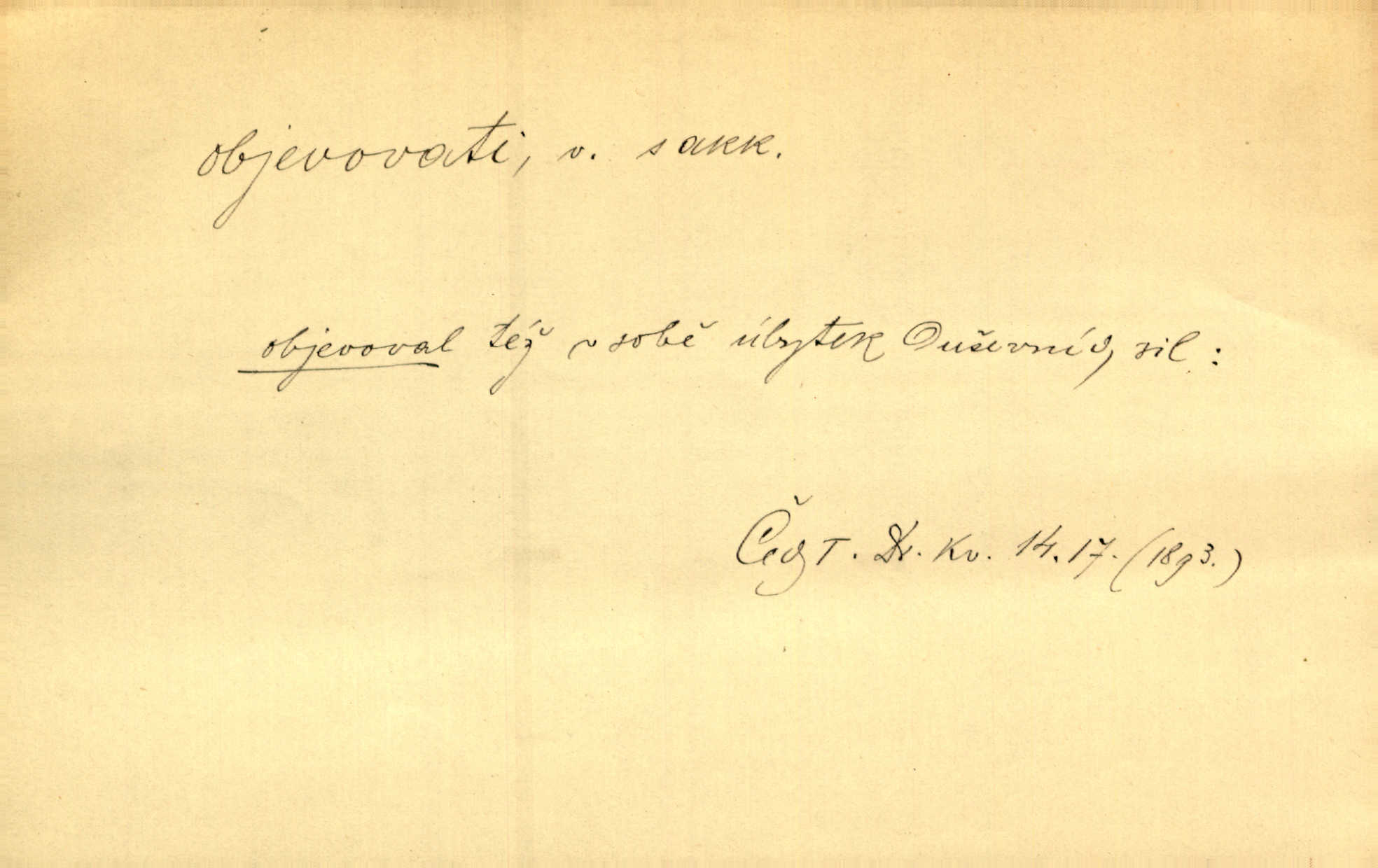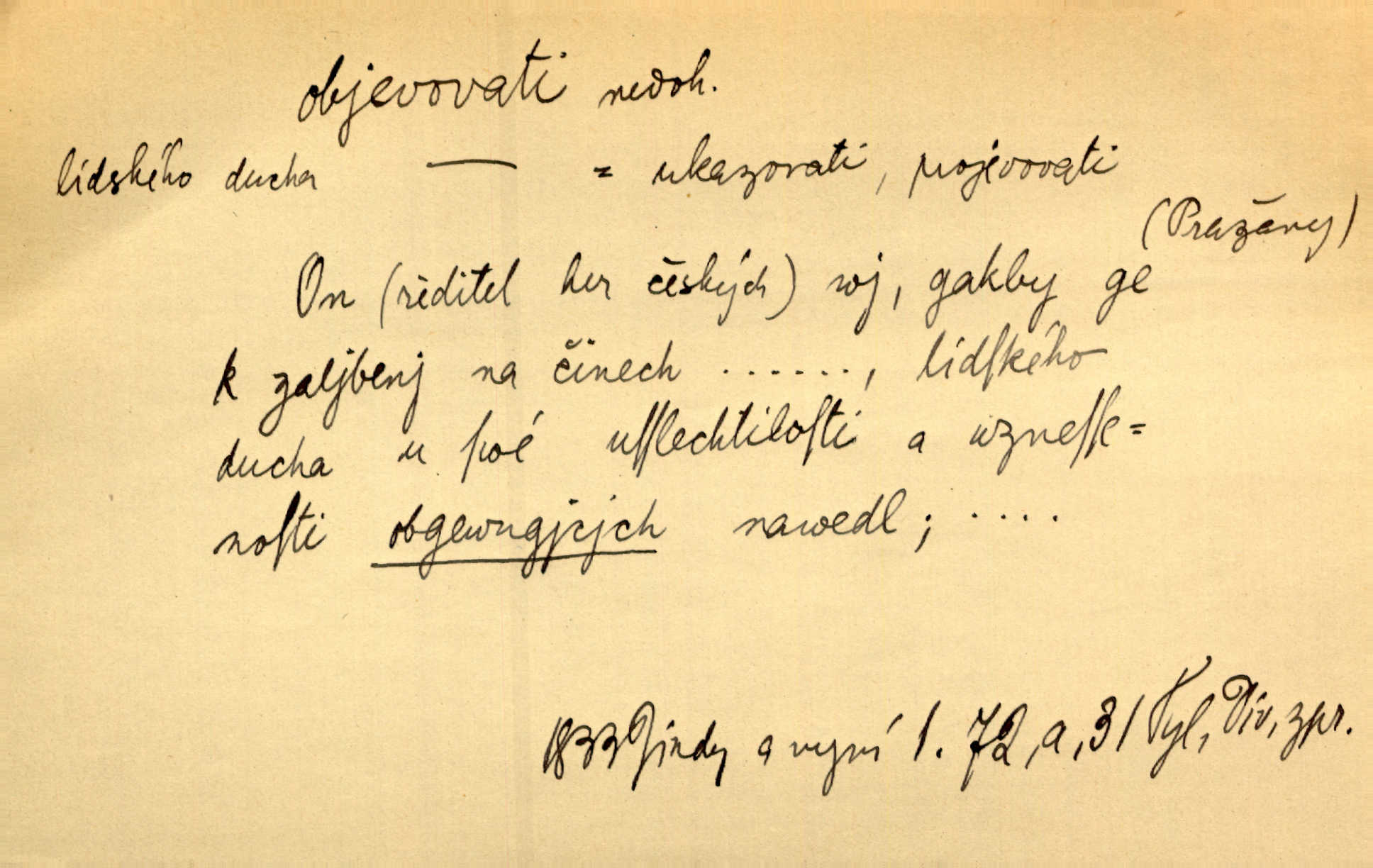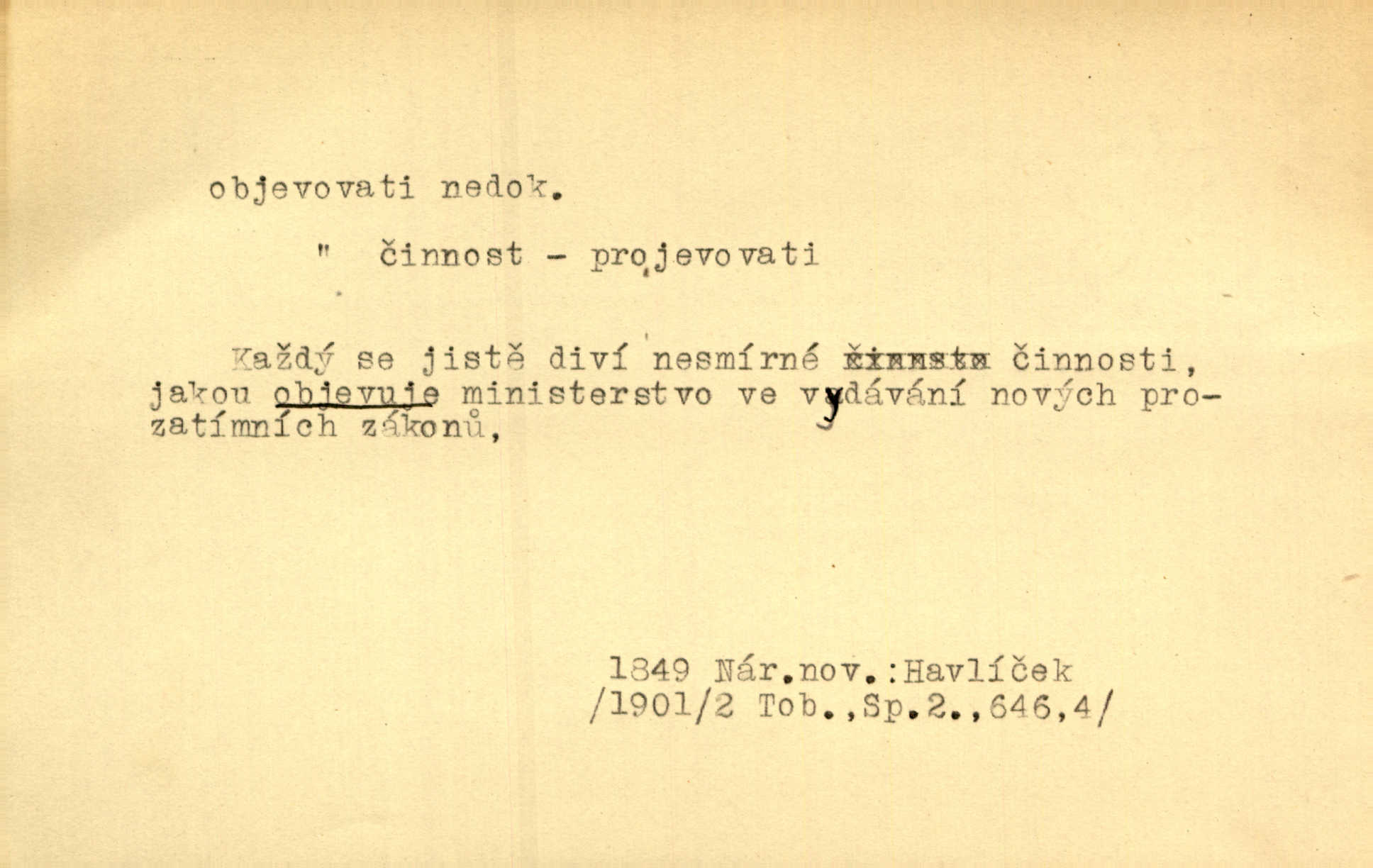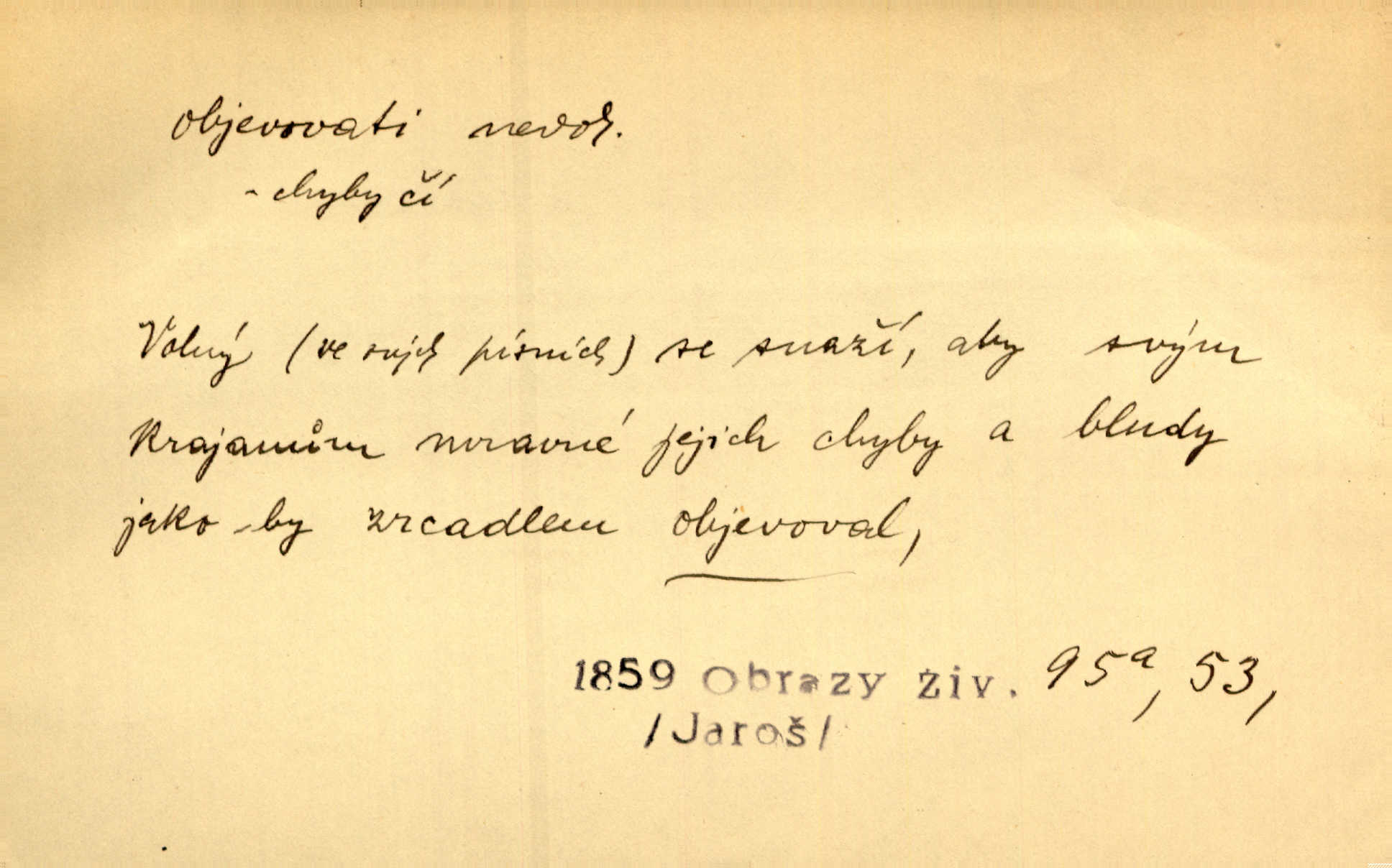- objevovati ned. nalézati něco n. připadati na něco, co dosud bylo neznámo n. o čem se nevědělo. Objevoval nové její [manželčiny] nedostatky, jež mu dříve ušly. Vach. Objevoval v sobě úbytek duševních sil. Čech. D dávati najevo, projevovati, ukazovati. Sňal hluboko klobouk, objevuje šedou hlavu. R. Svob. Postať hrdě vypjatá objevuje tvary ztepilé a směrné. Čech. D objevovati se stávati se zjevným, ukazovati se, jeviti se, projevovati se, vyskytovati se. Východní obyčeje přikazují ženským, aby se veřejně bez hustých závojů neobjevovaly. Ner. Věřil [kněz] v objevování se duchů. Čech. Na zahradách počali se objevovati hospodáři v nových kalhotách a vestách. Rais. Otec můj se mi každou noc ve snu objevuje. Svět. Za horami sivé mraky se objevují. Pfleg. V „Sebrání básní a zpěvů“ r. 1795 objevuje se Jungmann poprvé obecenstvu českému. Zel. Vždy se mi objevovala Helena jako ubohá a vydrážděná nešťastnice. Svob. Poněvadž duši nikde nevidíme, soudíme o ní jen potud, pokud se nám v činnosti objevuje. Havl. V těchto sonetech se objevuje neobyčejná bohatost myšlénková. Vrch. [Županství dvorské] žádného trvání nemělo a po r. 1110 vícekrát se neobjevuje. H. Jireč. Kostlivec také v českých pověstech objevuje se co tanečník. Ner. Sloveso náviděti se objevuje i v jiných jazycích slovanských. Zub.