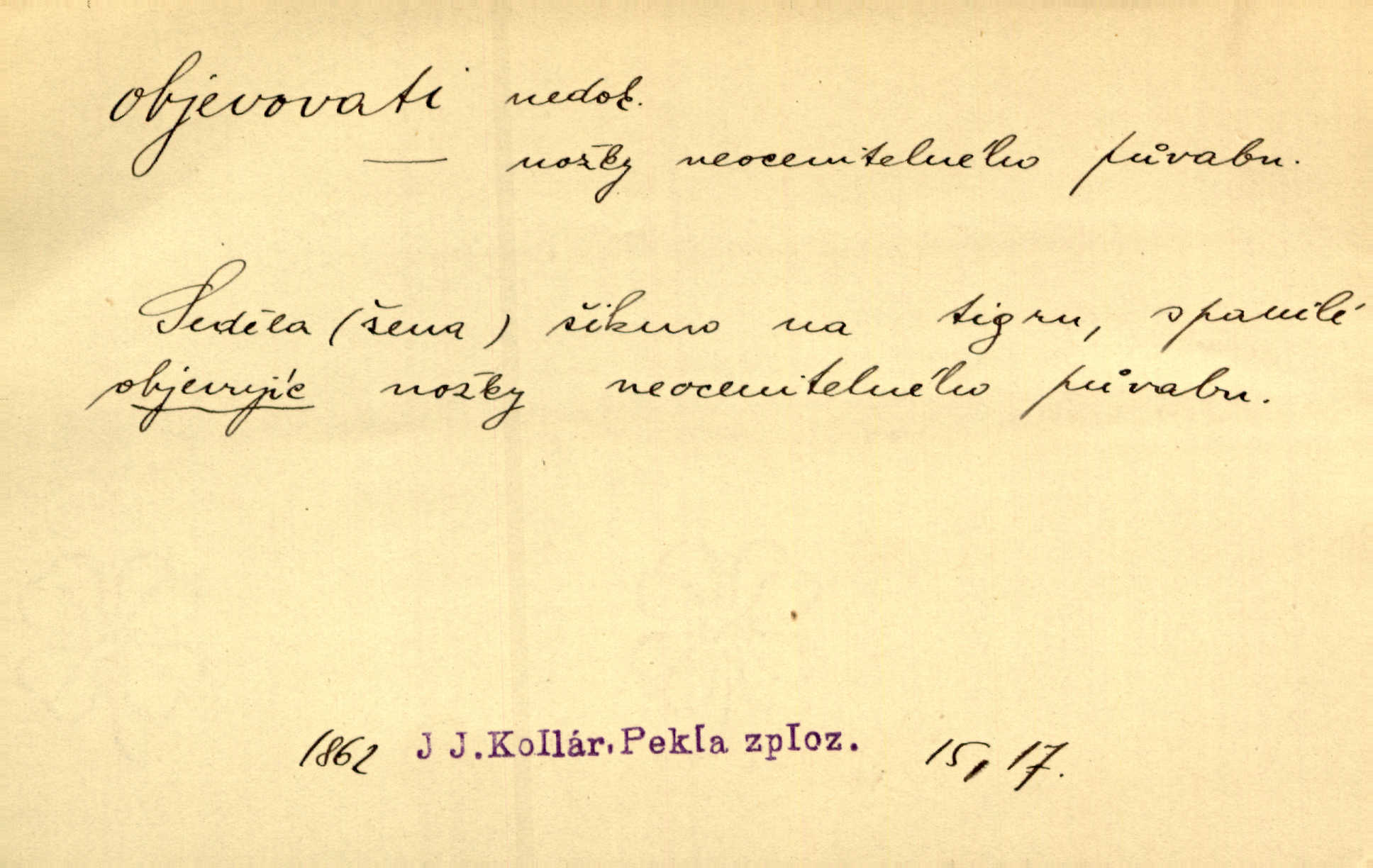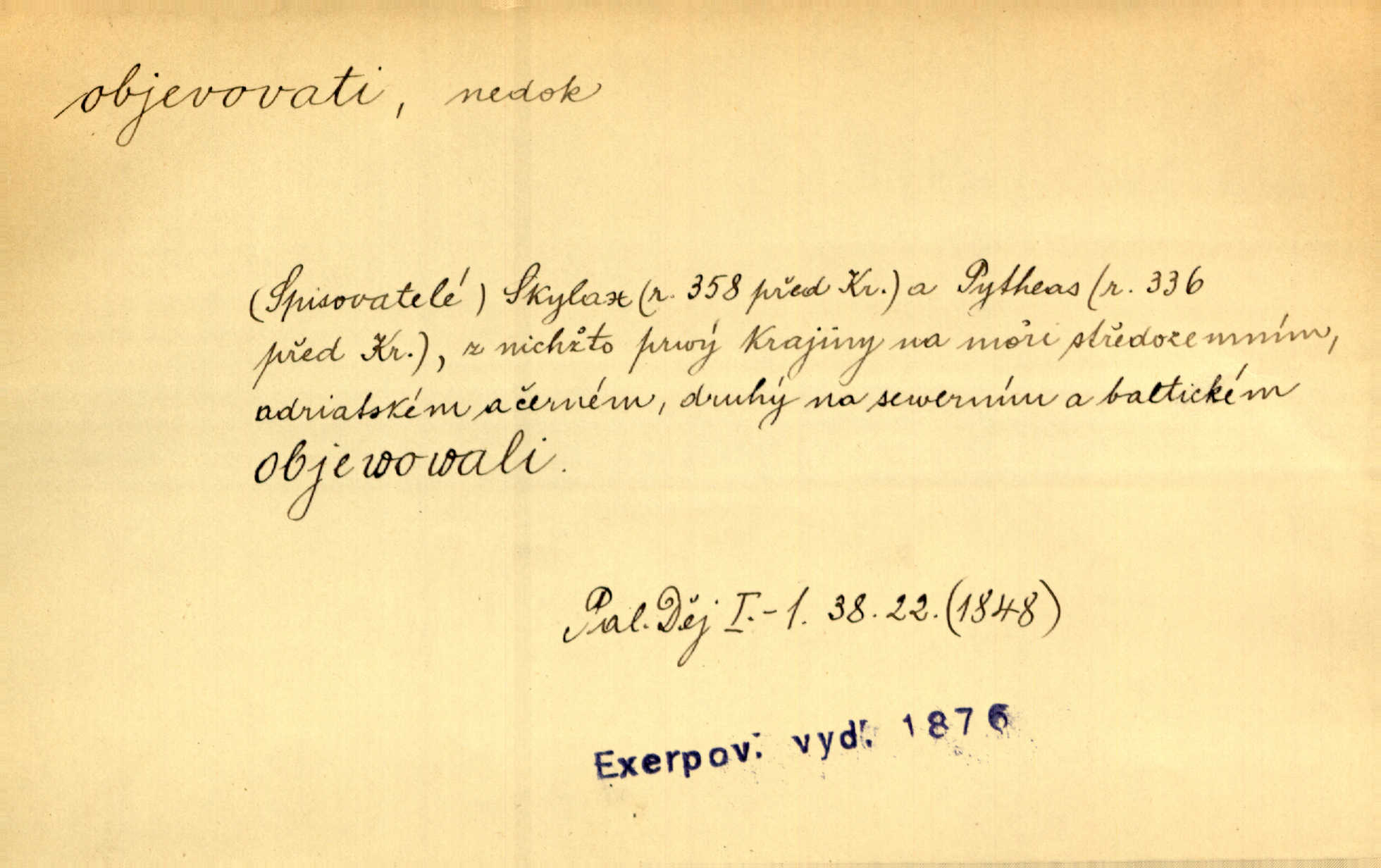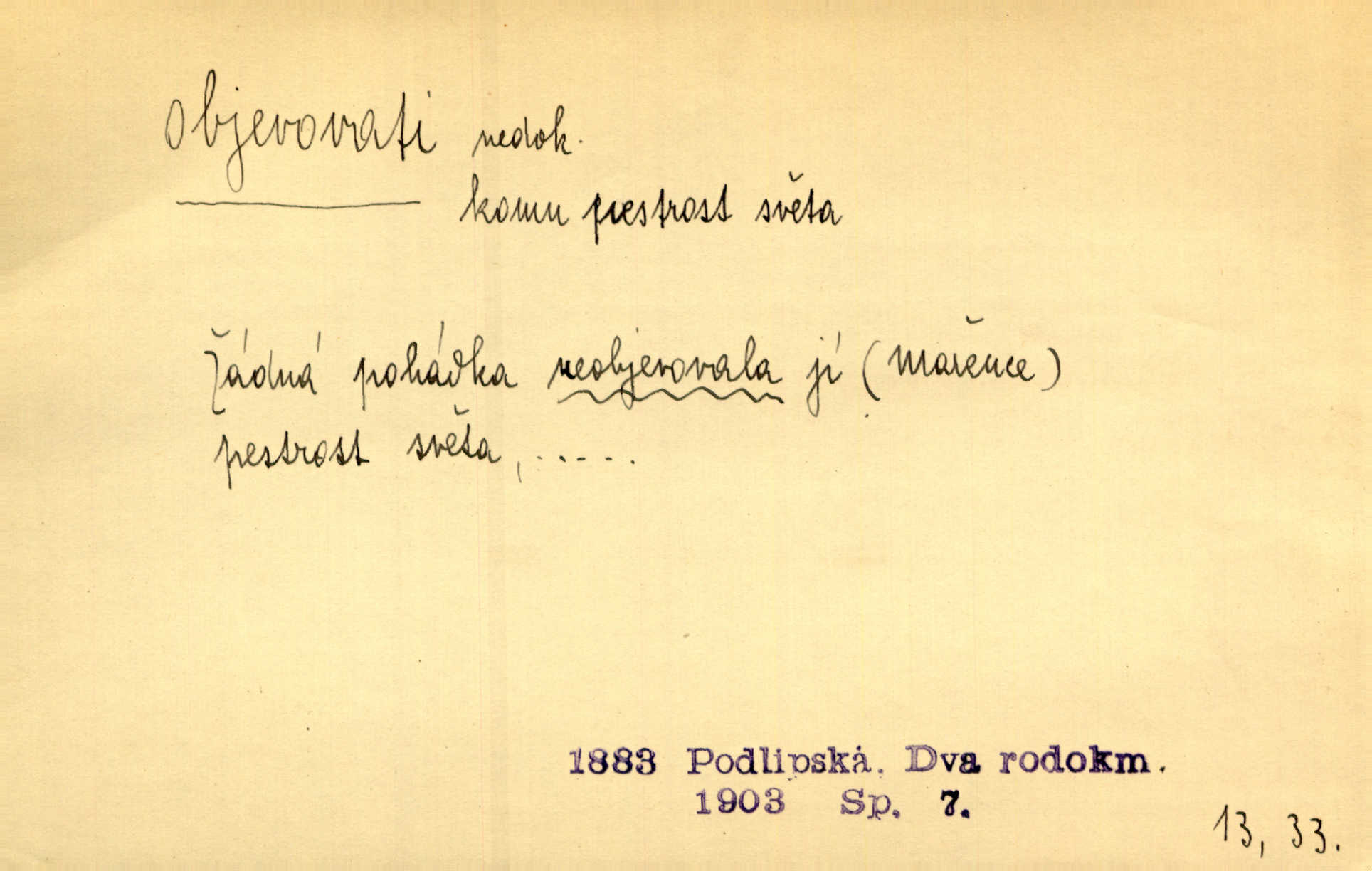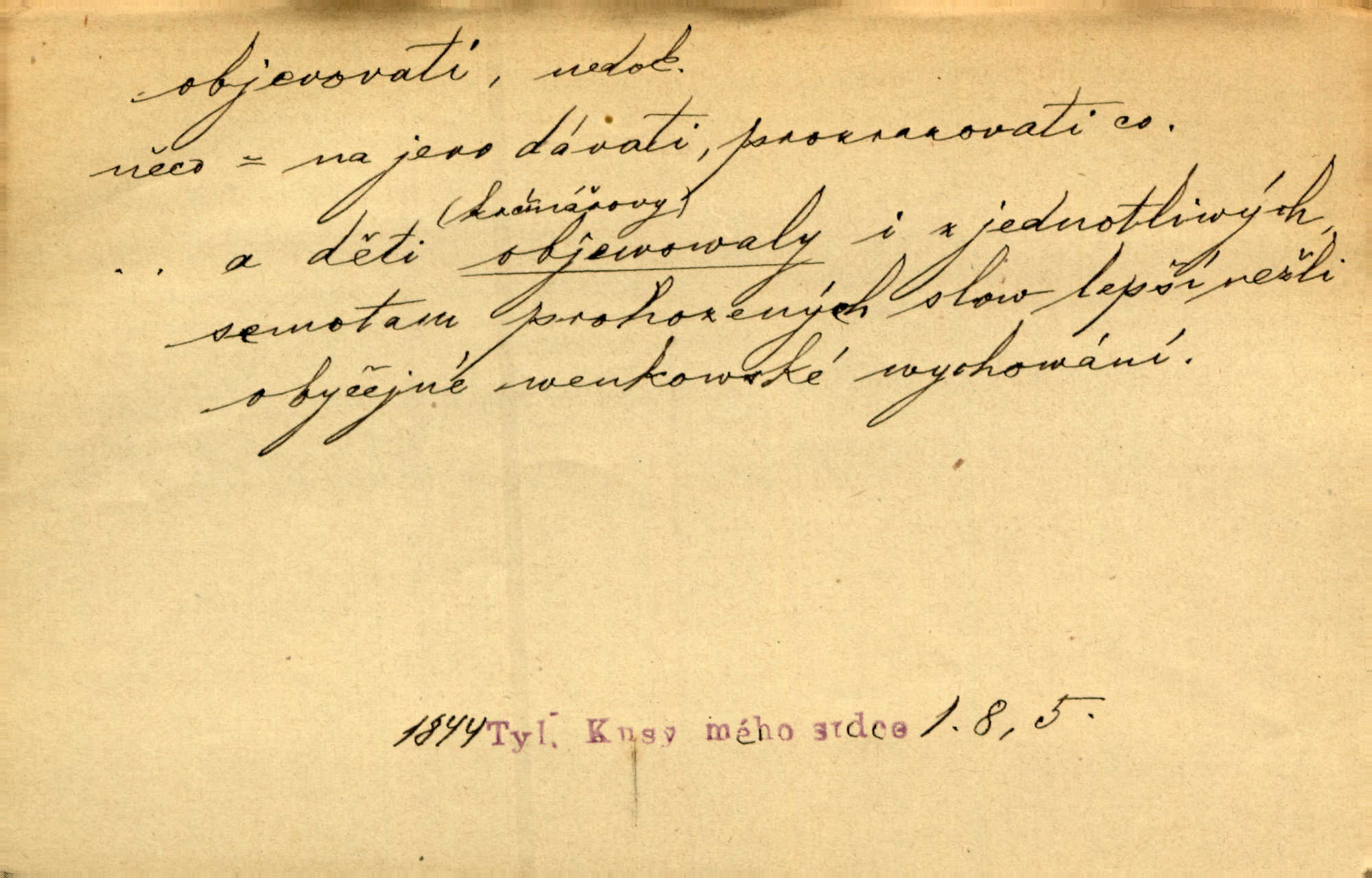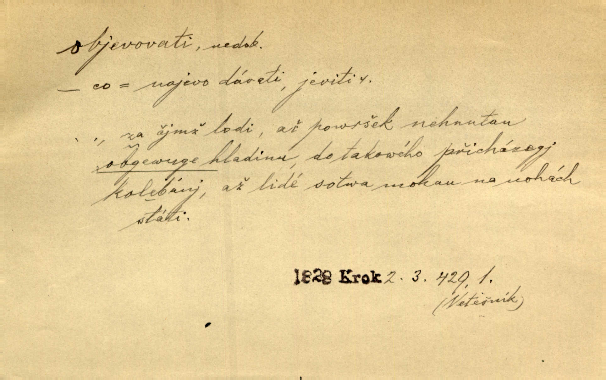 - objevovati ned. nalézati něco n. připadati na něco, co dosud bylo neznámo n. o čem se nevědělo. Objevoval nové její [manželčiny] nedostatky, jež mu dříve ušly. Vach. Objevoval v sobě úbytek duševních sil. Čech. D dávati najevo, projevovati, ukazovati. Sňal hluboko klobouk, objevuje šedou hlavu. R. Svob. Postať hrdě vypjatá objevuje tvary ztepilé a směrné. Čech. D objevovati se stávati se zjevným, ukazovati se, jeviti se, projevovati se, vyskytovati se. Východní obyčeje přikazují ženským, aby se veřejně bez hustých závojů neobjevovaly. Ner. Věřil [kněz] v objevování se duchů. Čech. Na zahradách počali se objevovati hospodáři v nových kalhotách a vestách. Rais. Otec můj se mi každou noc ve snu objevuje. Svět. Za horami sivé mraky se objevují. Pfleg. V „Sebrání básní a zpěvů“ r. 1795 objevuje se Jungmann poprvé obecenstvu českému. Zel. Vždy se mi objevovala Helena jako ubohá a vydrážděná nešťastnice. Svob. Poněvadž duši nikde nevidíme, soudíme o ní jen potud, pokud se nám v činnosti objevuje. Havl. V těchto sonetech se objevuje neobyčejná bohatost myšlénková. Vrch. [Županství dvorské] žádného trvání nemělo a po r. 1110 vícekrát se neobjevuje. H. Jireč. Kostlivec také v českých pověstech objevuje se co tanečník. Ner. Sloveso náviděti se objevuje i v jiných jazycích slovanských. Zub.