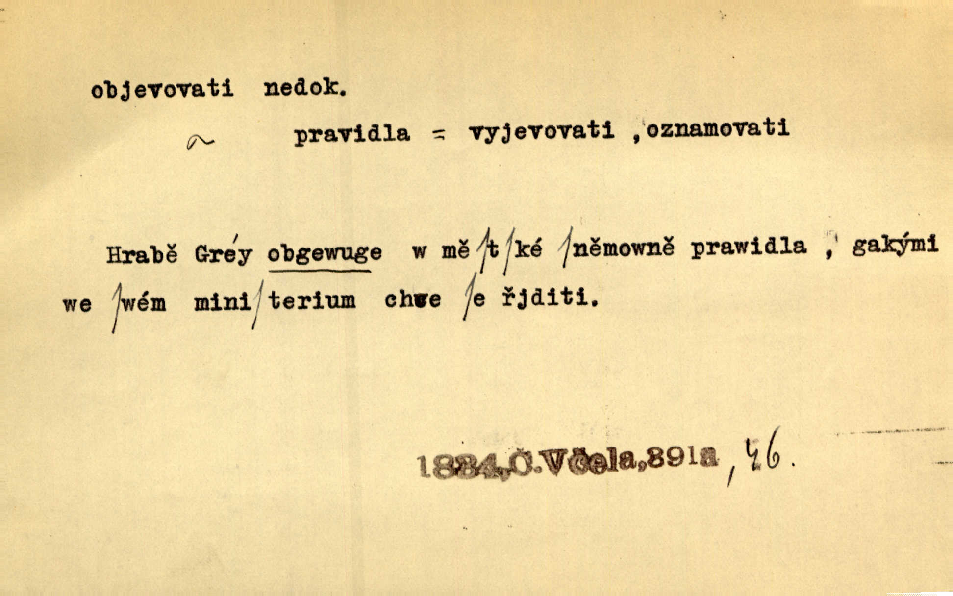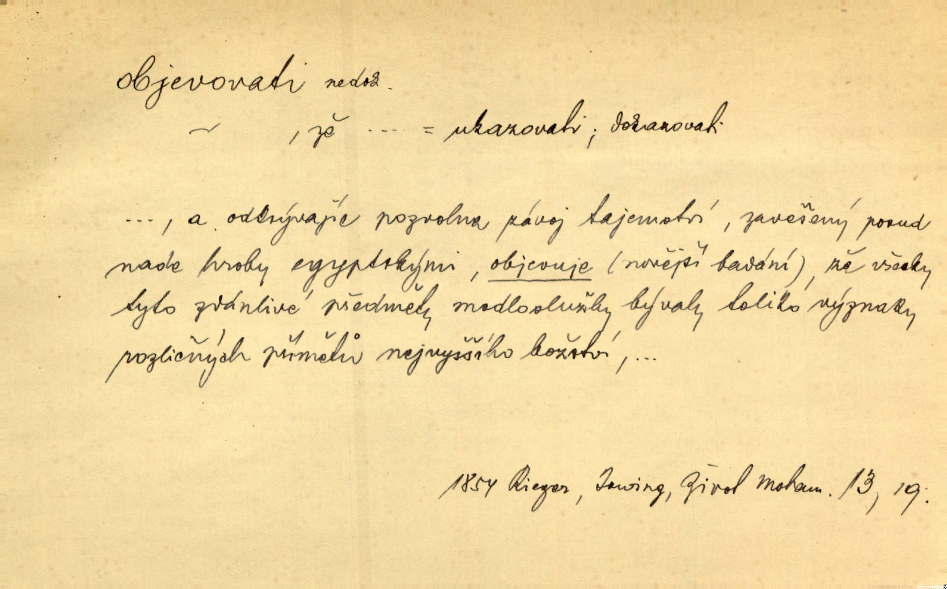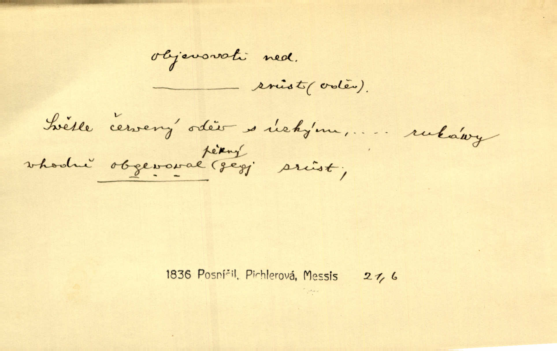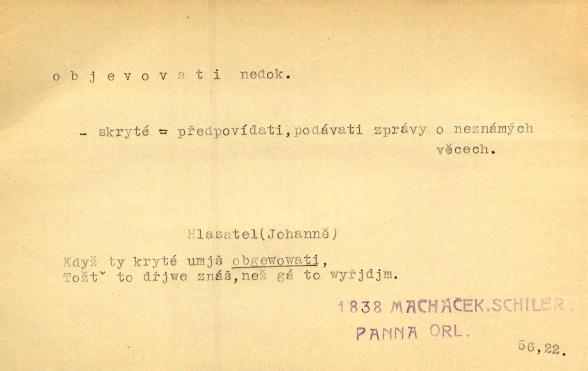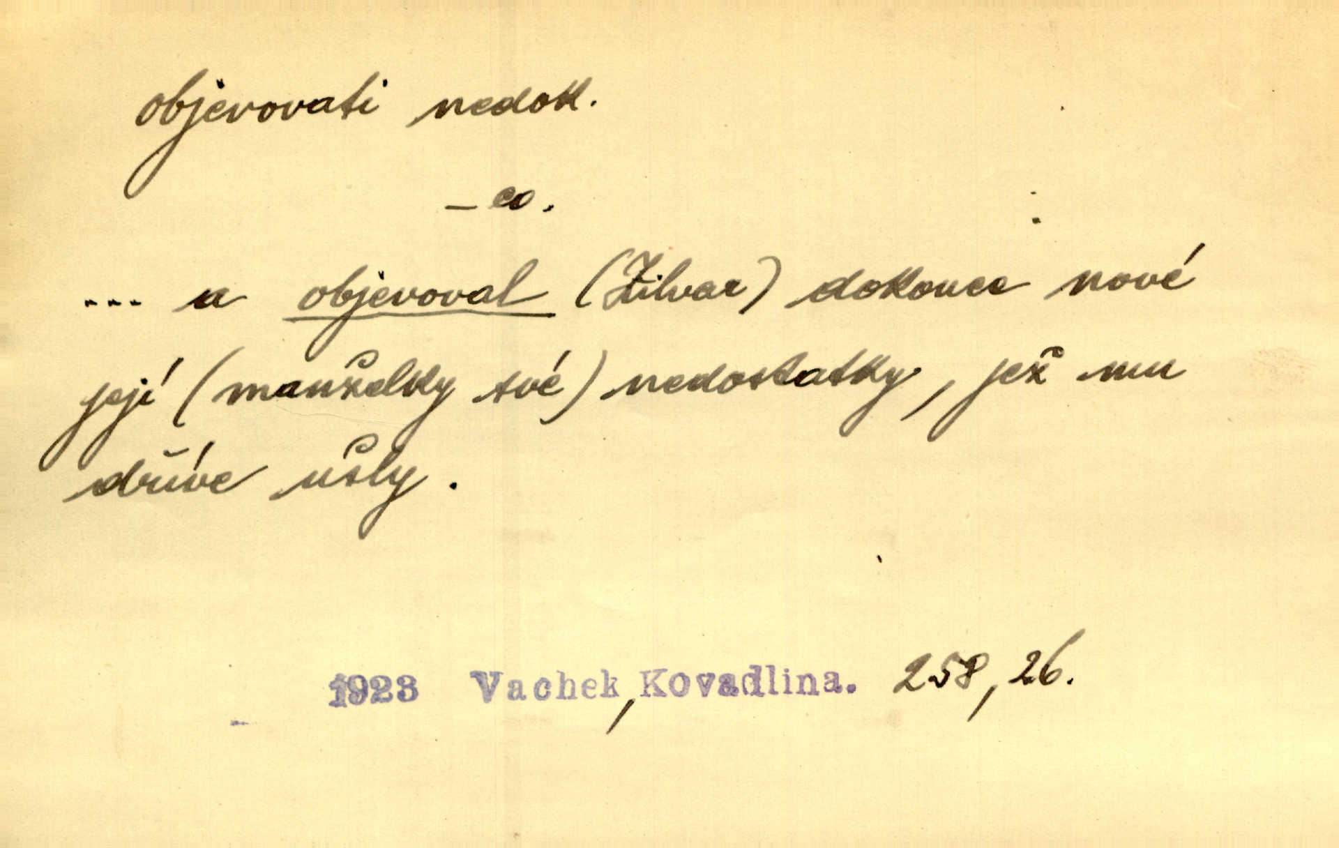 - objevovati ned. nalézati něco n. připadati na něco, co dosud bylo neznámo n. o čem se nevědělo. Objevoval nové její [manželčiny] nedostatky, jež mu dříve ušly. Vach. Objevoval v sobě úbytek duševních sil. Čech. D dávati najevo, projevovati, ukazovati. Sňal hluboko klobouk, objevuje šedou hlavu. R. Svob. Postať hrdě vypjatá objevuje tvary ztepilé a směrné. Čech. D objevovati se stávati se zjevným, ukazovati se, jeviti se, projevovati se, vyskytovati se. Východní obyčeje přikazují ženským, aby se veřejně bez hustých závojů neobjevovaly. Ner. Věřil [kněz] v objevování se duchů. Čech. Na zahradách počali se objevovati hospodáři v nových kalhotách a vestách. Rais. Otec můj se mi každou noc ve snu objevuje. Svět. Za horami sivé mraky se objevují. Pfleg. V „Sebrání básní a zpěvů“ r. 1795 objevuje se Jungmann poprvé obecenstvu českému. Zel. Vždy se mi objevovala Helena jako ubohá a vydrážděná nešťastnice. Svob. Poněvadž duši nikde nevidíme, soudíme o ní jen potud, pokud se nám v činnosti objevuje. Havl. V těchto sonetech se objevuje neobyčejná bohatost myšlénková. Vrch. [Županství dvorské] žádného trvání nemělo a po r. 1110 vícekrát se neobjevuje. H. Jireč. Kostlivec také v českých pověstech objevuje se co tanečník. Ner. Sloveso náviděti se objevuje i v jiných jazycích slovanských. Zub.