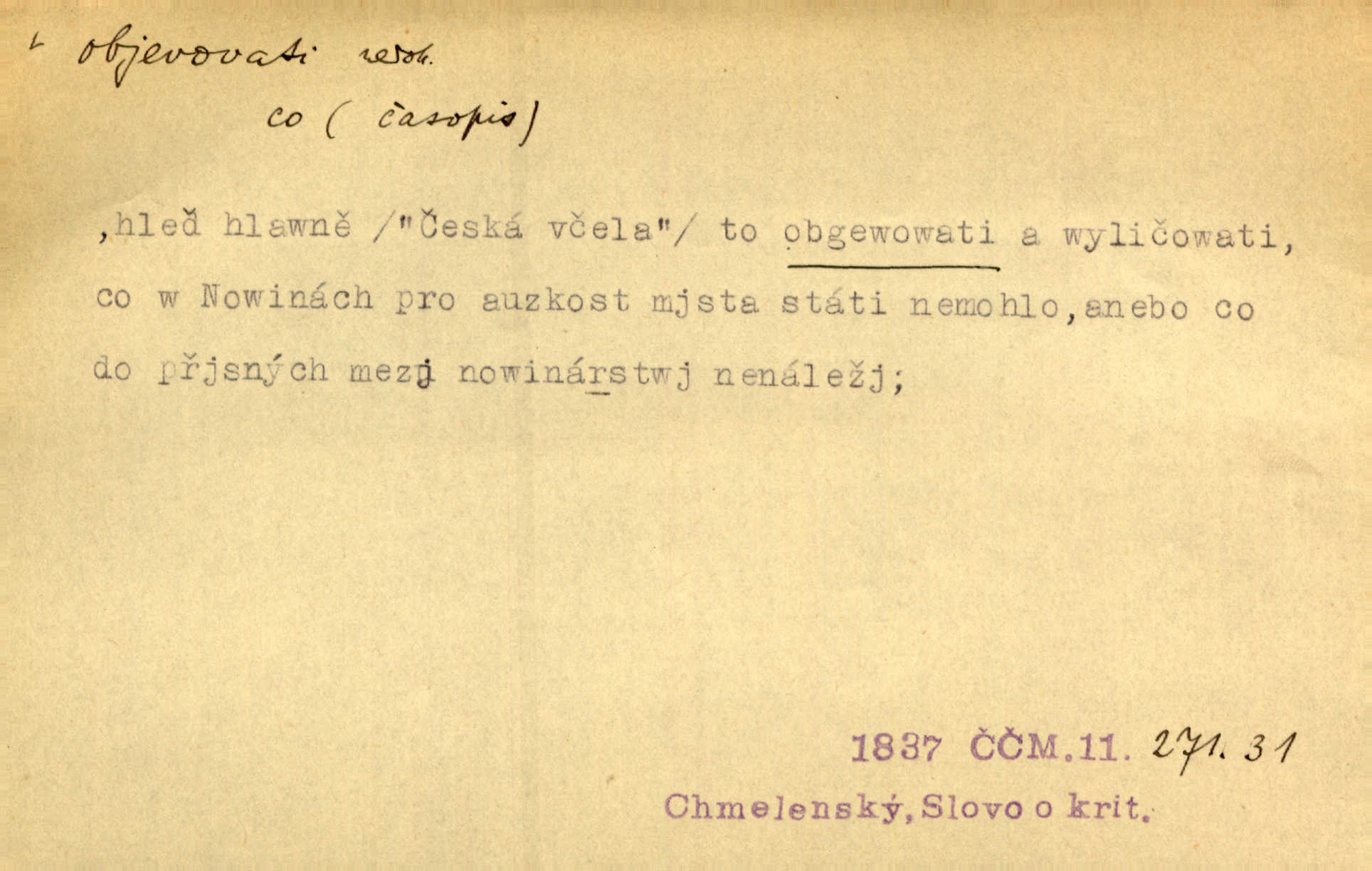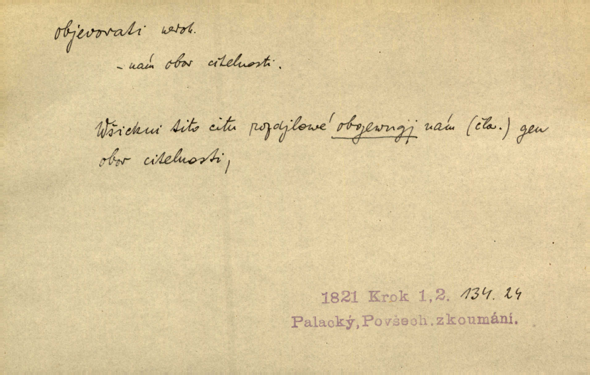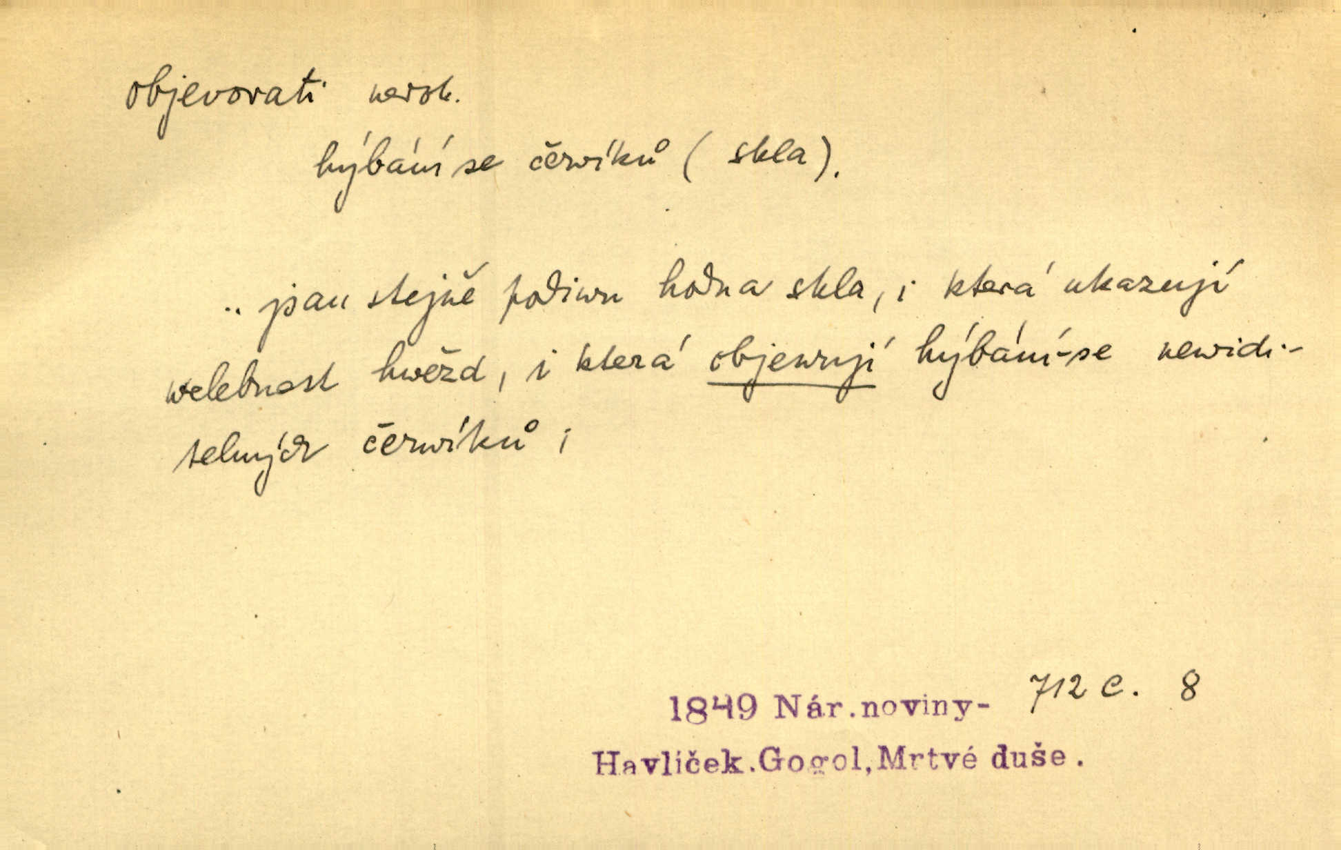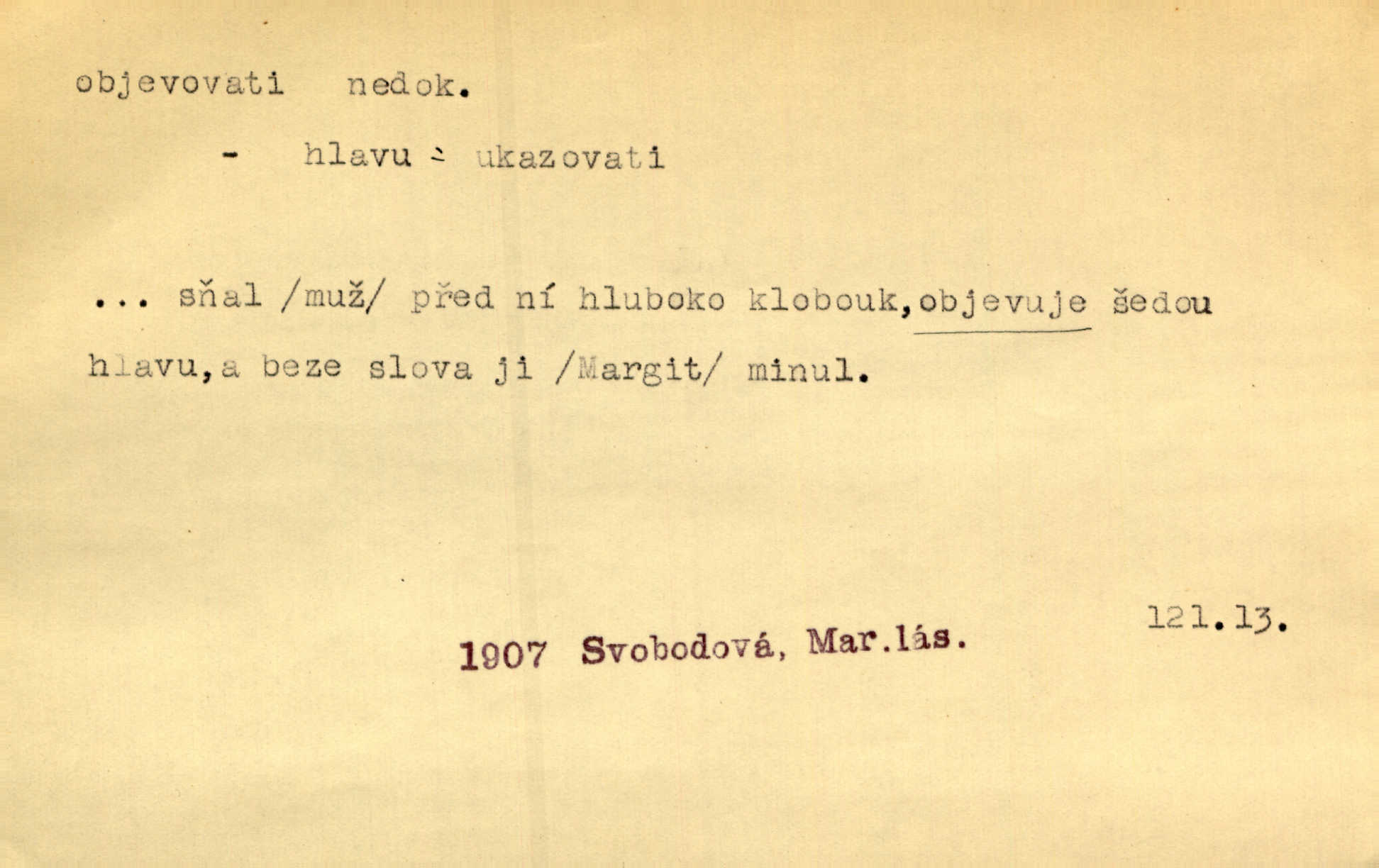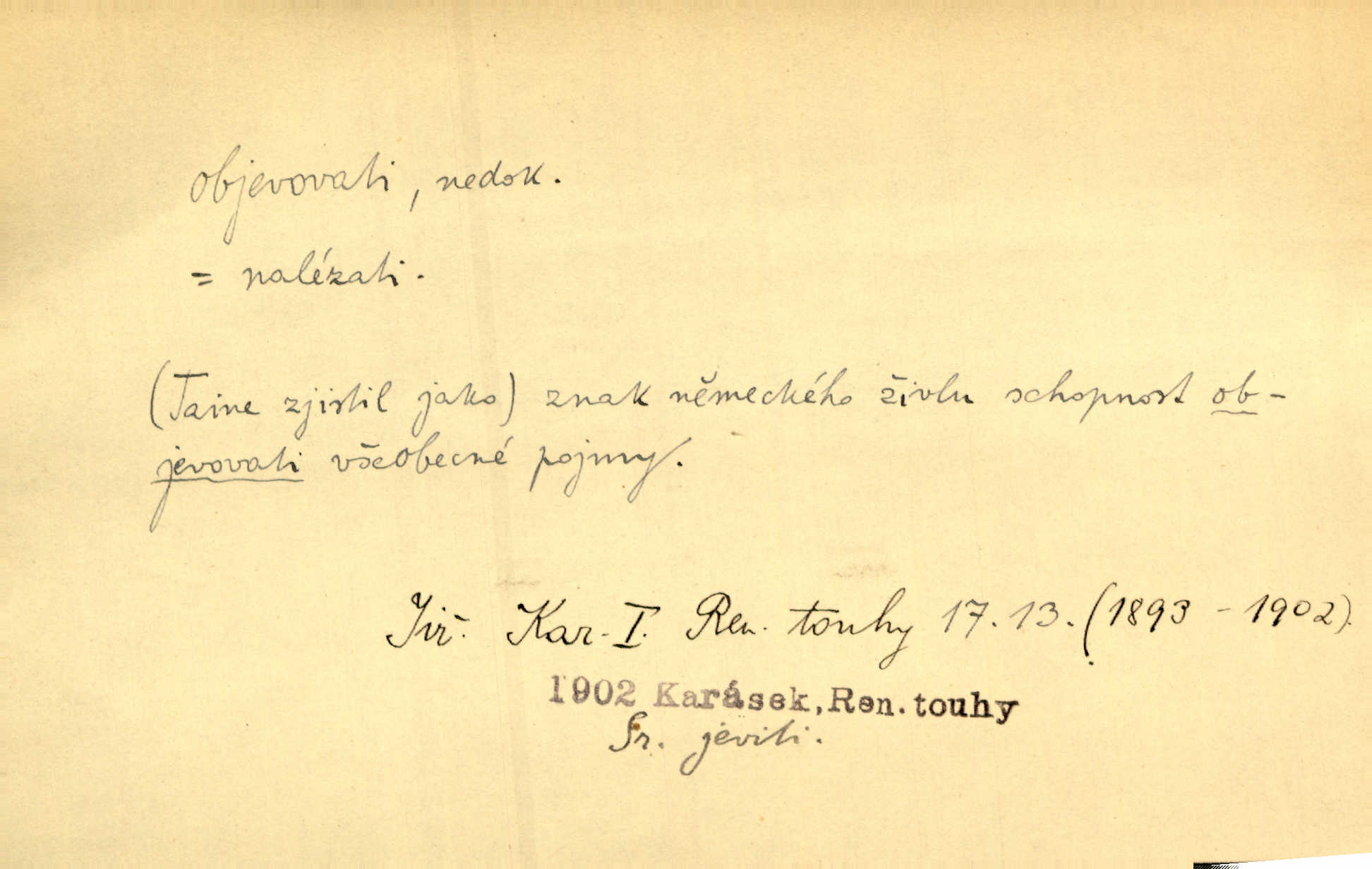 - objevovati ned. nalézati něco n. připadati na něco, co dosud bylo neznámo n. o čem se nevědělo. Objevoval nové její [manželčiny] nedostatky, jež mu dříve ušly. Vach. Objevoval v sobě úbytek duševních sil. Čech. D dávati najevo, projevovati, ukazovati. Sňal hluboko klobouk, objevuje šedou hlavu. R. Svob. Postať hrdě vypjatá objevuje tvary ztepilé a směrné. Čech. D objevovati se stávati se zjevným, ukazovati se, jeviti se, projevovati se, vyskytovati se. Východní obyčeje přikazují ženským, aby se veřejně bez hustých závojů neobjevovaly. Ner. Věřil [kněz] v objevování se duchů. Čech. Na zahradách počali se objevovati hospodáři v nových kalhotách a vestách. Rais. Otec můj se mi každou noc ve snu objevuje. Svět. Za horami sivé mraky se objevují. Pfleg. V „Sebrání básní a zpěvů“ r. 1795 objevuje se Jungmann poprvé obecenstvu českému. Zel. Vždy se mi objevovala Helena jako ubohá a vydrážděná nešťastnice. Svob. Poněvadž duši nikde nevidíme, soudíme o ní jen potud, pokud se nám v činnosti objevuje. Havl. V těchto sonetech se objevuje neobyčejná bohatost myšlénková. Vrch. [Županství dvorské] žádného trvání nemělo a po r. 1110 vícekrát se neobjevuje. H. Jireč. Kostlivec také v českých pověstech objevuje se co tanečník. Ner. Sloveso náviděti se objevuje i v jiných jazycích slovanských. Zub.