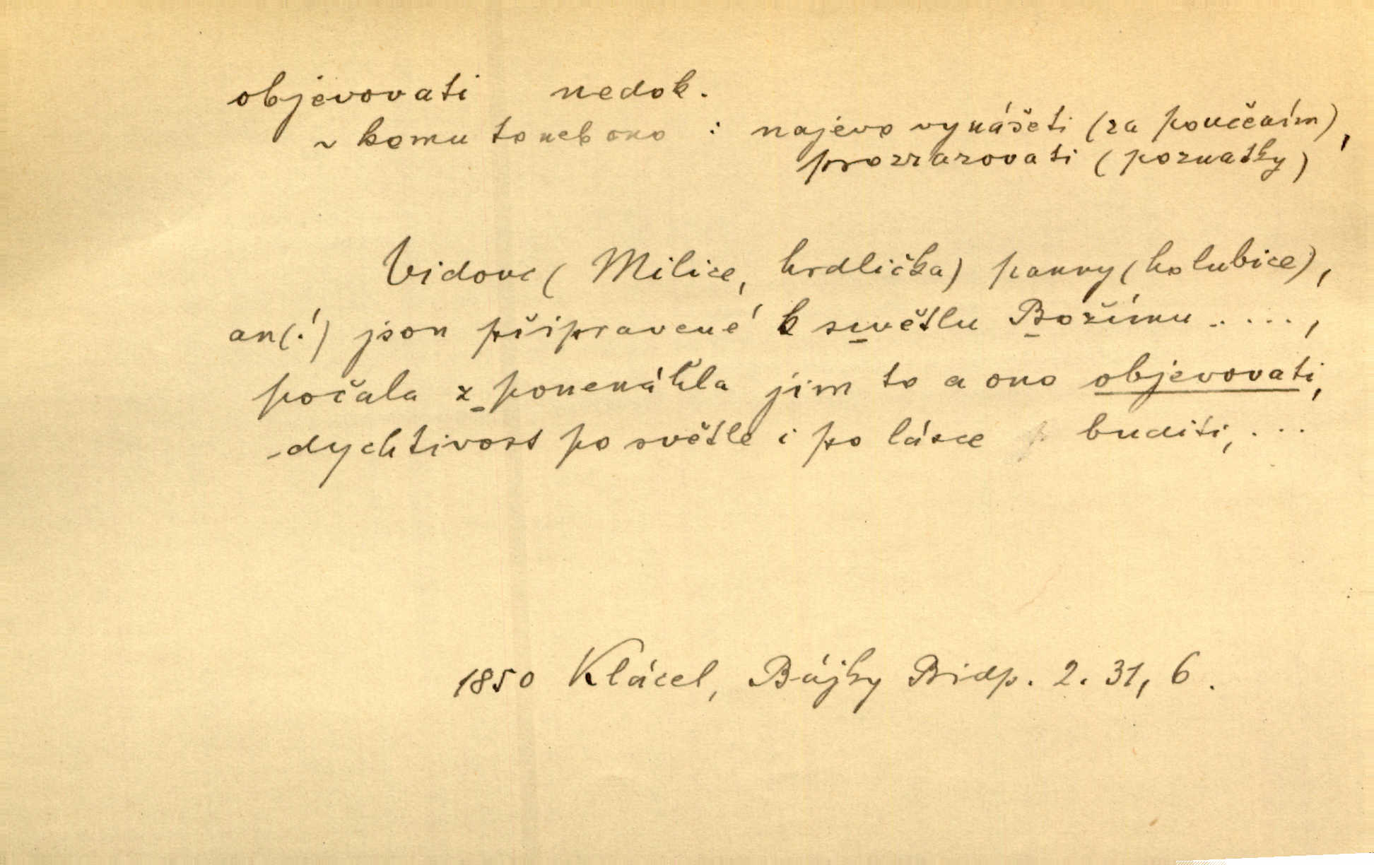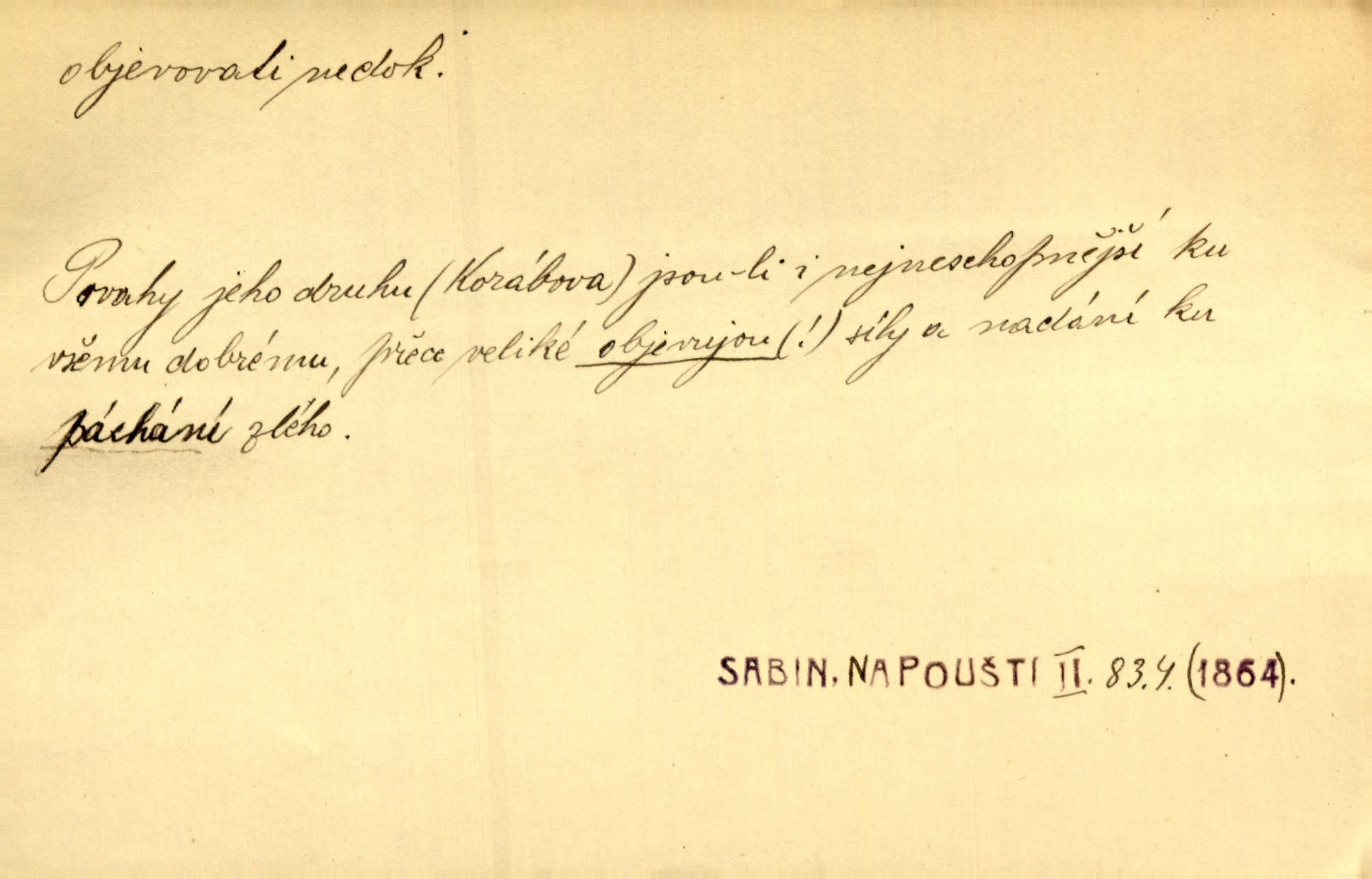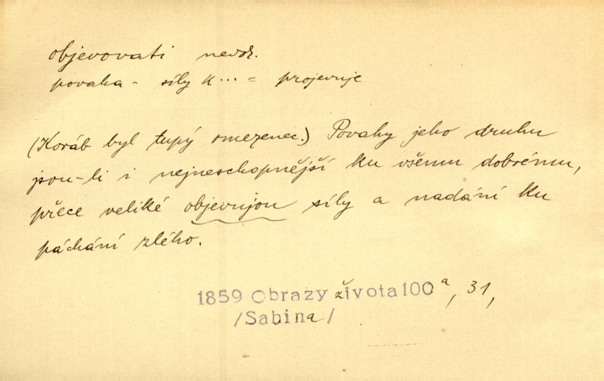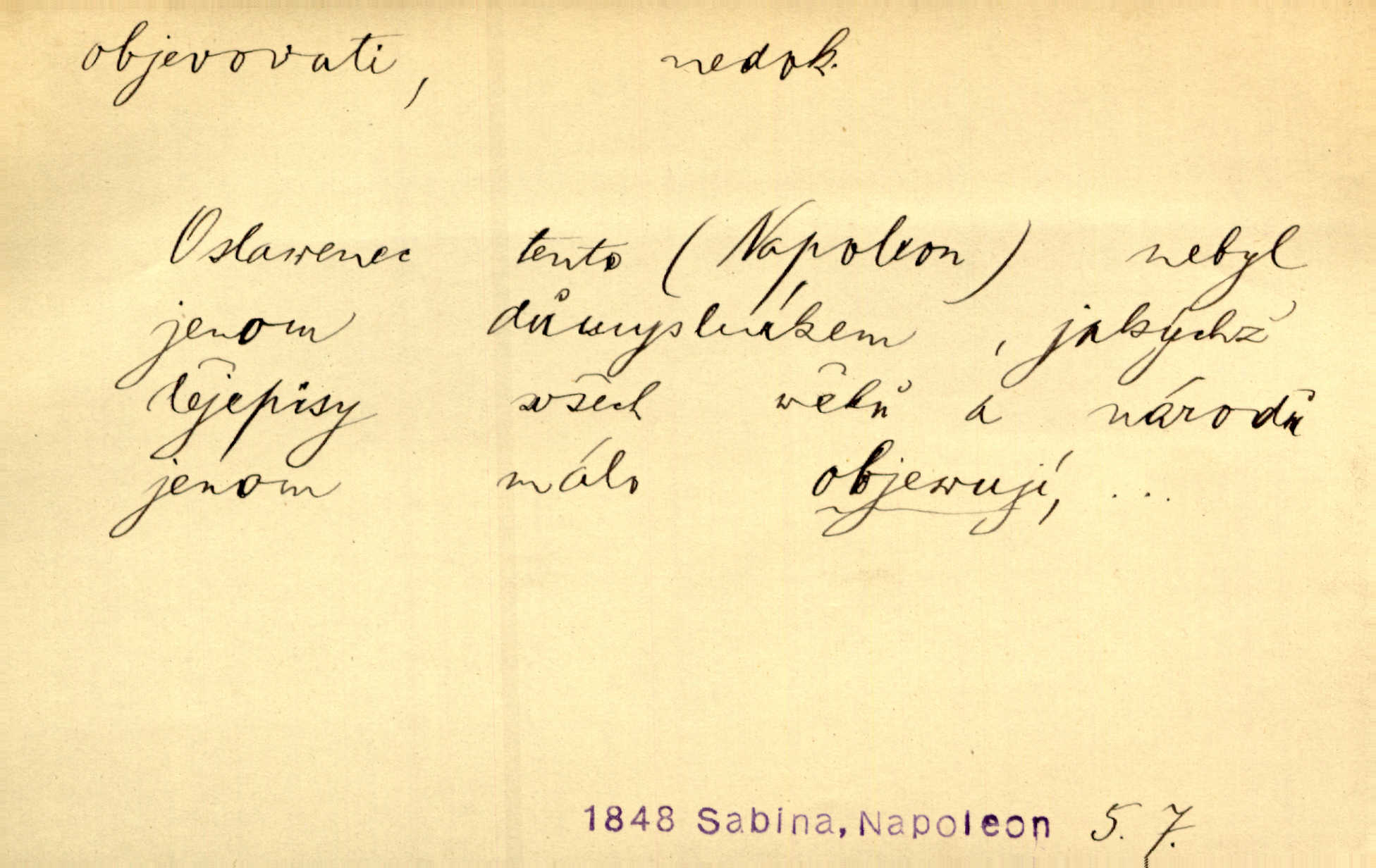 - objevovati ned. nalézati něco n. připadati na něco, co dosud bylo neznámo n. o čem se nevědělo. Objevoval nové její [manželčiny] nedostatky, jež mu dříve ušly. Vach. Objevoval v sobě úbytek duševních sil. Čech. D dávati najevo, projevovati, ukazovati. Sňal hluboko klobouk, objevuje šedou hlavu. R. Svob. Postať hrdě vypjatá objevuje tvary ztepilé a směrné. Čech. D objevovati se stávati se zjevným, ukazovati se, jeviti se, projevovati se, vyskytovati se. Východní obyčeje přikazují ženským, aby se veřejně bez hustých závojů neobjevovaly. Ner. Věřil [kněz] v objevování se duchů. Čech. Na zahradách počali se objevovati hospodáři v nových kalhotách a vestách. Rais. Otec můj se mi každou noc ve snu objevuje. Svět. Za horami sivé mraky se objevují. Pfleg. V „Sebrání básní a zpěvů“ r. 1795 objevuje se Jungmann poprvé obecenstvu českému. Zel. Vždy se mi objevovala Helena jako ubohá a vydrážděná nešťastnice. Svob. Poněvadž duši nikde nevidíme, soudíme o ní jen potud, pokud se nám v činnosti objevuje. Havl. V těchto sonetech se objevuje neobyčejná bohatost myšlénková. Vrch. [Županství dvorské] žádného trvání nemělo a po r. 1110 vícekrát se neobjevuje. H. Jireč. Kostlivec také v českých pověstech objevuje se co tanečník. Ner. Sloveso náviděti se objevuje i v jiných jazycích slovanských. Zub.