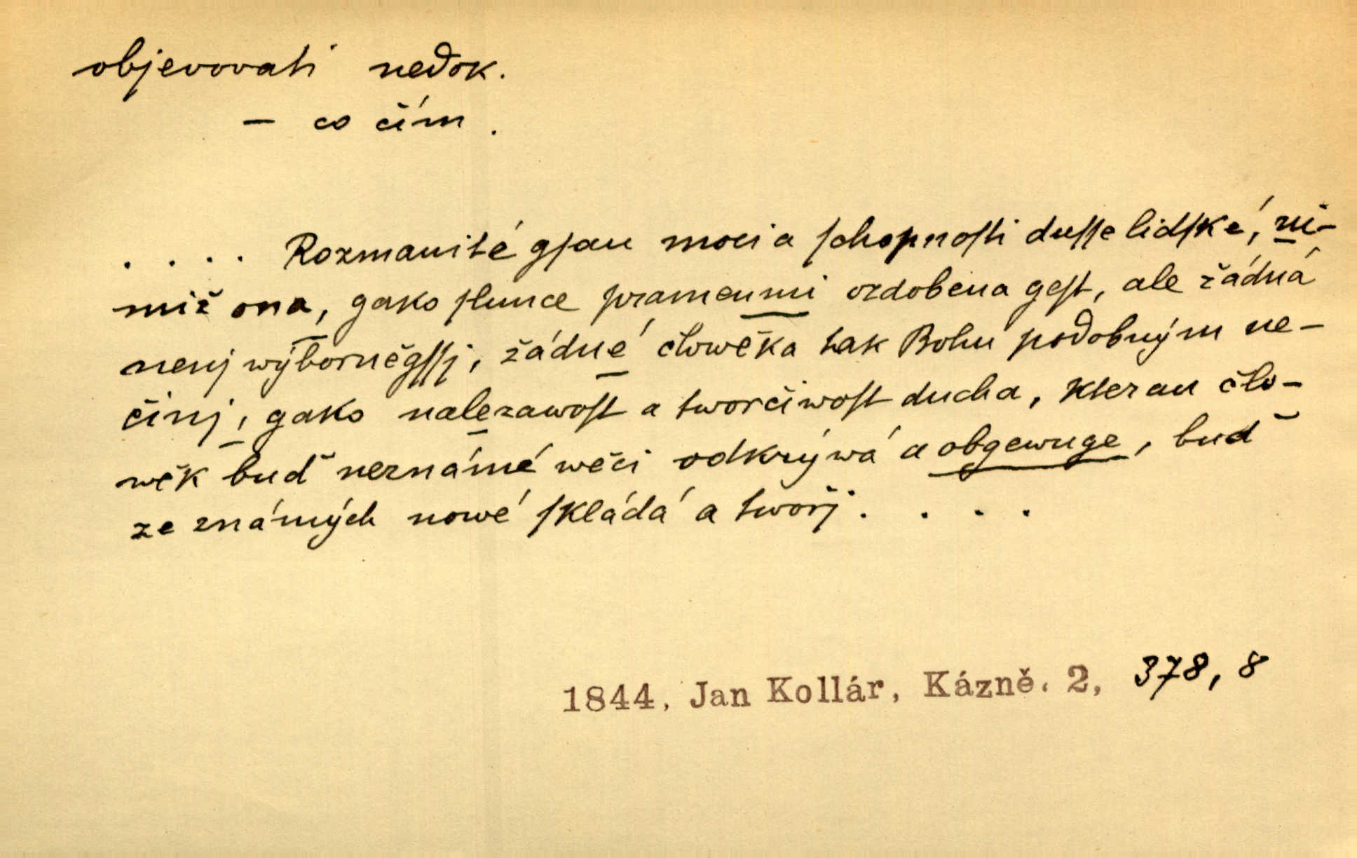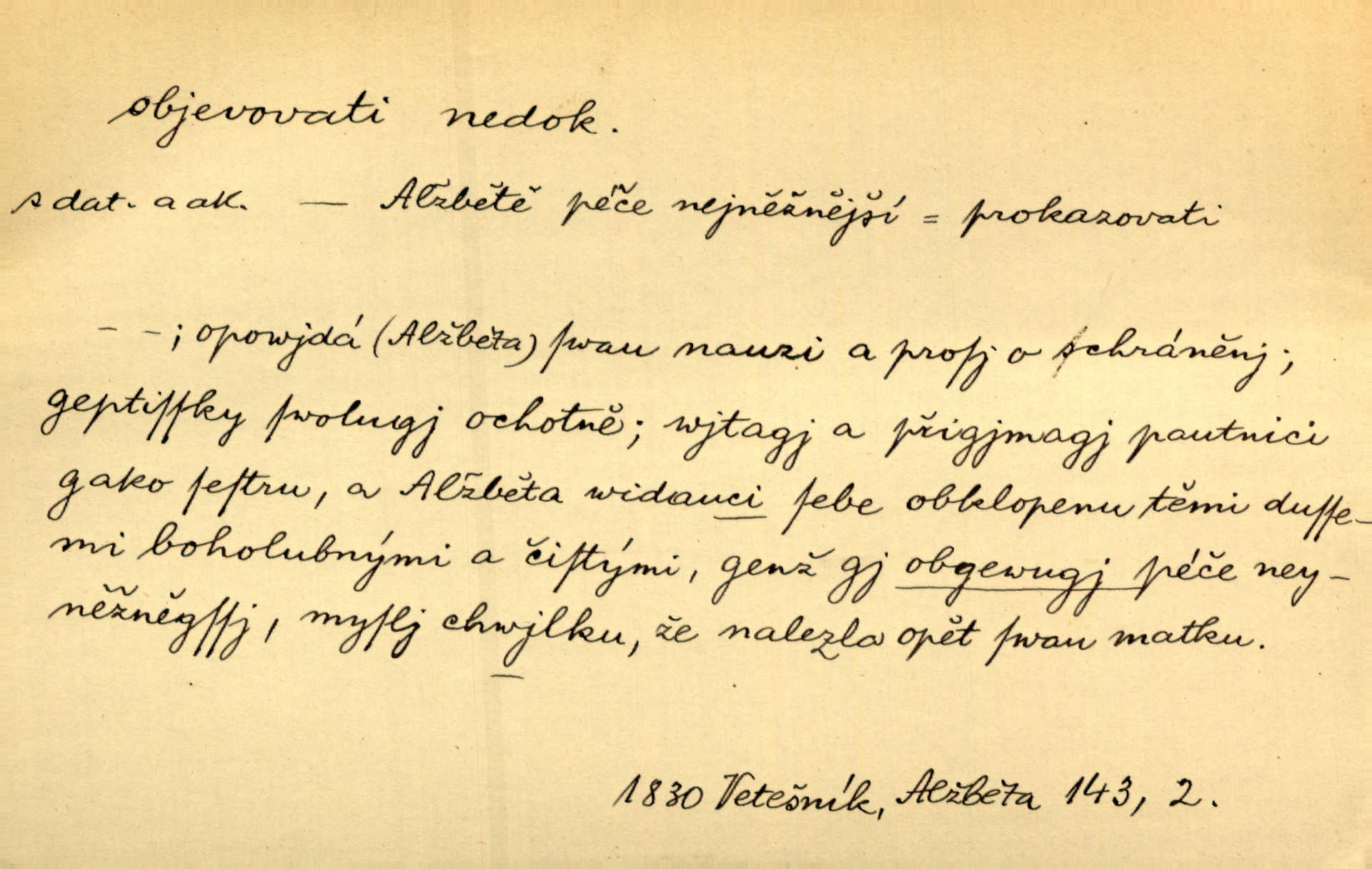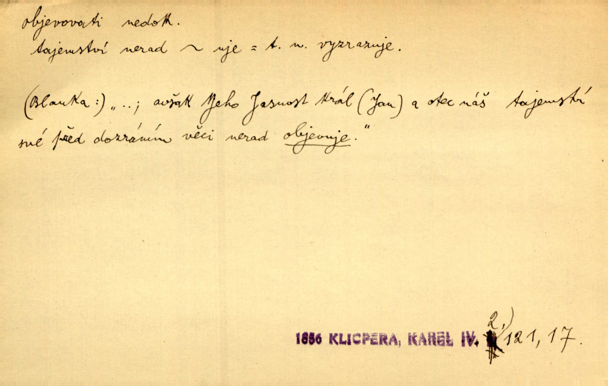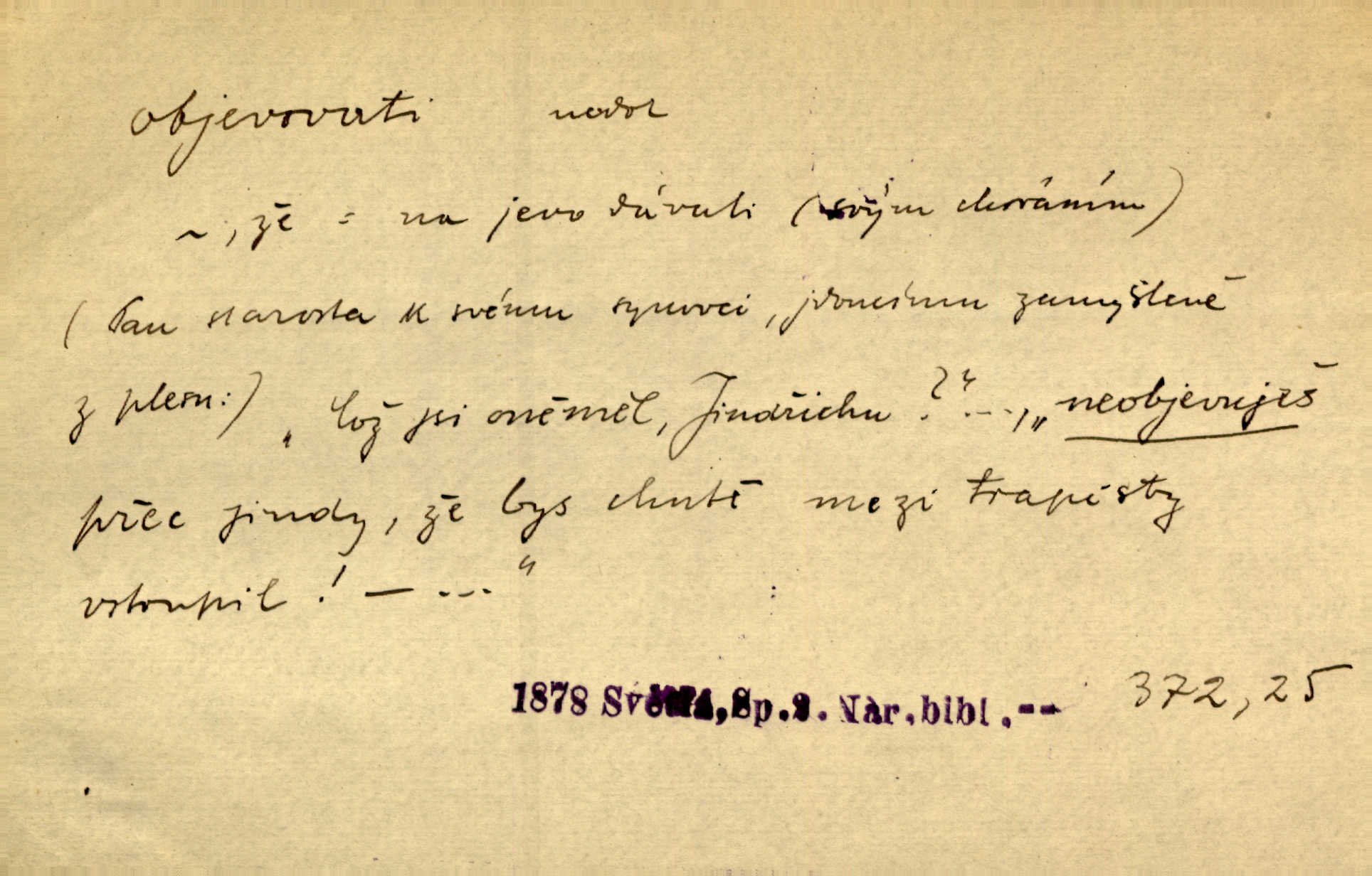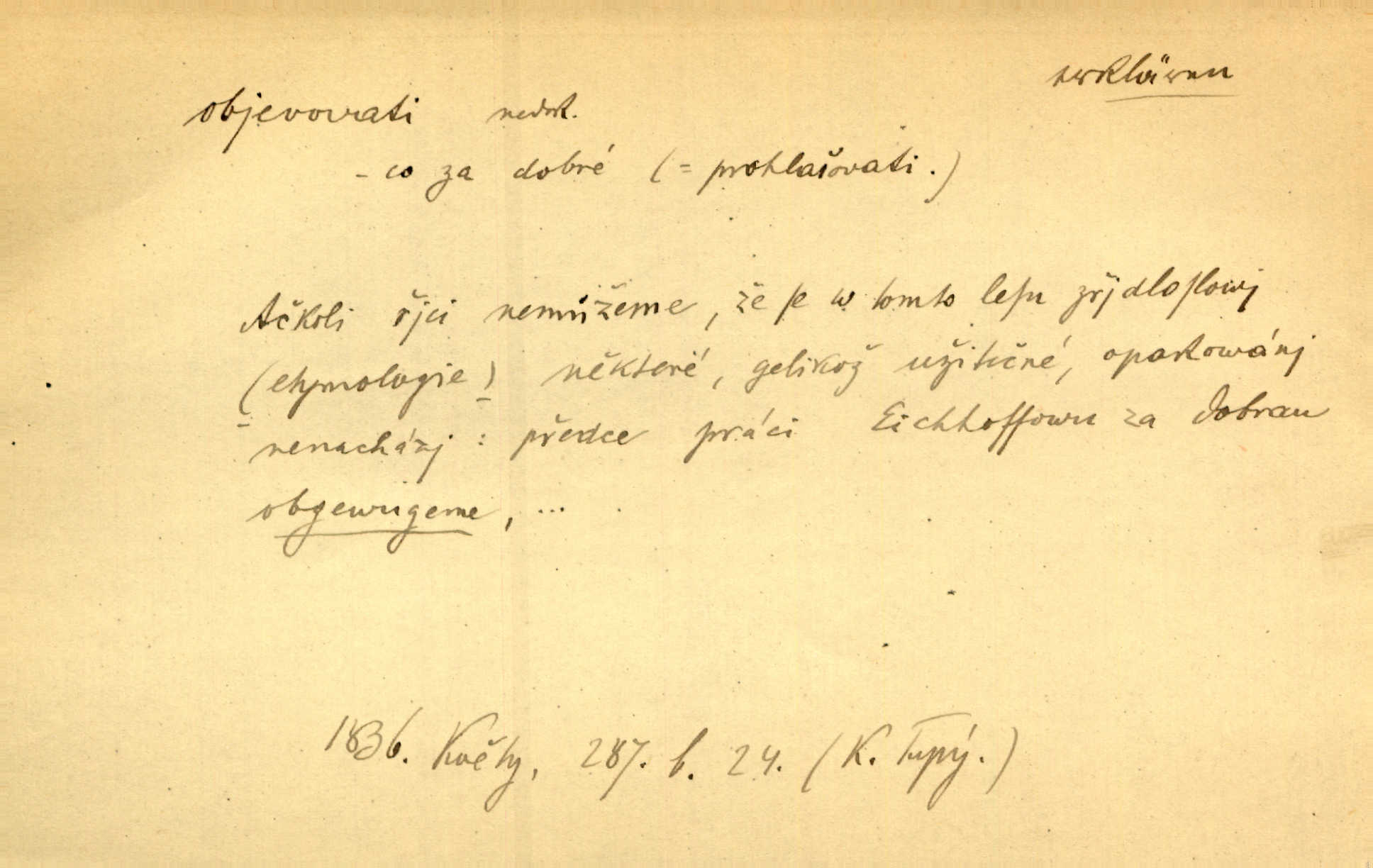 - objevovati ned. nalézati něco n. připadati na něco, co dosud bylo neznámo n. o čem se nevědělo. Objevoval nové její [manželčiny] nedostatky, jež mu dříve ušly. Vach. Objevoval v sobě úbytek duševních sil. Čech. D dávati najevo, projevovati, ukazovati. Sňal hluboko klobouk, objevuje šedou hlavu. R. Svob. Postať hrdě vypjatá objevuje tvary ztepilé a směrné. Čech. D objevovati se stávati se zjevným, ukazovati se, jeviti se, projevovati se, vyskytovati se. Východní obyčeje přikazují ženským, aby se veřejně bez hustých závojů neobjevovaly. Ner. Věřil [kněz] v objevování se duchů. Čech. Na zahradách počali se objevovati hospodáři v nových kalhotách a vestách. Rais. Otec můj se mi každou noc ve snu objevuje. Svět. Za horami sivé mraky se objevují. Pfleg. V „Sebrání básní a zpěvů“ r. 1795 objevuje se Jungmann poprvé obecenstvu českému. Zel. Vždy se mi objevovala Helena jako ubohá a vydrážděná nešťastnice. Svob. Poněvadž duši nikde nevidíme, soudíme o ní jen potud, pokud se nám v činnosti objevuje. Havl. V těchto sonetech se objevuje neobyčejná bohatost myšlénková. Vrch. [Županství dvorské] žádného trvání nemělo a po r. 1110 vícekrát se neobjevuje. H. Jireč. Kostlivec také v českých pověstech objevuje se co tanečník. Ner. Sloveso náviděti se objevuje i v jiných jazycích slovanských. Zub.