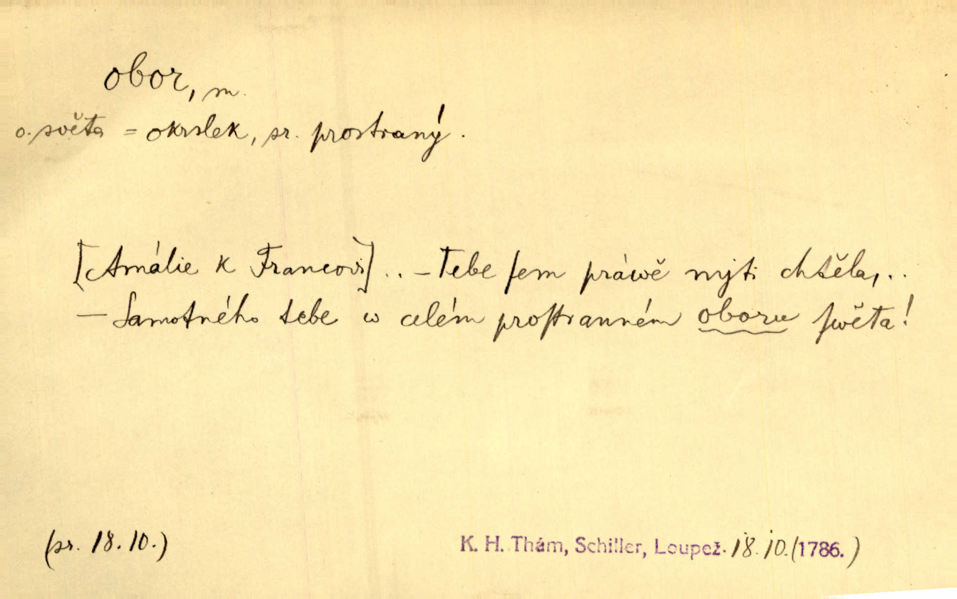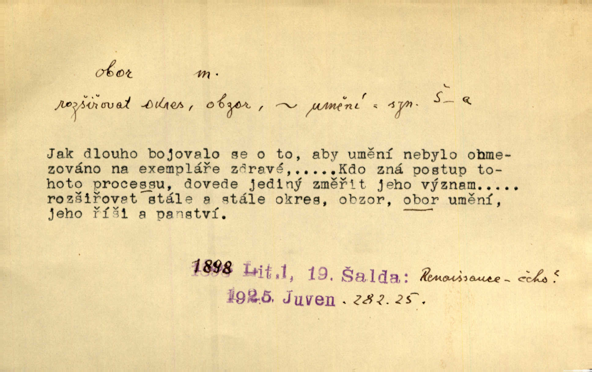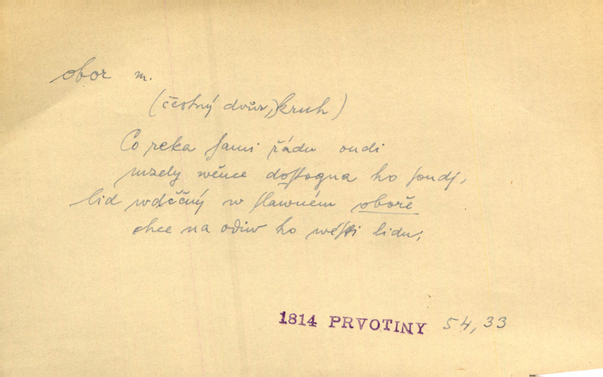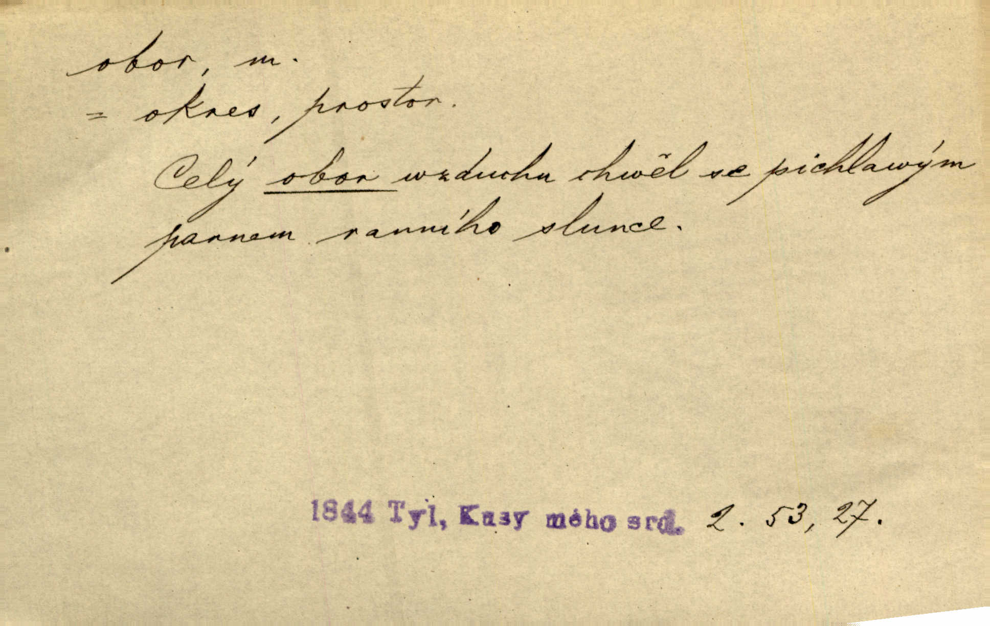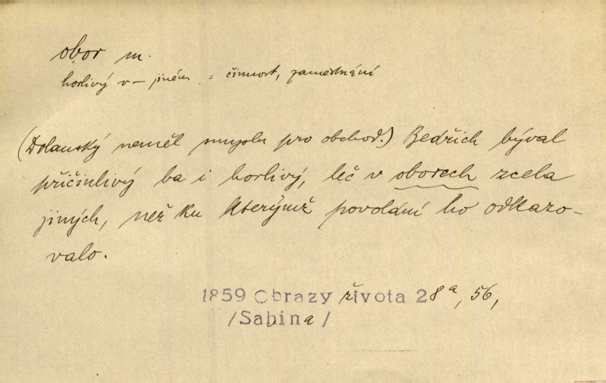 - obor, -u m. okruh, pole, druh působnosti, odvětví činnosti. Podobné kousky náležejí v obor čarodějství. Durd. Troufá si do všech úloh: však za vlastní svůj obor považuje tragické hrdiny. Čech. Jsou jiné obory na národa roli dědičné, jež leží úhorem. Mach. Obor působnosti obce je jednak samostatný, jednak přenesený. MSN. V jakém oboru byl [v kanceláři] zaměstnán, nevím. Arb. Český voják osvědčuje se zvláště v oborech, kde větší intelligence zapotřebí, jako u zákopníků a dělostřelců. Jir. Held jej doporučil jako nejlepšího v tom oboru [stavbě pian]. Jir. Pro každý obor myšlenky a citu má [fráze] slovník svůj. Vrch. D Poněk. zast. pásmo, oblast, okrsek, hl. zeměpisný. Působení slunce a měsíce v oboru parnatém země naší vůbec známo jest. Pal. Obor vzduchový, mžitím navlžený létavými se plnil parami. Sab. [Spor] dělí vzdělaného lidstva obor celý. Čech. Nařídil bych pěstounům mládeže po všem oboru zemském, aby vychovávali samé Černohorce světě. Hol. D Zast. sbor, zástup. Stařec z korábu vyjde se vším oborem. Jg. Milci obstupovali jej [Václava IV.] oborem, jak za celého života, tak i při smrti. Pal.