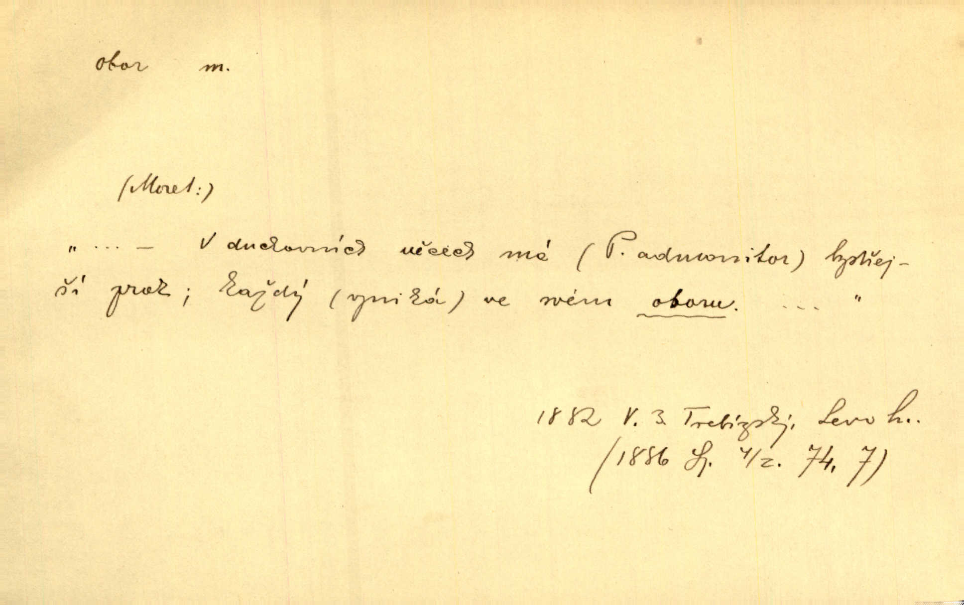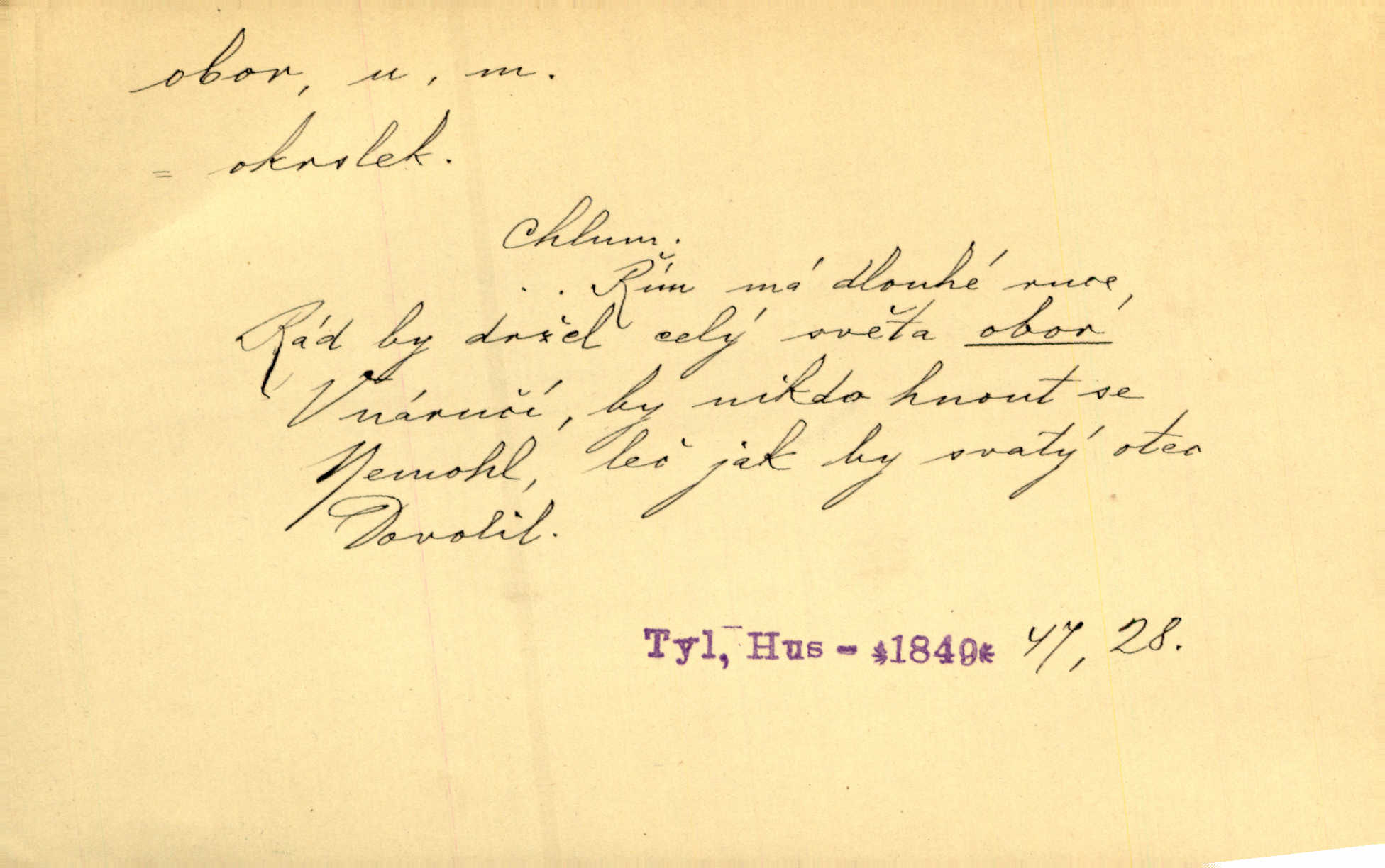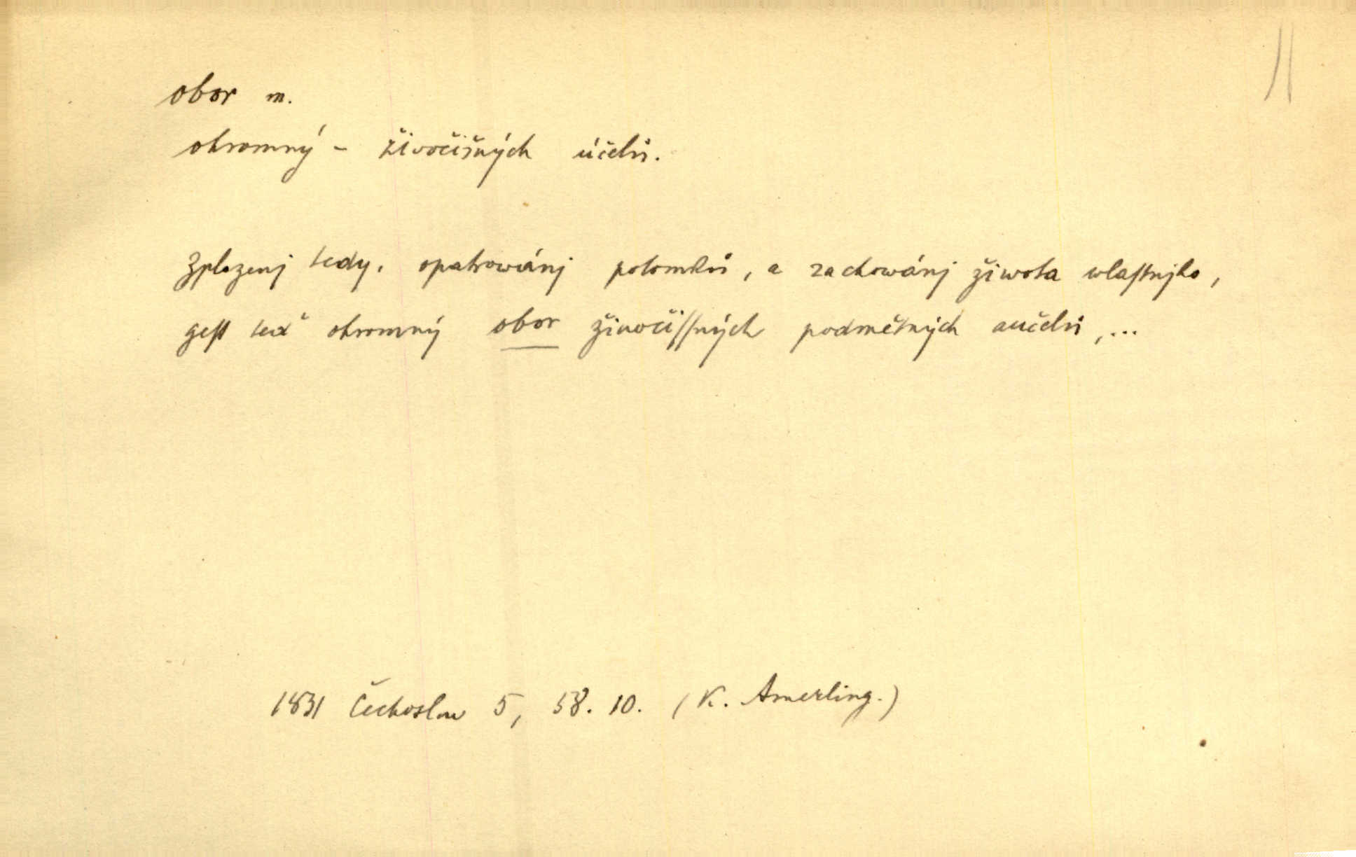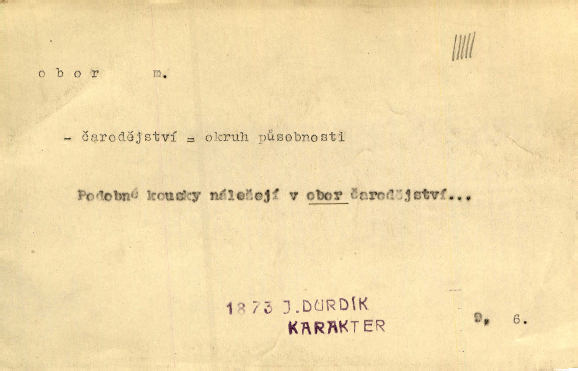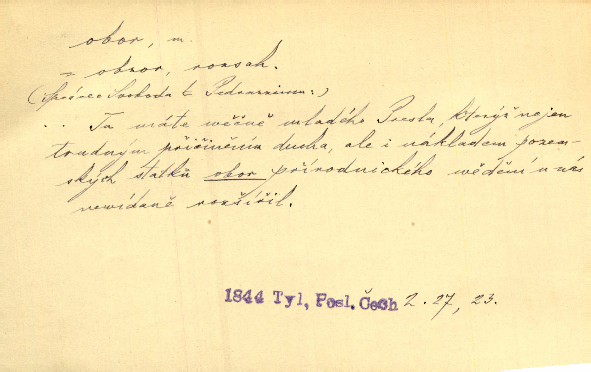 - obor, -u m. okruh, pole, druh působnosti, odvětví činnosti. Podobné kousky náležejí v obor čarodějství. Durd. Troufá si do všech úloh: však za vlastní svůj obor považuje tragické hrdiny. Čech. Jsou jiné obory na národa roli dědičné, jež leží úhorem. Mach. Obor působnosti obce je jednak samostatný, jednak přenesený. MSN. V jakém oboru byl [v kanceláři] zaměstnán, nevím. Arb. Český voják osvědčuje se zvláště v oborech, kde větší intelligence zapotřebí, jako u zákopníků a dělostřelců. Jir. Held jej doporučil jako nejlepšího v tom oboru [stavbě pian]. Jir. Pro každý obor myšlenky a citu má [fráze] slovník svůj. Vrch. D Poněk. zast. pásmo, oblast, okrsek, hl. zeměpisný. Působení slunce a měsíce v oboru parnatém země naší vůbec známo jest. Pal. Obor vzduchový, mžitím navlžený létavými se plnil parami. Sab. [Spor] dělí vzdělaného lidstva obor celý. Čech. Nařídil bych pěstounům mládeže po všem oboru zemském, aby vychovávali samé Černohorce světě. Hol. D Zast. sbor, zástup. Stařec z korábu vyjde se vším oborem. Jg. Milci obstupovali jej [Václava IV.] oborem, jak za celého života, tak i při smrti. Pal.