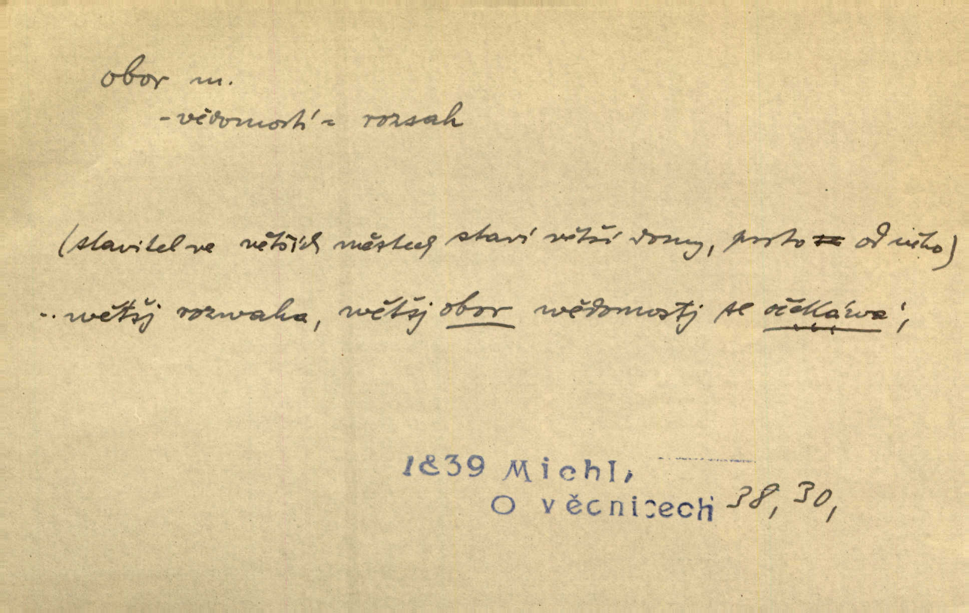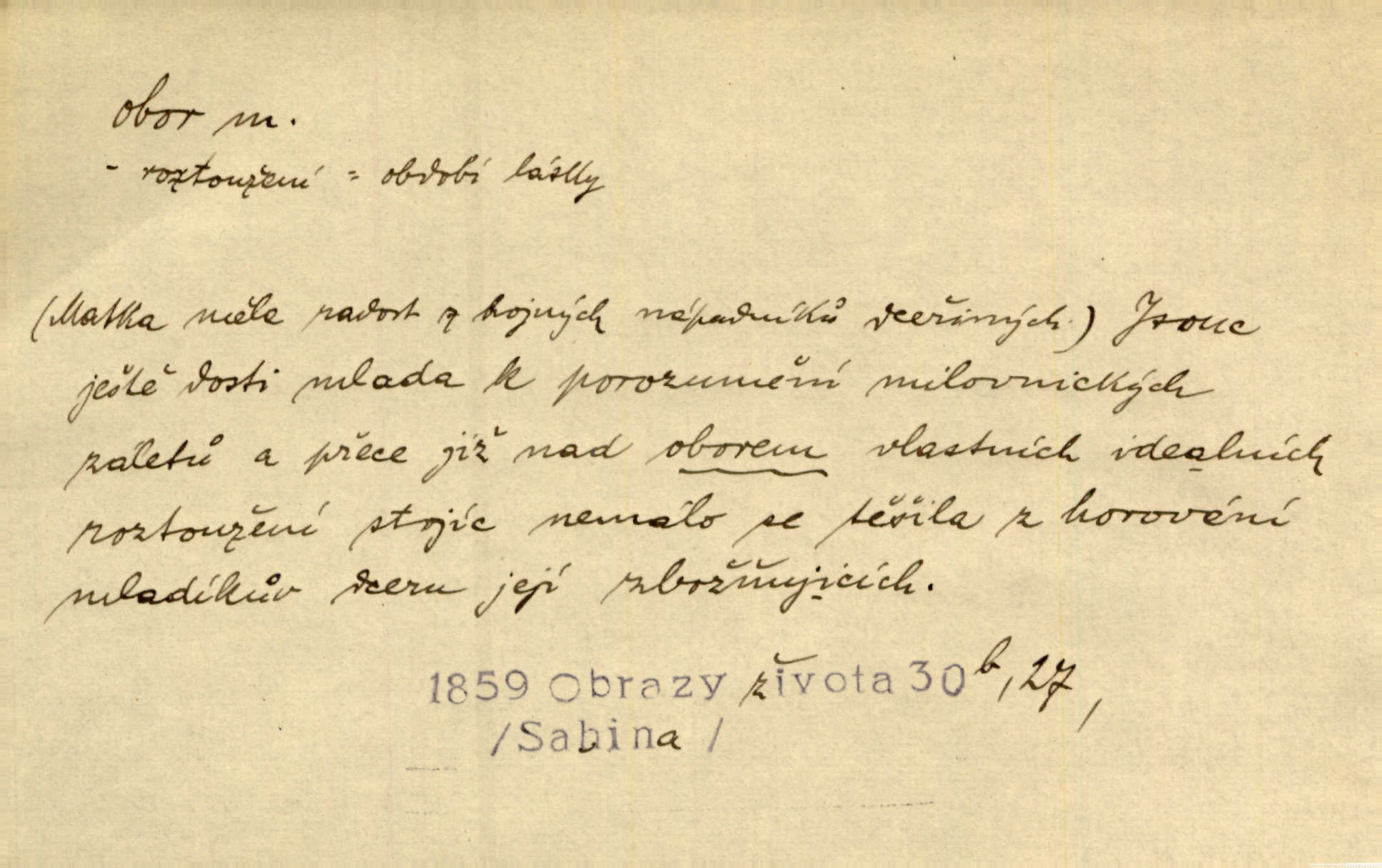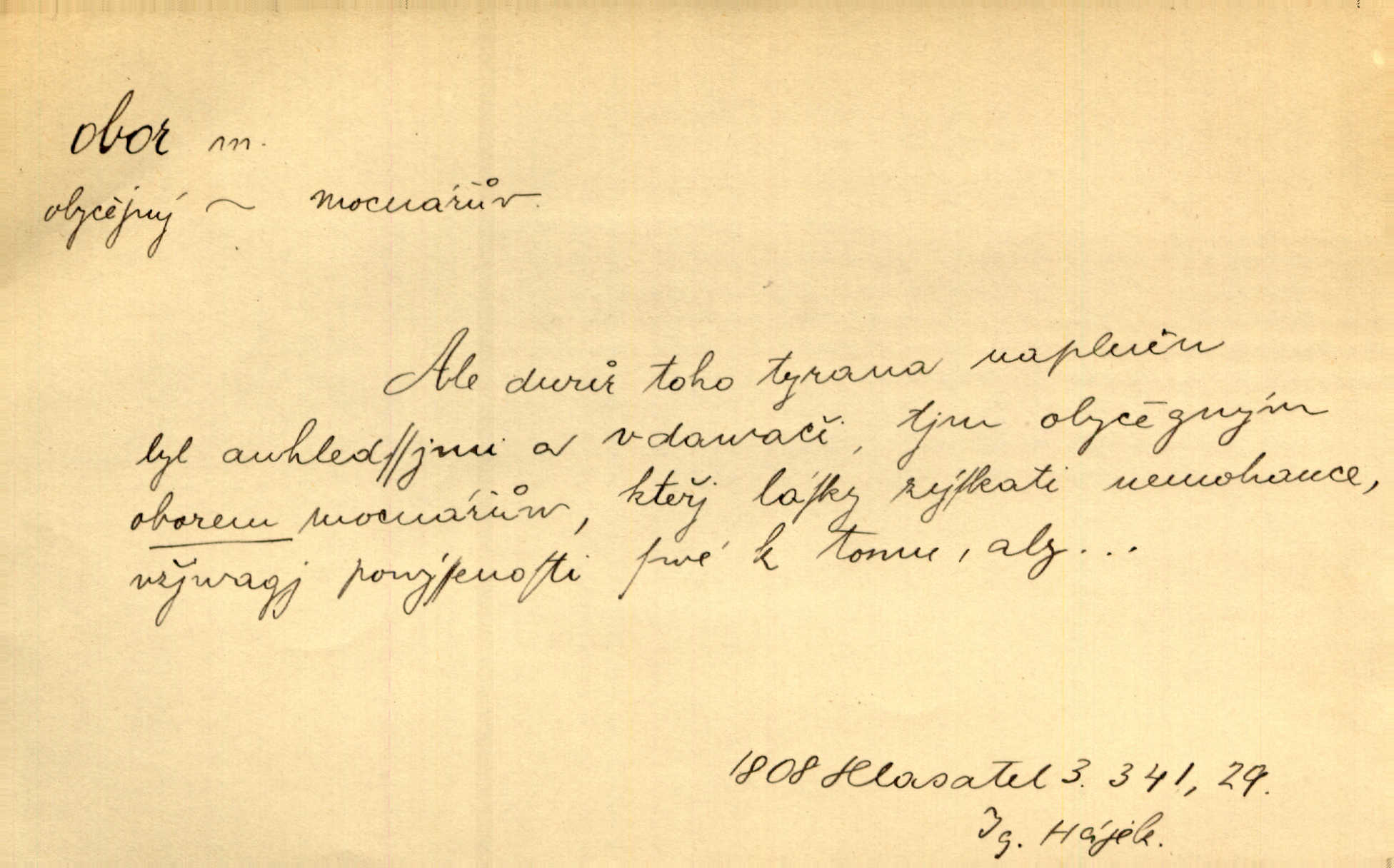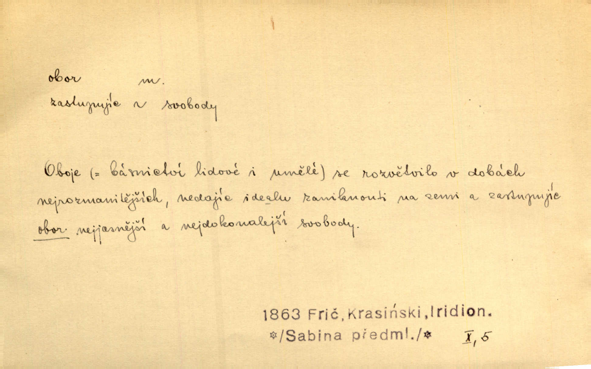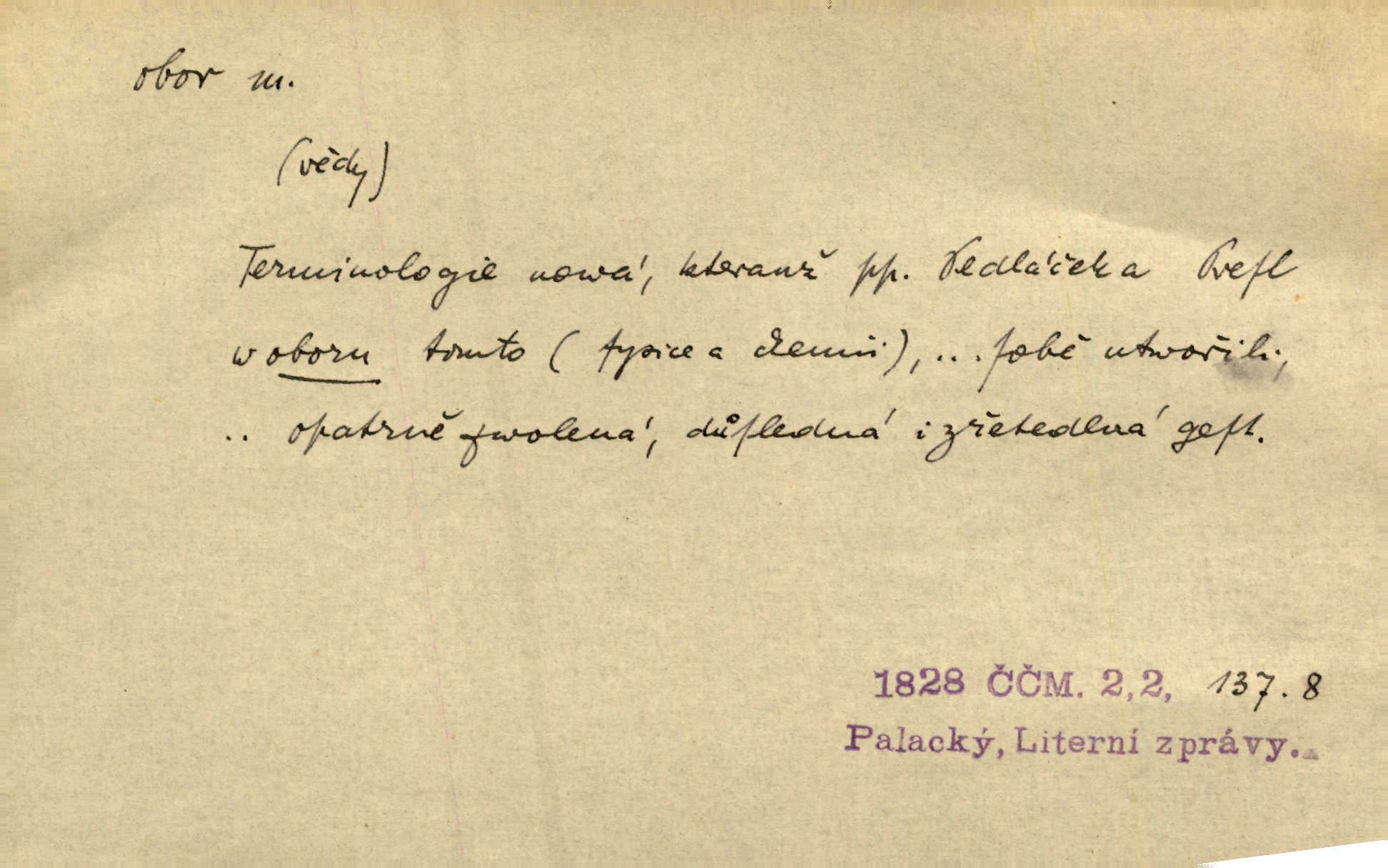 - obor, -u m. okruh, pole, druh působnosti, odvětví činnosti. Podobné kousky náležejí v obor čarodějství. Durd. Troufá si do všech úloh: však za vlastní svůj obor považuje tragické hrdiny. Čech. Jsou jiné obory na národa roli dědičné, jež leží úhorem. Mach. Obor působnosti obce je jednak samostatný, jednak přenesený. MSN. V jakém oboru byl [v kanceláři] zaměstnán, nevím. Arb. Český voják osvědčuje se zvláště v oborech, kde větší intelligence zapotřebí, jako u zákopníků a dělostřelců. Jir. Held jej doporučil jako nejlepšího v tom oboru [stavbě pian]. Jir. Pro každý obor myšlenky a citu má [fráze] slovník svůj. Vrch. D Poněk. zast. pásmo, oblast, okrsek, hl. zeměpisný. Působení slunce a měsíce v oboru parnatém země naší vůbec známo jest. Pal. Obor vzduchový, mžitím navlžený létavými se plnil parami. Sab. [Spor] dělí vzdělaného lidstva obor celý. Čech. Nařídil bych pěstounům mládeže po všem oboru zemském, aby vychovávali samé Černohorce světě. Hol. D Zast. sbor, zástup. Stařec z korábu vyjde se vším oborem. Jg. Milci obstupovali jej [Václava IV.] oborem, jak za celého života, tak i při smrti. Pal.