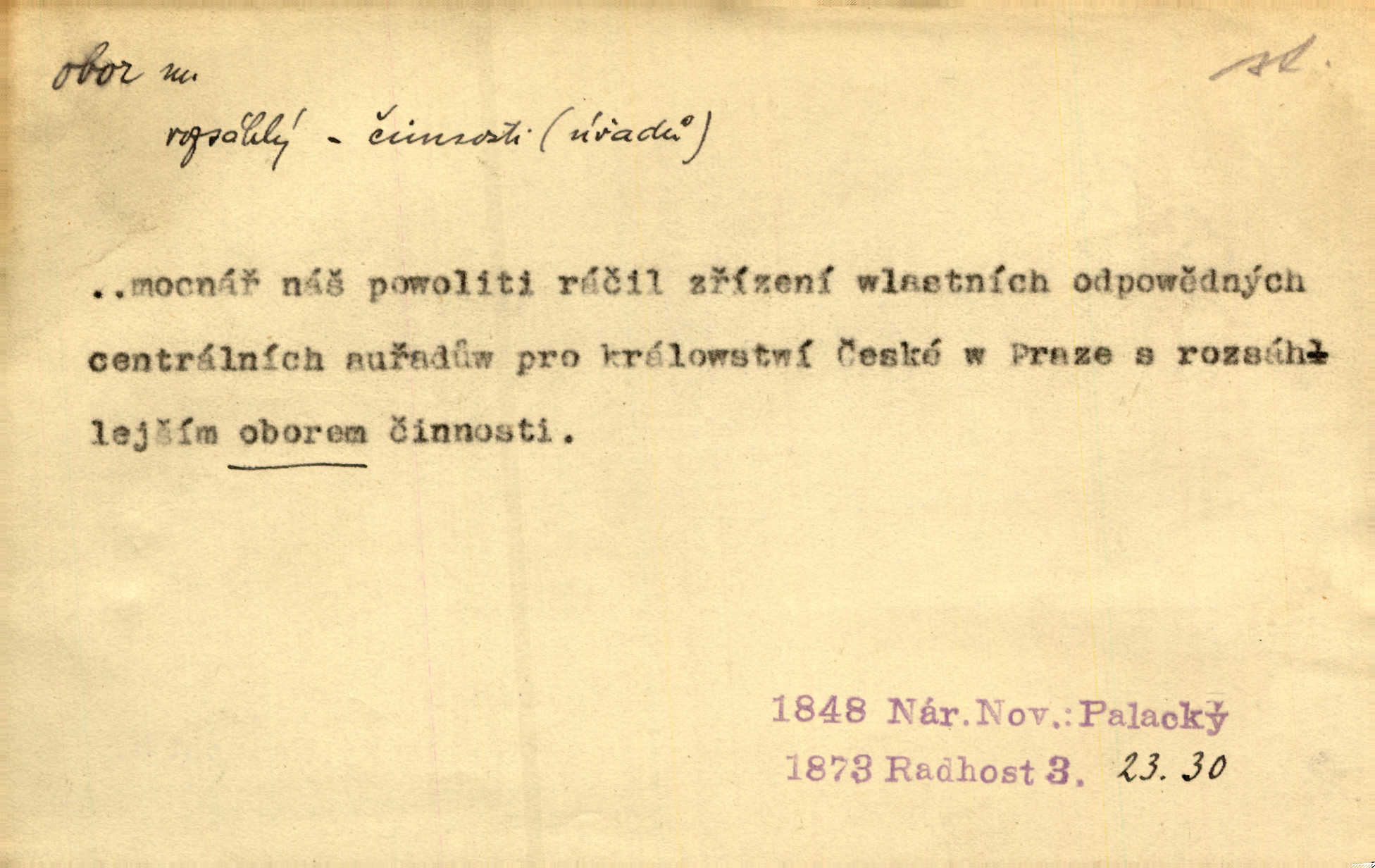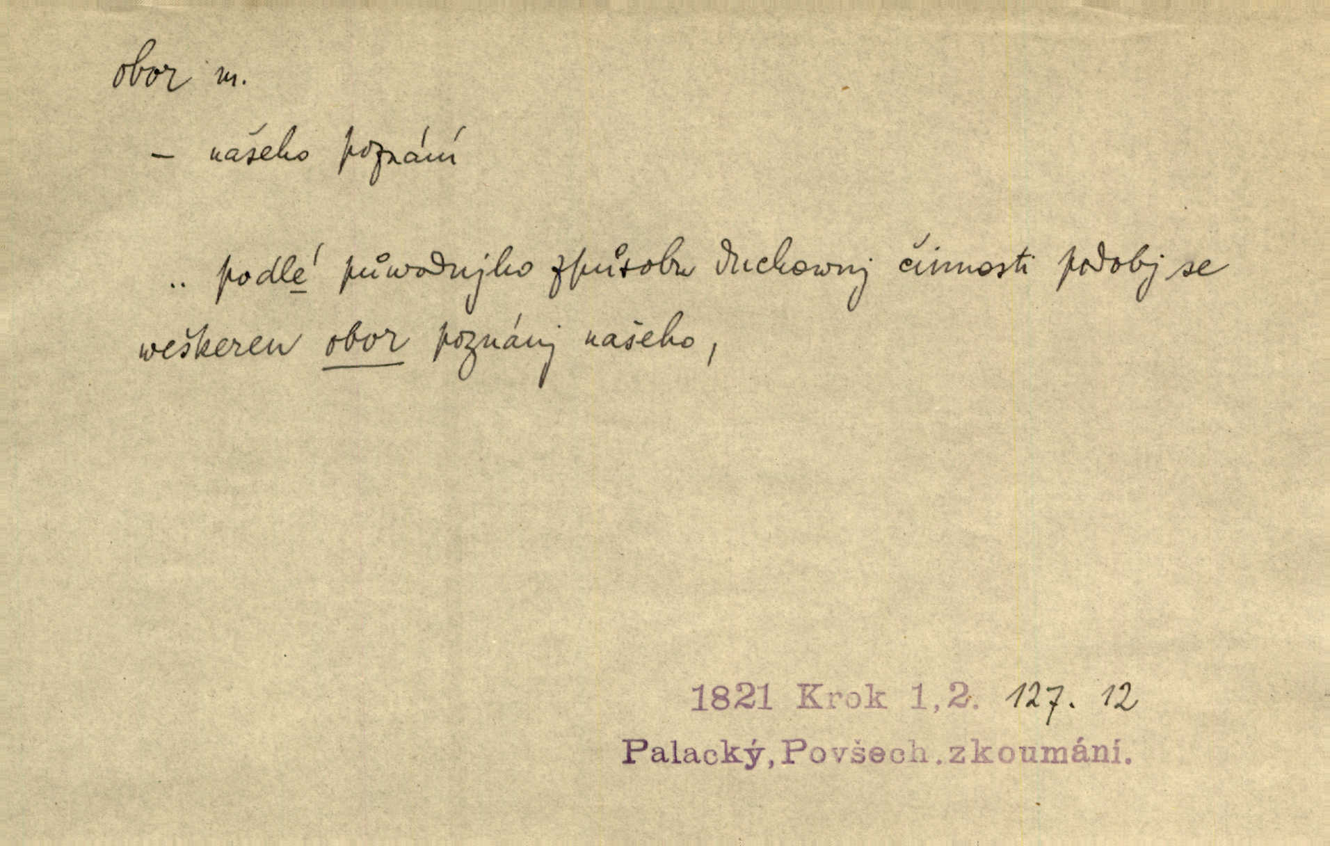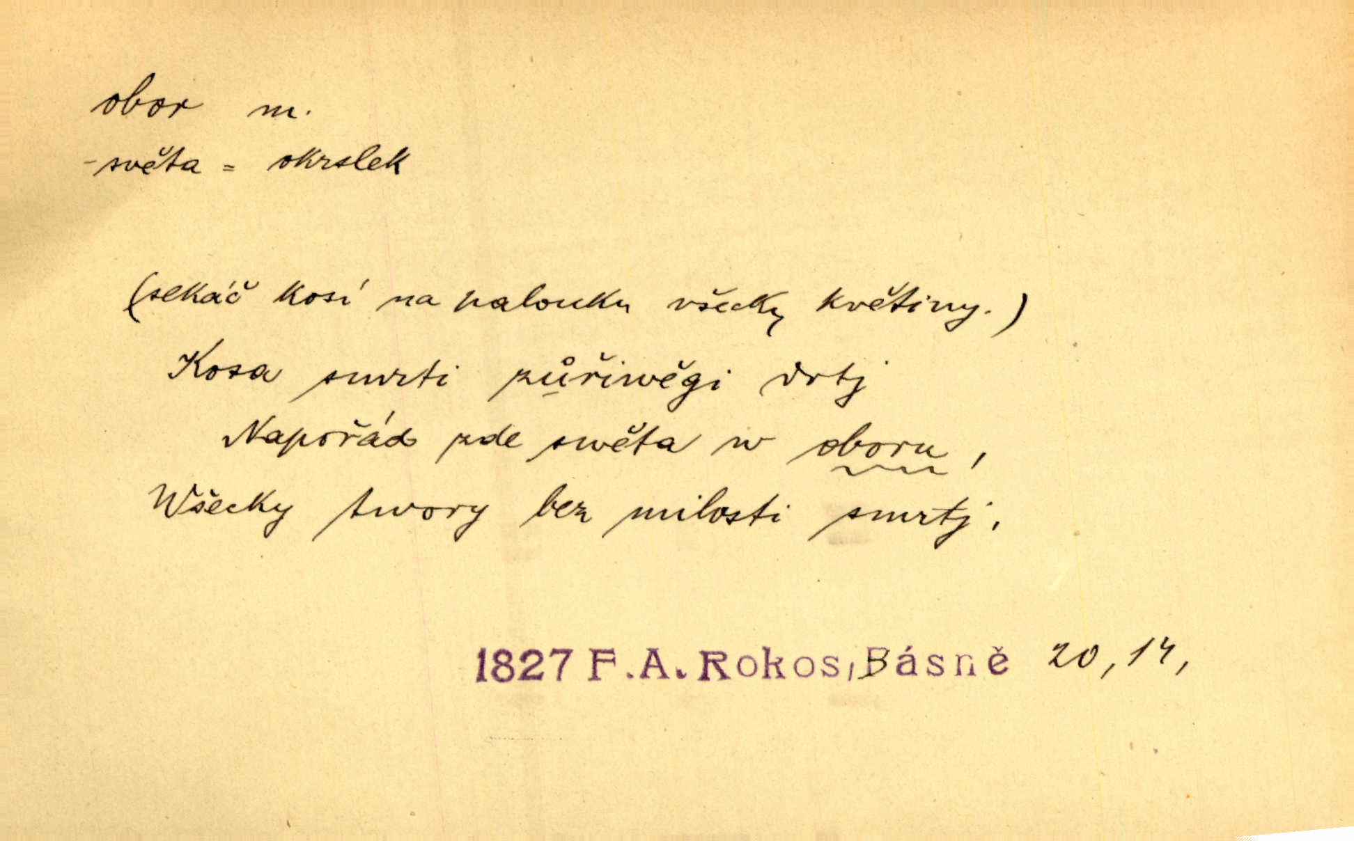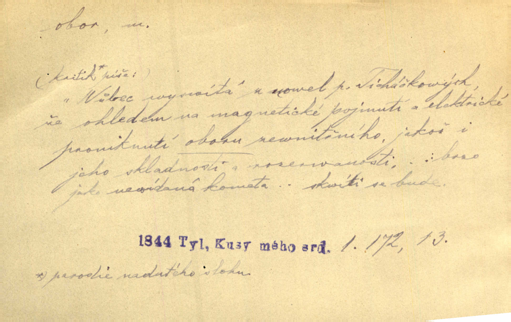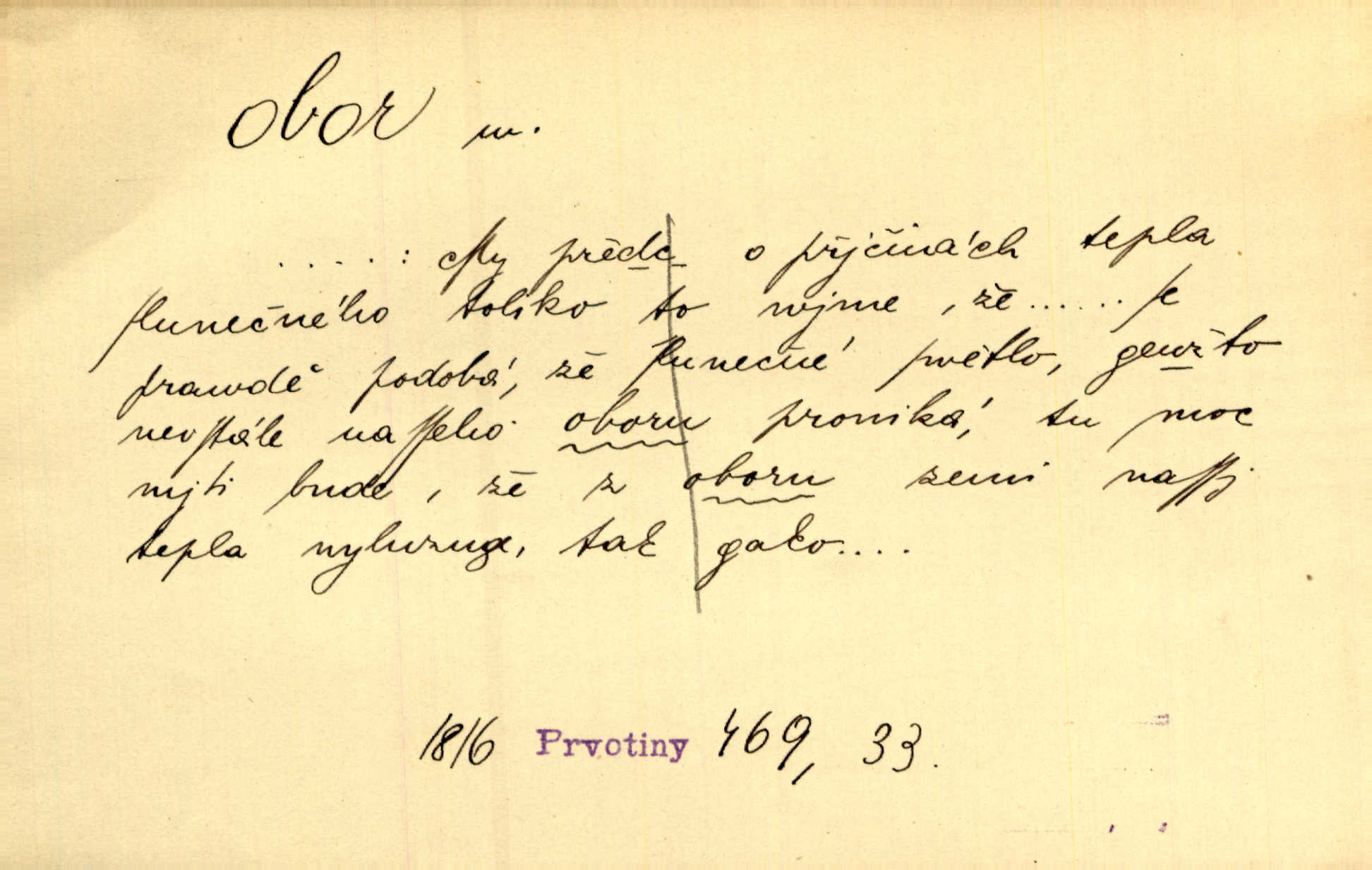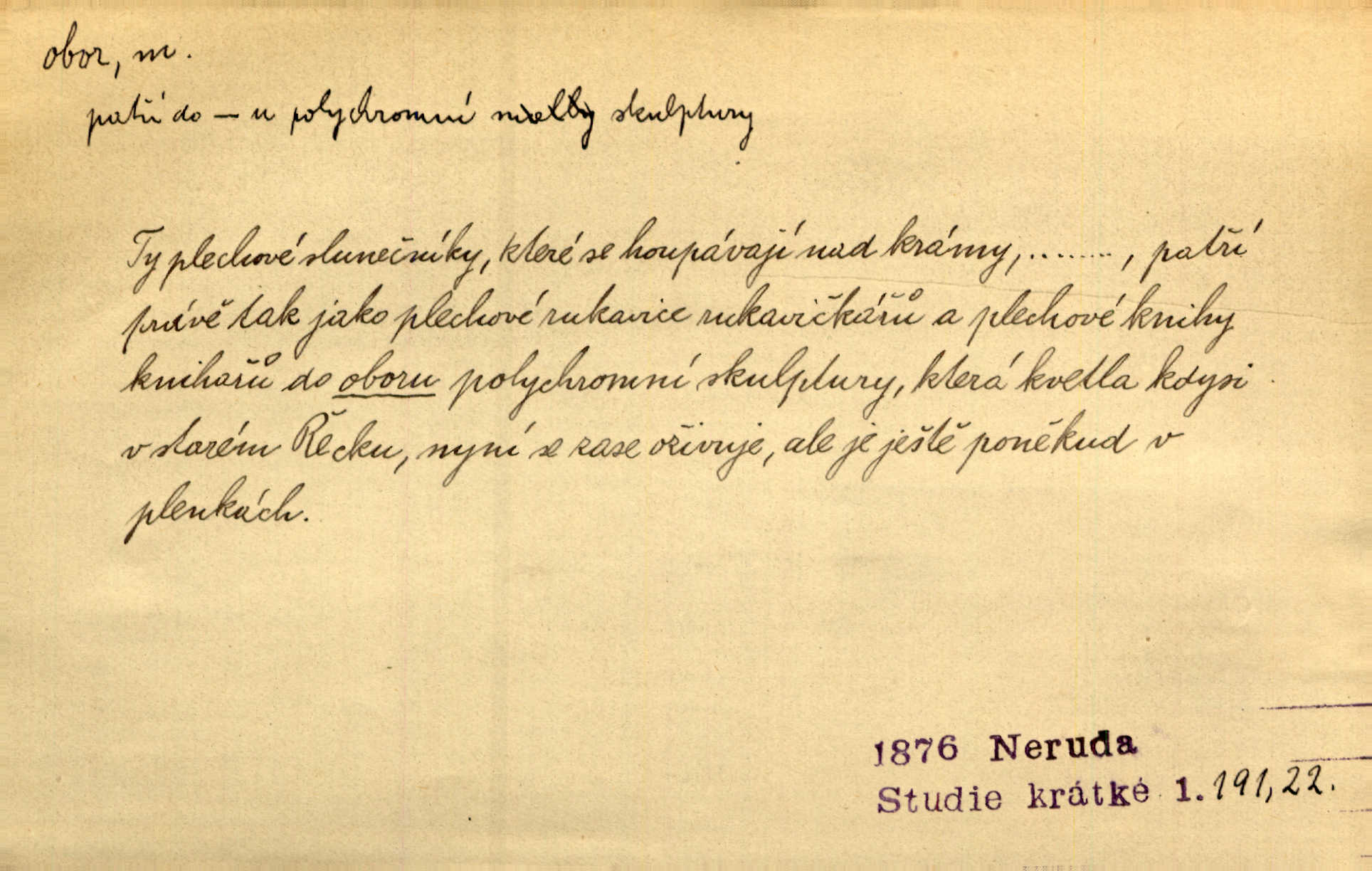 - obor, -u m. okruh, pole, druh působnosti, odvětví činnosti. Podobné kousky náležejí v obor čarodějství. Durd. Troufá si do všech úloh: však za vlastní svůj obor považuje tragické hrdiny. Čech. Jsou jiné obory na národa roli dědičné, jež leží úhorem. Mach. Obor působnosti obce je jednak samostatný, jednak přenesený. MSN. V jakém oboru byl [v kanceláři] zaměstnán, nevím. Arb. Český voják osvědčuje se zvláště v oborech, kde větší intelligence zapotřebí, jako u zákopníků a dělostřelců. Jir. Held jej doporučil jako nejlepšího v tom oboru [stavbě pian]. Jir. Pro každý obor myšlenky a citu má [fráze] slovník svůj. Vrch. D Poněk. zast. pásmo, oblast, okrsek, hl. zeměpisný. Působení slunce a měsíce v oboru parnatém země naší vůbec známo jest. Pal. Obor vzduchový, mžitím navlžený létavými se plnil parami. Sab. [Spor] dělí vzdělaného lidstva obor celý. Čech. Nařídil bych pěstounům mládeže po všem oboru zemském, aby vychovávali samé Černohorce světě. Hol. D Zast. sbor, zástup. Stařec z korábu vyjde se vším oborem. Jg. Milci obstupovali jej [Václava IV.] oborem, jak za celého života, tak i při smrti. Pal.