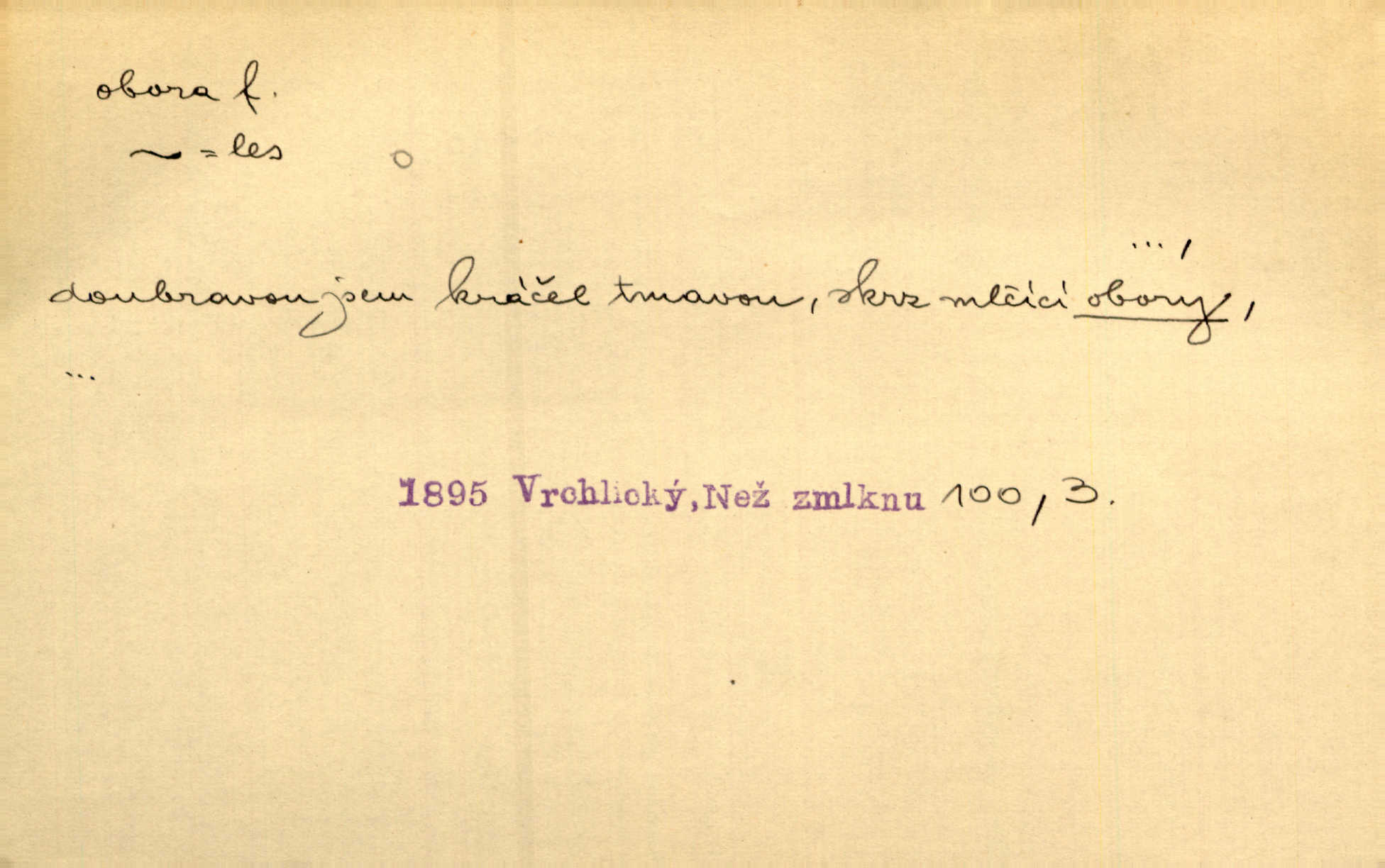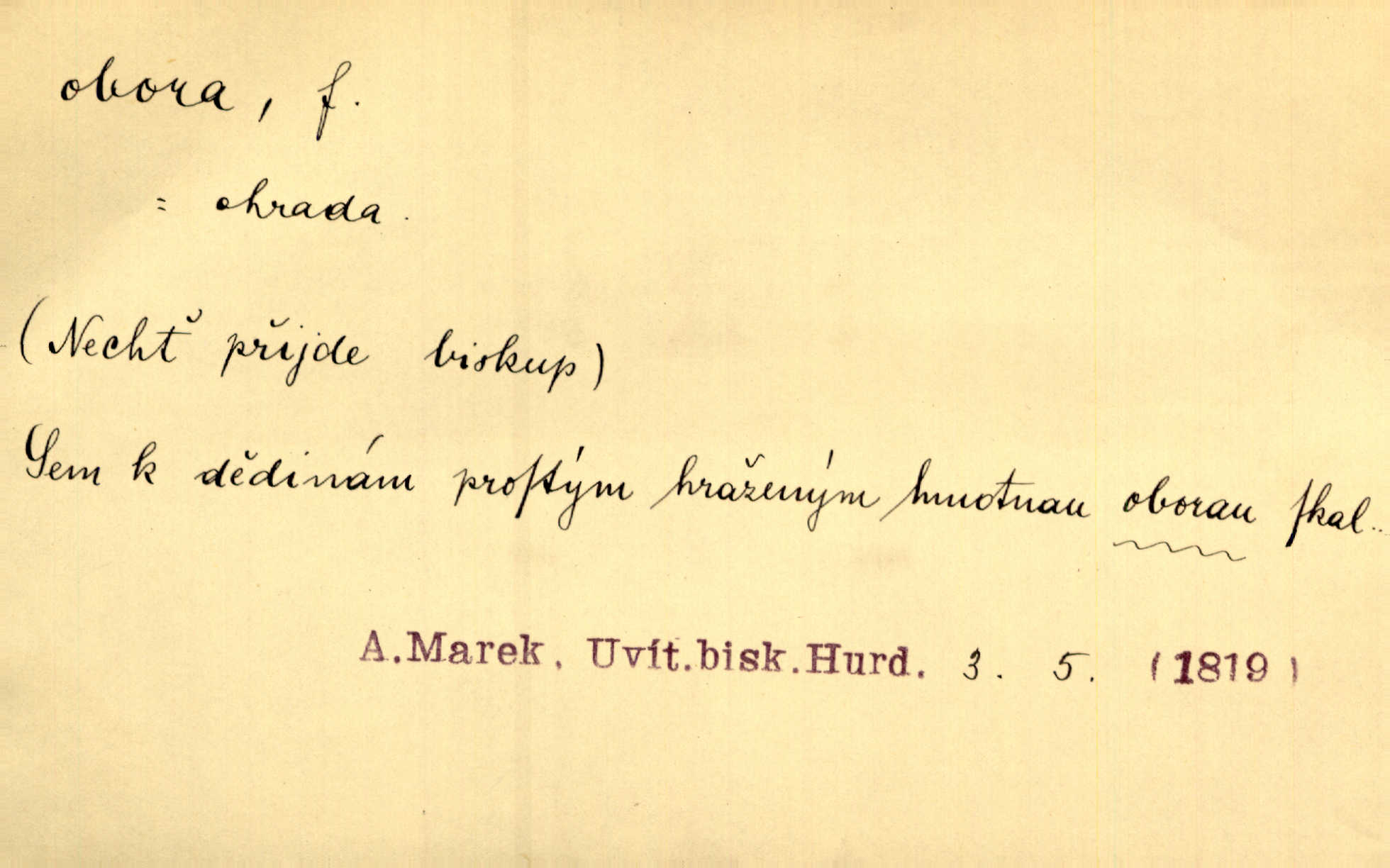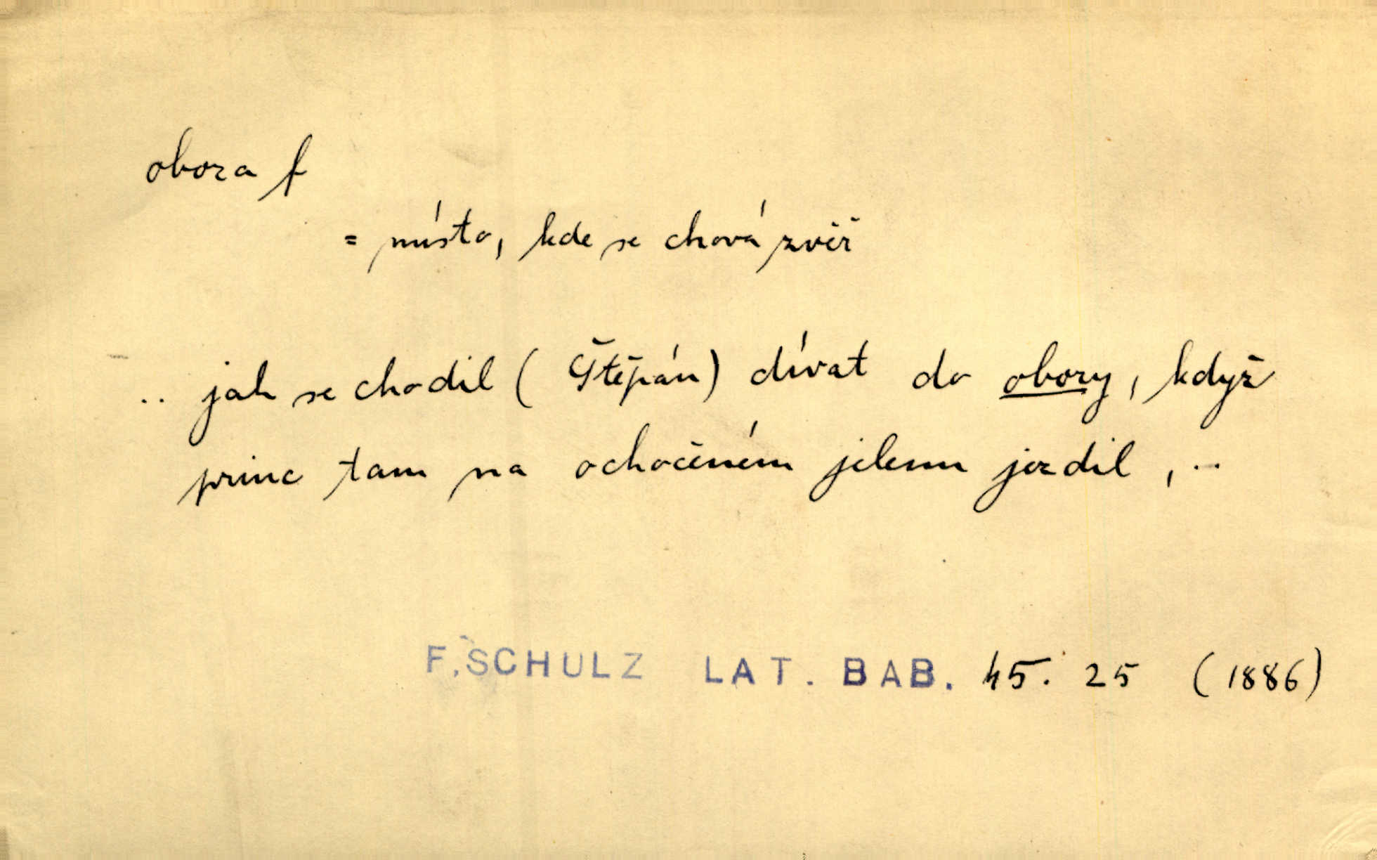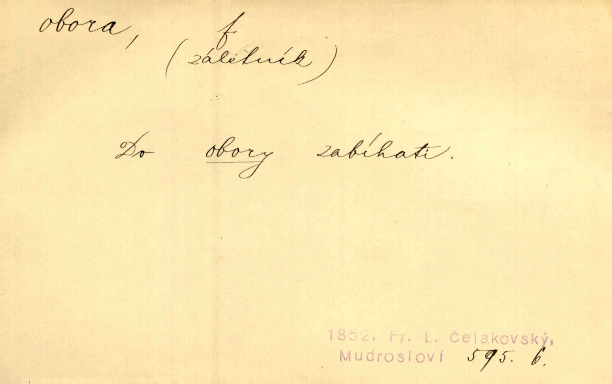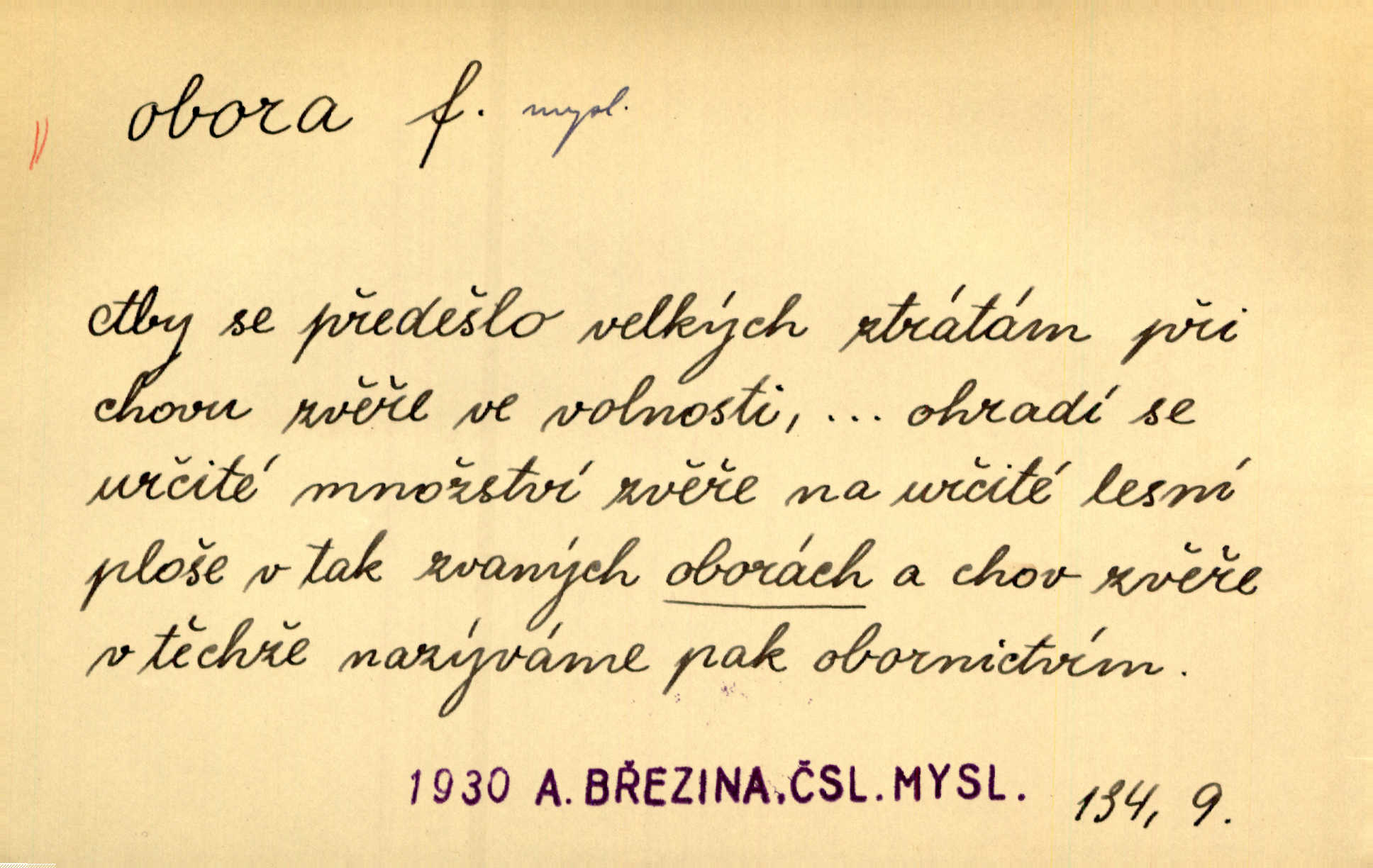 - obora, -y f. ohrazený pozemek porostlý lesem, v kterém se chová zvěř. Bylo slyšeti o králi a jeho družině, jak honí v oboře. Jir. Chodil se dívat do obory, když princ tam na ochočeném jelenu jezdil. Schulz. Přen. Prý vlhnou v ní [v černé zimě] i kosti, a časté její deště hojně mrví kněžskou oboru hřbitov. A. Mrš. Geogr. Královská obora jeden z pražských sadů. D Zast. obor, oblast. Slyšte, řeky valné, dřív než jdete v moře oboru. Koll.