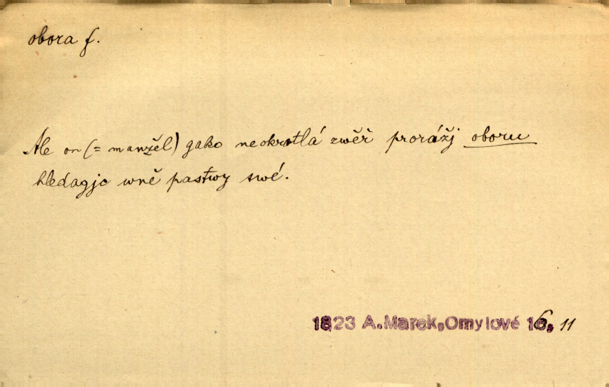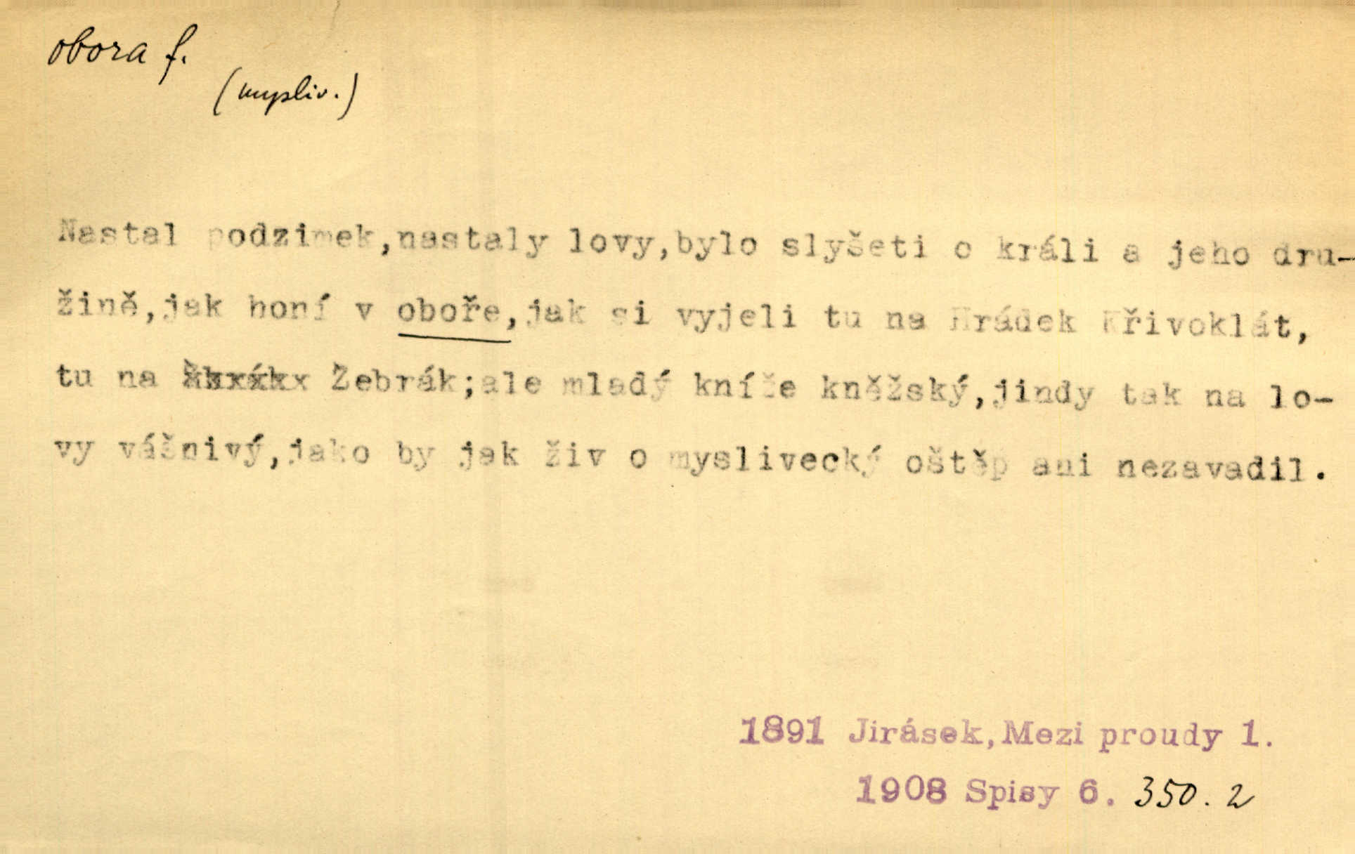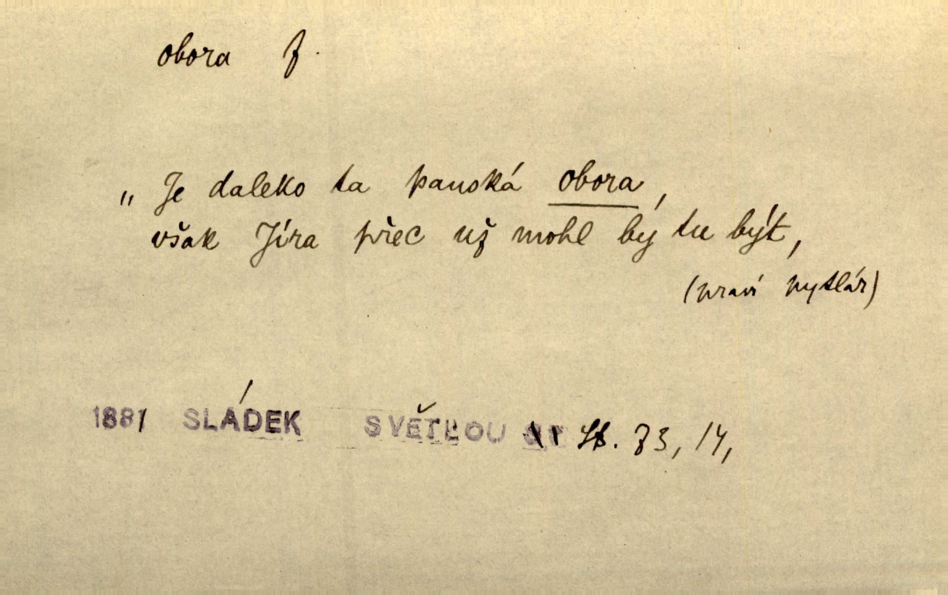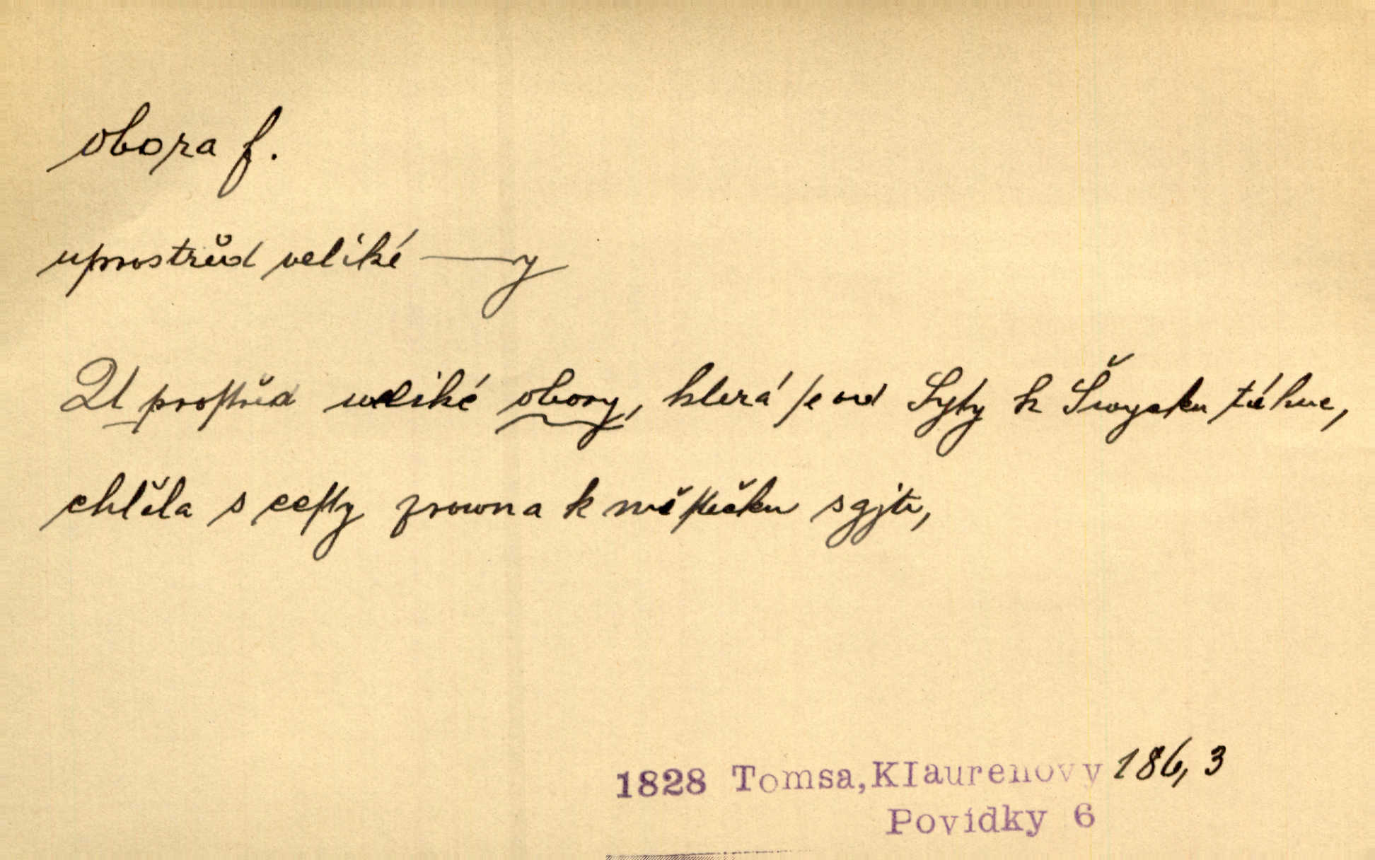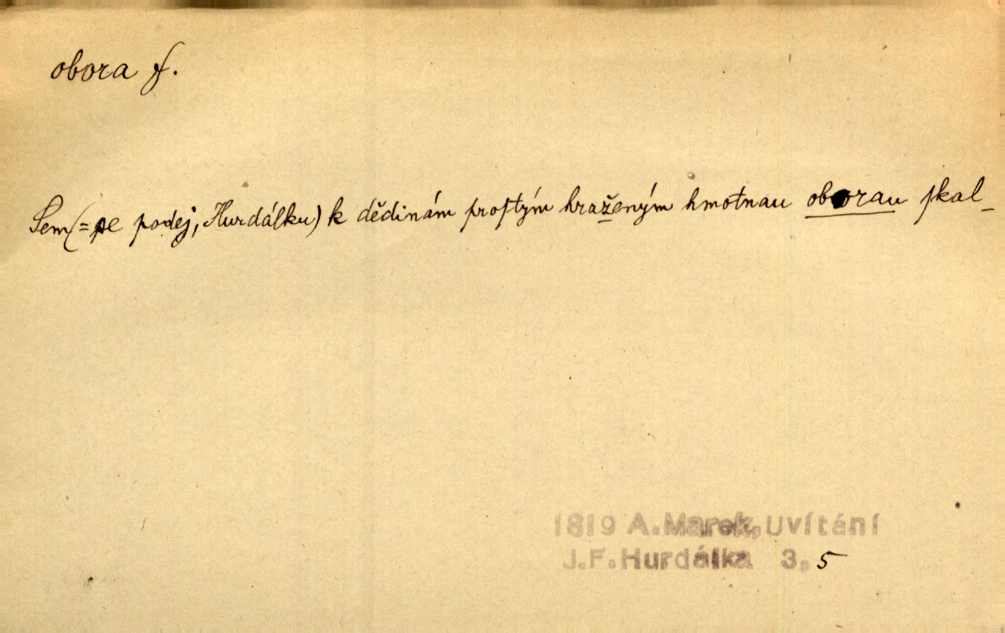 - obora, -y f. ohrazený pozemek porostlý lesem, v kterém se chová zvěř. Bylo slyšeti o králi a jeho družině, jak honí v oboře. Jir. Chodil se dívat do obory, když princ tam na ochočeném jelenu jezdil. Schulz. Přen. Prý vlhnou v ní [v černé zimě] i kosti, a časté její deště hojně mrví kněžskou oboru hřbitov. A. Mrš. Geogr. Královská obora jeden z pražských sadů. D Zast. obor, oblast. Slyšte, řeky valné, dřív než jdete v moře oboru. Koll.