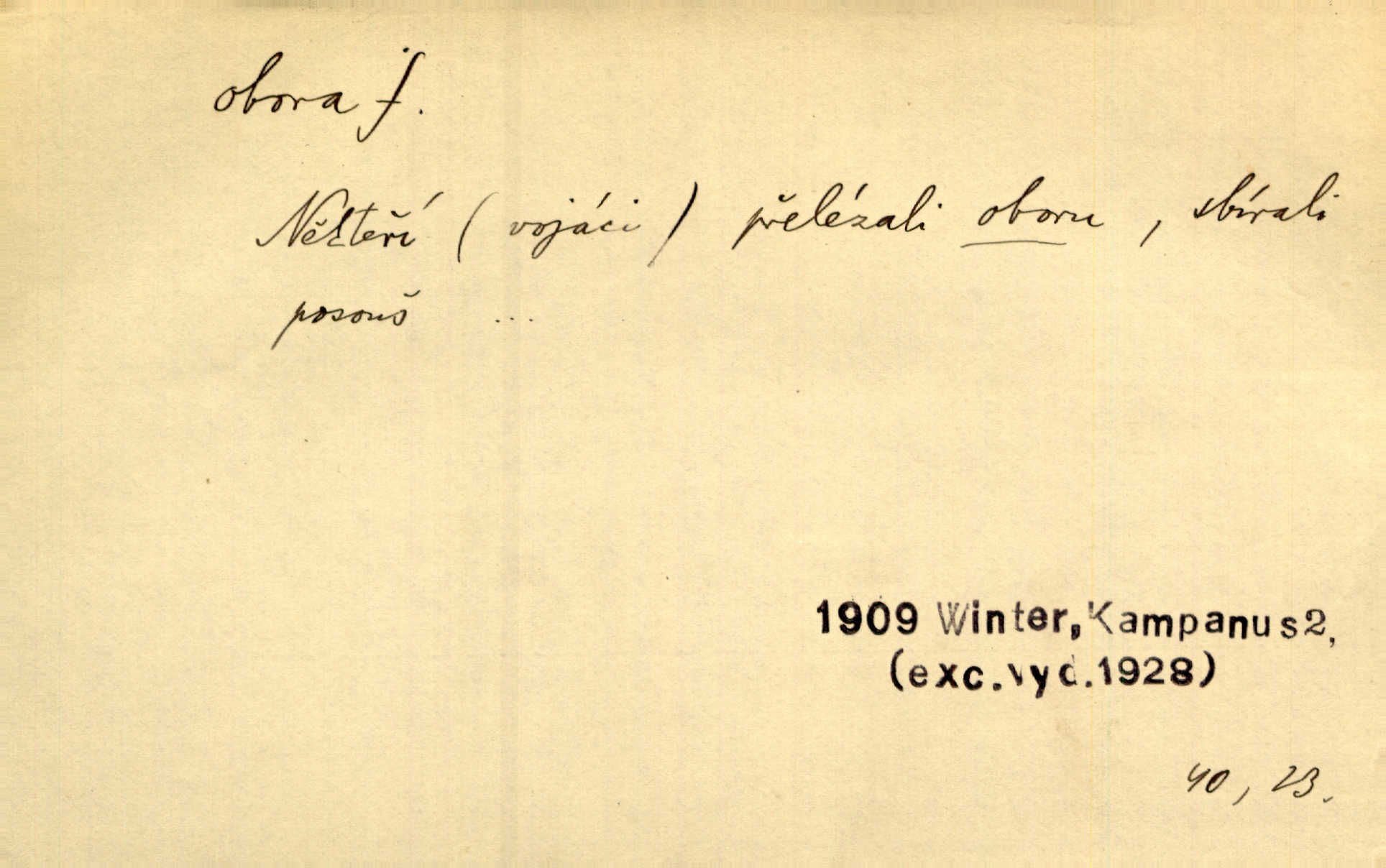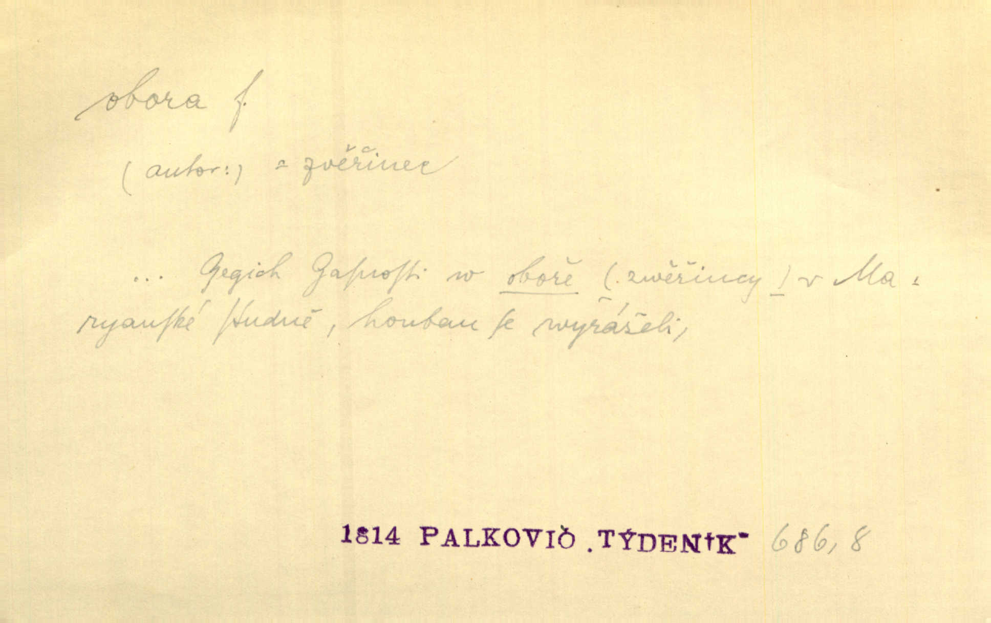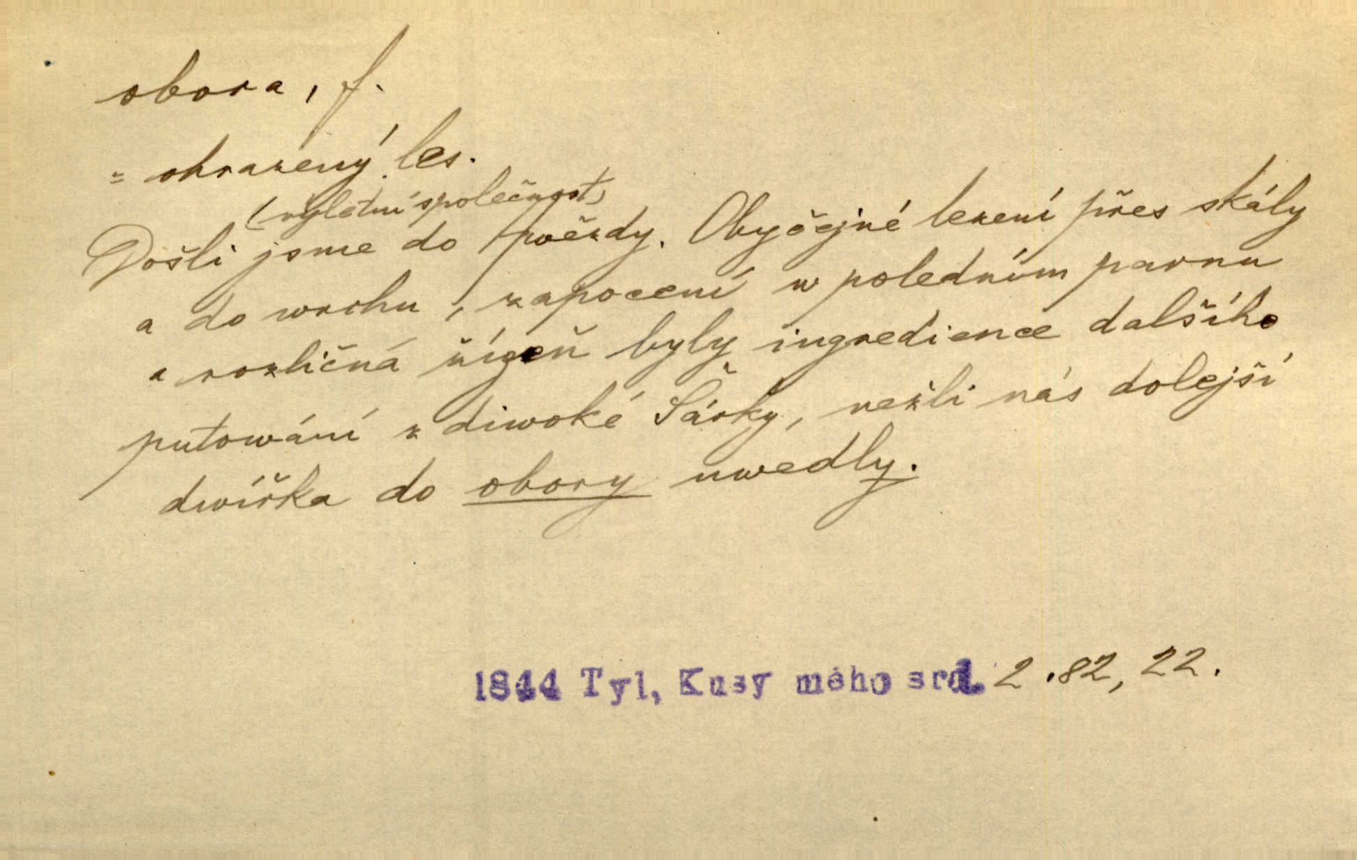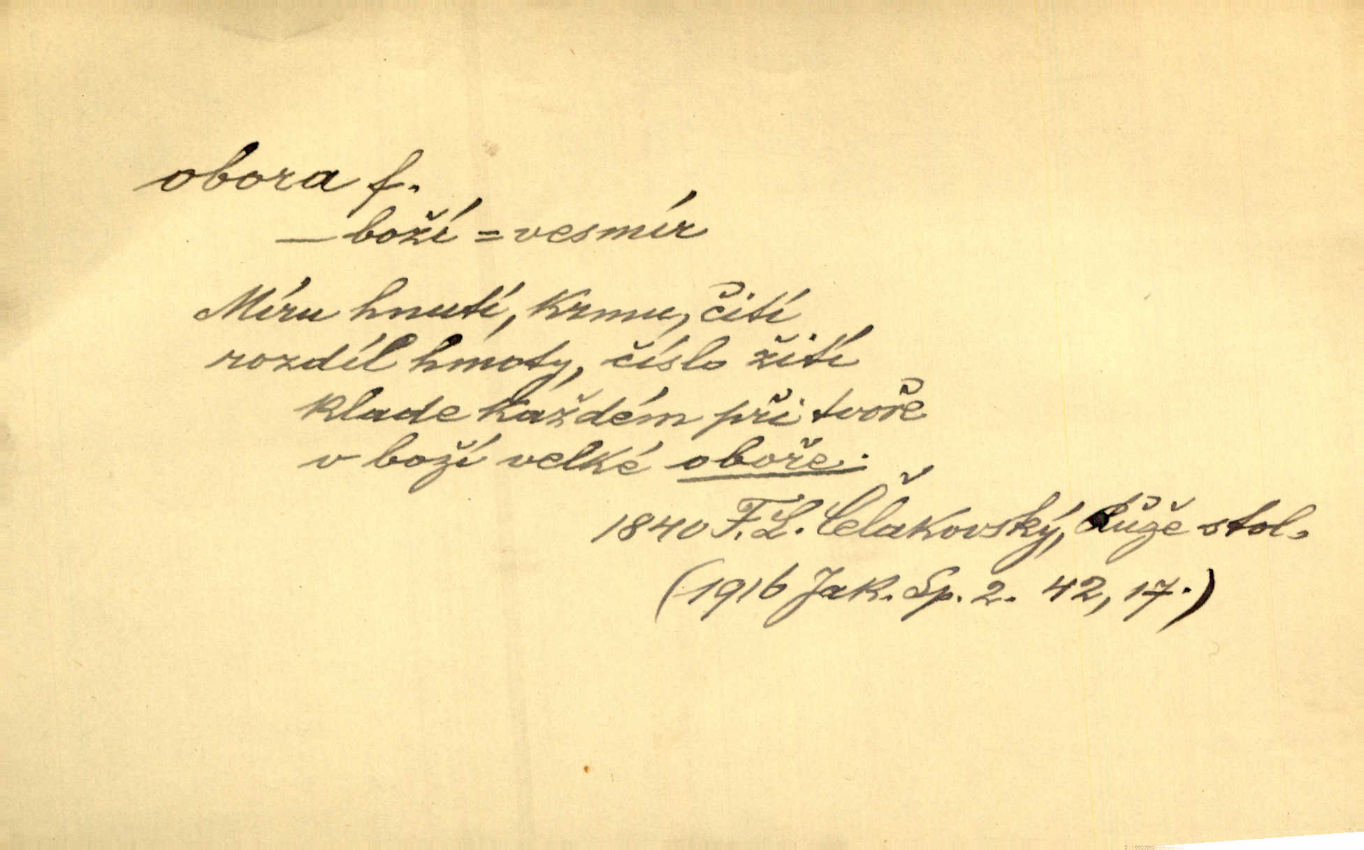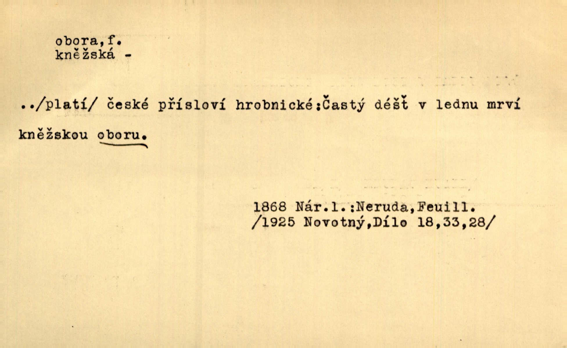 - obora, -y f. ohrazený pozemek porostlý lesem, v kterém se chová zvěř. Bylo slyšeti o králi a jeho družině, jak honí v oboře. Jir. Chodil se dívat do obory, když princ tam na ochočeném jelenu jezdil. Schulz. Přen. Prý vlhnou v ní [v černé zimě] i kosti, a časté její deště hojně mrví kněžskou oboru hřbitov. A. Mrš. Geogr. Královská obora jeden z pražských sadů. D Zast. obor, oblast. Slyšte, řeky valné, dřív než jdete v moře oboru. Koll.