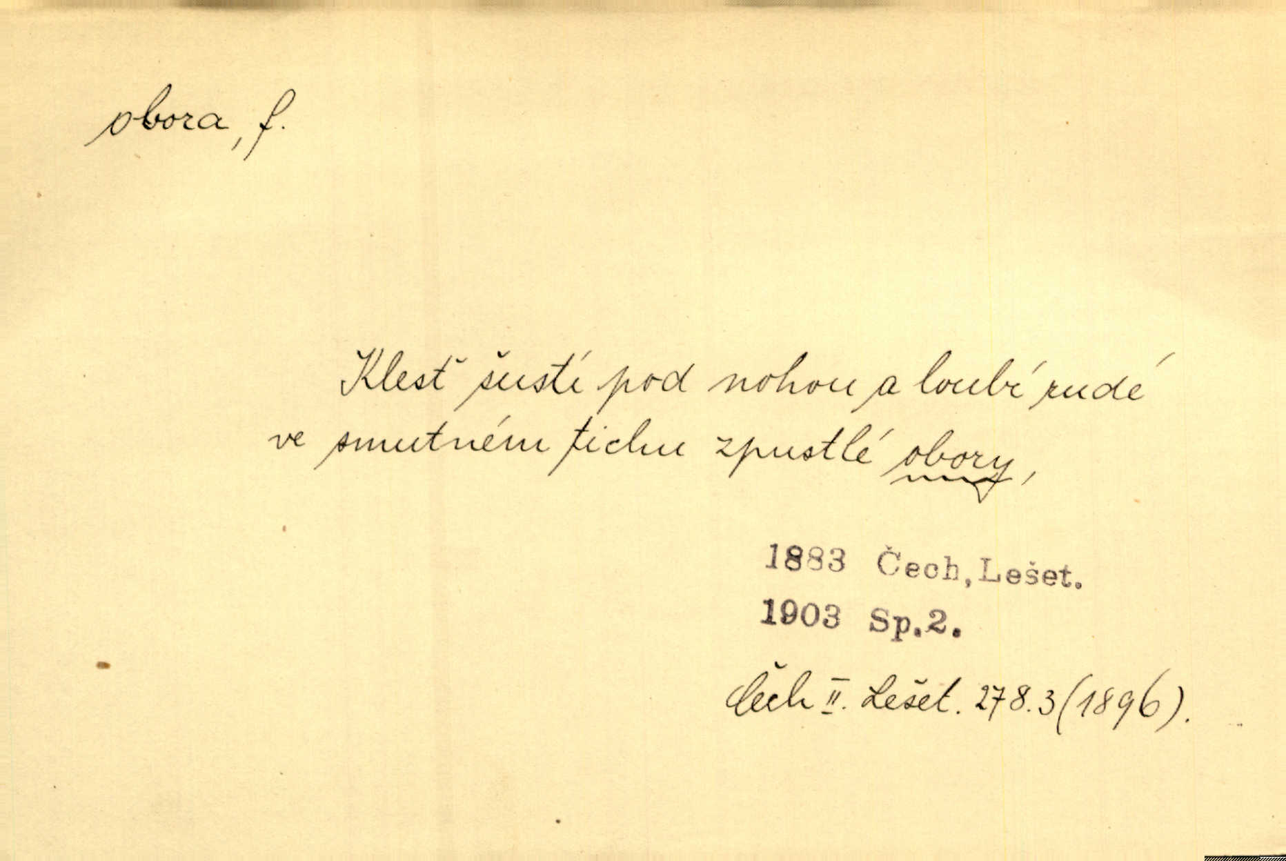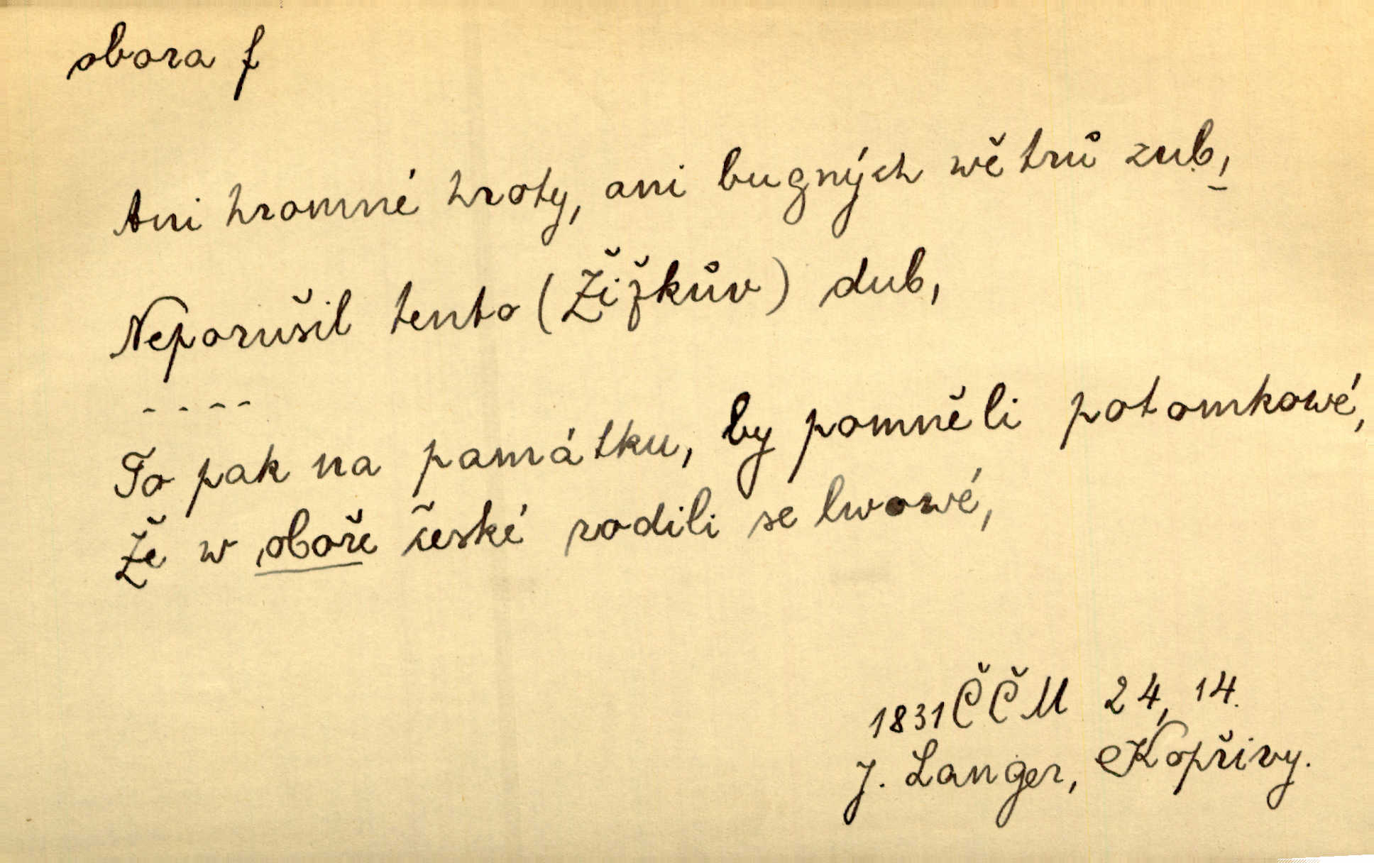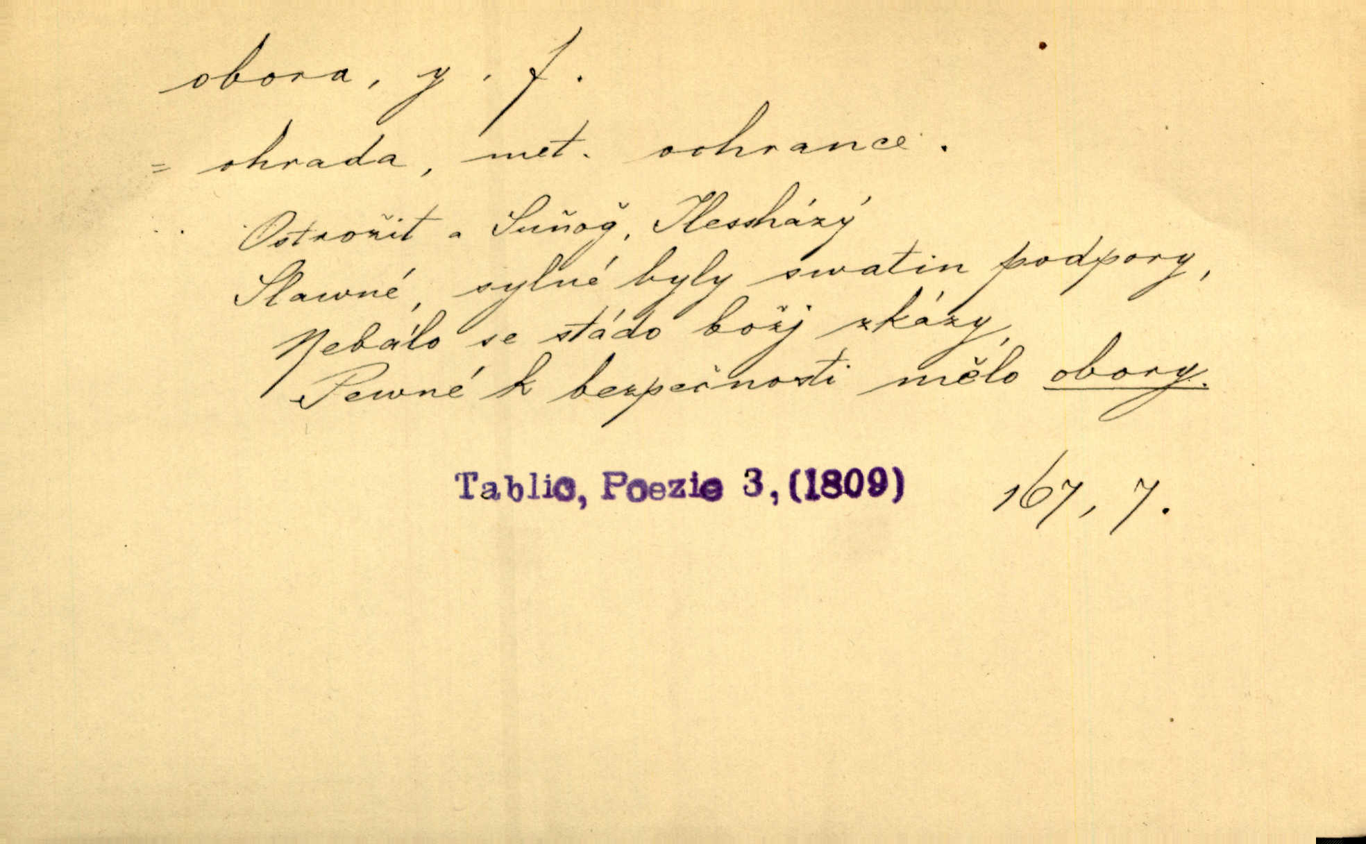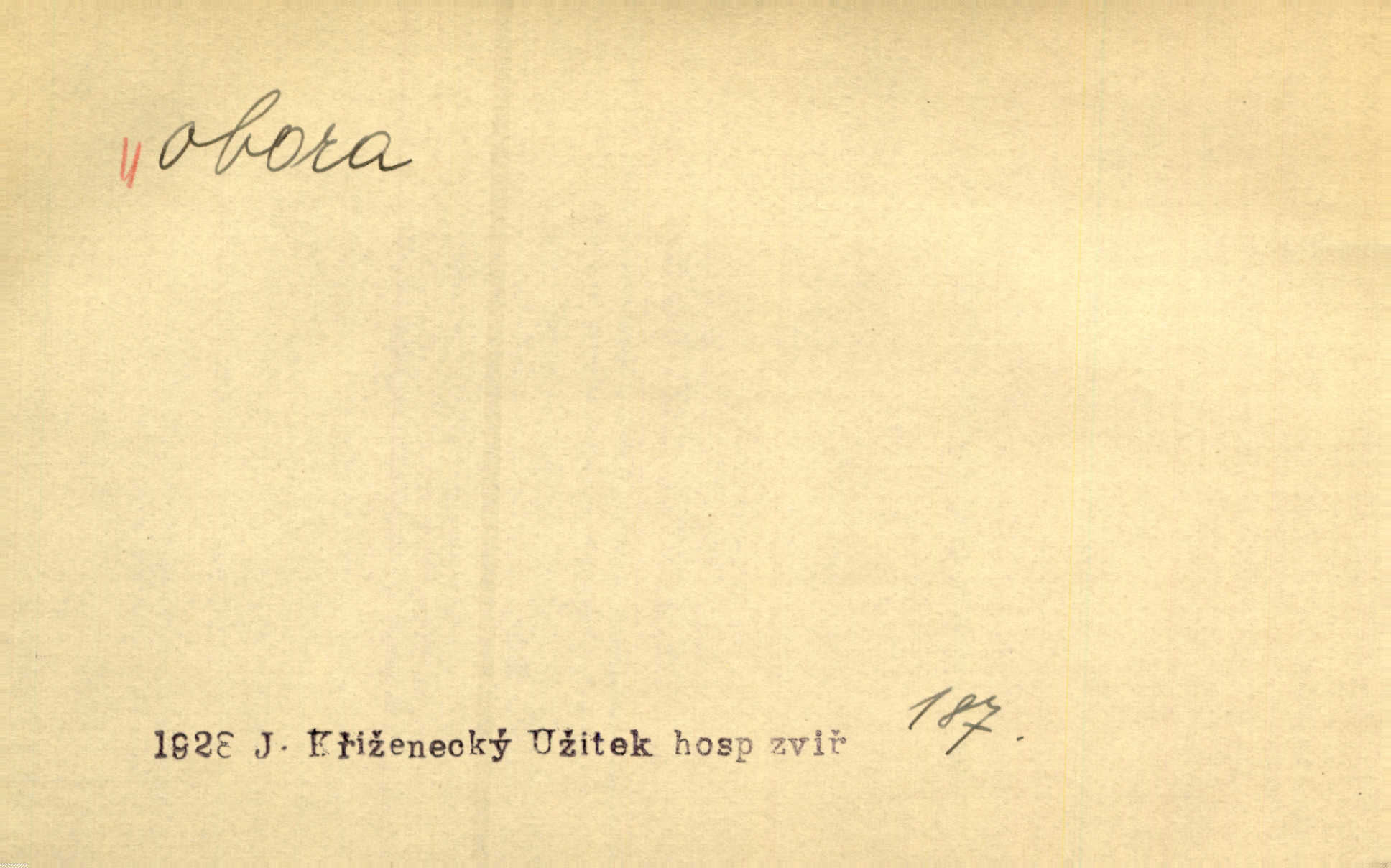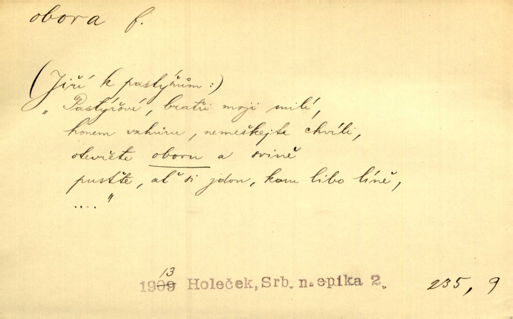 - obora, -y f. ohrazený pozemek porostlý lesem, v kterém se chová zvěř. Bylo slyšeti o králi a jeho družině, jak honí v oboře. Jir. Chodil se dívat do obory, když princ tam na ochočeném jelenu jezdil. Schulz. Přen. Prý vlhnou v ní [v černé zimě] i kosti, a časté její deště hojně mrví kněžskou oboru hřbitov. A. Mrš. Geogr. Královská obora jeden z pražských sadů. D Zast. obor, oblast. Slyšte, řeky valné, dřív než jdete v moře oboru. Koll.