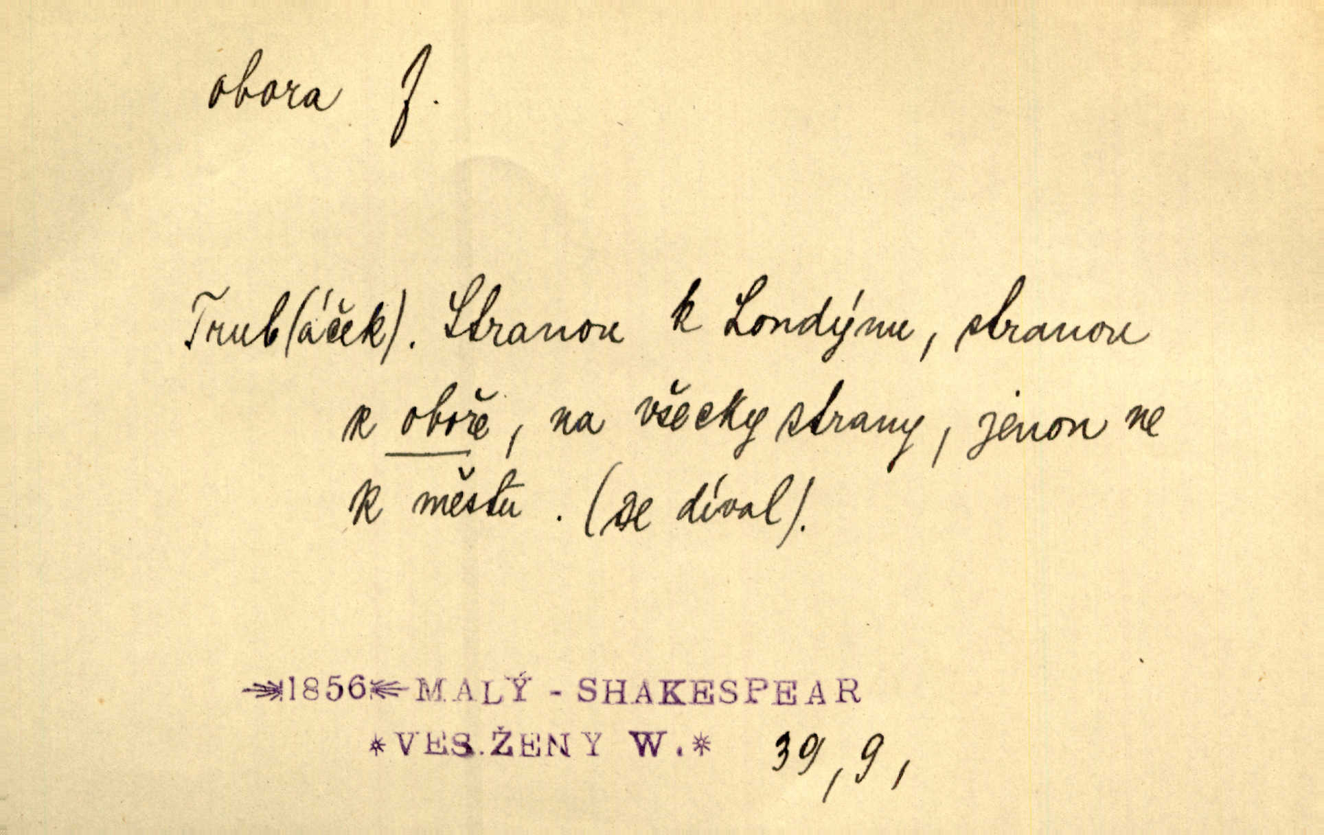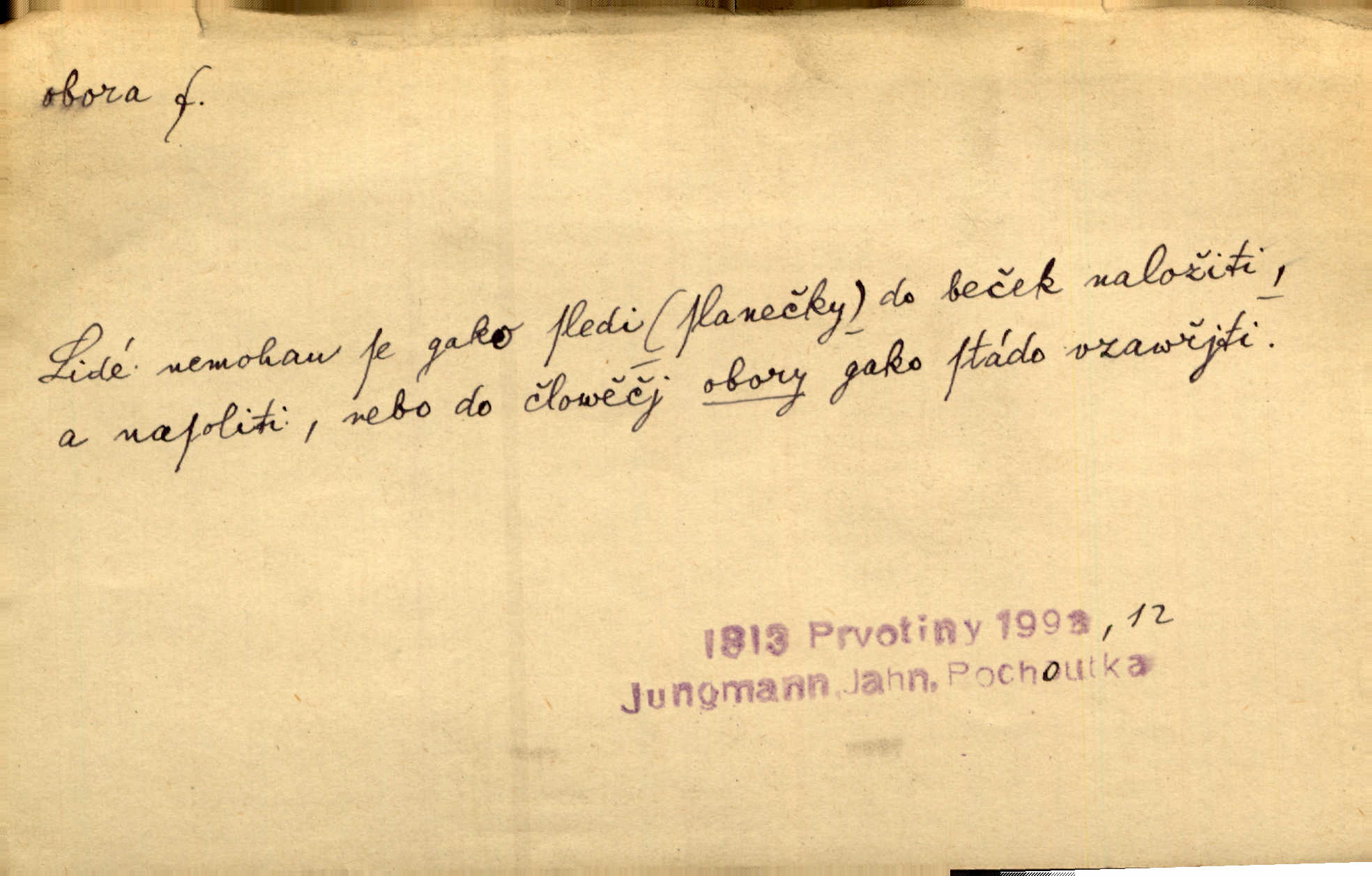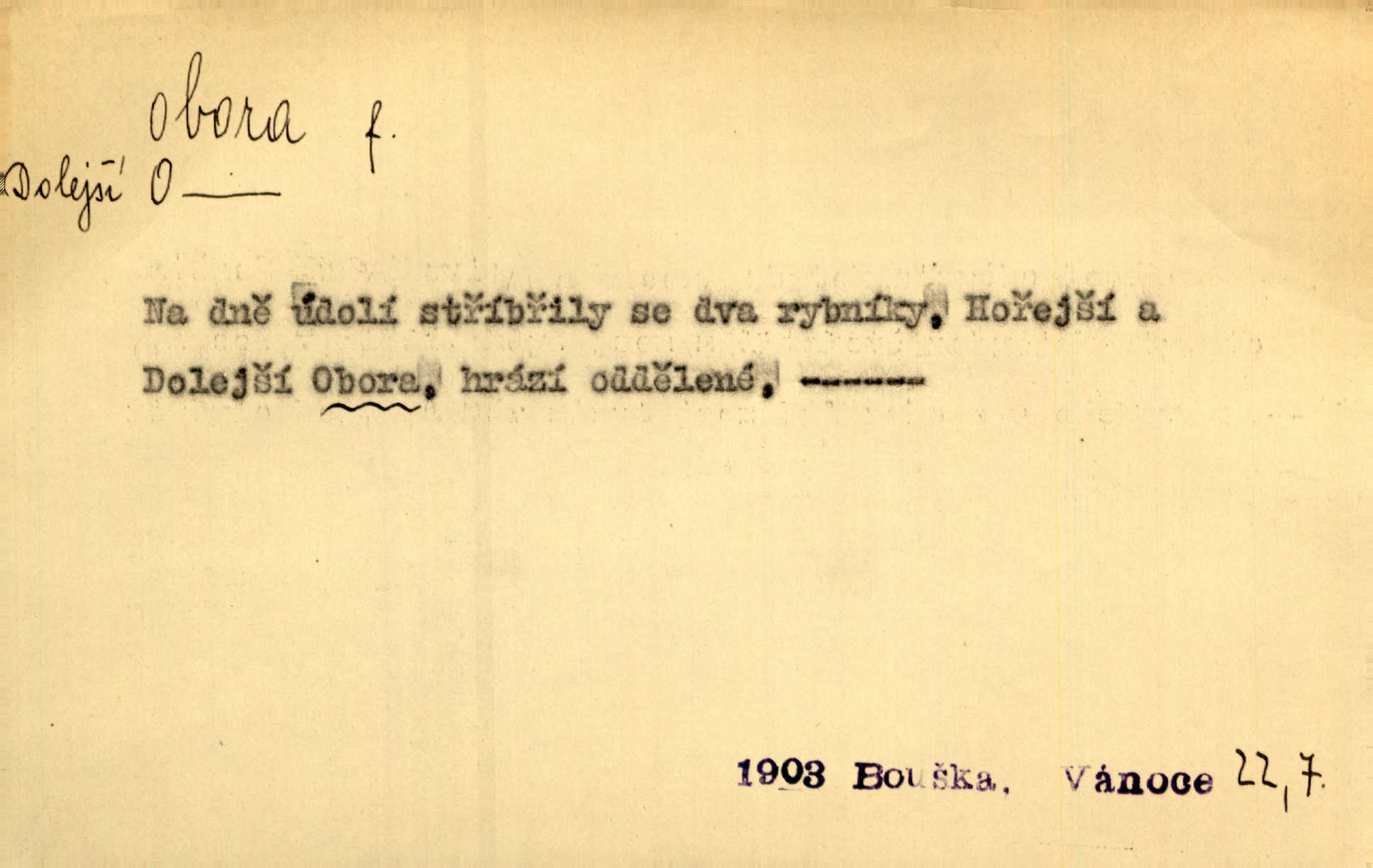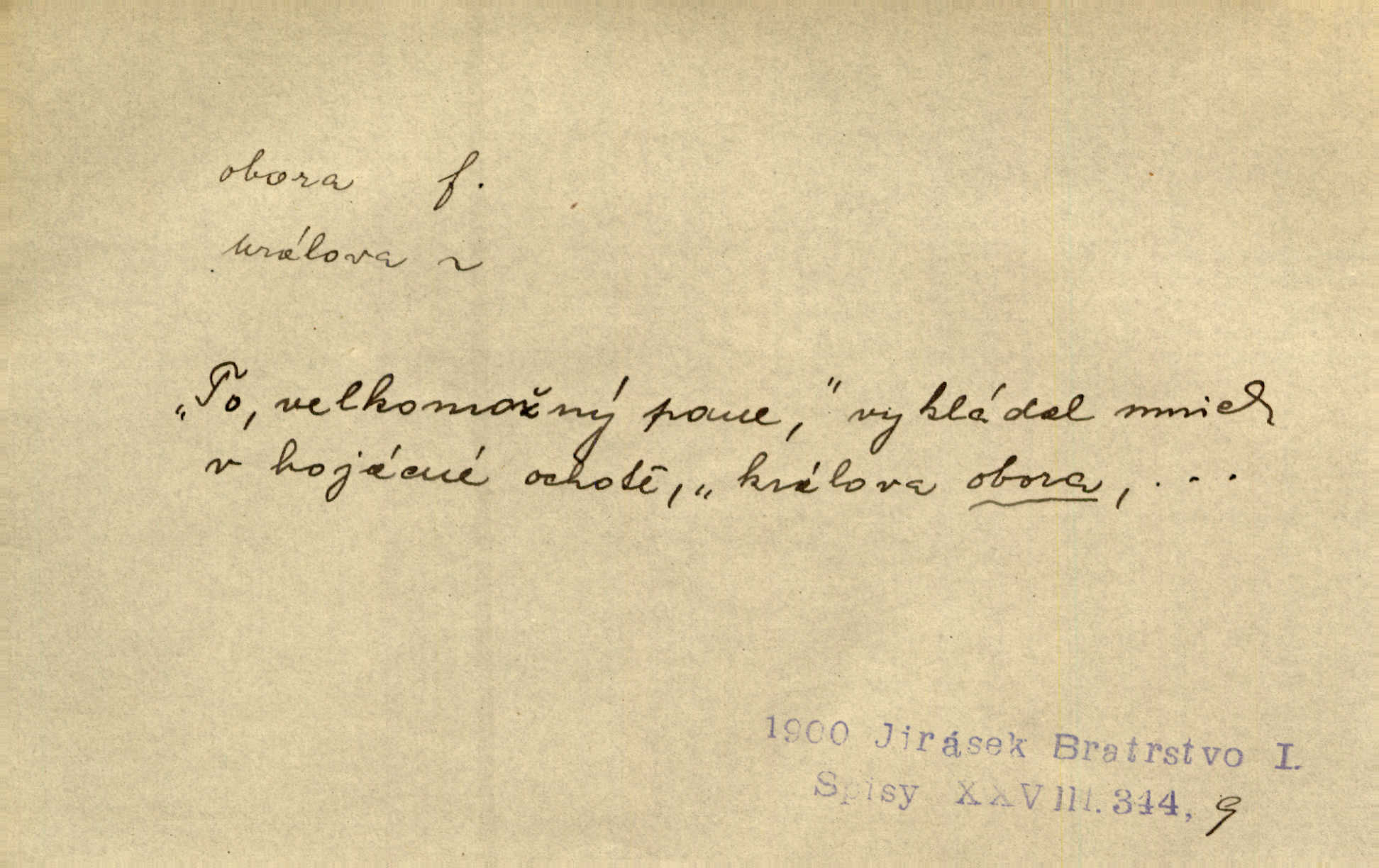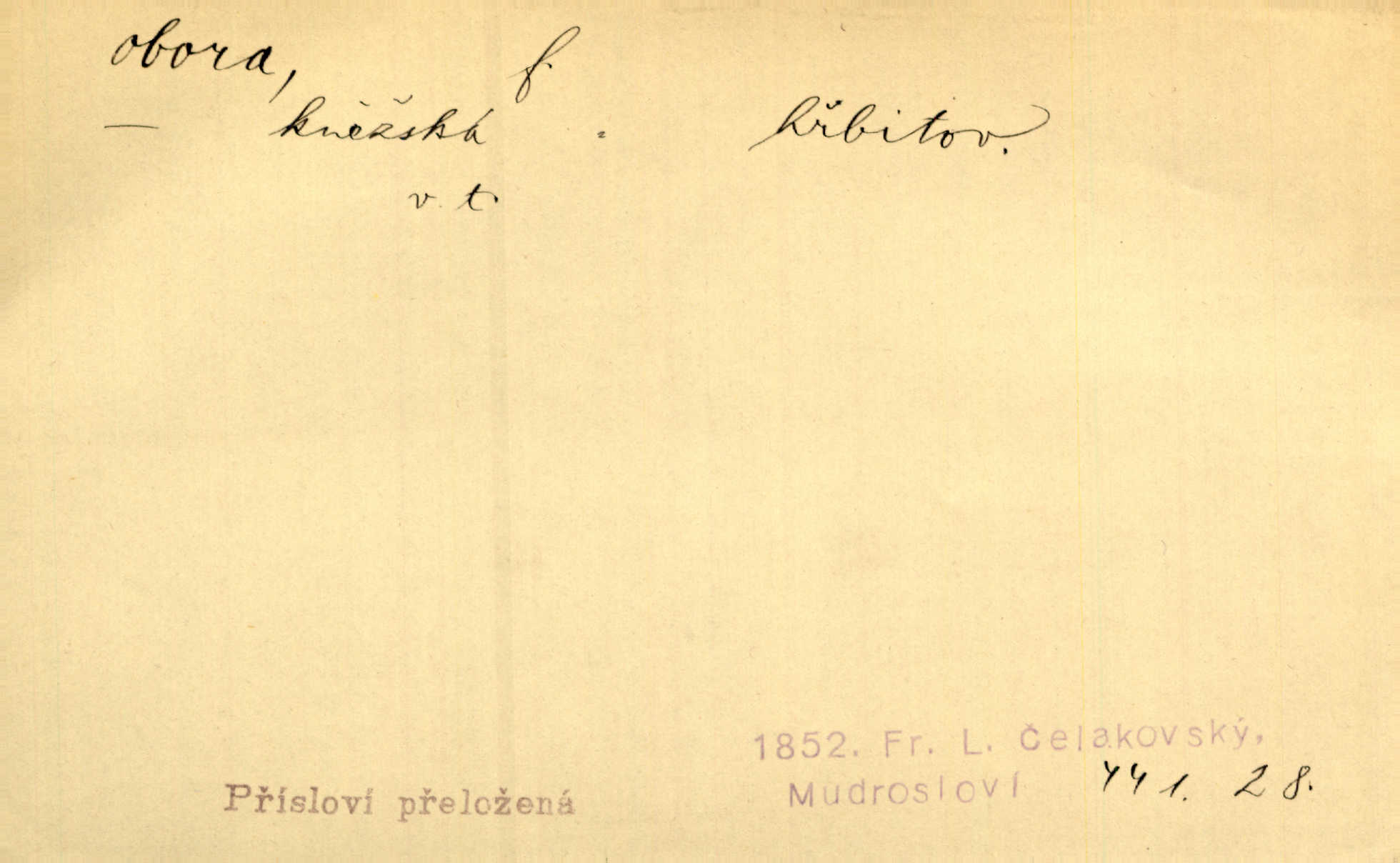 - obora, -y f. ohrazený pozemek porostlý lesem, v kterém se chová zvěř. Bylo slyšeti o králi a jeho družině, jak honí v oboře. Jir. Chodil se dívat do obory, když princ tam na ochočeném jelenu jezdil. Schulz. Přen. Prý vlhnou v ní [v černé zimě] i kosti, a časté její deště hojně mrví kněžskou oboru hřbitov. A. Mrš. Geogr. Královská obora jeden z pražských sadů. D Zast. obor, oblast. Slyšte, řeky valné, dřív než jdete v moře oboru. Koll.