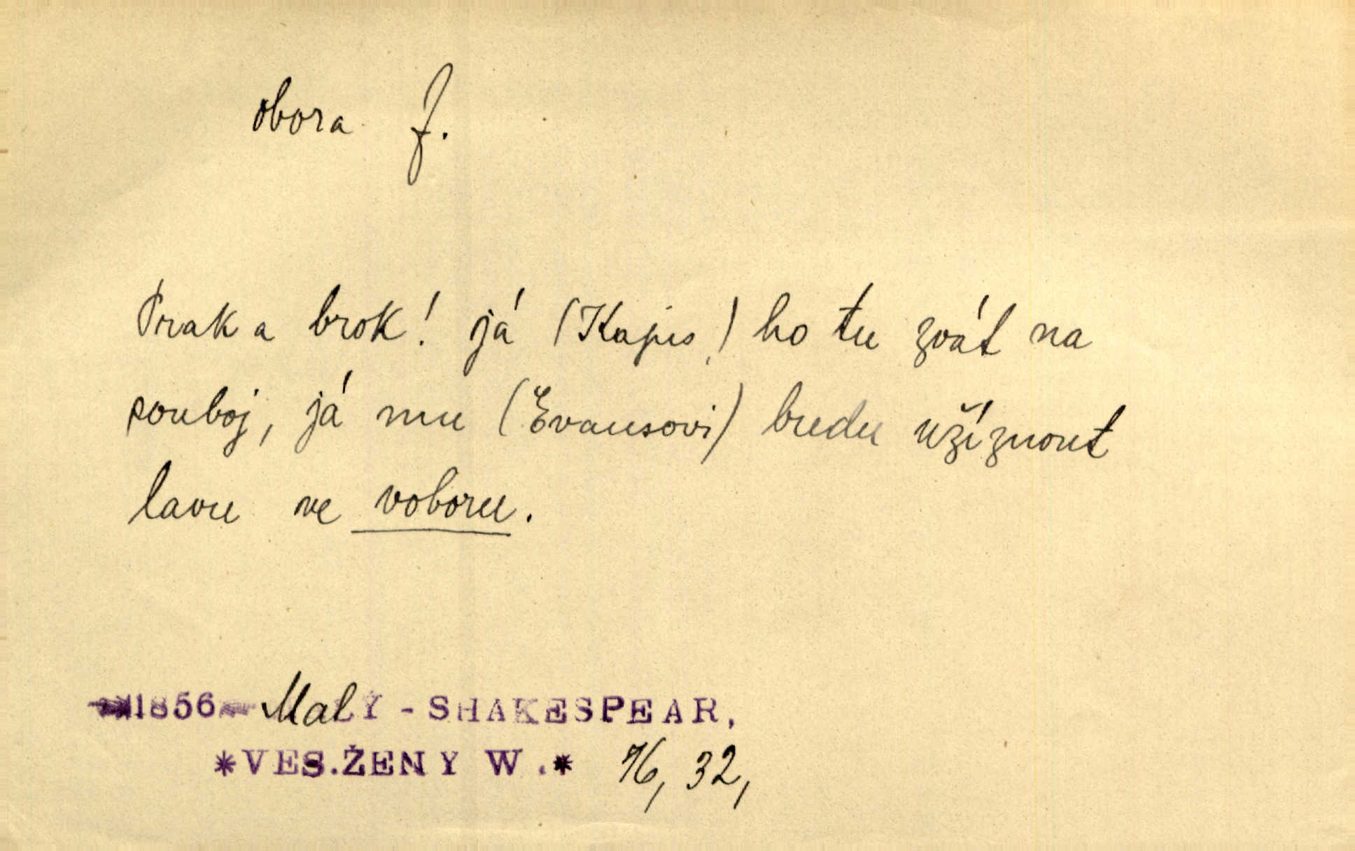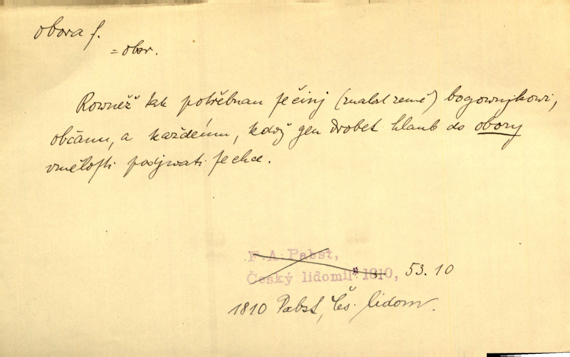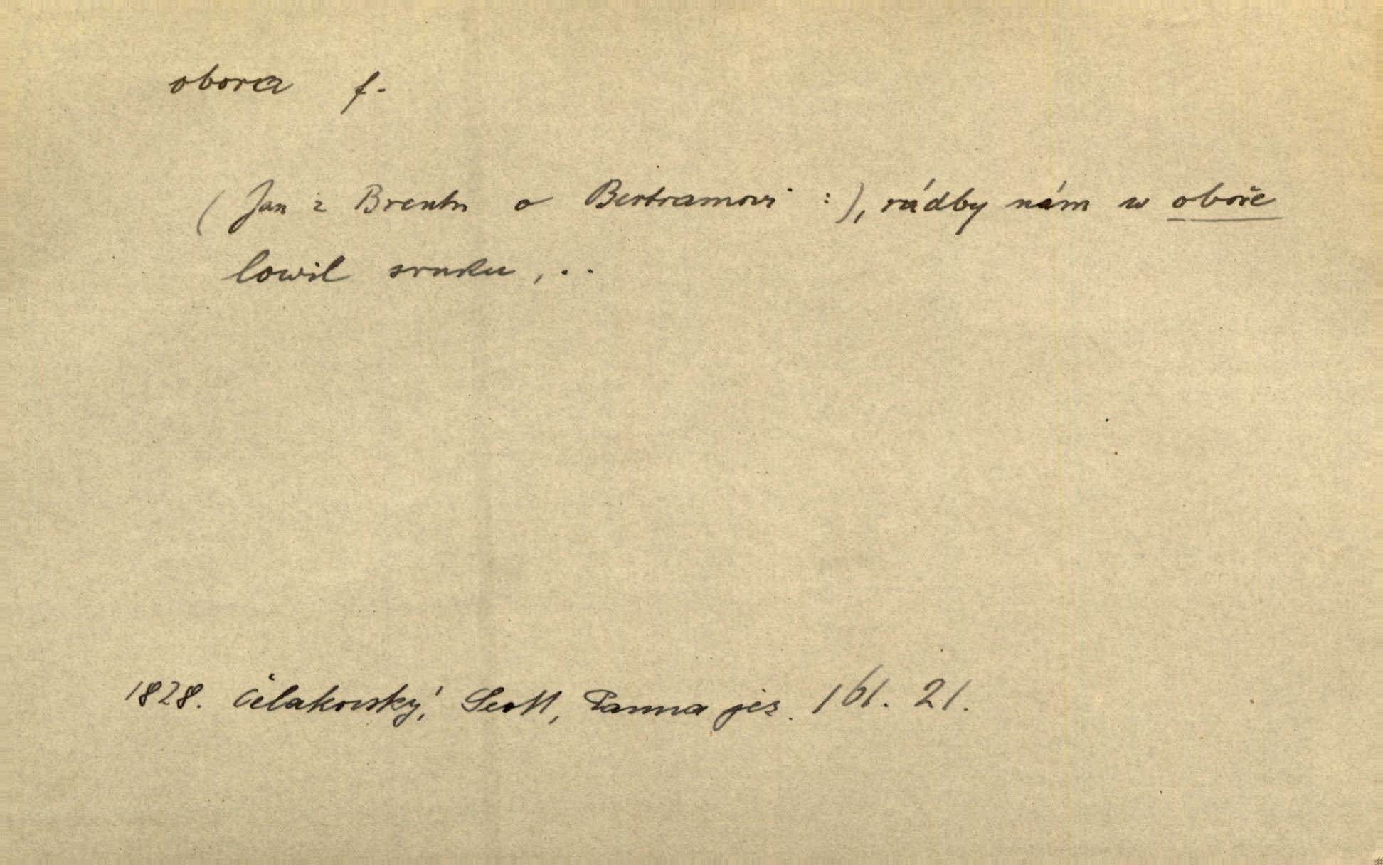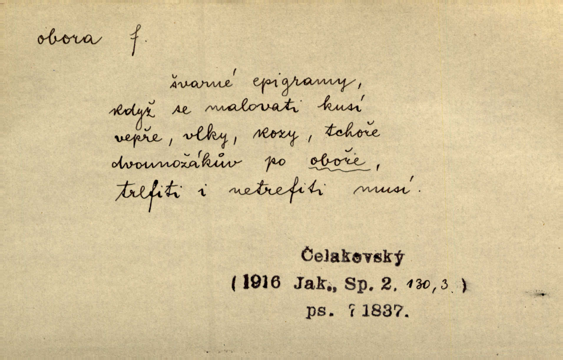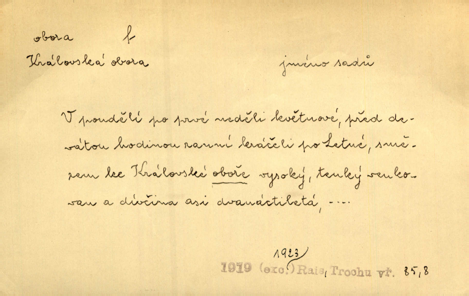 - obora, -y f. ohrazený pozemek porostlý lesem, v kterém se chová zvěř. Bylo slyšeti o králi a jeho družině, jak honí v oboře. Jir. Chodil se dívat do obory, když princ tam na ochočeném jelenu jezdil. Schulz. Přen. Prý vlhnou v ní [v černé zimě] i kosti, a časté její deště hojně mrví kněžskou oboru hřbitov. A. Mrš. Geogr. Královská obora jeden z pražských sadů. D Zast. obor, oblast. Slyšte, řeky valné, dřív než jdete v moře oboru. Koll.