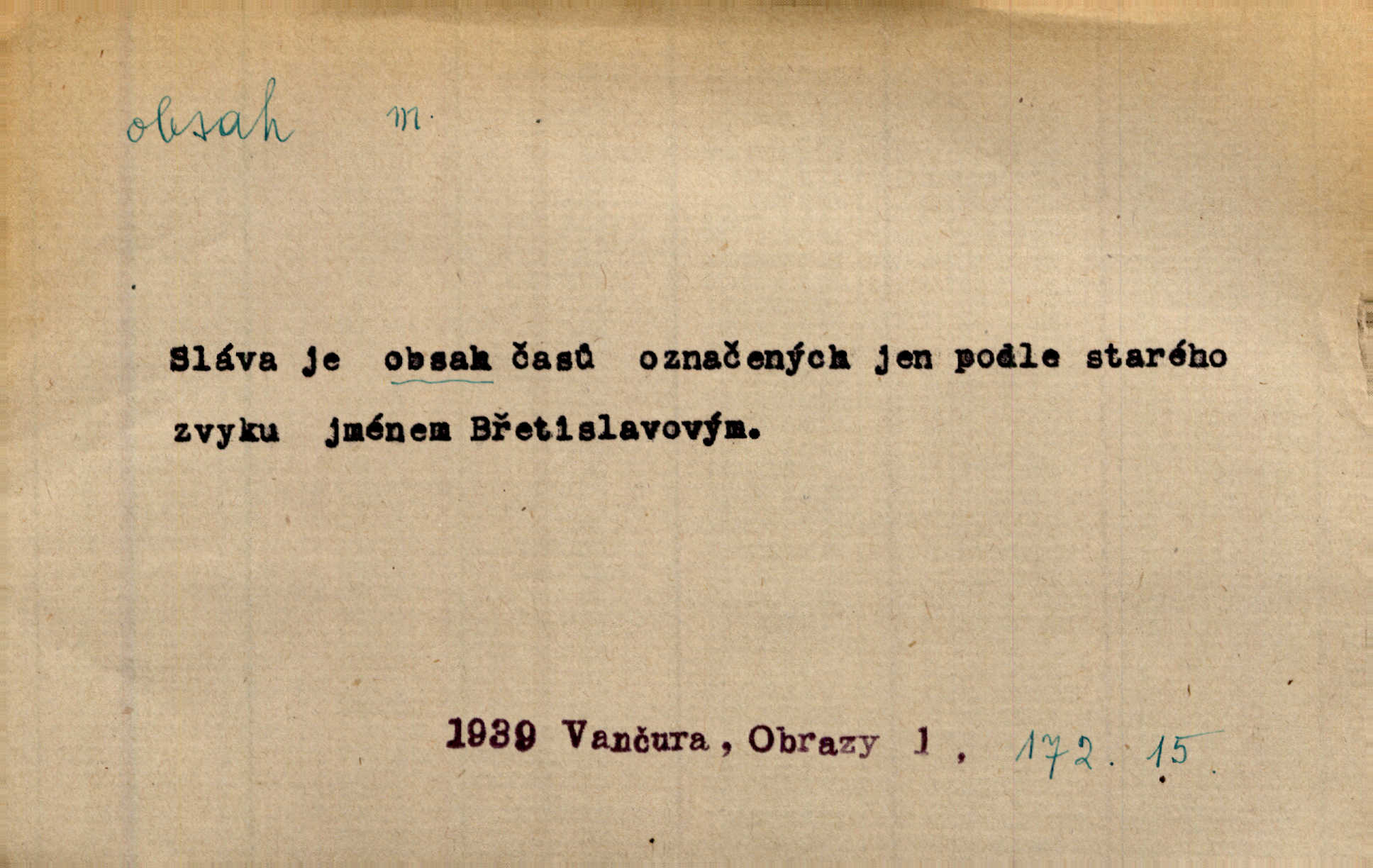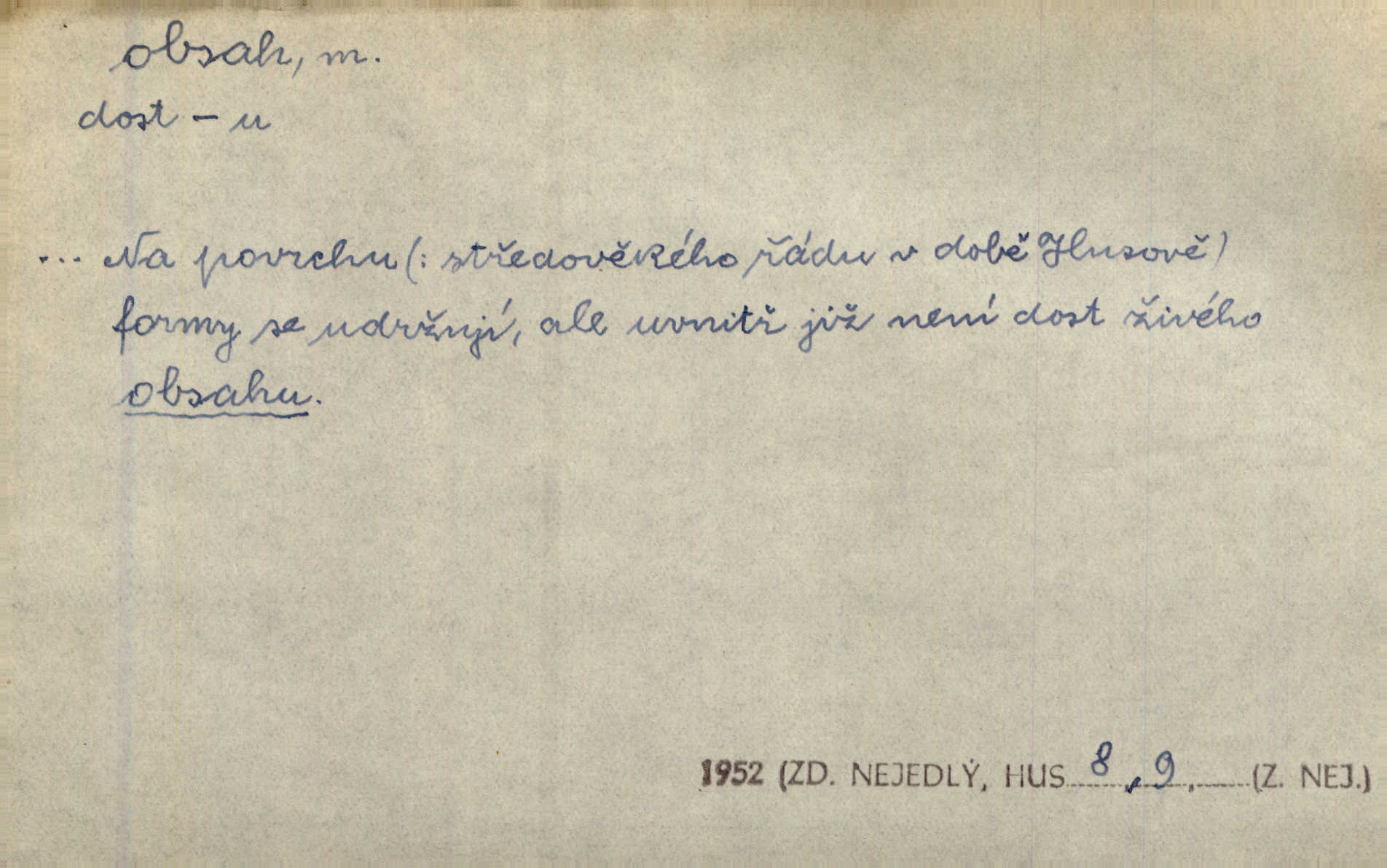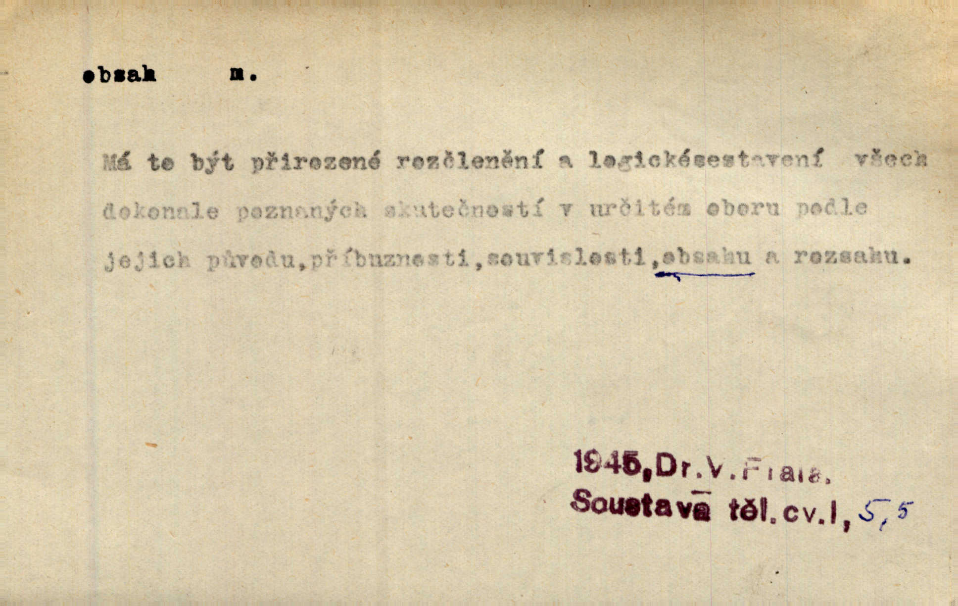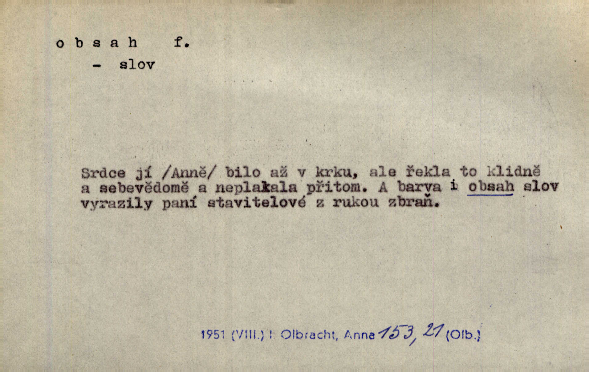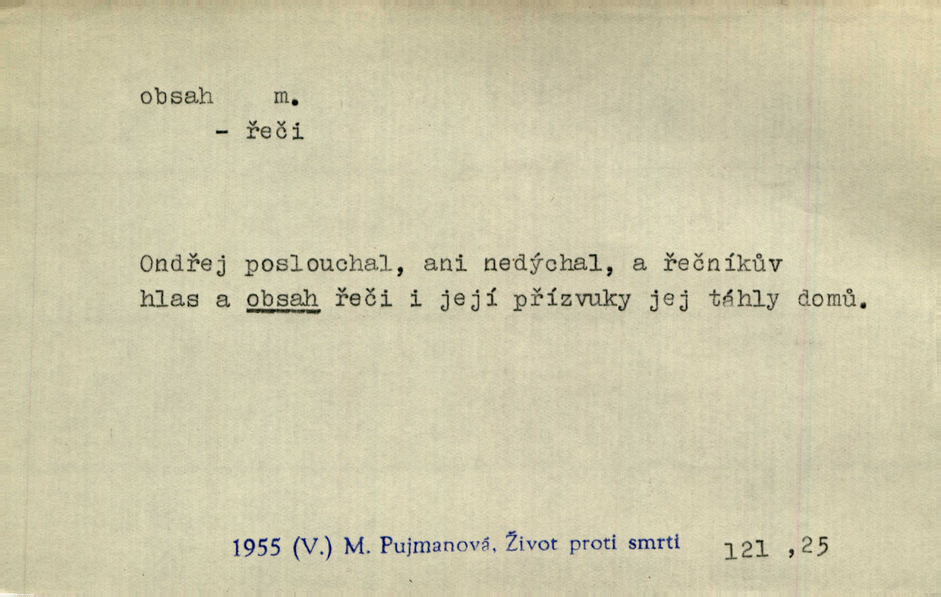 - obsah, -u m. co je uvnitř něčeho jakožto náplň, výplň, co zabírá vnitřek něčeho. Zotvírala skříně a přehlížela jejich obsah. Svět. Vnitřek jizby je zajímavý obsahem svým. Ner. Láhev s tmavým obsahem. Rais. Ten k tabatěrce zřetel obrací, noře prsty v obsah její hnědý. Čech. Na levé ruce visel jí košík, těžký obsahem. Šmil. Obal byl veliký, obsah malý. Herrm. Obsah nádoby. Geom. velikost plochy omezené uzavřenou čarou (plošný obsah); velikost prostoru ohraničeného uzavřenou plochou (krychlový obsah, objem). Chem. obsah chloru ve zkoumaném vzorku; produkt s malým obsahem arsenu; solný obsah roztoku. D vnitřní smysl, význam toho, co je vyjádřeno řečí, písmem, obrazem a pod. Tajuplné kouzlo její nespočívalo tak v obsahu řeči, jako spíše v lahodě hlasu jejího. Arb. Promysliv pozorně obsah každé sloky, nahlížel jsem teprve nyní jasně v bývalé názory páně radovy. Šim. Mnohosvazkové romány nicotného a nudného obsahu. V. Mrš. Viděli jsme již, jak malba a hudba obsahem i formou vyhovuje modernímu člověku. Ner. V tom [v lásce] je celý obsah mého života. Zey. Určení obsahu a dosahu práva státního občanství předpokládalo by takřka okružní cestu celou soustavou rakouského práva veřejného. Čes. pol. Stará slova domácí dostávají nový obsah, význam. Hujer. Logika by hledala obsah čili význam slova v jeho nitru. K. Čap. Jako hrubé udeření kamenem dotkla se ta slova obsahem i tonem duší obou kněží. Baar. Log. obsah pojmu souhrn všech podstatných znaků věci, jimiž jest pojem určen. D obsah knihy tištěný seznam věcí obsažených v knize.