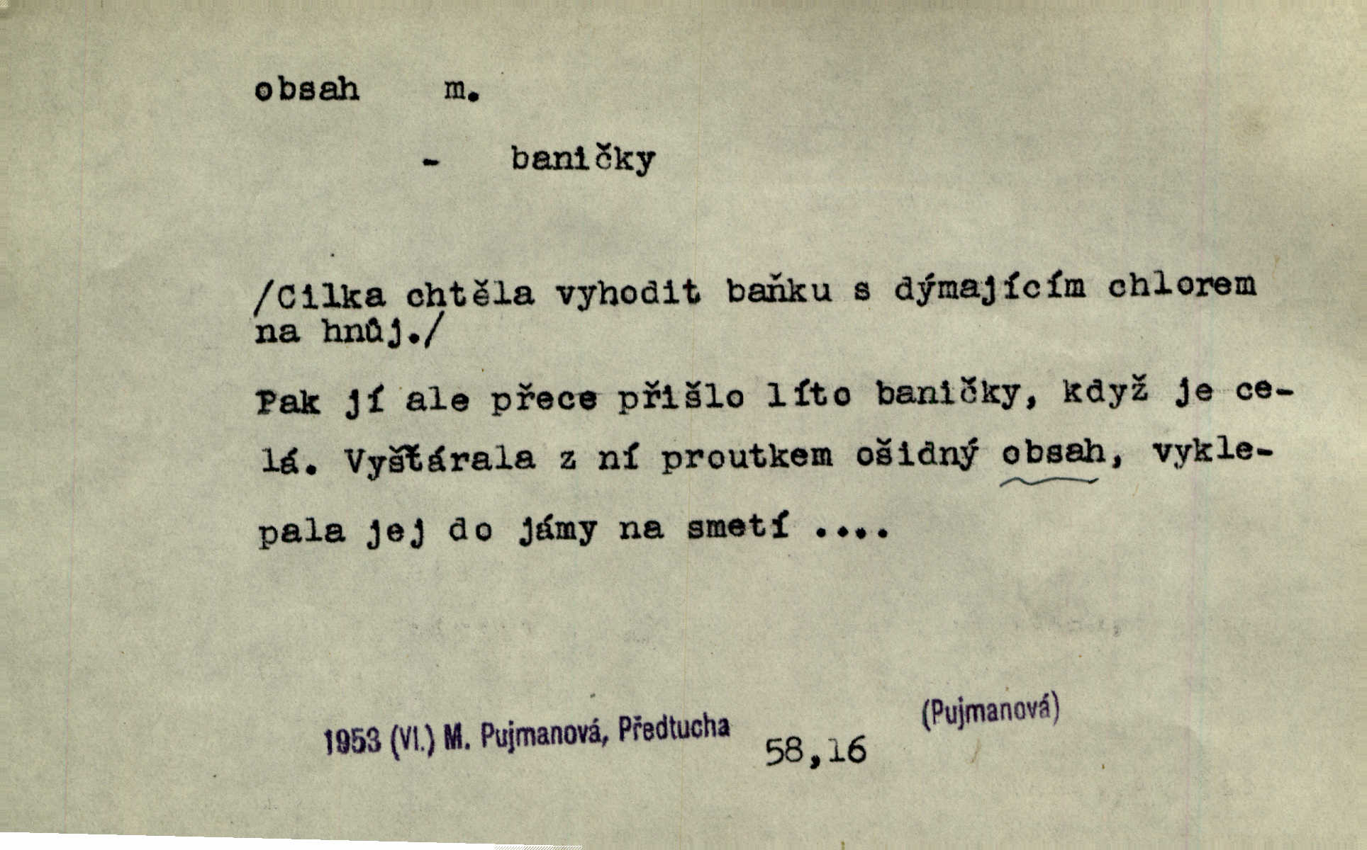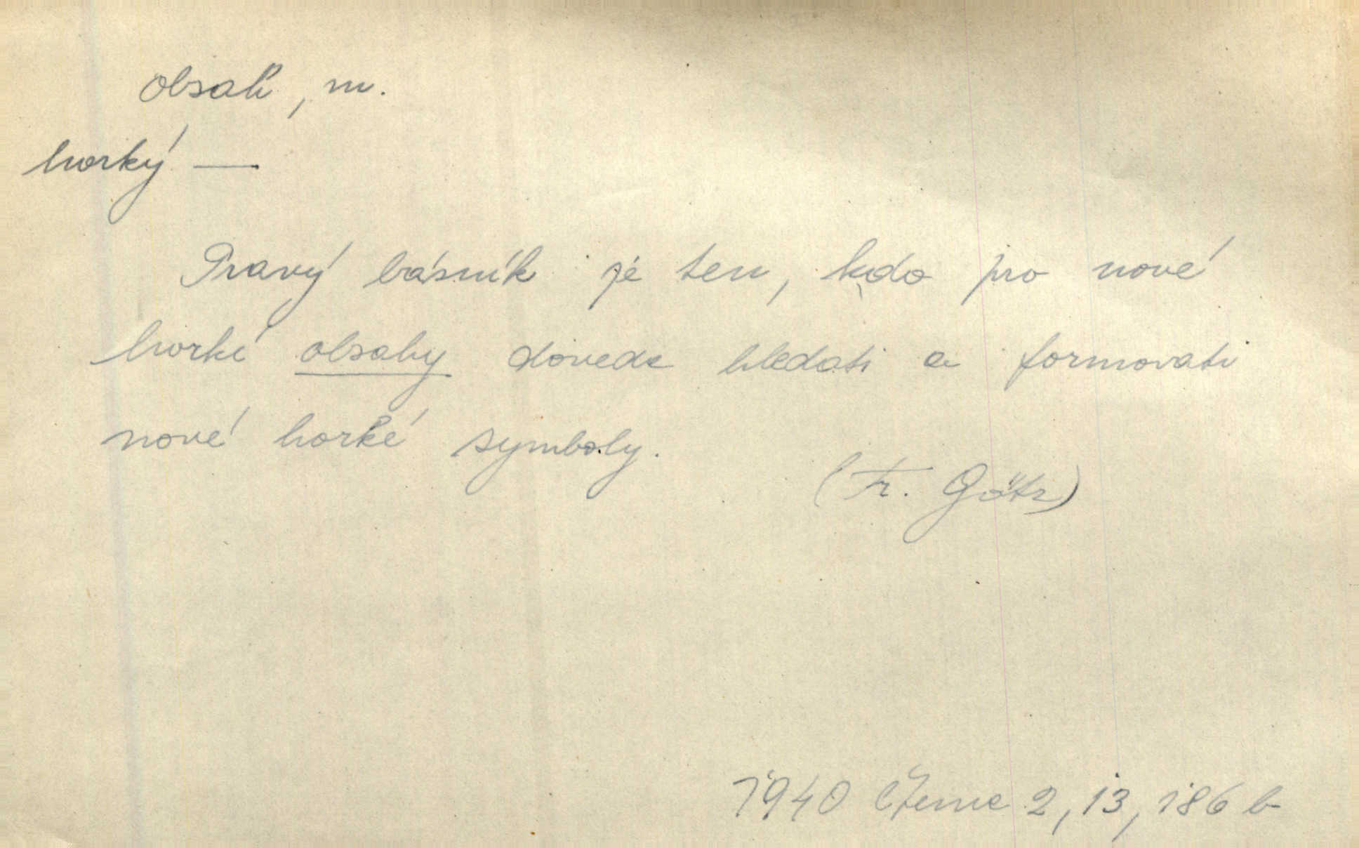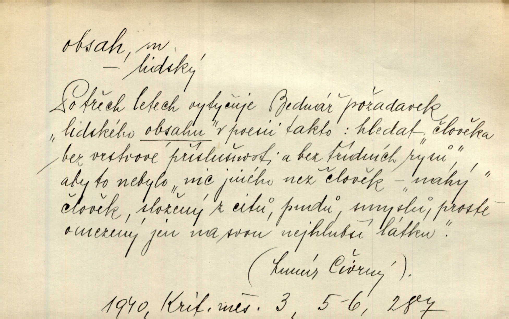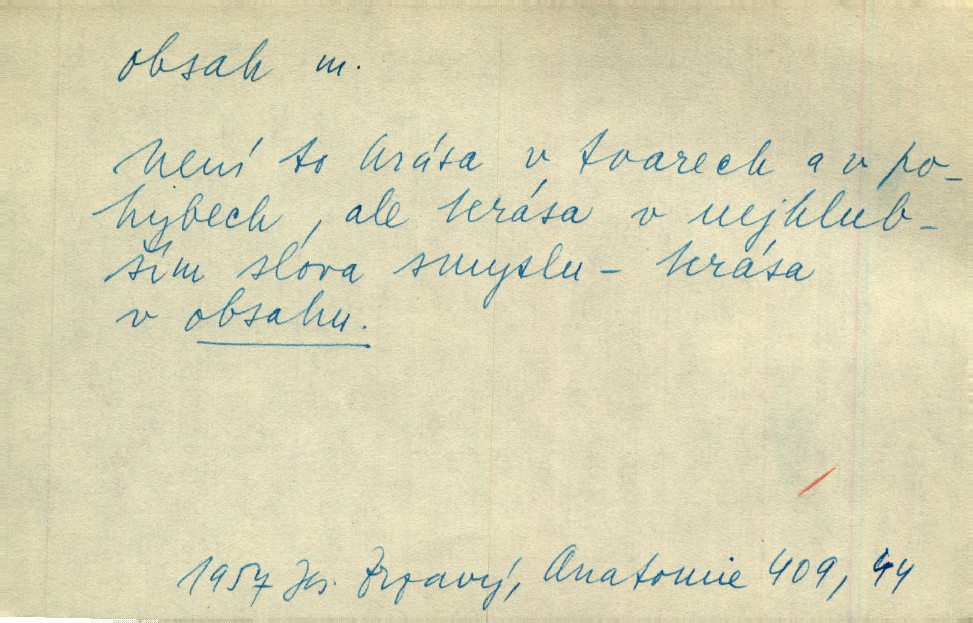 - obsah, -u m. co je uvnitř něčeho jakožto náplň, výplň, co zabírá vnitřek něčeho. Zotvírala skříně a přehlížela jejich obsah. Svět. Vnitřek jizby je zajímavý obsahem svým. Ner. Láhev s tmavým obsahem. Rais. Ten k tabatěrce zřetel obrací, noře prsty v obsah její hnědý. Čech. Na levé ruce visel jí košík, těžký obsahem. Šmil. Obal byl veliký, obsah malý. Herrm. Obsah nádoby. Geom. velikost plochy omezené uzavřenou čarou (plošný obsah); velikost prostoru ohraničeného uzavřenou plochou (krychlový obsah, objem). Chem. obsah chloru ve zkoumaném vzorku; produkt s malým obsahem arsenu; solný obsah roztoku. D vnitřní smysl, význam toho, co je vyjádřeno řečí, písmem, obrazem a pod. Tajuplné kouzlo její nespočívalo tak v obsahu řeči, jako spíše v lahodě hlasu jejího. Arb. Promysliv pozorně obsah každé sloky, nahlížel jsem teprve nyní jasně v bývalé názory páně radovy. Šim. Mnohosvazkové romány nicotného a nudného obsahu. V. Mrš. Viděli jsme již, jak malba a hudba obsahem i formou vyhovuje modernímu člověku. Ner. V tom [v lásce] je celý obsah mého života. Zey. Určení obsahu a dosahu práva státního občanství předpokládalo by takřka okružní cestu celou soustavou rakouského práva veřejného. Čes. pol. Stará slova domácí dostávají nový obsah, význam. Hujer. Logika by hledala obsah čili význam slova v jeho nitru. K. Čap. Jako hrubé udeření kamenem dotkla se ta slova obsahem i tonem duší obou kněží. Baar. Log. obsah pojmu souhrn všech podstatných znaků věci, jimiž jest pojem určen. D obsah knihy tištěný seznam věcí obsažených v knize.
