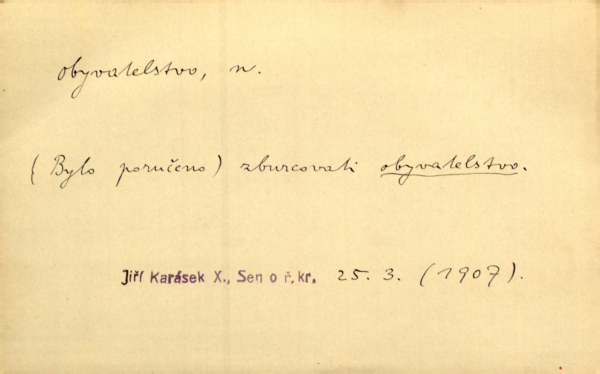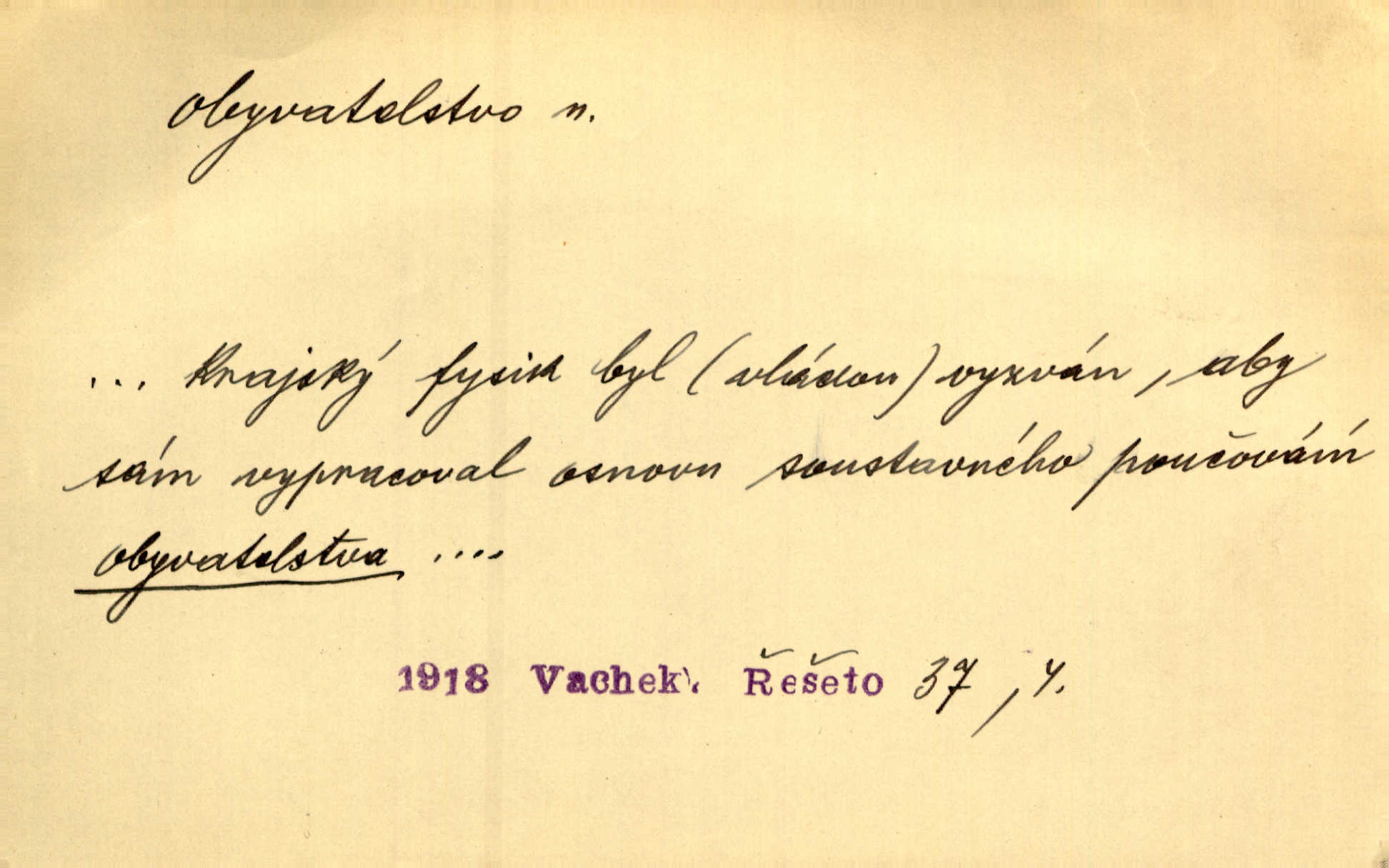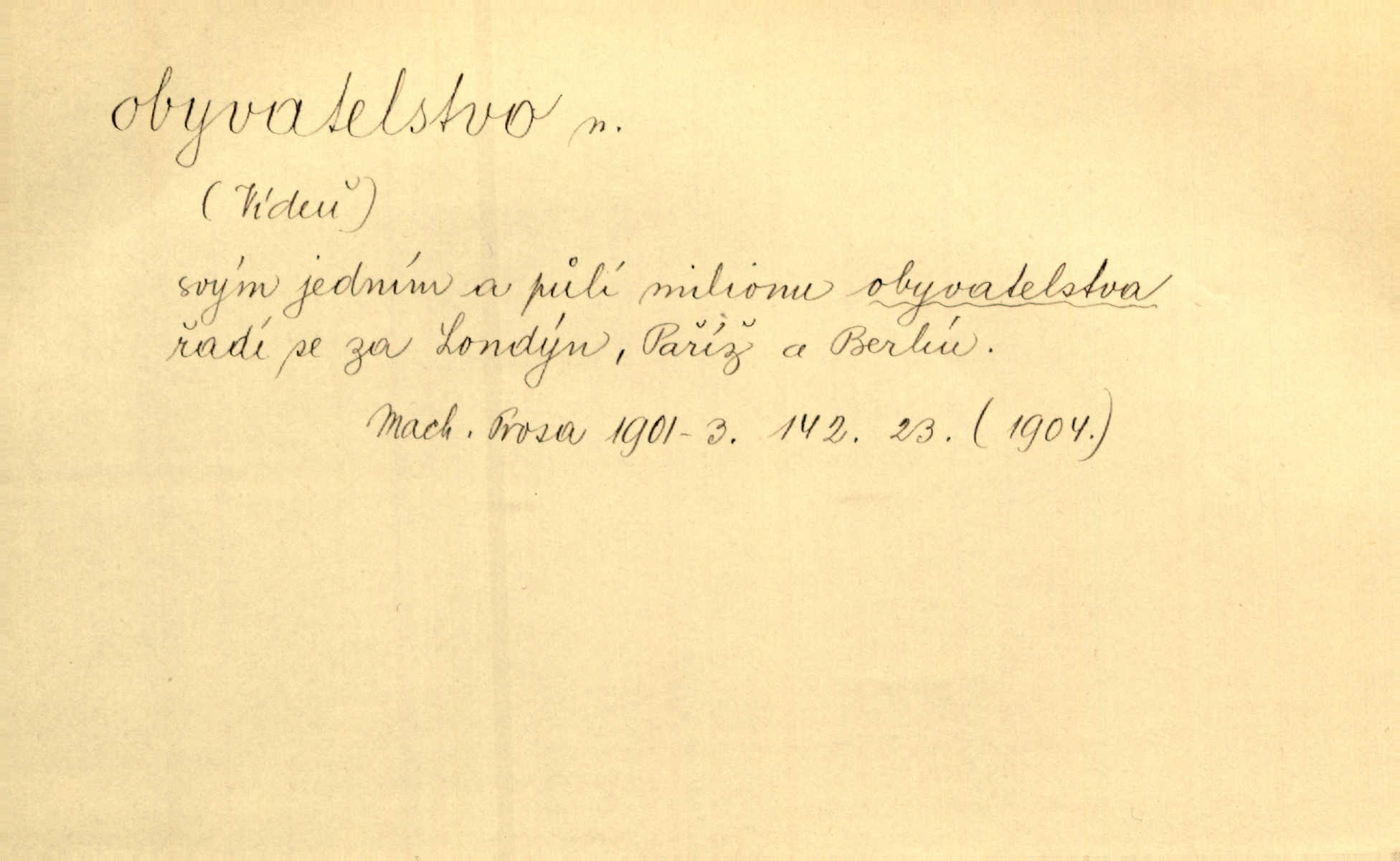 - obyvatelstvo, -a n. souhrn obyvatelů nějakého místa. [Krajský fysik] vypracoval osnovu soustavného poučování obyvatelstva. Vach. „Polosvětem“ nazval mladší Dumas jistou část ženského obyvatelstva pařížského. Ner. Pojezdný, jeho choť, dva písaři úřední, sluha a asi deset čeledínů — toť bylo celé jeho [dvora] obyvatelstvo. Svět. Přen. Vodní obyvatelstvo zvědavě se vymršťovalo na povrch ryby. Herrm. Luitgarda zjednala si bezpečné vědomosti o obyvatelstvu malých těch hlav vších. Čap. Ch.