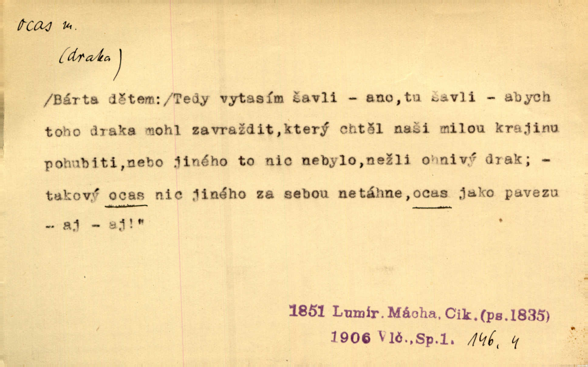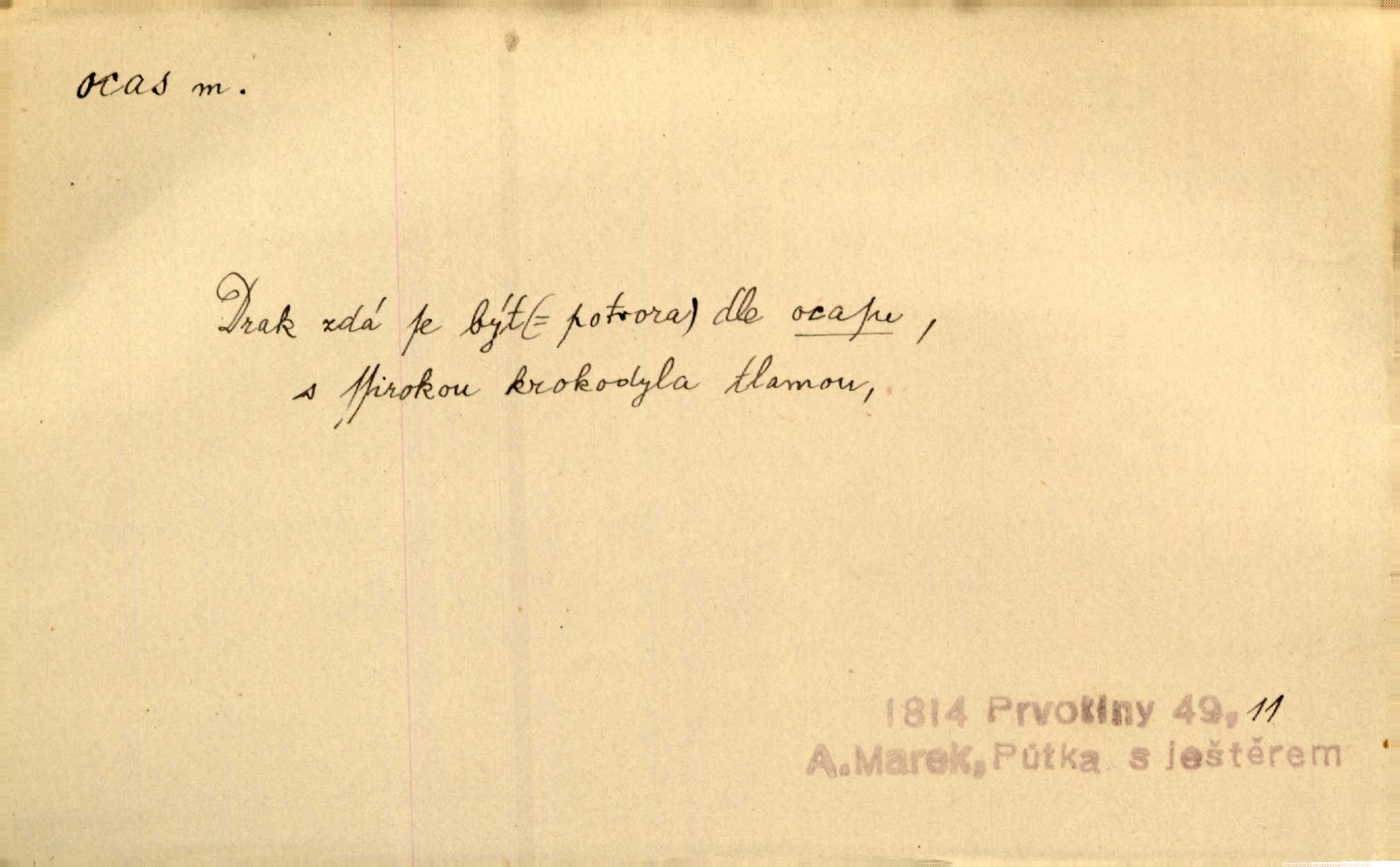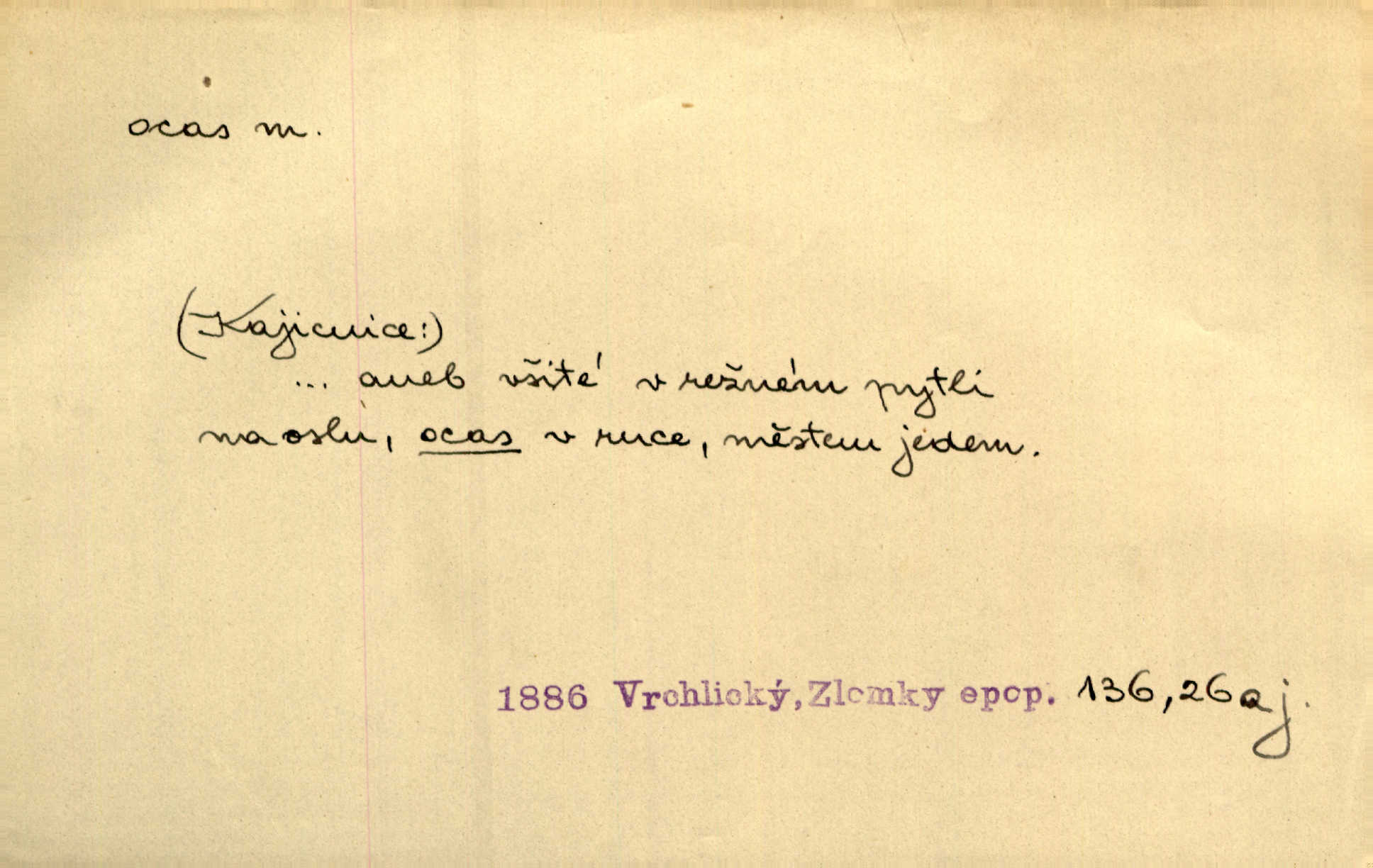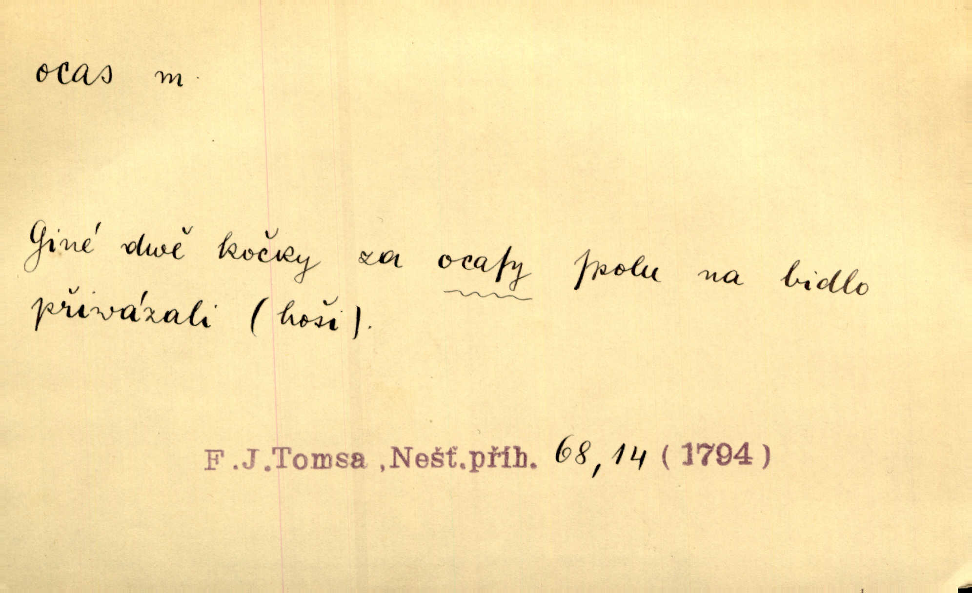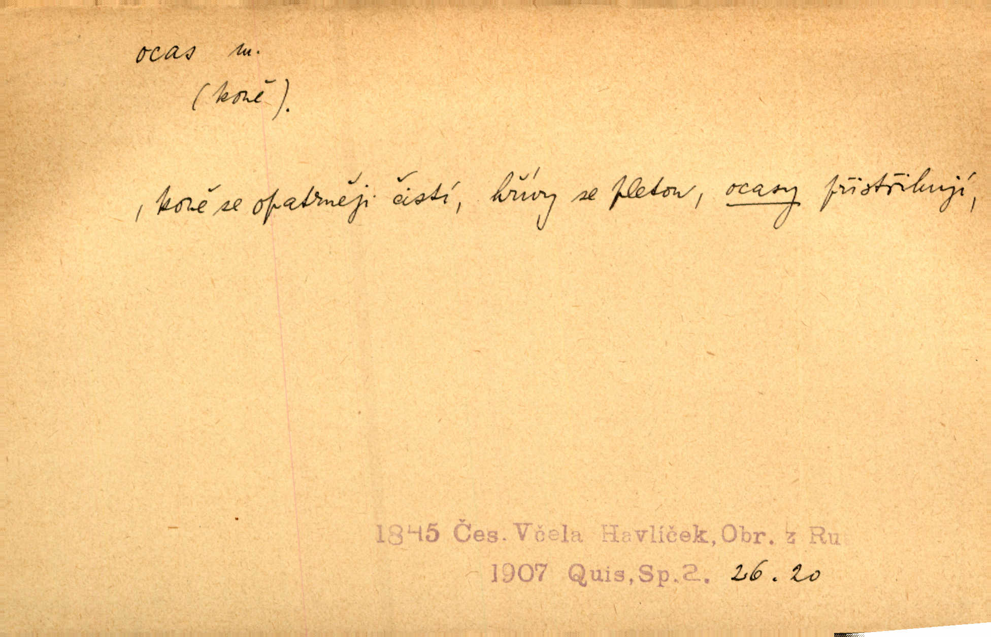 - ocas, -u m. nejzazší část těla obratlovců, tvořená obyčejně ocasními obratli; ohon, chvost. Unavenému koni i ocas těžek. Přísl. Bez zbraně jsi jak kobyla bez ocasu. Maj. [Kráva] zdvihla ocas a dala se do střečkování. Jir. Tak veliký ocas on [páv] nemá. V. Mrš. Ocasy jejich [některých ryb] připomínají barvou i tvarem květy tulipánů. Mach. Přivleče se had, na jehož ocase krásná víla sedí. Něm. Po polévce řízek hověziny, křehoučký „květový ocas“ s polévkovým křenem. Herrm. Ustál. sp. Co jste k nám do Klenčí přinesli [přistěhovalci] krom řemesla? Snadno by to straka na ocase unesla skoro nic. Baar. Říkáme, že panská láska není vyšší prahu a delší zaječího ocasu je krátká. Hol. Drahokoupil jen proto u staré paní Záhořanské omítá liščím ocasem, že peníze u ní čije úlisně se točí kolem ní. Šmil. Vrcholem taktického umění se jim [politickým kruhům] zdá uřezávati psovi ocas po kouskách dělati něco nepříjemného po částech. Přít. D zakončení komety, chvost. Táhnul se [pruh světelný] jako dlouhý plamenný ocas od komety. Mácha. D Arch. vlečka. Potom viděli jsme jakýsi palác plný princův a princezek majících dlouhé ocasy — na svých šatech rozumí se. Ritt. Po ženských ocasích se budou ďáblové vozit. Jir. D Expr. družina, průvod. Paní de Stainville také mívá celý ocas kavalírů za sebou. Ritt. D Expr. vůbec zakončení něčeho. Stálo [členstvo „Spolku přátel pokroku“] sešikováno v dlouhém hadu čtyřstupů, jehož ocas utvořili učedníci a jiní zvědaví lidé. Vrba. D Let. koncová část trupu letadla s ocasními plochami.