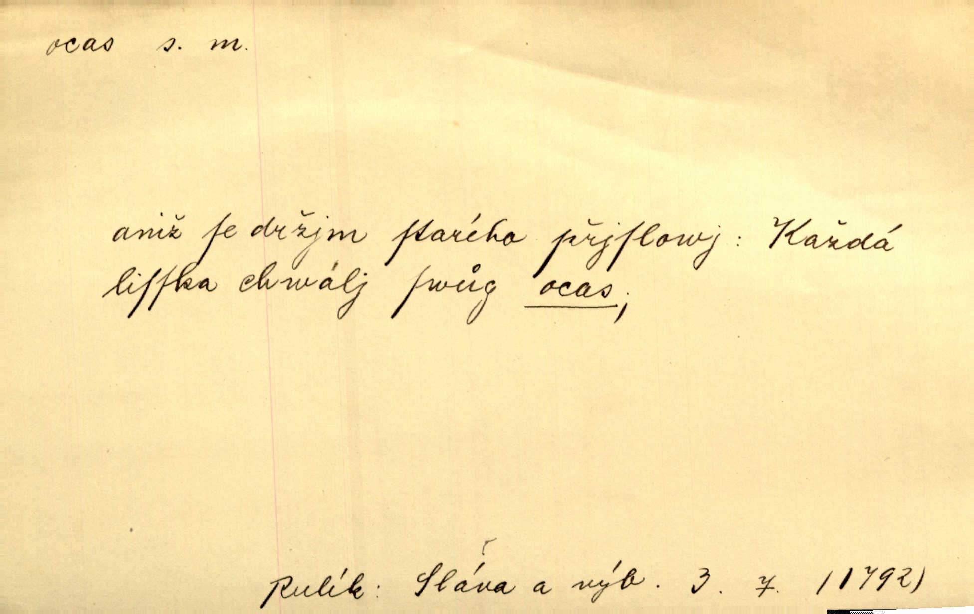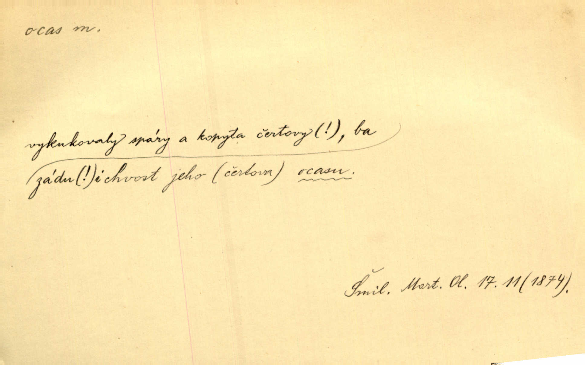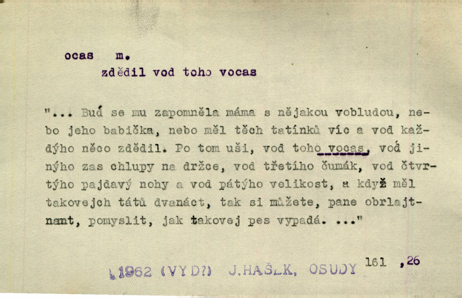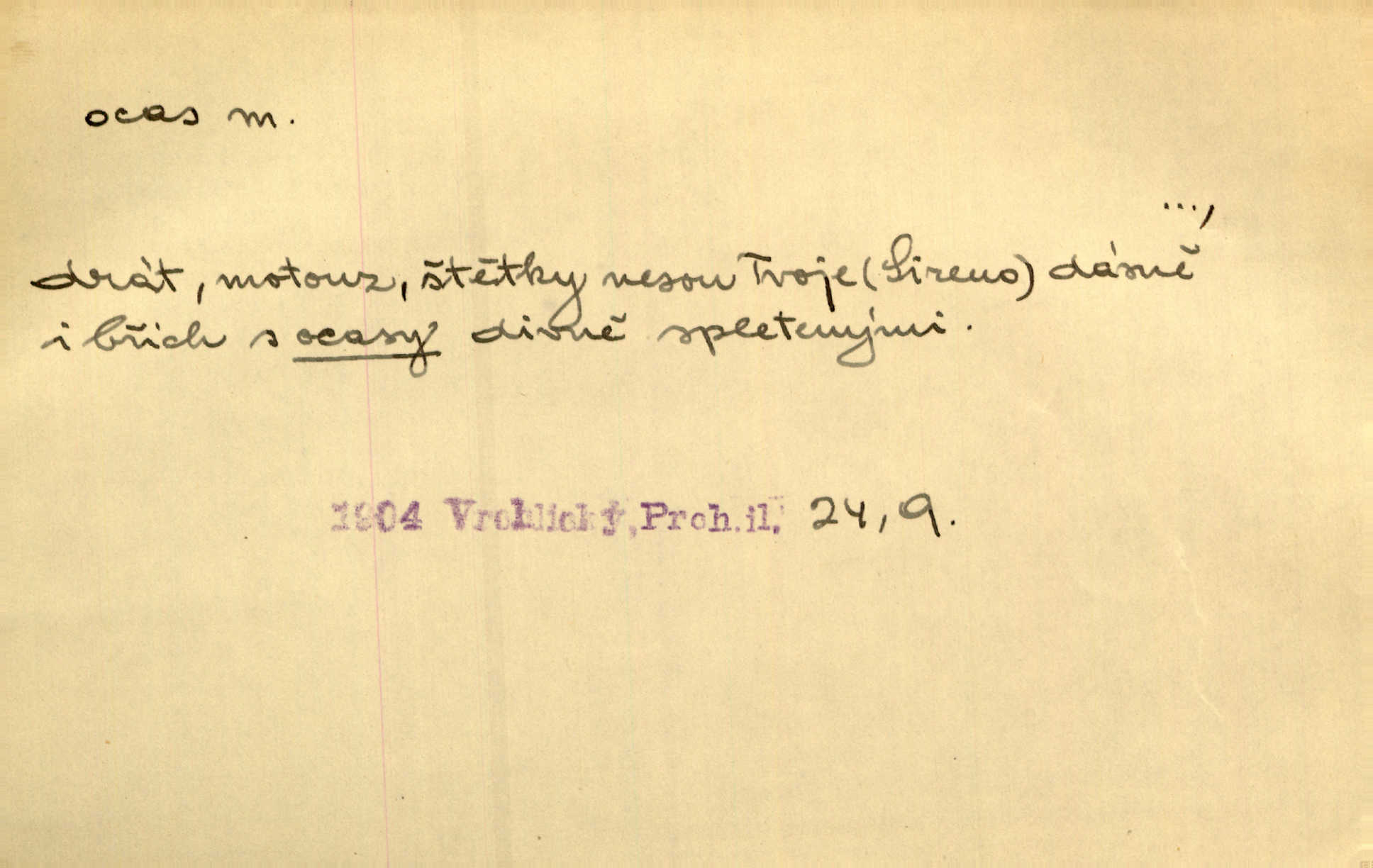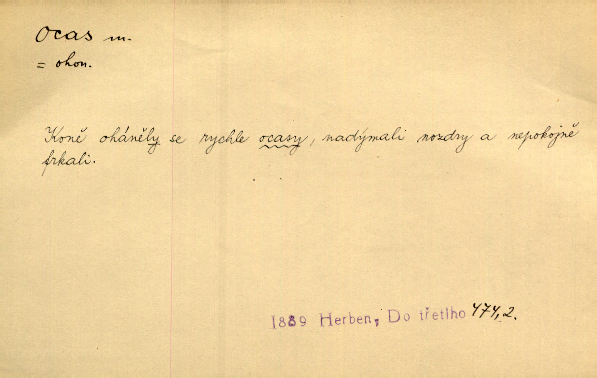 - ocas, -u m. nejzazší část těla obratlovců, tvořená obyčejně ocasními obratli; ohon, chvost. Unavenému koni i ocas těžek. Přísl. Bez zbraně jsi jak kobyla bez ocasu. Maj. [Kráva] zdvihla ocas a dala se do střečkování. Jir. Tak veliký ocas on [páv] nemá. V. Mrš. Ocasy jejich [některých ryb] připomínají barvou i tvarem květy tulipánů. Mach. Přivleče se had, na jehož ocase krásná víla sedí. Něm. Po polévce řízek hověziny, křehoučký „květový ocas“ s polévkovým křenem. Herrm. Ustál. sp. Co jste k nám do Klenčí přinesli [přistěhovalci] krom řemesla? Snadno by to straka na ocase unesla skoro nic. Baar. Říkáme, že panská láska není vyšší prahu a delší zaječího ocasu je krátká. Hol. Drahokoupil jen proto u staré paní Záhořanské omítá liščím ocasem, že peníze u ní čije úlisně se točí kolem ní. Šmil. Vrcholem taktického umění se jim [politickým kruhům] zdá uřezávati psovi ocas po kouskách dělati něco nepříjemného po částech. Přít. D zakončení komety, chvost. Táhnul se [pruh světelný] jako dlouhý plamenný ocas od komety. Mácha. D Arch. vlečka. Potom viděli jsme jakýsi palác plný princův a princezek majících dlouhé ocasy — na svých šatech rozumí se. Ritt. Po ženských ocasích se budou ďáblové vozit. Jir. D Expr. družina, průvod. Paní de Stainville také mívá celý ocas kavalírů za sebou. Ritt. D Expr. vůbec zakončení něčeho. Stálo [členstvo „Spolku přátel pokroku“] sešikováno v dlouhém hadu čtyřstupů, jehož ocas utvořili učedníci a jiní zvědaví lidé. Vrba. D Let. koncová část trupu letadla s ocasními plochami.