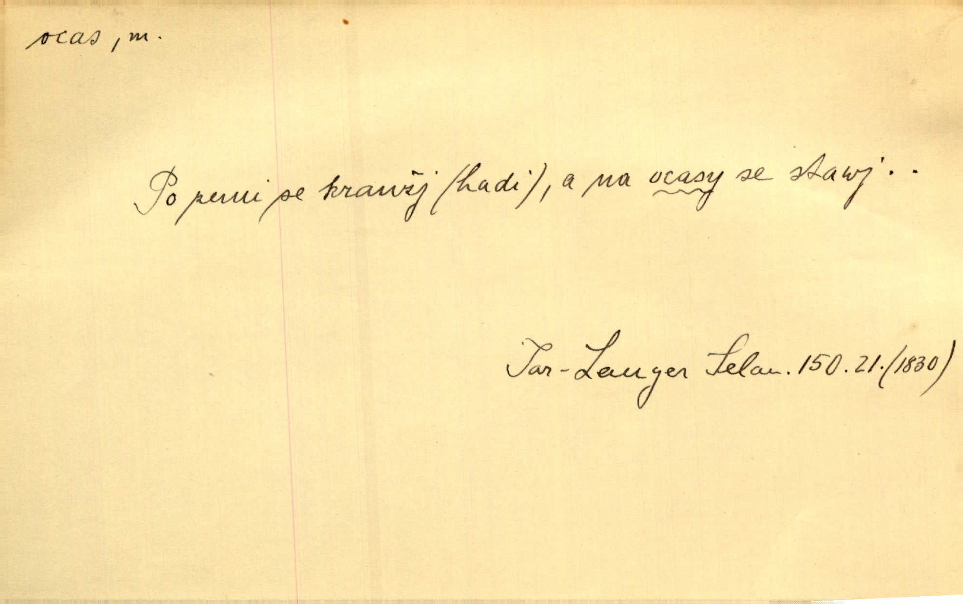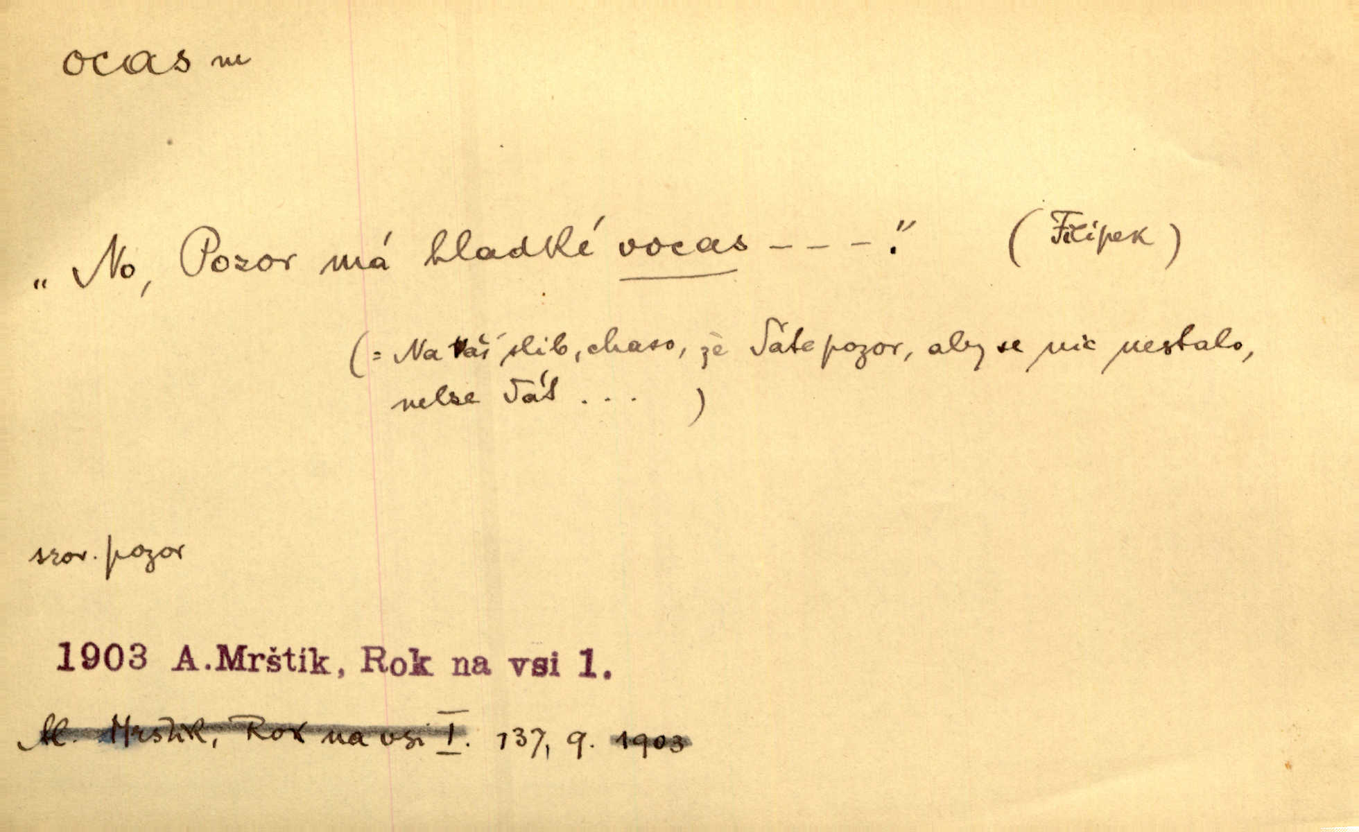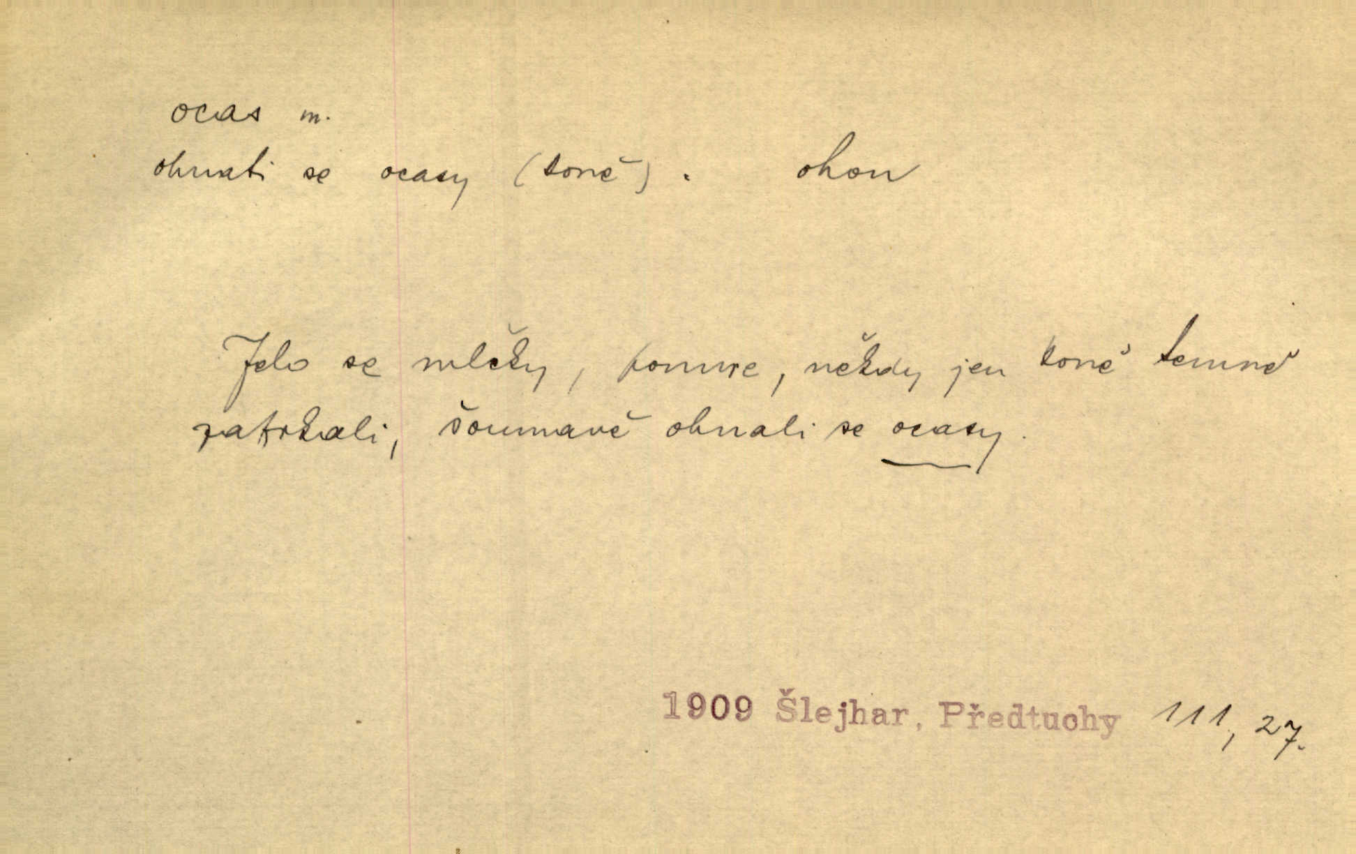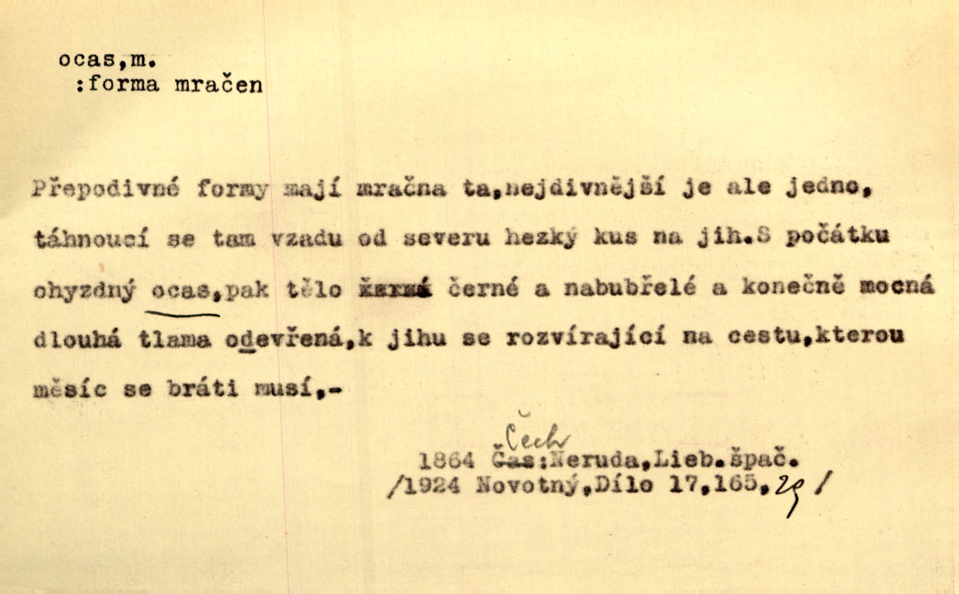 - ocas, -u m. nejzazší část těla obratlovců, tvořená obyčejně ocasními obratli; ohon, chvost. Unavenému koni i ocas těžek. Přísl. Bez zbraně jsi jak kobyla bez ocasu. Maj. [Kráva] zdvihla ocas a dala se do střečkování. Jir. Tak veliký ocas on [páv] nemá. V. Mrš. Ocasy jejich [některých ryb] připomínají barvou i tvarem květy tulipánů. Mach. Přivleče se had, na jehož ocase krásná víla sedí. Něm. Po polévce řízek hověziny, křehoučký „květový ocas“ s polévkovým křenem. Herrm. Ustál. sp. Co jste k nám do Klenčí přinesli [přistěhovalci] krom řemesla? Snadno by to straka na ocase unesla skoro nic. Baar. Říkáme, že panská láska není vyšší prahu a delší zaječího ocasu je krátká. Hol. Drahokoupil jen proto u staré paní Záhořanské omítá liščím ocasem, že peníze u ní čije úlisně se točí kolem ní. Šmil. Vrcholem taktického umění se jim [politickým kruhům] zdá uřezávati psovi ocas po kouskách dělati něco nepříjemného po částech. Přít. D zakončení komety, chvost. Táhnul se [pruh světelný] jako dlouhý plamenný ocas od komety. Mácha. D Arch. vlečka. Potom viděli jsme jakýsi palác plný princův a princezek majících dlouhé ocasy — na svých šatech rozumí se. Ritt. Po ženských ocasích se budou ďáblové vozit. Jir. D Expr. družina, průvod. Paní de Stainville také mívá celý ocas kavalírů za sebou. Ritt. D Expr. vůbec zakončení něčeho. Stálo [členstvo „Spolku přátel pokroku“] sešikováno v dlouhém hadu čtyřstupů, jehož ocas utvořili učedníci a jiní zvědaví lidé. Vrba. D Let. koncová část trupu letadla s ocasními plochami.