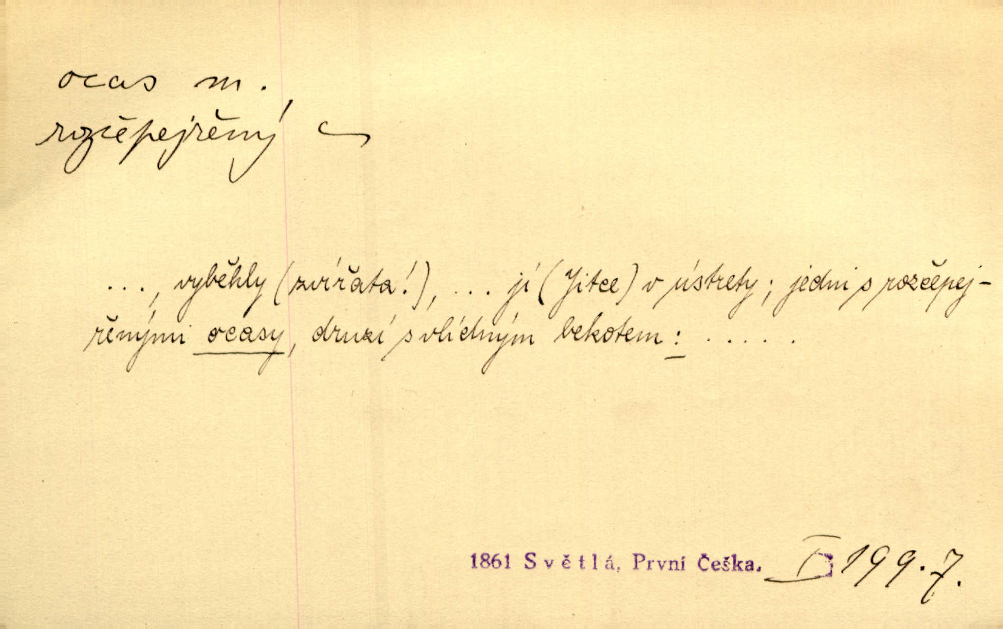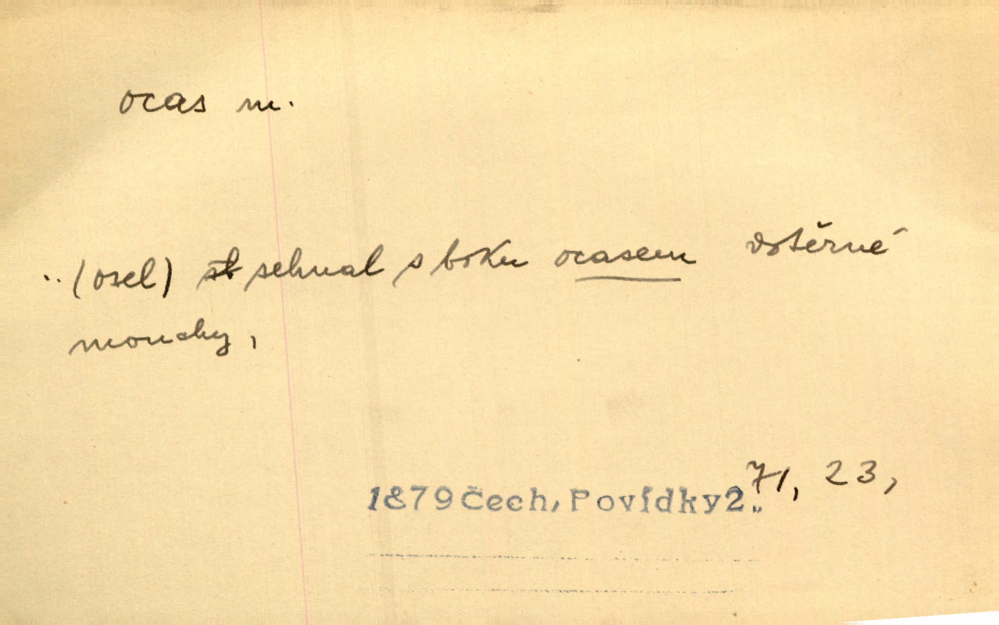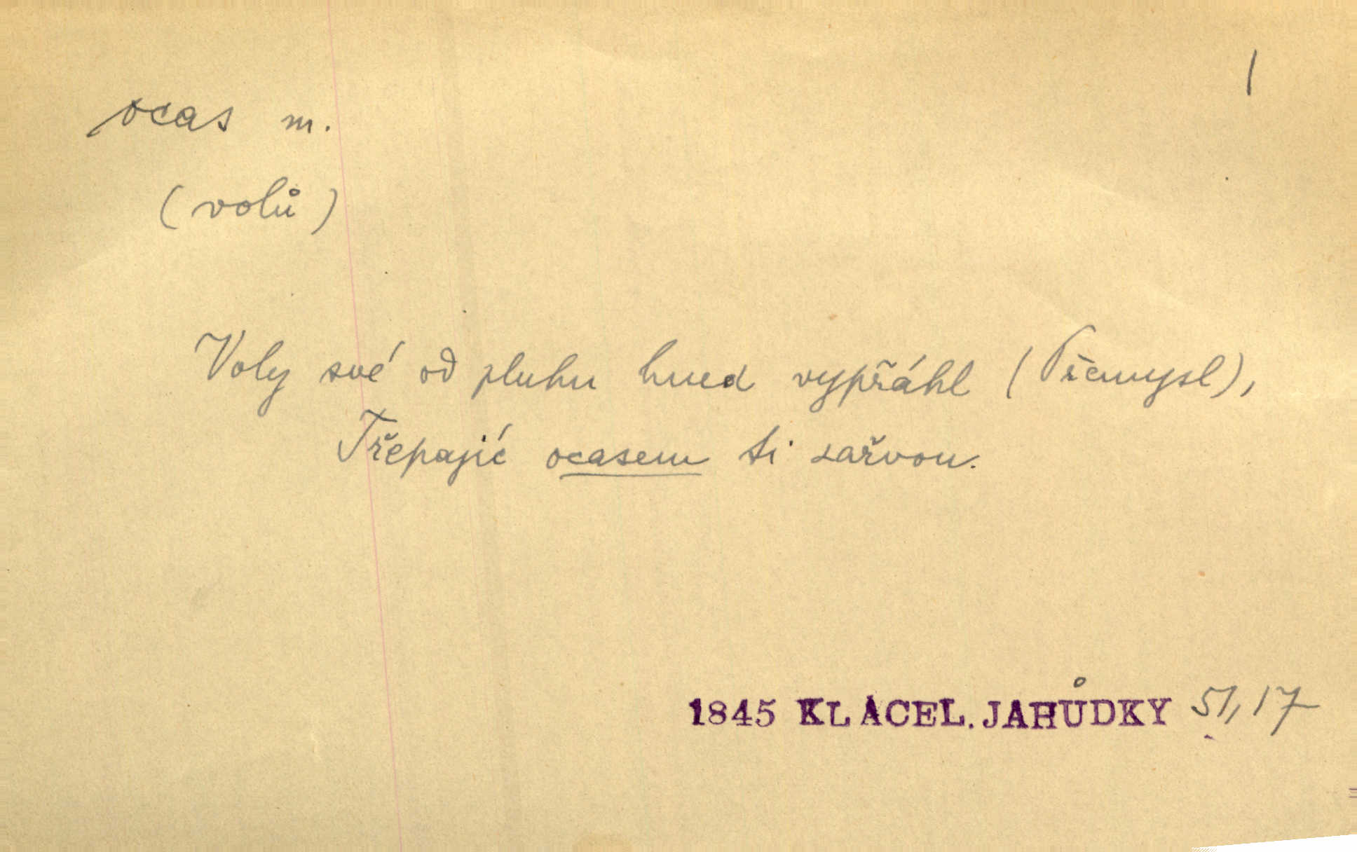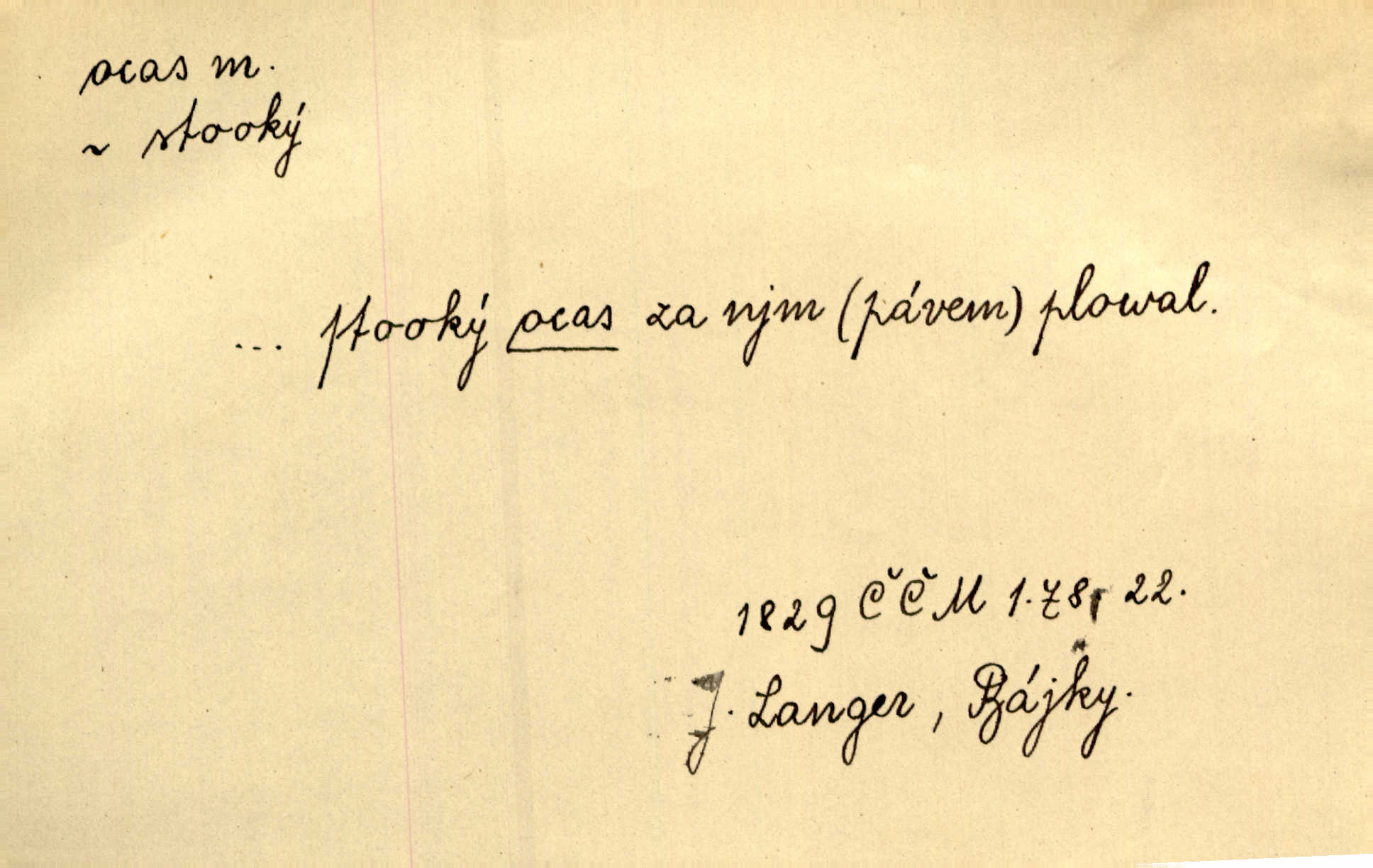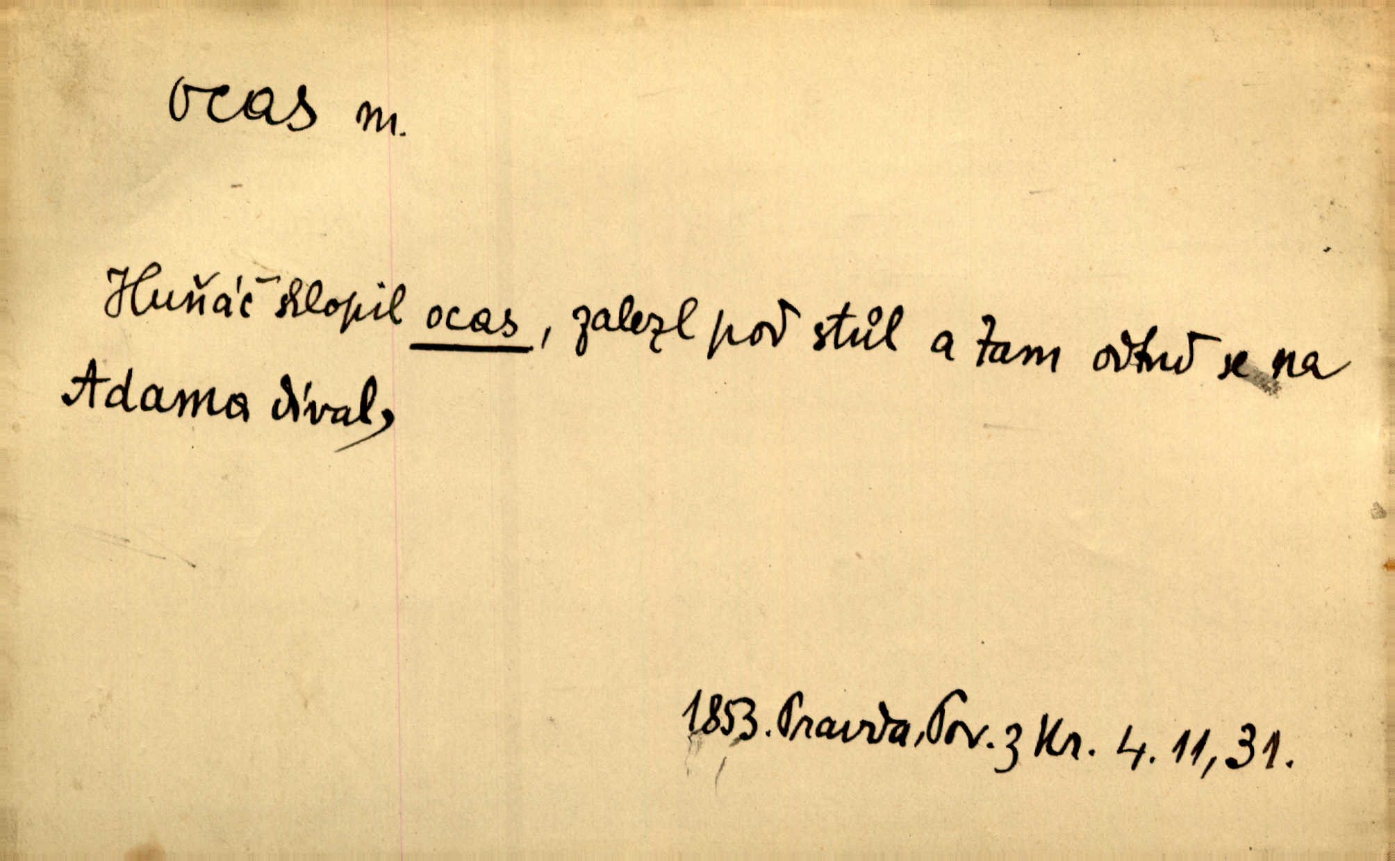 - ocas, -u m. nejzazší část těla obratlovců, tvořená obyčejně ocasními obratli; ohon, chvost. Unavenému koni i ocas těžek. Přísl. Bez zbraně jsi jak kobyla bez ocasu. Maj. [Kráva] zdvihla ocas a dala se do střečkování. Jir. Tak veliký ocas on [páv] nemá. V. Mrš. Ocasy jejich [některých ryb] připomínají barvou i tvarem květy tulipánů. Mach. Přivleče se had, na jehož ocase krásná víla sedí. Něm. Po polévce řízek hověziny, křehoučký „květový ocas“ s polévkovým křenem. Herrm. Ustál. sp. Co jste k nám do Klenčí přinesli [přistěhovalci] krom řemesla? Snadno by to straka na ocase unesla skoro nic. Baar. Říkáme, že panská láska není vyšší prahu a delší zaječího ocasu je krátká. Hol. Drahokoupil jen proto u staré paní Záhořanské omítá liščím ocasem, že peníze u ní čije úlisně se točí kolem ní. Šmil. Vrcholem taktického umění se jim [politickým kruhům] zdá uřezávati psovi ocas po kouskách dělati něco nepříjemného po částech. Přít. D zakončení komety, chvost. Táhnul se [pruh světelný] jako dlouhý plamenný ocas od komety. Mácha. D Arch. vlečka. Potom viděli jsme jakýsi palác plný princův a princezek majících dlouhé ocasy — na svých šatech rozumí se. Ritt. Po ženských ocasích se budou ďáblové vozit. Jir. D Expr. družina, průvod. Paní de Stainville také mívá celý ocas kavalírů za sebou. Ritt. D Expr. vůbec zakončení něčeho. Stálo [členstvo „Spolku přátel pokroku“] sešikováno v dlouhém hadu čtyřstupů, jehož ocas utvořili učedníci a jiní zvědaví lidé. Vrba. D Let. koncová část trupu letadla s ocasními plochami.