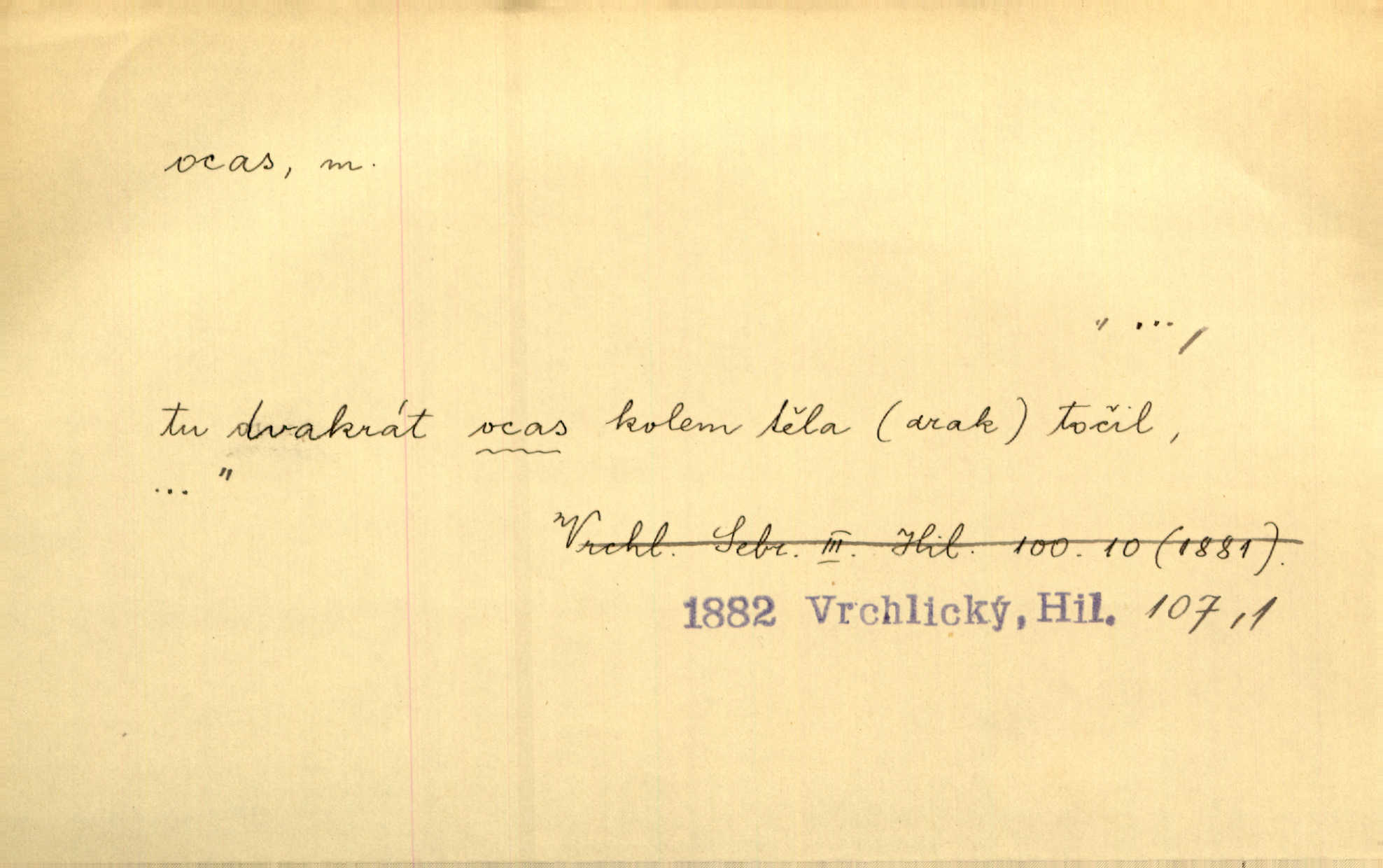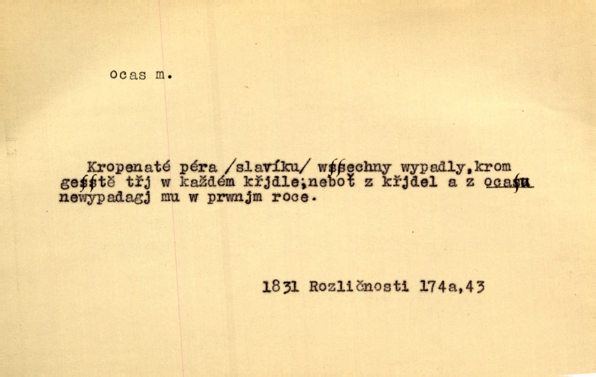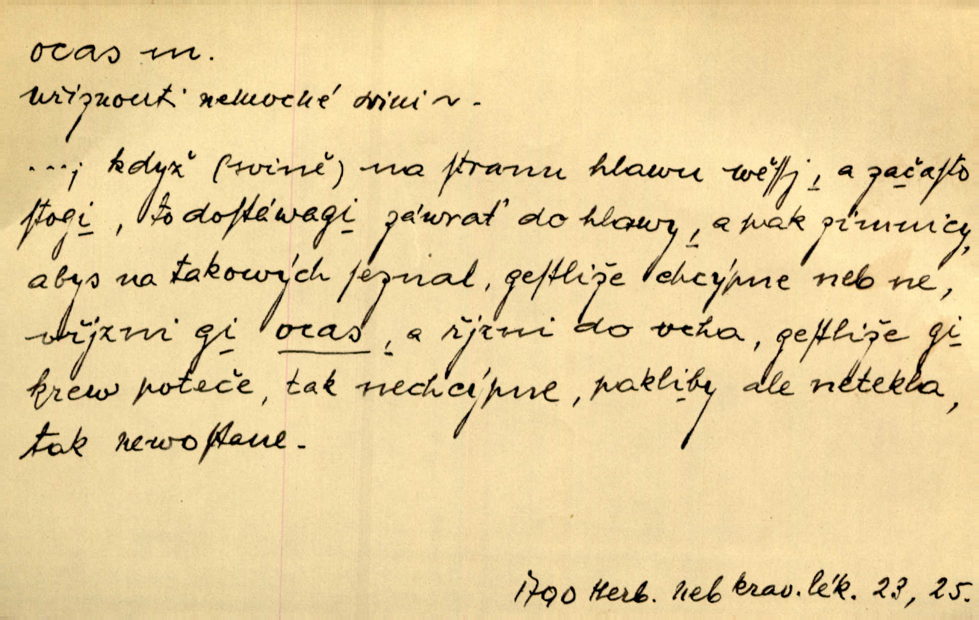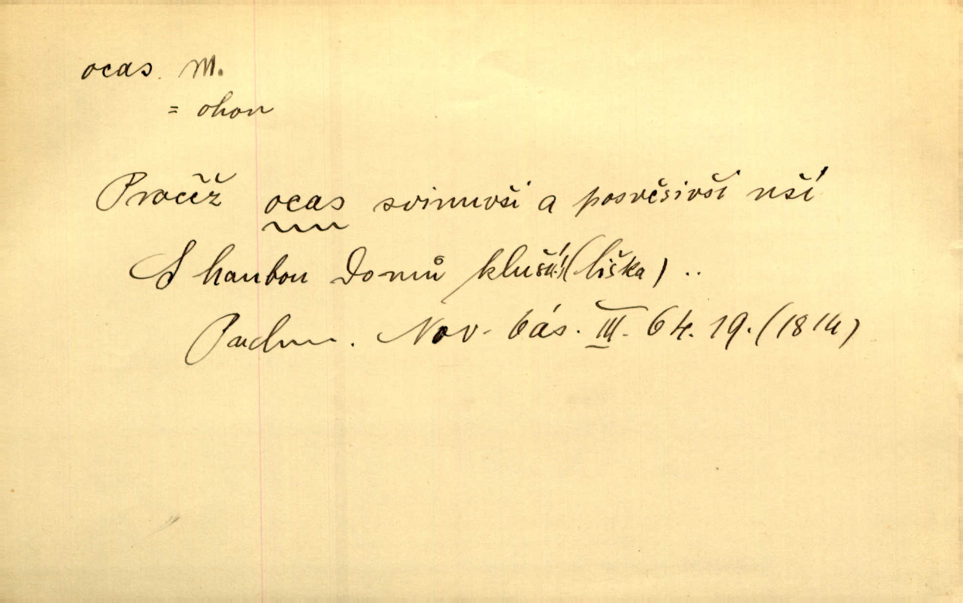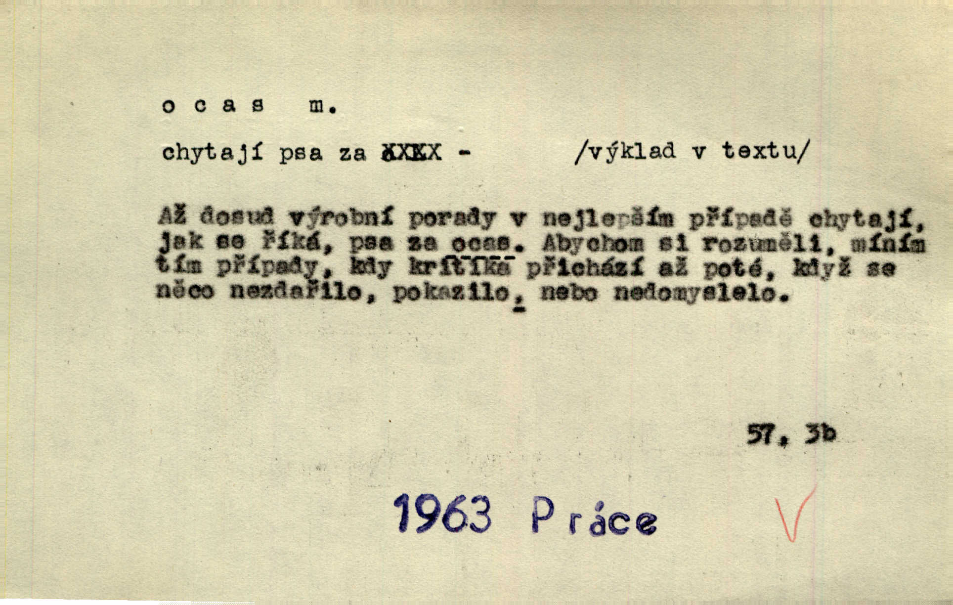 - ocas, -u m. nejzazší část těla obratlovců, tvořená obyčejně ocasními obratli; ohon, chvost. Unavenému koni i ocas těžek. Přísl. Bez zbraně jsi jak kobyla bez ocasu. Maj. [Kráva] zdvihla ocas a dala se do střečkování. Jir. Tak veliký ocas on [páv] nemá. V. Mrš. Ocasy jejich [některých ryb] připomínají barvou i tvarem květy tulipánů. Mach. Přivleče se had, na jehož ocase krásná víla sedí. Něm. Po polévce řízek hověziny, křehoučký „květový ocas“ s polévkovým křenem. Herrm. Ustál. sp. Co jste k nám do Klenčí přinesli [přistěhovalci] krom řemesla? Snadno by to straka na ocase unesla skoro nic. Baar. Říkáme, že panská láska není vyšší prahu a delší zaječího ocasu je krátká. Hol. Drahokoupil jen proto u staré paní Záhořanské omítá liščím ocasem, že peníze u ní čije úlisně se točí kolem ní. Šmil. Vrcholem taktického umění se jim [politickým kruhům] zdá uřezávati psovi ocas po kouskách dělati něco nepříjemného po částech. Přít. D zakončení komety, chvost. Táhnul se [pruh světelný] jako dlouhý plamenný ocas od komety. Mácha. D Arch. vlečka. Potom viděli jsme jakýsi palác plný princův a princezek majících dlouhé ocasy — na svých šatech rozumí se. Ritt. Po ženských ocasích se budou ďáblové vozit. Jir. D Expr. družina, průvod. Paní de Stainville také mívá celý ocas kavalírů za sebou. Ritt. D Expr. vůbec zakončení něčeho. Stálo [členstvo „Spolku přátel pokroku“] sešikováno v dlouhém hadu čtyřstupů, jehož ocas utvořili učedníci a jiní zvědaví lidé. Vrba. D Let. koncová část trupu letadla s ocasními plochami.