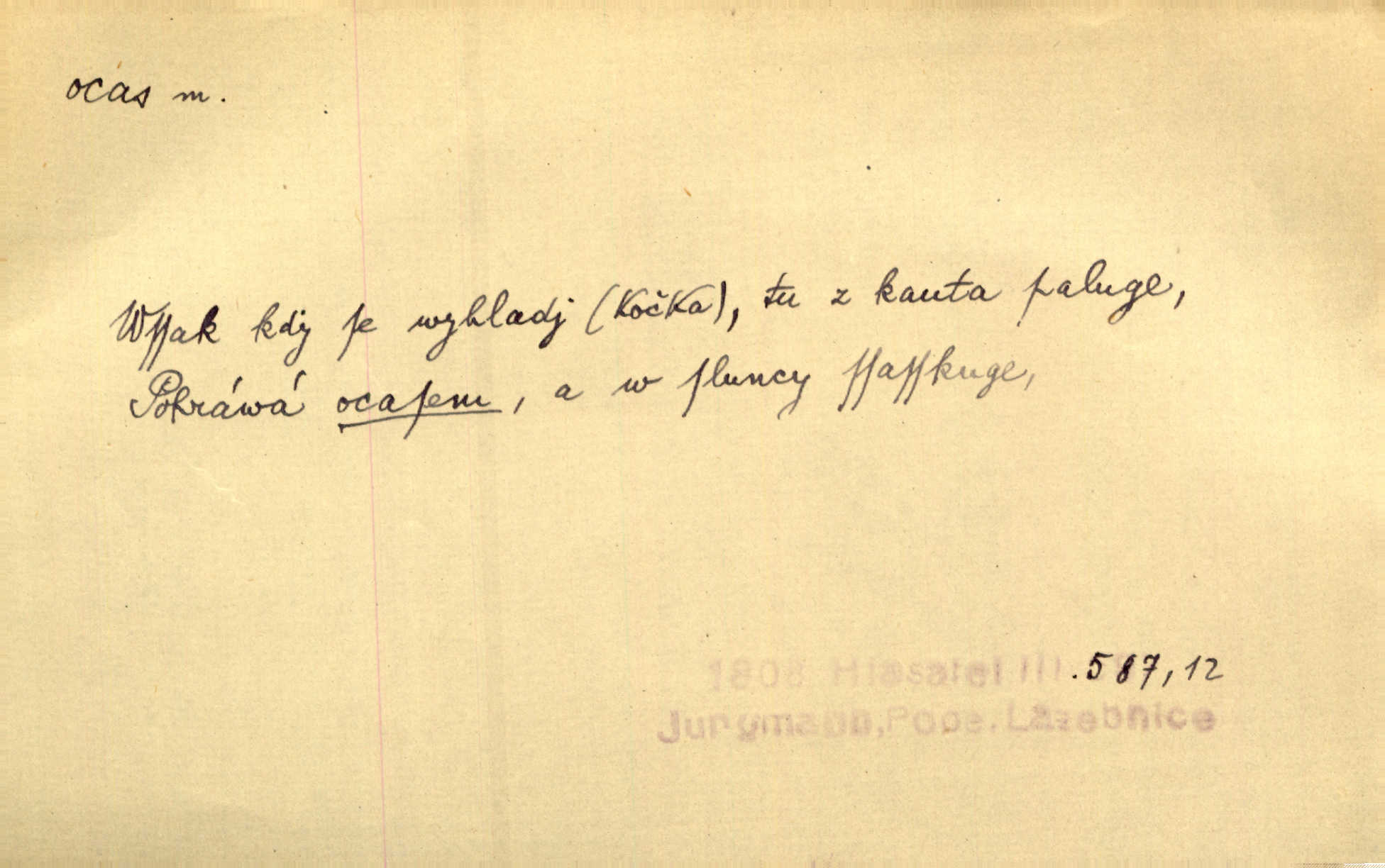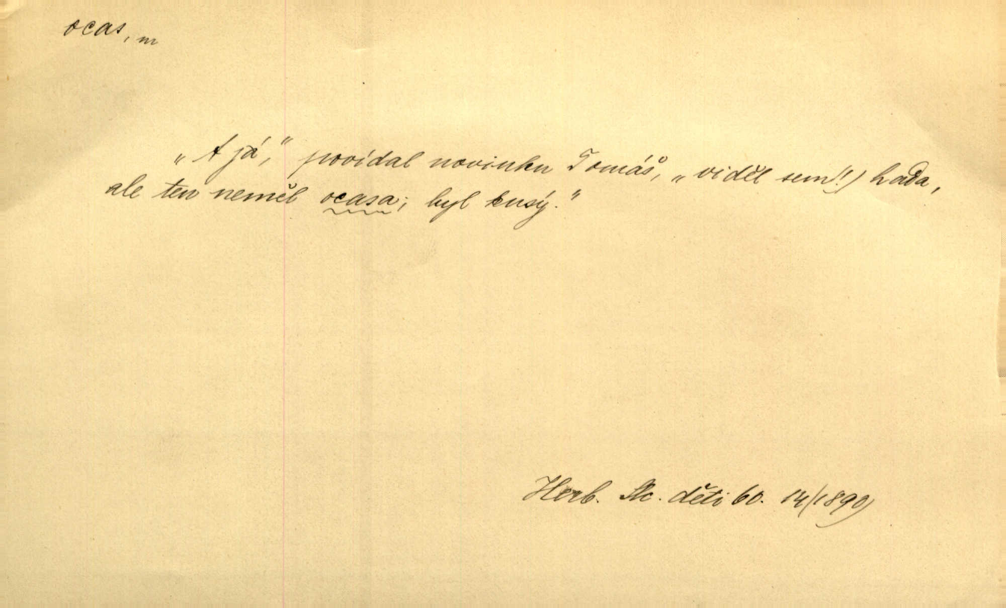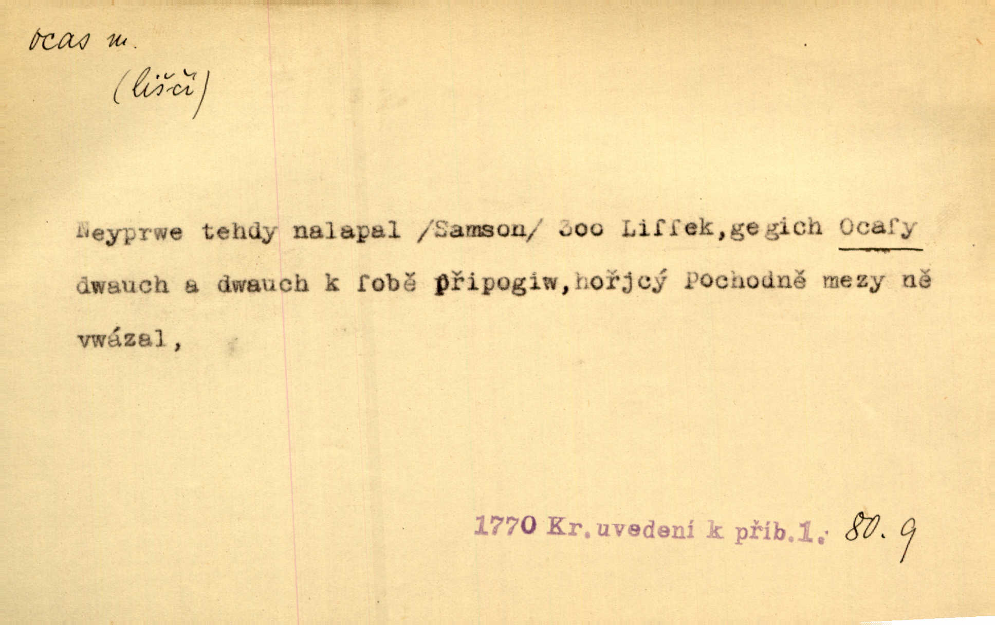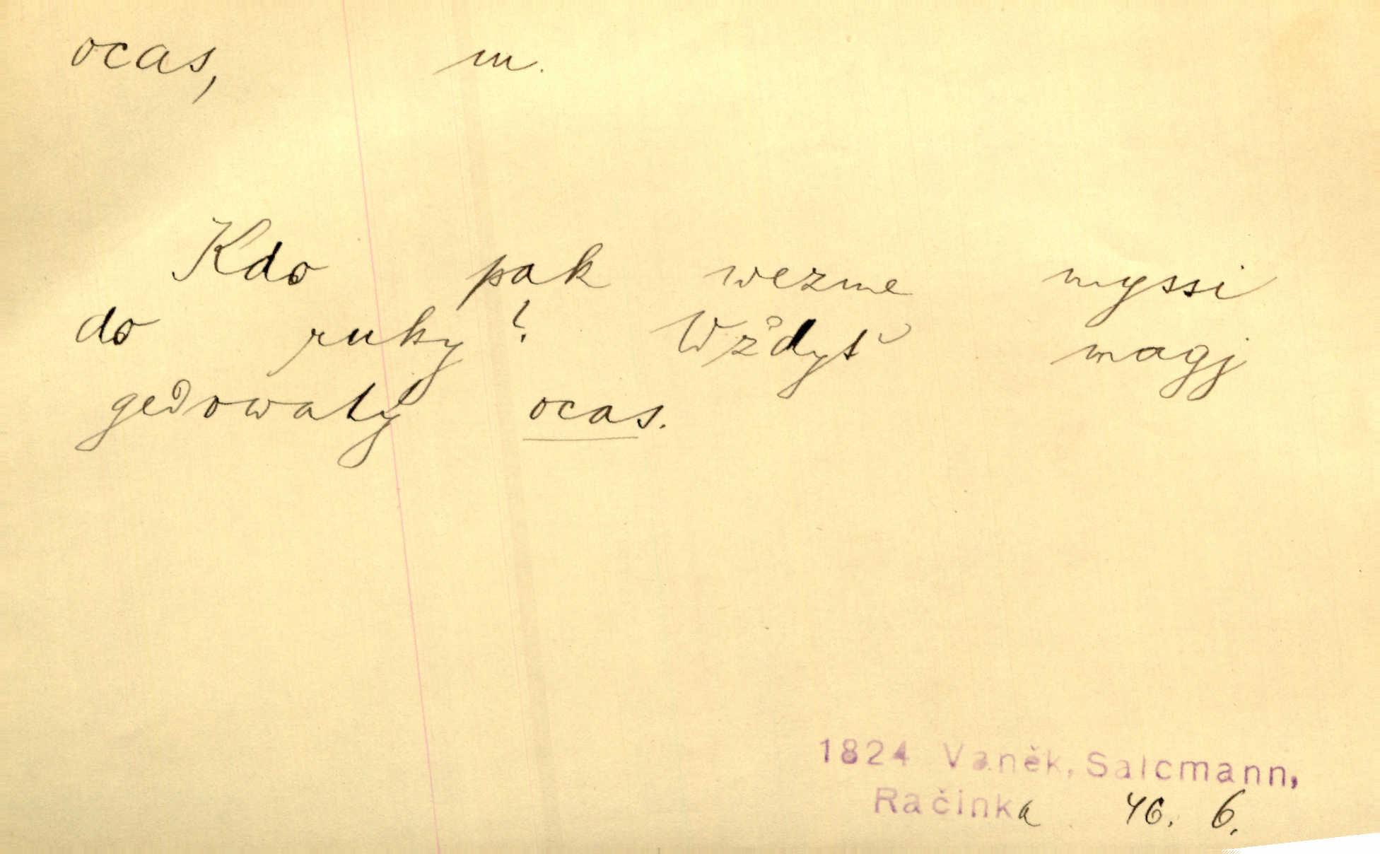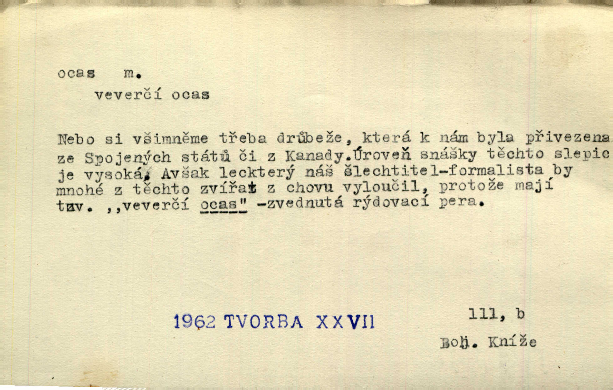 - ocas, -u m. nejzazší část těla obratlovců, tvořená obyčejně ocasními obratli; ohon, chvost. Unavenému koni i ocas těžek. Přísl. Bez zbraně jsi jak kobyla bez ocasu. Maj. [Kráva] zdvihla ocas a dala se do střečkování. Jir. Tak veliký ocas on [páv] nemá. V. Mrš. Ocasy jejich [některých ryb] připomínají barvou i tvarem květy tulipánů. Mach. Přivleče se had, na jehož ocase krásná víla sedí. Něm. Po polévce řízek hověziny, křehoučký „květový ocas“ s polévkovým křenem. Herrm. Ustál. sp. Co jste k nám do Klenčí přinesli [přistěhovalci] krom řemesla? Snadno by to straka na ocase unesla skoro nic. Baar. Říkáme, že panská láska není vyšší prahu a delší zaječího ocasu je krátká. Hol. Drahokoupil jen proto u staré paní Záhořanské omítá liščím ocasem, že peníze u ní čije úlisně se točí kolem ní. Šmil. Vrcholem taktického umění se jim [politickým kruhům] zdá uřezávati psovi ocas po kouskách dělati něco nepříjemného po částech. Přít. D zakončení komety, chvost. Táhnul se [pruh světelný] jako dlouhý plamenný ocas od komety. Mácha. D Arch. vlečka. Potom viděli jsme jakýsi palác plný princův a princezek majících dlouhé ocasy — na svých šatech rozumí se. Ritt. Po ženských ocasích se budou ďáblové vozit. Jir. D Expr. družina, průvod. Paní de Stainville také mívá celý ocas kavalírů za sebou. Ritt. D Expr. vůbec zakončení něčeho. Stálo [členstvo „Spolku přátel pokroku“] sešikováno v dlouhém hadu čtyřstupů, jehož ocas utvořili učedníci a jiní zvědaví lidé. Vrba. D Let. koncová část trupu letadla s ocasními plochami.