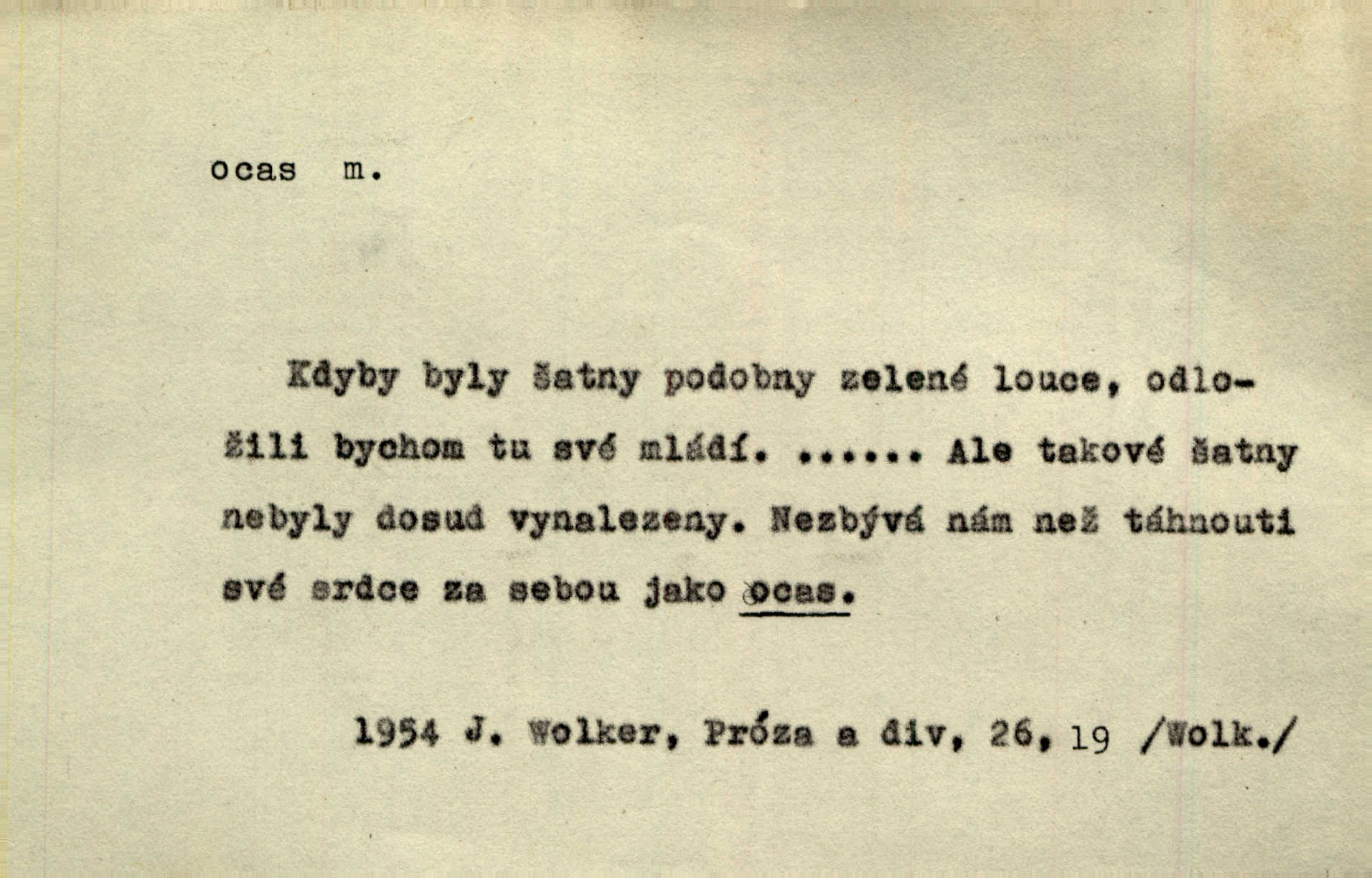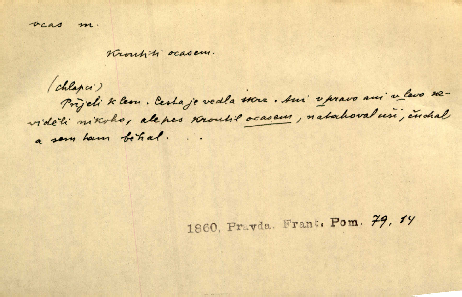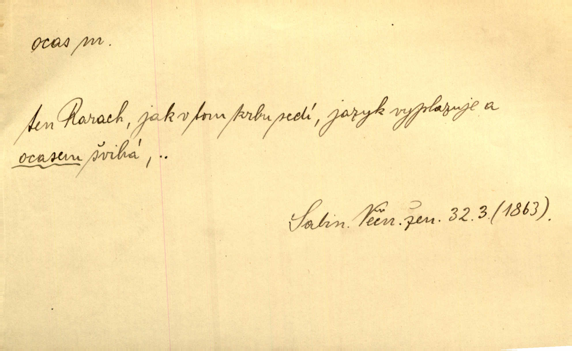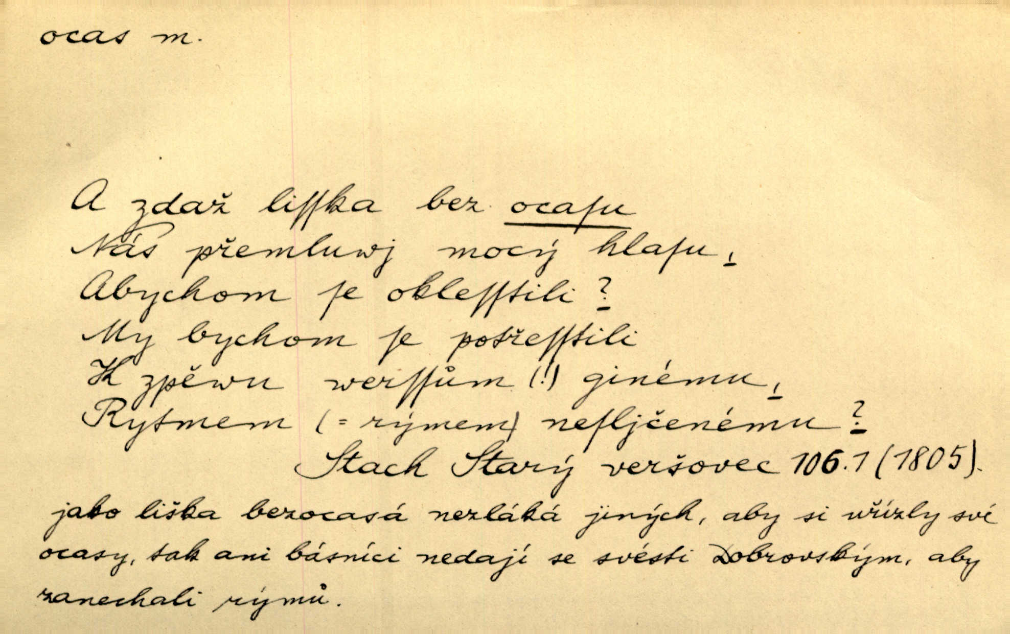 - ocas, -u m. nejzazší část těla obratlovců, tvořená obyčejně ocasními obratli; ohon, chvost. Unavenému koni i ocas těžek. Přísl. Bez zbraně jsi jak kobyla bez ocasu. Maj. [Kráva] zdvihla ocas a dala se do střečkování. Jir. Tak veliký ocas on [páv] nemá. V. Mrš. Ocasy jejich [některých ryb] připomínají barvou i tvarem květy tulipánů. Mach. Přivleče se had, na jehož ocase krásná víla sedí. Něm. Po polévce řízek hověziny, křehoučký „květový ocas“ s polévkovým křenem. Herrm. Ustál. sp. Co jste k nám do Klenčí přinesli [přistěhovalci] krom řemesla? Snadno by to straka na ocase unesla skoro nic. Baar. Říkáme, že panská láska není vyšší prahu a delší zaječího ocasu je krátká. Hol. Drahokoupil jen proto u staré paní Záhořanské omítá liščím ocasem, že peníze u ní čije úlisně se točí kolem ní. Šmil. Vrcholem taktického umění se jim [politickým kruhům] zdá uřezávati psovi ocas po kouskách dělati něco nepříjemného po částech. Přít. D zakončení komety, chvost. Táhnul se [pruh světelný] jako dlouhý plamenný ocas od komety. Mácha. D Arch. vlečka. Potom viděli jsme jakýsi palác plný princův a princezek majících dlouhé ocasy — na svých šatech rozumí se. Ritt. Po ženských ocasích se budou ďáblové vozit. Jir. D Expr. družina, průvod. Paní de Stainville také mívá celý ocas kavalírů za sebou. Ritt. D Expr. vůbec zakončení něčeho. Stálo [členstvo „Spolku přátel pokroku“] sešikováno v dlouhém hadu čtyřstupů, jehož ocas utvořili učedníci a jiní zvědaví lidé. Vrba. D Let. koncová část trupu letadla s ocasními plochami.