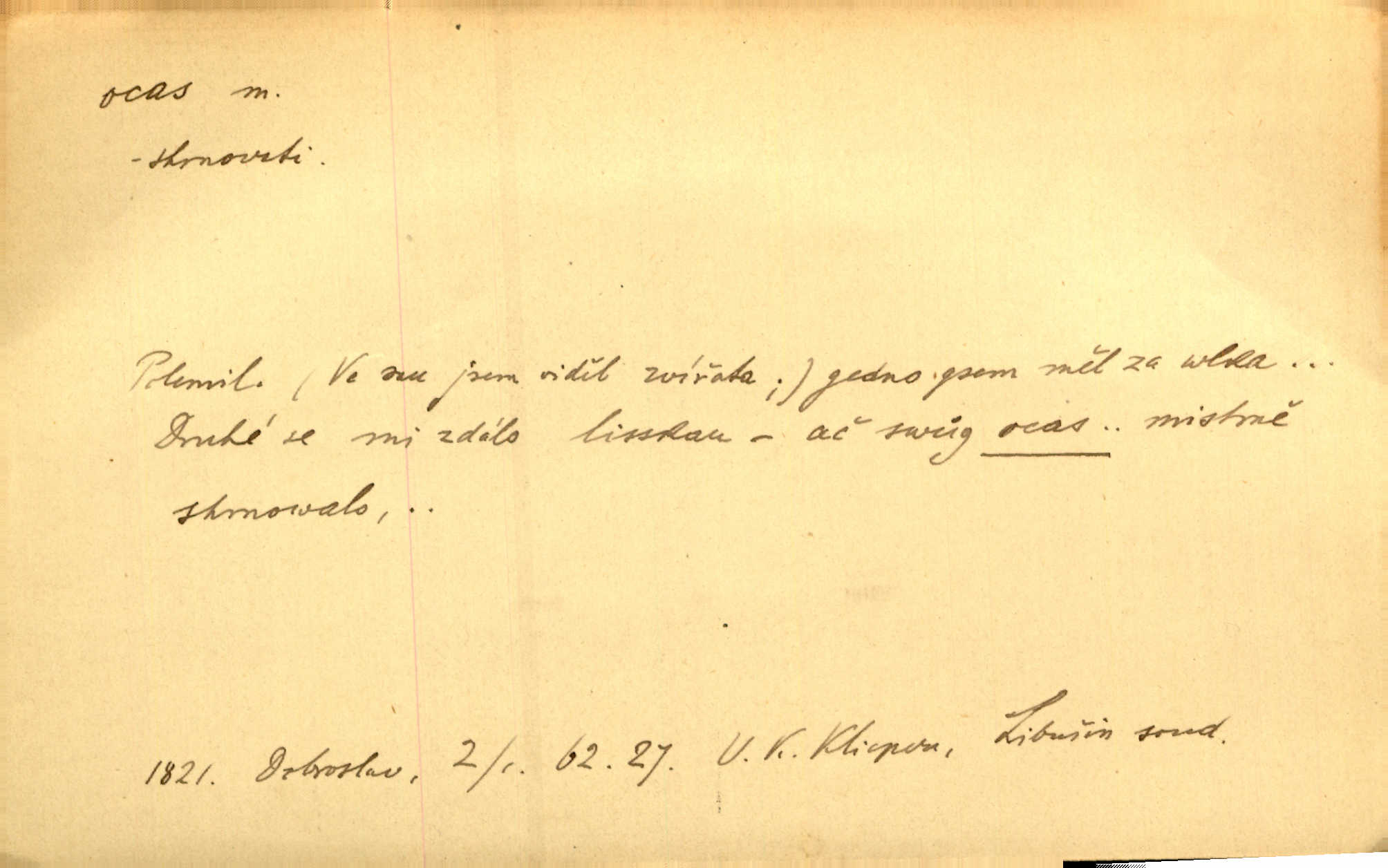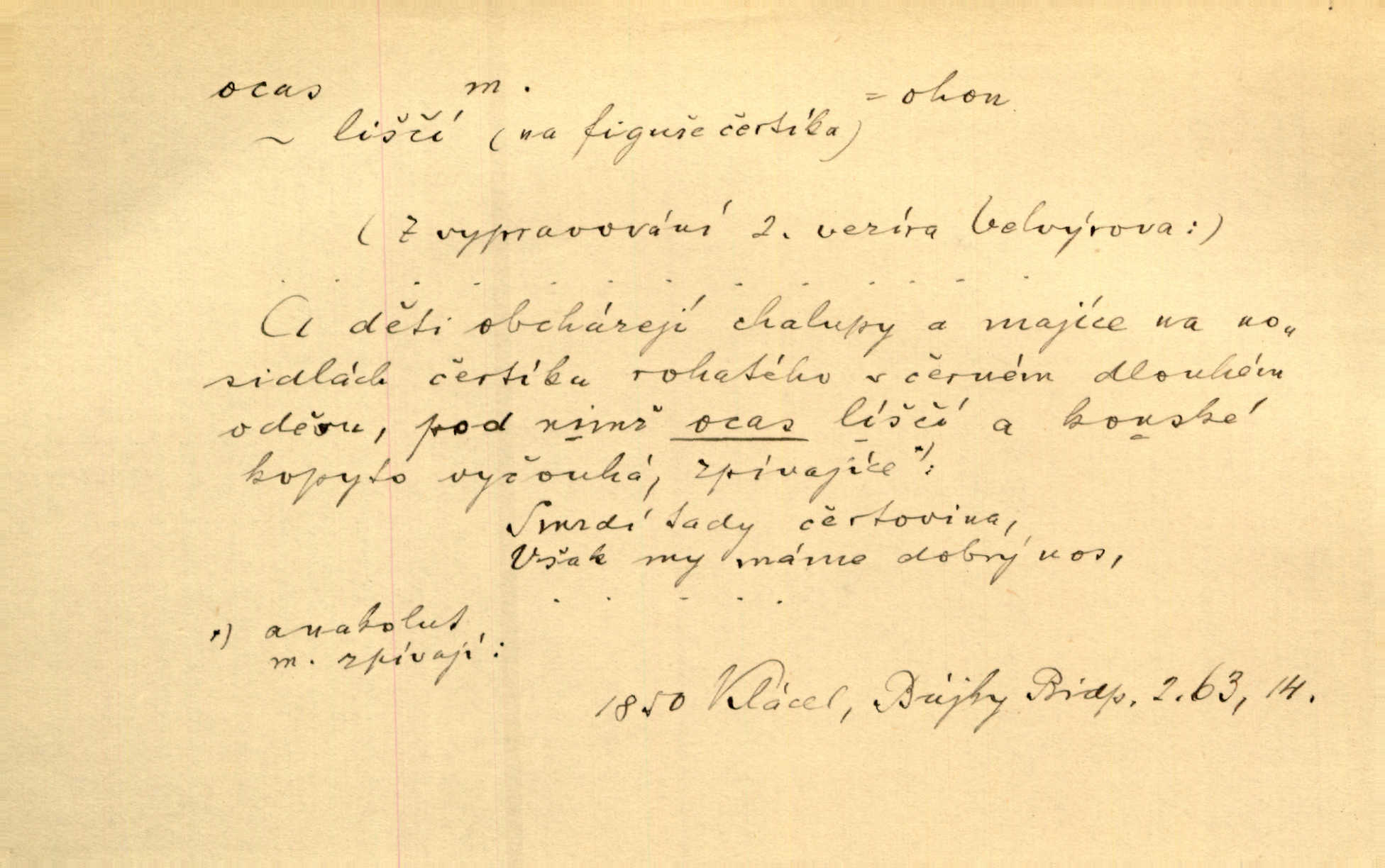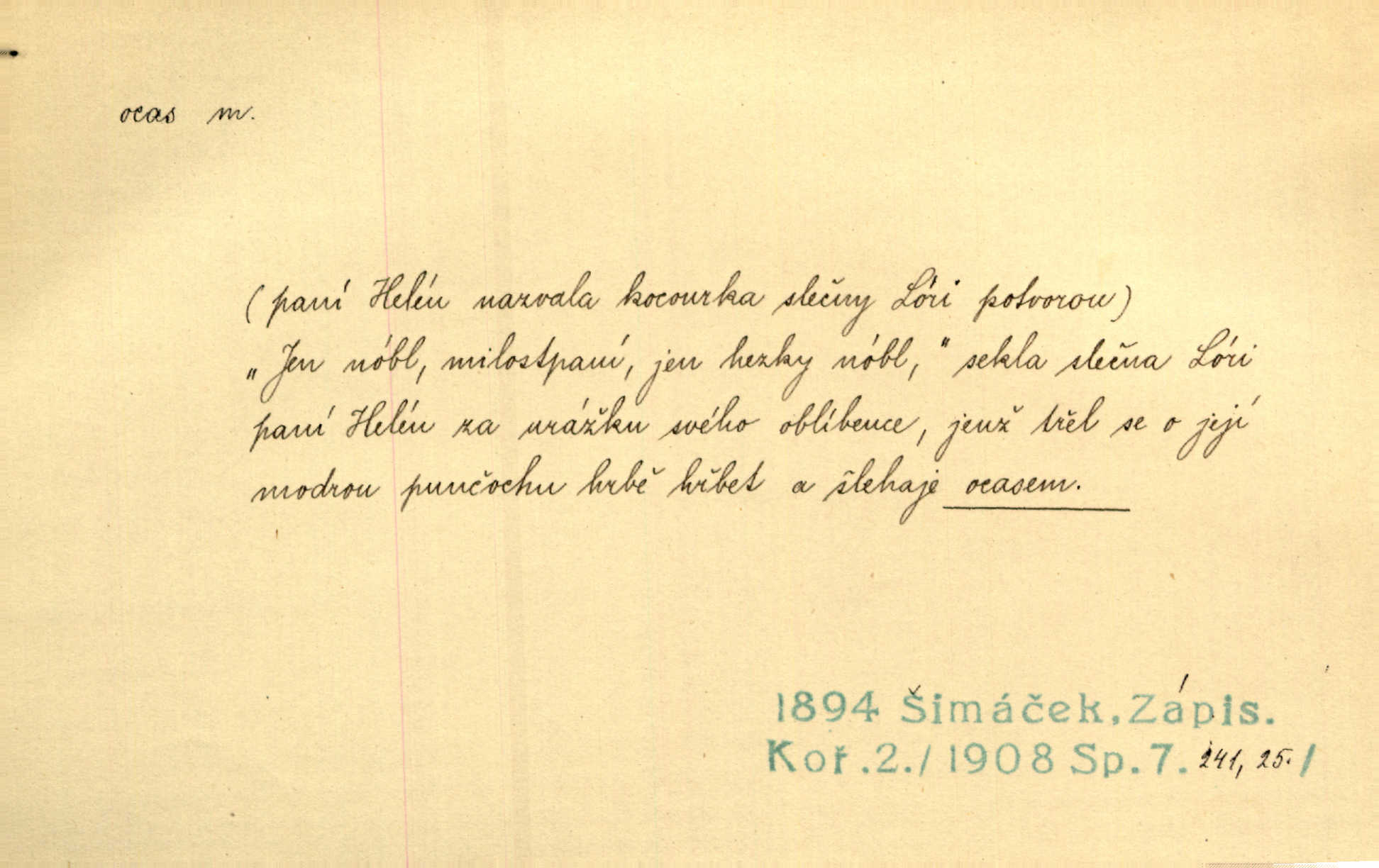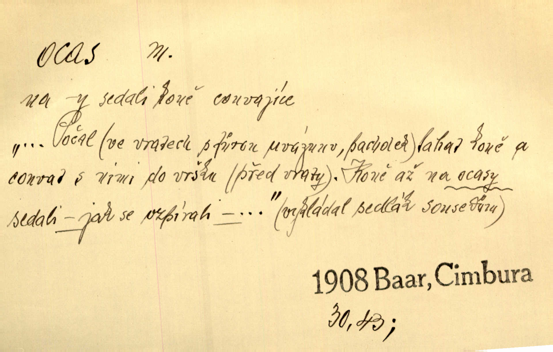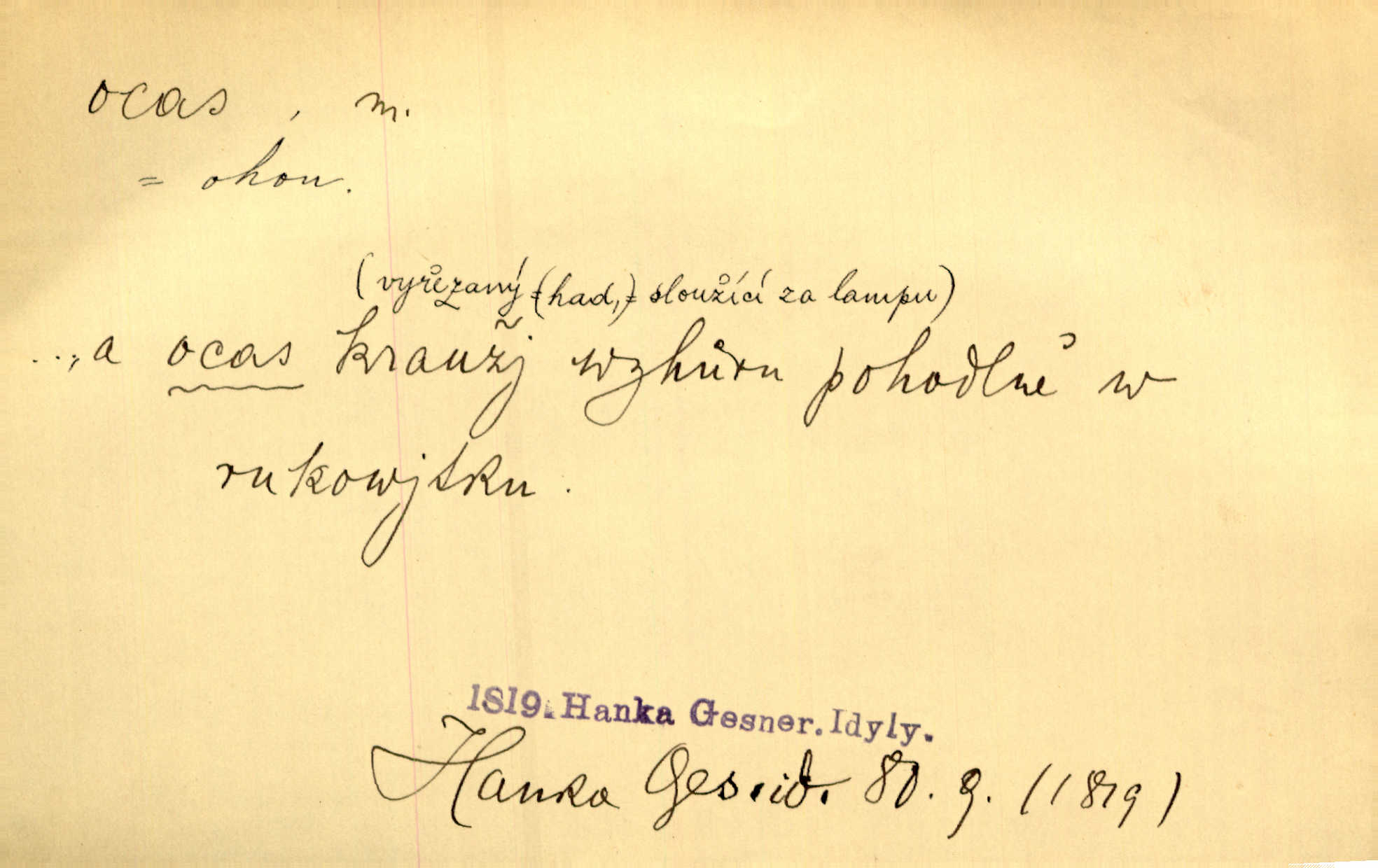 - ocas, -u m. nejzazší část těla obratlovců, tvořená obyčejně ocasními obratli; ohon, chvost. Unavenému koni i ocas těžek. Přísl. Bez zbraně jsi jak kobyla bez ocasu. Maj. [Kráva] zdvihla ocas a dala se do střečkování. Jir. Tak veliký ocas on [páv] nemá. V. Mrš. Ocasy jejich [některých ryb] připomínají barvou i tvarem květy tulipánů. Mach. Přivleče se had, na jehož ocase krásná víla sedí. Něm. Po polévce řízek hověziny, křehoučký „květový ocas“ s polévkovým křenem. Herrm. Ustál. sp. Co jste k nám do Klenčí přinesli [přistěhovalci] krom řemesla? Snadno by to straka na ocase unesla skoro nic. Baar. Říkáme, že panská láska není vyšší prahu a delší zaječího ocasu je krátká. Hol. Drahokoupil jen proto u staré paní Záhořanské omítá liščím ocasem, že peníze u ní čije úlisně se točí kolem ní. Šmil. Vrcholem taktického umění se jim [politickým kruhům] zdá uřezávati psovi ocas po kouskách dělati něco nepříjemného po částech. Přít. D zakončení komety, chvost. Táhnul se [pruh světelný] jako dlouhý plamenný ocas od komety. Mácha. D Arch. vlečka. Potom viděli jsme jakýsi palác plný princův a princezek majících dlouhé ocasy — na svých šatech rozumí se. Ritt. Po ženských ocasích se budou ďáblové vozit. Jir. D Expr. družina, průvod. Paní de Stainville také mívá celý ocas kavalírů za sebou. Ritt. D Expr. vůbec zakončení něčeho. Stálo [členstvo „Spolku přátel pokroku“] sešikováno v dlouhém hadu čtyřstupů, jehož ocas utvořili učedníci a jiní zvědaví lidé. Vrba. D Let. koncová část trupu letadla s ocasními plochami.