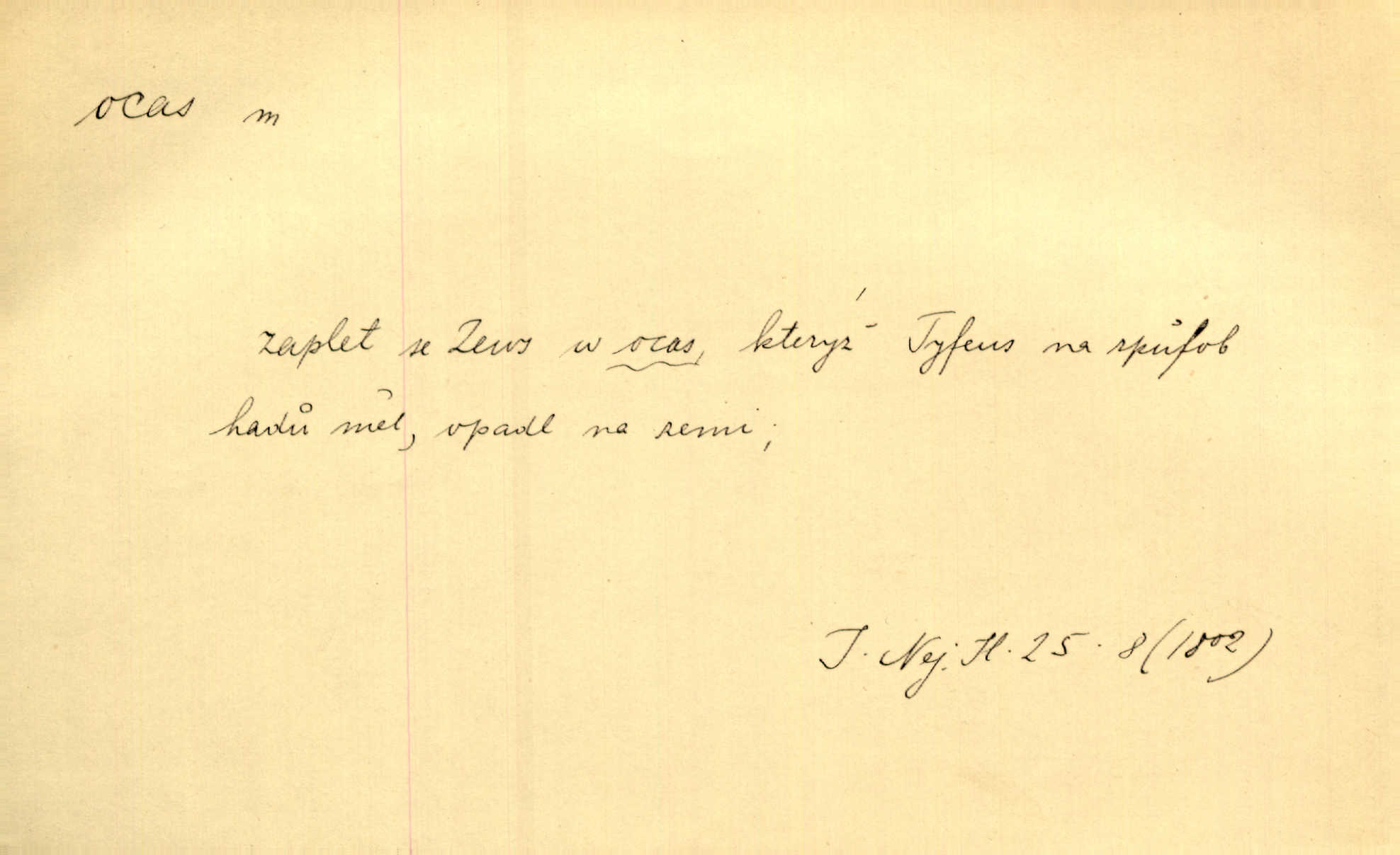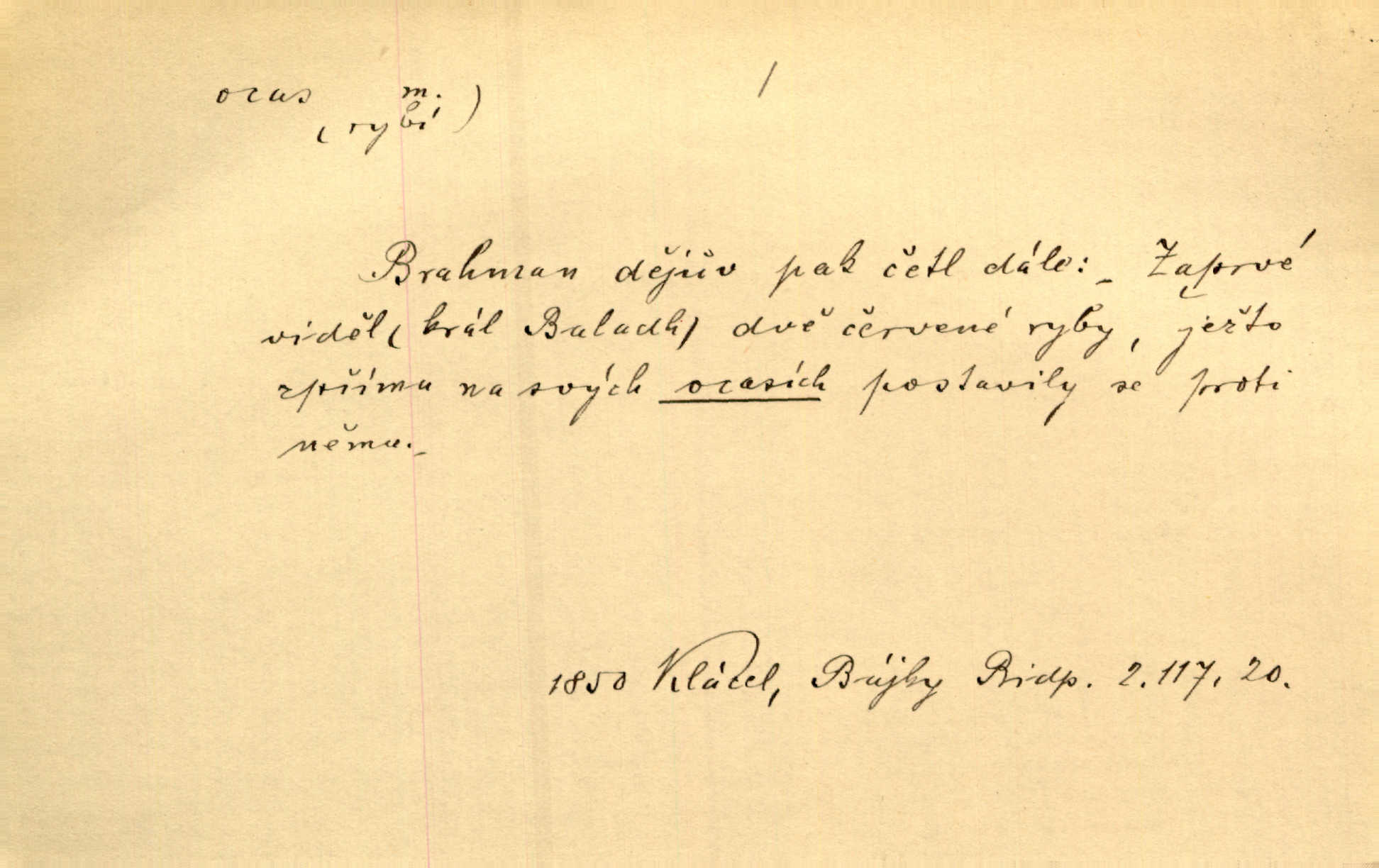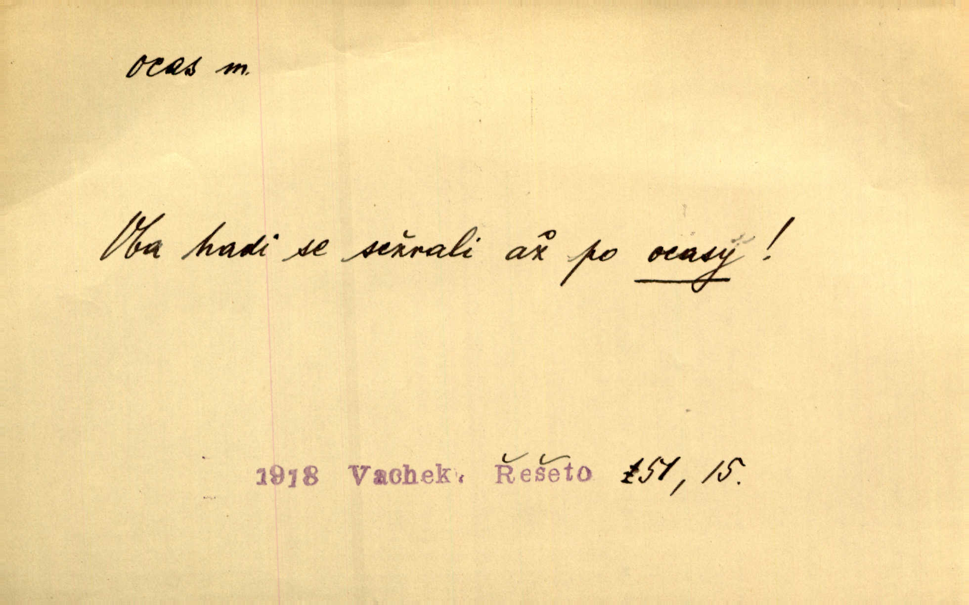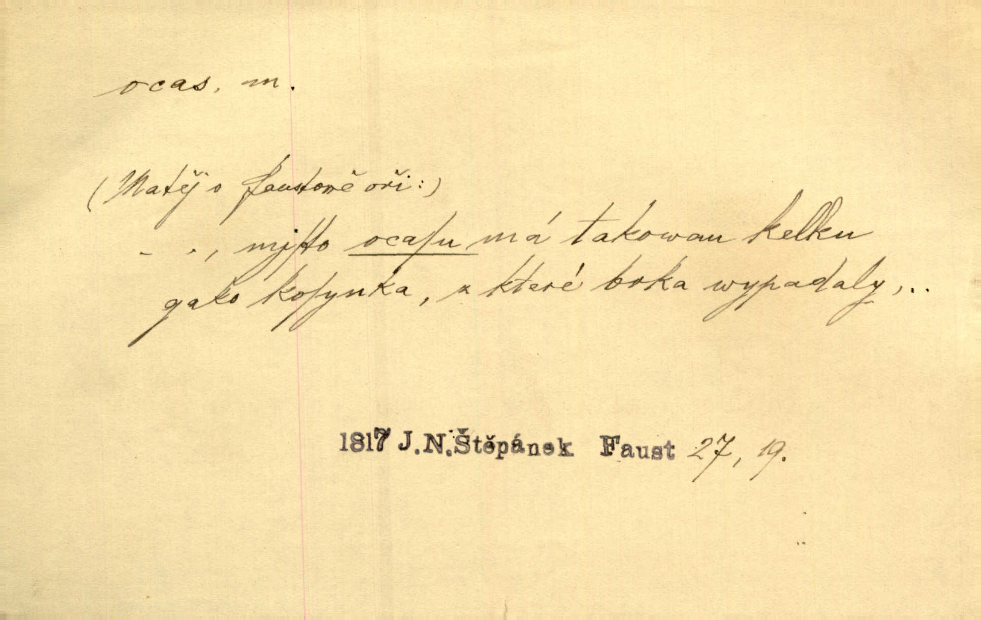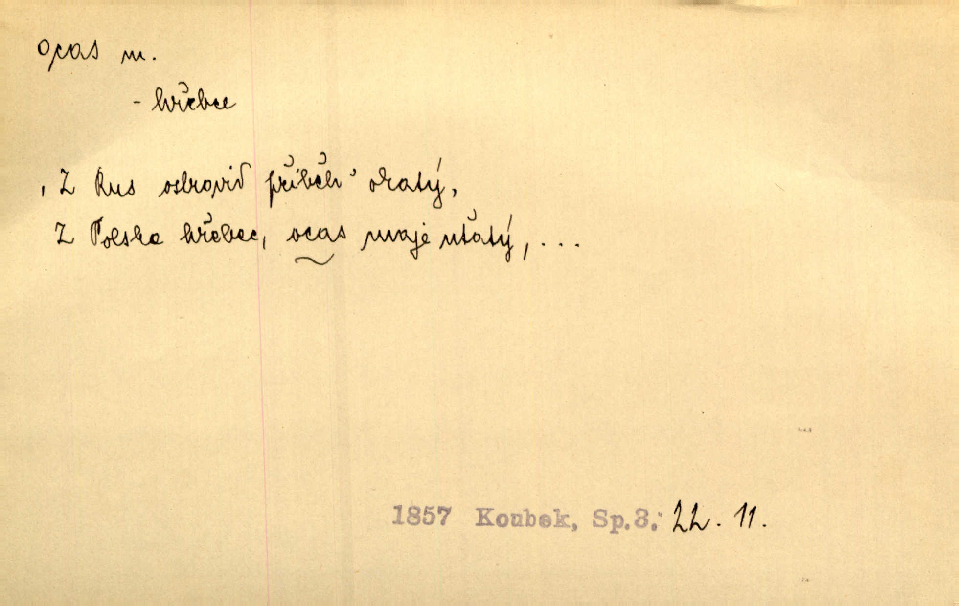 - ocas, -u m. nejzazší část těla obratlovců, tvořená obyčejně ocasními obratli; ohon, chvost. Unavenému koni i ocas těžek. Přísl. Bez zbraně jsi jak kobyla bez ocasu. Maj. [Kráva] zdvihla ocas a dala se do střečkování. Jir. Tak veliký ocas on [páv] nemá. V. Mrš. Ocasy jejich [některých ryb] připomínají barvou i tvarem květy tulipánů. Mach. Přivleče se had, na jehož ocase krásná víla sedí. Něm. Po polévce řízek hověziny, křehoučký „květový ocas“ s polévkovým křenem. Herrm. Ustál. sp. Co jste k nám do Klenčí přinesli [přistěhovalci] krom řemesla? Snadno by to straka na ocase unesla skoro nic. Baar. Říkáme, že panská láska není vyšší prahu a delší zaječího ocasu je krátká. Hol. Drahokoupil jen proto u staré paní Záhořanské omítá liščím ocasem, že peníze u ní čije úlisně se točí kolem ní. Šmil. Vrcholem taktického umění se jim [politickým kruhům] zdá uřezávati psovi ocas po kouskách dělati něco nepříjemného po částech. Přít. D zakončení komety, chvost. Táhnul se [pruh světelný] jako dlouhý plamenný ocas od komety. Mácha. D Arch. vlečka. Potom viděli jsme jakýsi palác plný princův a princezek majících dlouhé ocasy — na svých šatech rozumí se. Ritt. Po ženských ocasích se budou ďáblové vozit. Jir. D Expr. družina, průvod. Paní de Stainville také mívá celý ocas kavalírů za sebou. Ritt. D Expr. vůbec zakončení něčeho. Stálo [členstvo „Spolku přátel pokroku“] sešikováno v dlouhém hadu čtyřstupů, jehož ocas utvořili učedníci a jiní zvědaví lidé. Vrba. D Let. koncová část trupu letadla s ocasními plochami.
