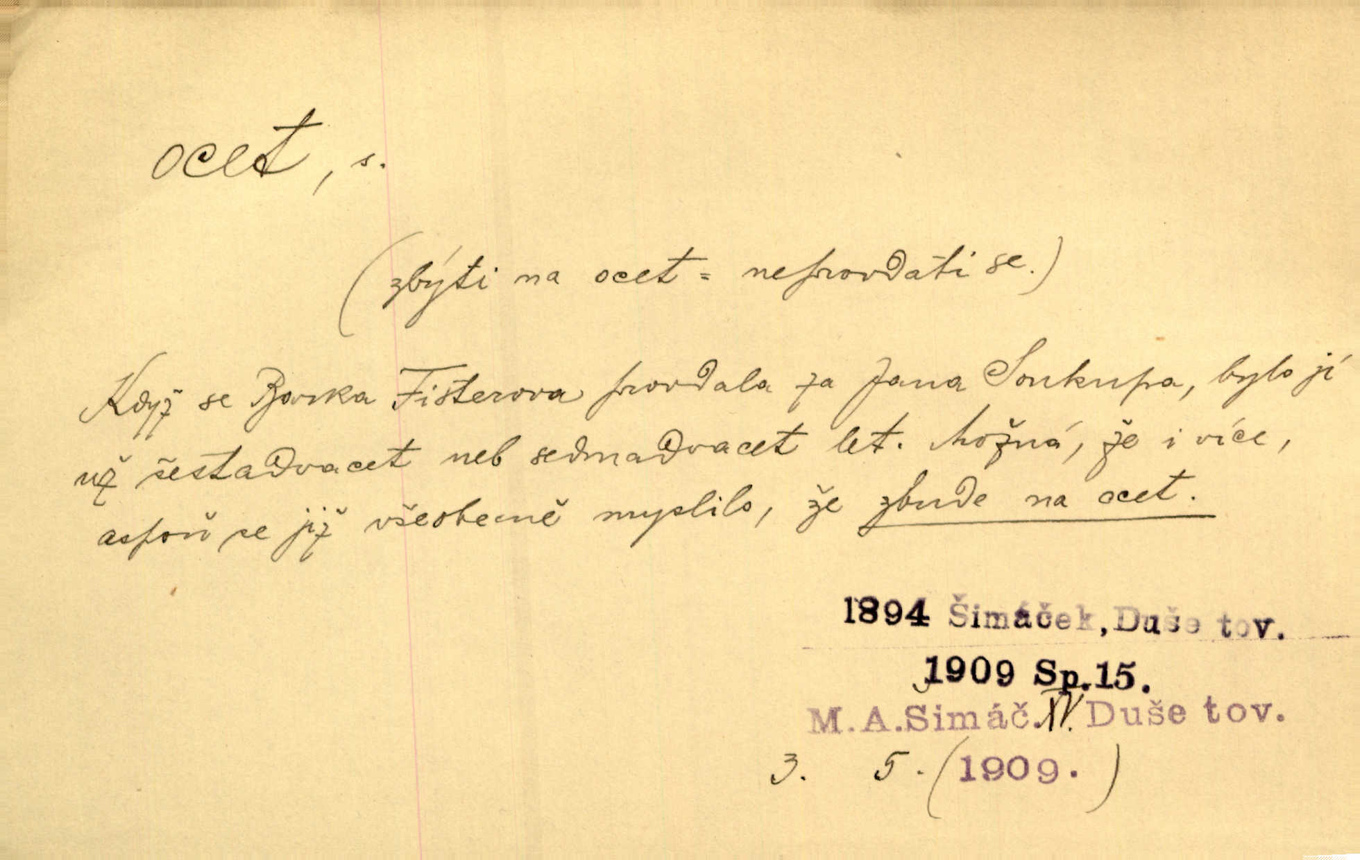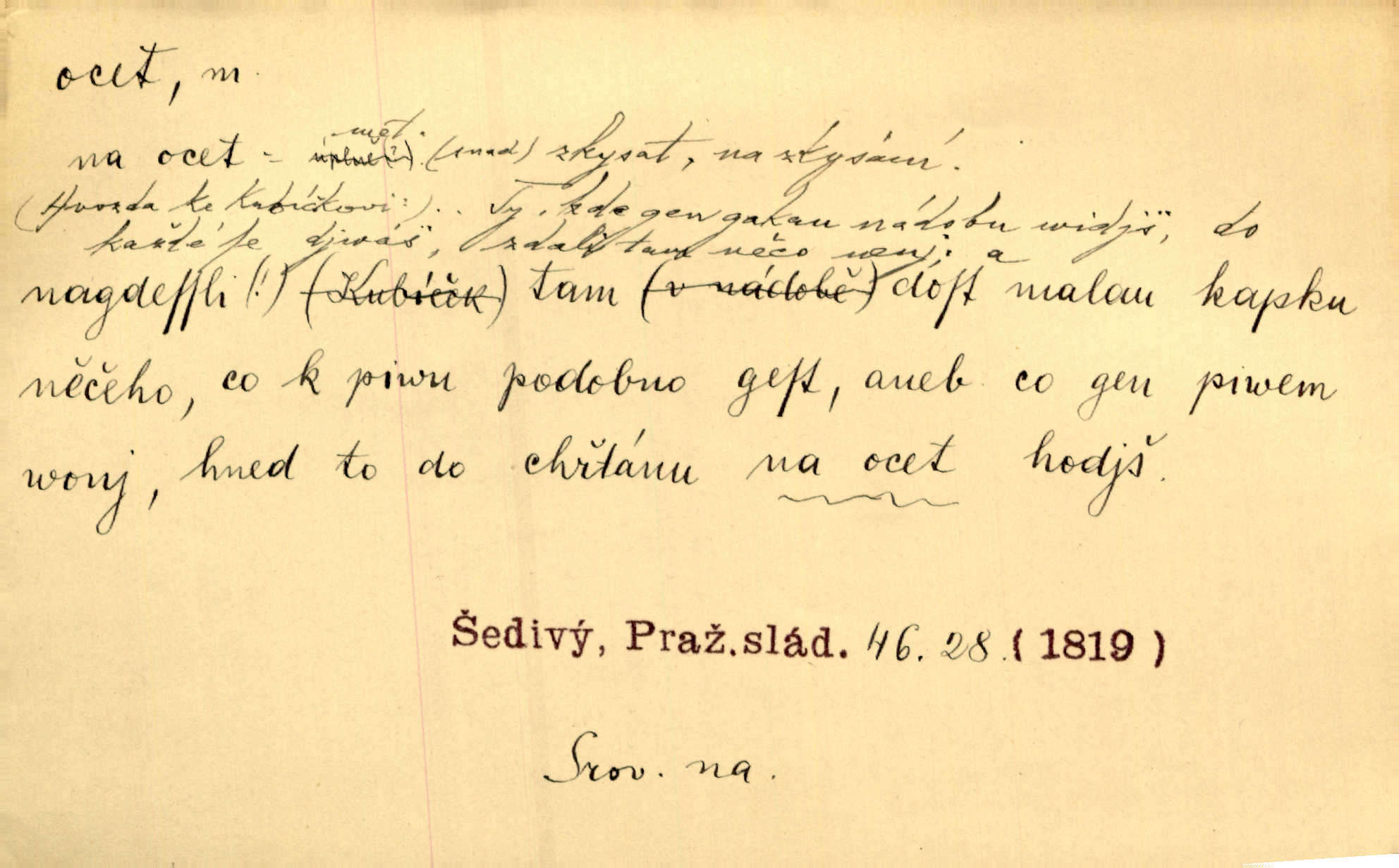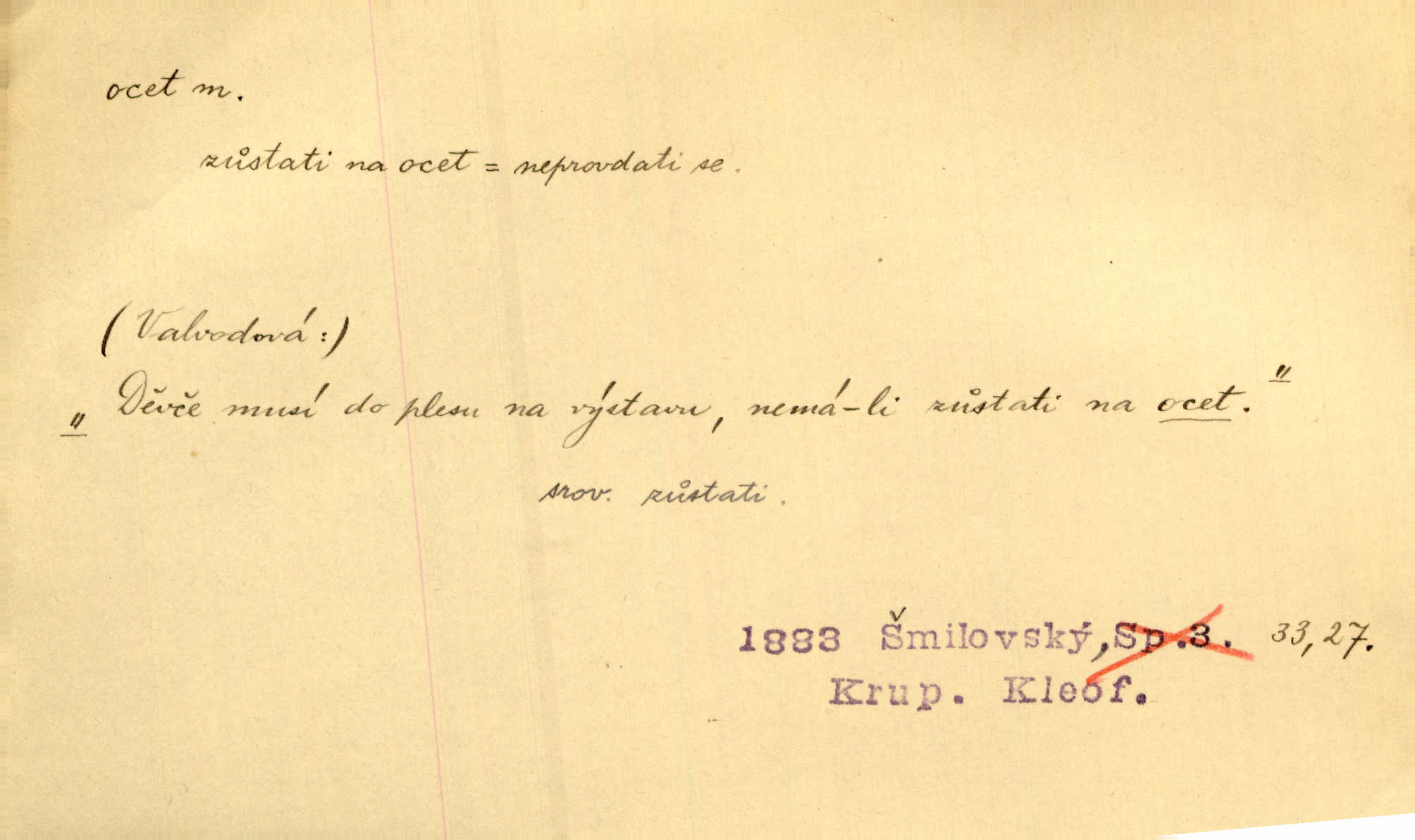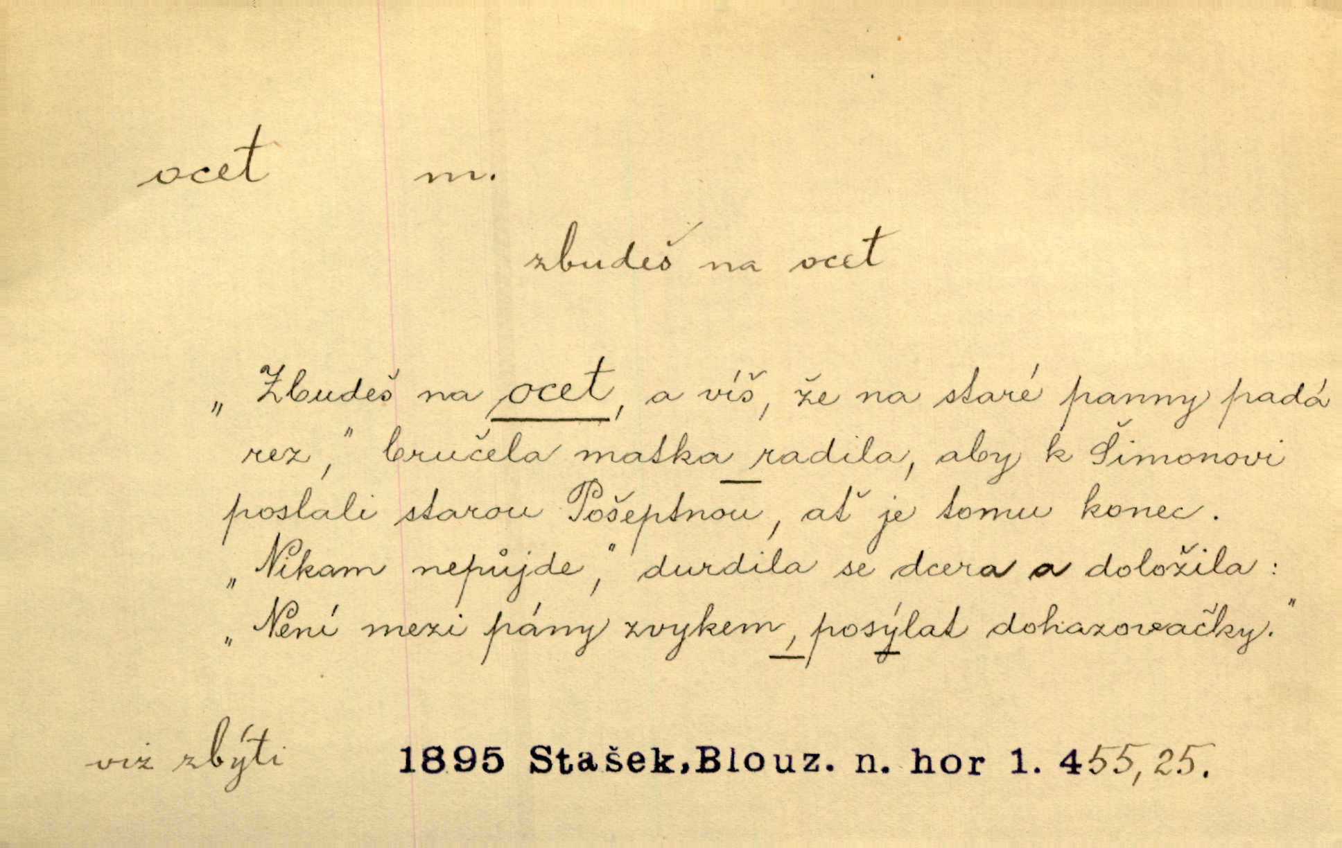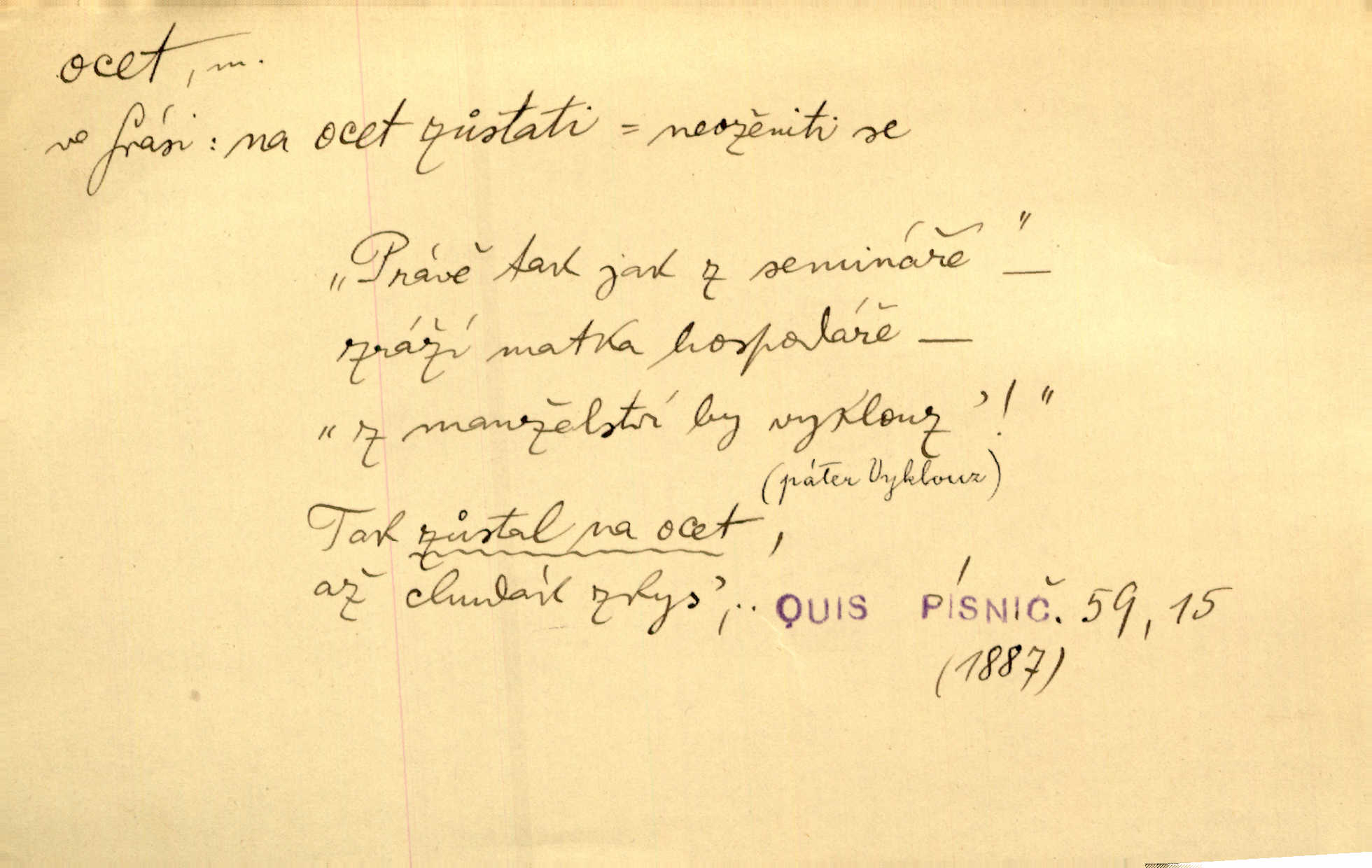 - ocet, -cta m. slabý roztok kyseliny octové, jehož se užívá v domácnosti, hl. v kuchařství. Přinášela ocet, kolínskou vodu a pokoušela se s contessinou, aby ho vzkřísily. Zey. Počala sháněti ocet k obkladu. Vach. Ustál. sp. Poslední slova vyplynula z dědečkových úst, jakoby se byl octa napil. Rais. Čas svrchovaný, abych se oženil, nechci-li zkysati na ocet stát se starým mládencem. Šmil. Nevezme-li si Anýžka ženicha, kterého já jí našel, zbude na ocet neprovdá se. Hol. Trnka nabídl rámě staré paní, Borovec slečně Mély. Doktor, pan Hajný a Jelínek zbyli na ocet nedostalo se na ně. Šmil. Nobl slečinky jsou také rády, když jim někdo pomůže z octa. Herrm. Teď stojí [slečna na plese] celou noc, nikdo si jí ani nevšimne, prodává ocet jeden kousek za druhým není brána k tanci. Her. Dobrá polovina tancechtivých děvčat točila v nich [plesech] ocet. Vrba. Ale jen opatrně! Abych si s honorací nerozlila ocet nepohněvala si ji. Jah. Mám u něho [představeného] rozlitý ocet; nevím, spravím-li si to ještě. Šal. Houby s octem ví takové děvče, jako je Štěpánka! nic. Ros. Kuch. vinný ocet vyráběný z vinných matolin. D něco, co má nějakou vlastnost octa. Přinutí tě, abys chlastal nějaké rýnské octy kyselá vína. Med. Přen. Tvář jeho se vyjasňovala víc a více, ocet a žluč vypařovaly se z ní ponenáhlu kyselost. Herrm. Ven vyhlédla tvář [představené] a úsměvem se stáhla, v němž s octem v zápasu byl sladký med. Vrch.