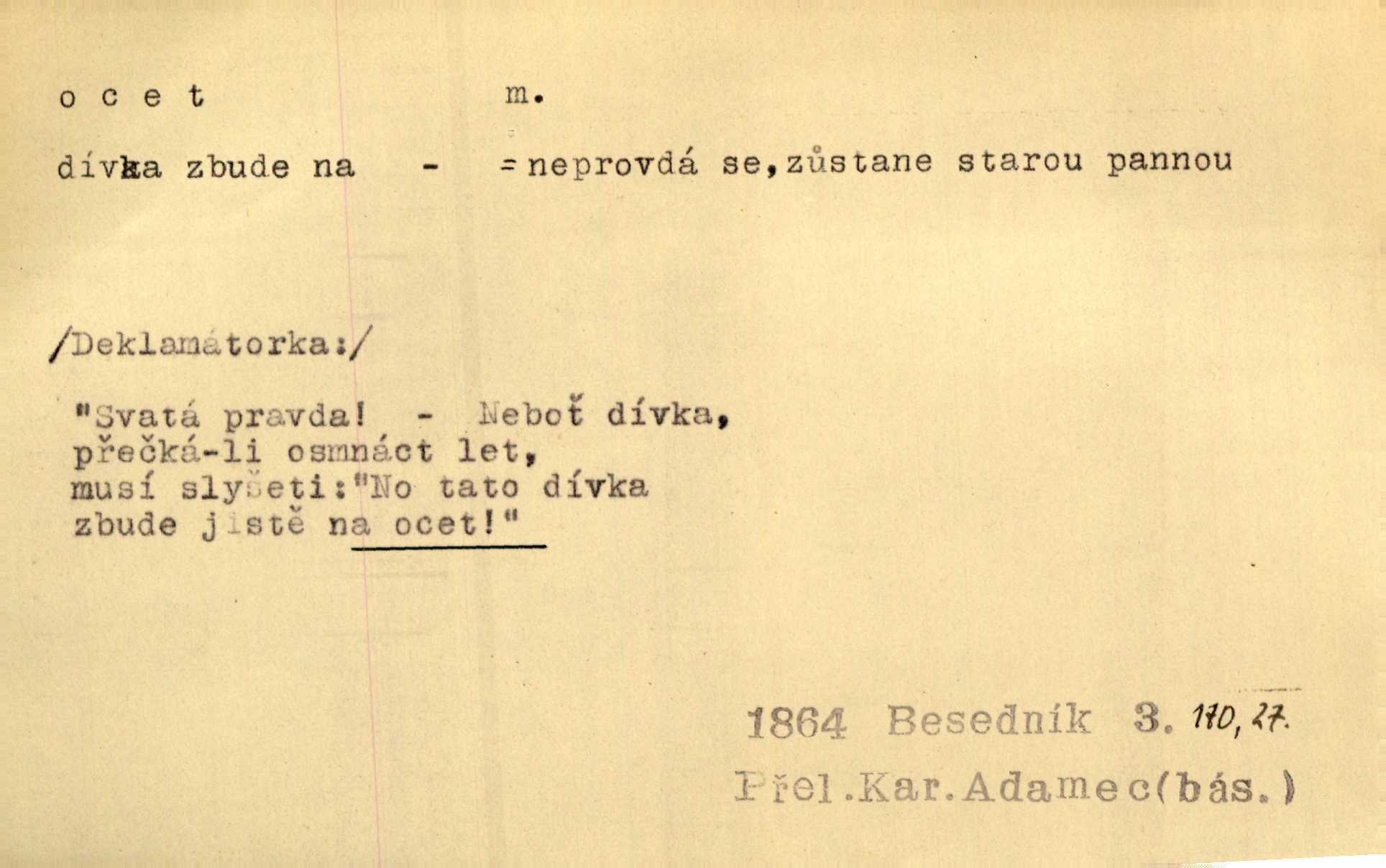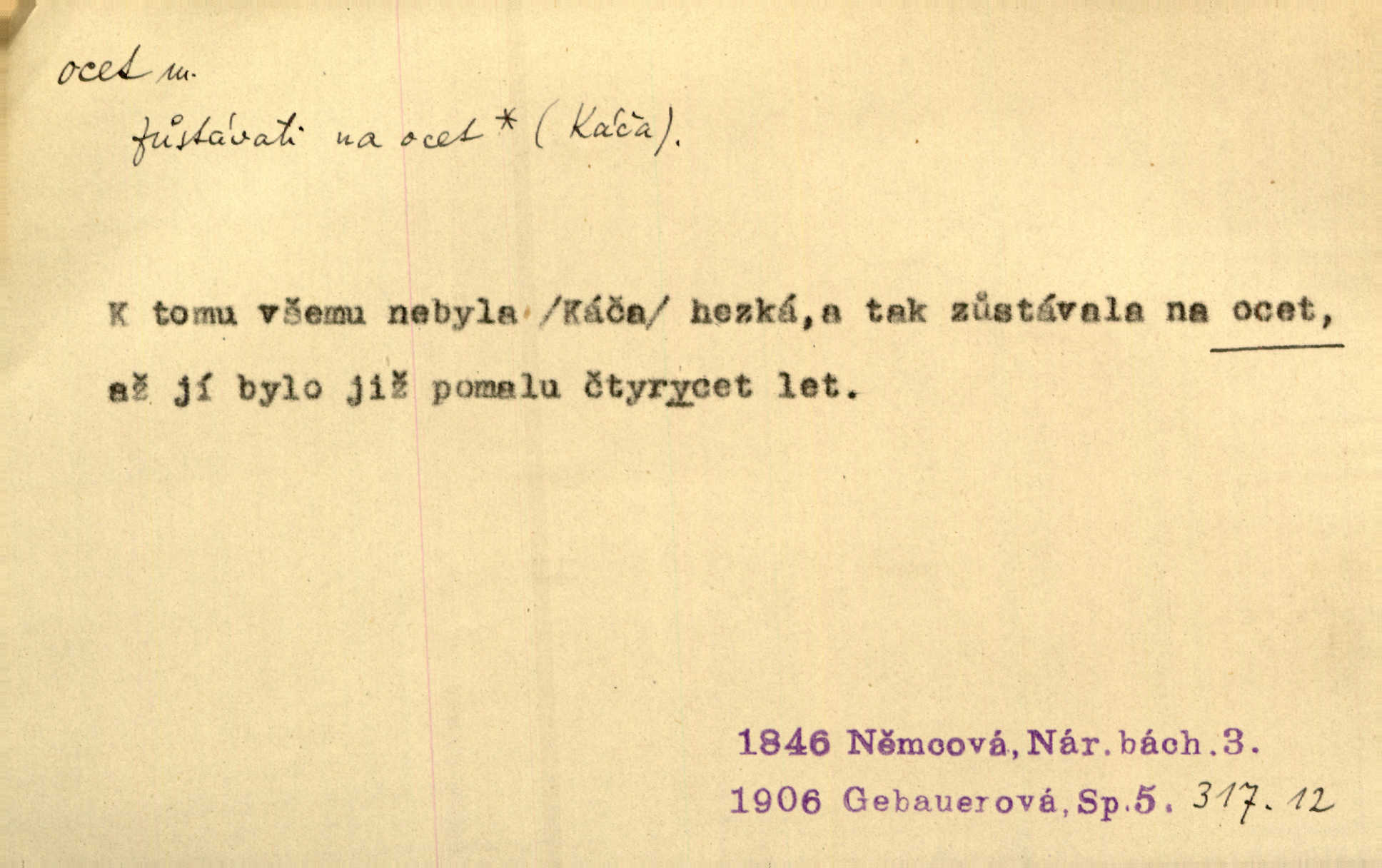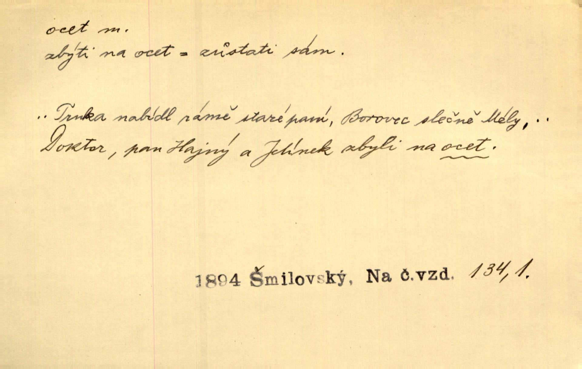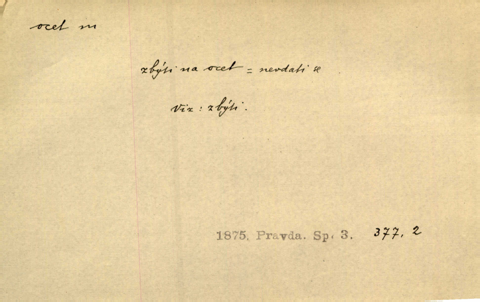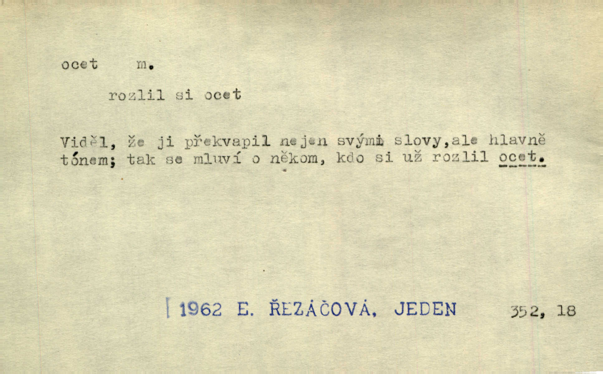 - ocet, -cta m. slabý roztok kyseliny octové, jehož se užívá v domácnosti, hl. v kuchařství. Přinášela ocet, kolínskou vodu a pokoušela se s contessinou, aby ho vzkřísily. Zey. Počala sháněti ocet k obkladu. Vach. Ustál. sp. Poslední slova vyplynula z dědečkových úst, jakoby se byl octa napil. Rais. Čas svrchovaný, abych se oženil, nechci-li zkysati na ocet stát se starým mládencem. Šmil. Nevezme-li si Anýžka ženicha, kterého já jí našel, zbude na ocet neprovdá se. Hol. Trnka nabídl rámě staré paní, Borovec slečně Mély. Doktor, pan Hajný a Jelínek zbyli na ocet nedostalo se na ně. Šmil. Nobl slečinky jsou také rády, když jim někdo pomůže z octa. Herrm. Teď stojí [slečna na plese] celou noc, nikdo si jí ani nevšimne, prodává ocet jeden kousek za druhým není brána k tanci. Her. Dobrá polovina tancechtivých děvčat točila v nich [plesech] ocet. Vrba. Ale jen opatrně! Abych si s honorací nerozlila ocet nepohněvala si ji. Jah. Mám u něho [představeného] rozlitý ocet; nevím, spravím-li si to ještě. Šal. Houby s octem ví takové děvče, jako je Štěpánka! nic. Ros. Kuch. vinný ocet vyráběný z vinných matolin. D něco, co má nějakou vlastnost octa. Přinutí tě, abys chlastal nějaké rýnské octy kyselá vína. Med. Přen. Tvář jeho se vyjasňovala víc a více, ocet a žluč vypařovaly se z ní ponenáhlu kyselost. Herrm. Ven vyhlédla tvář [představené] a úsměvem se stáhla, v němž s octem v zápasu byl sladký med. Vrch.