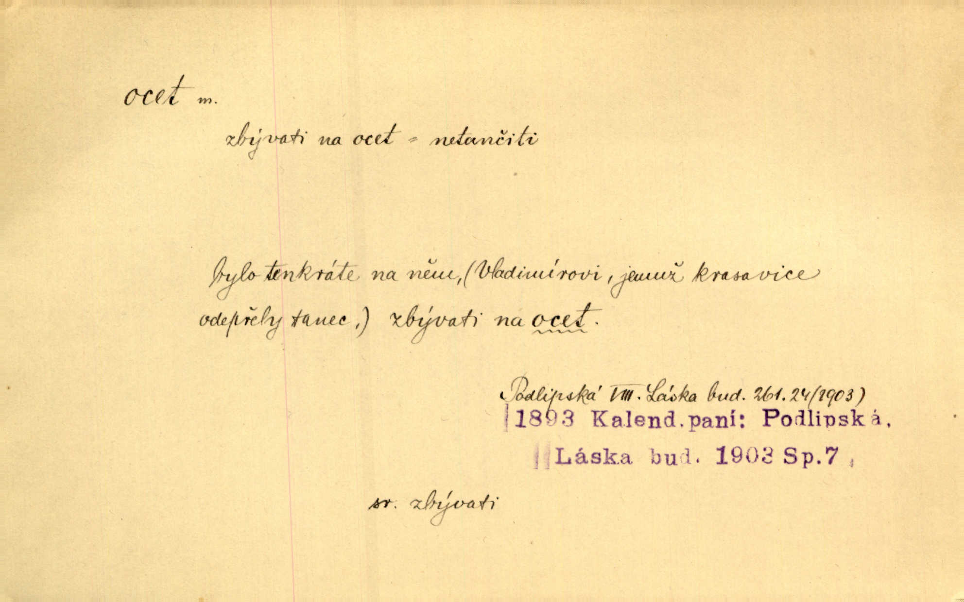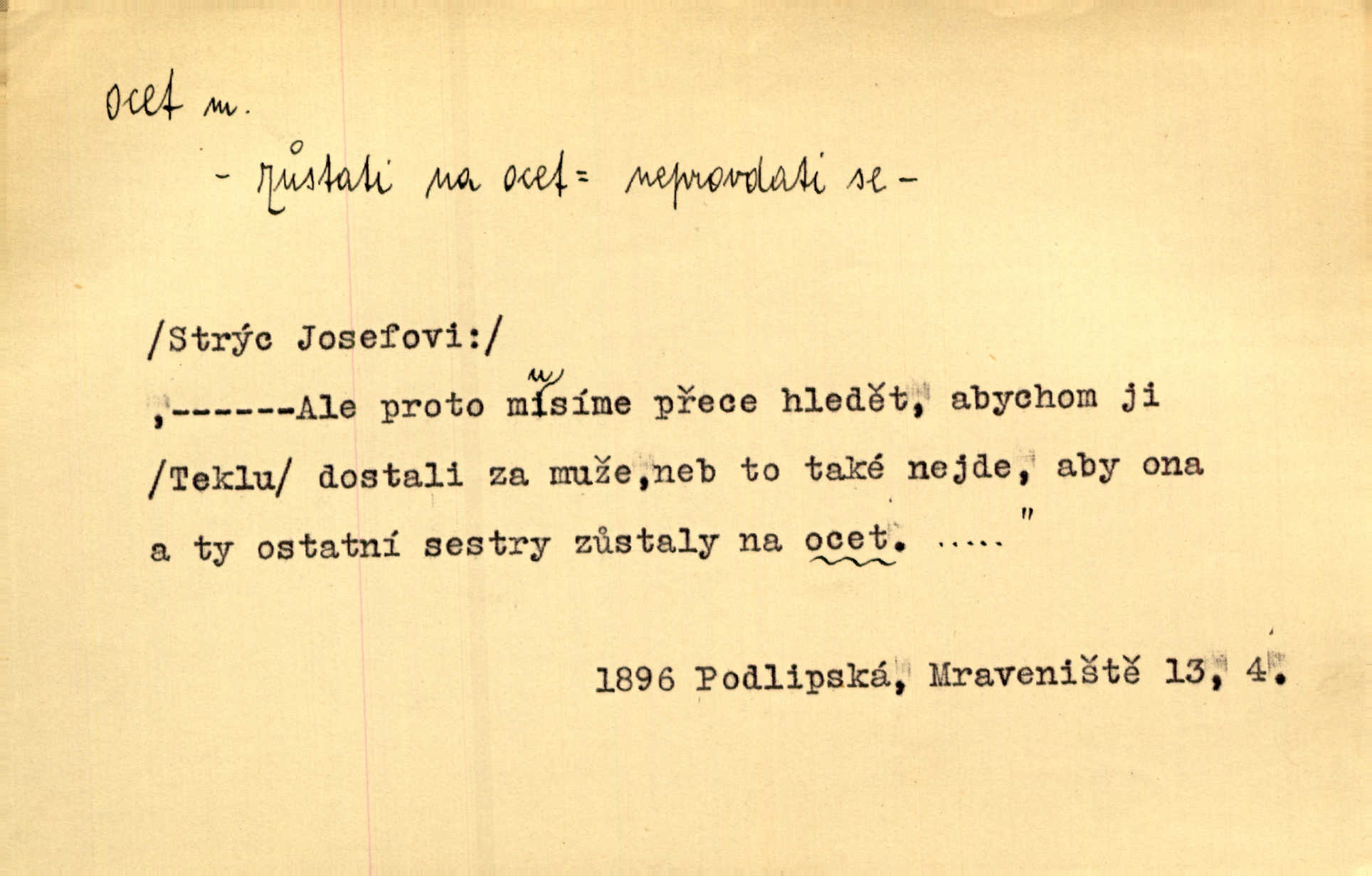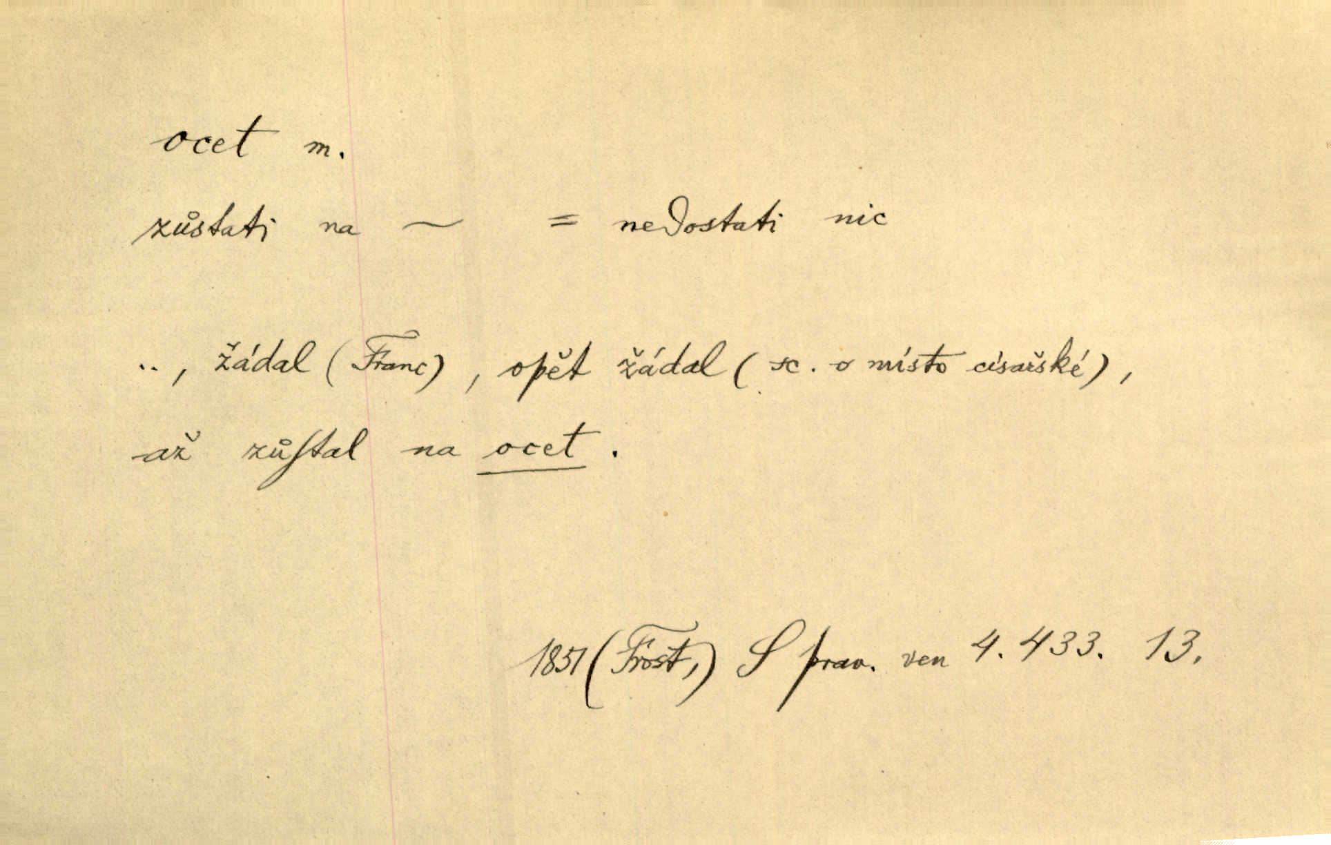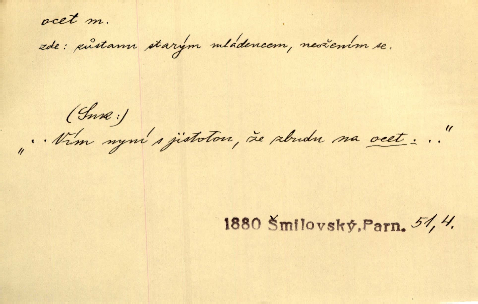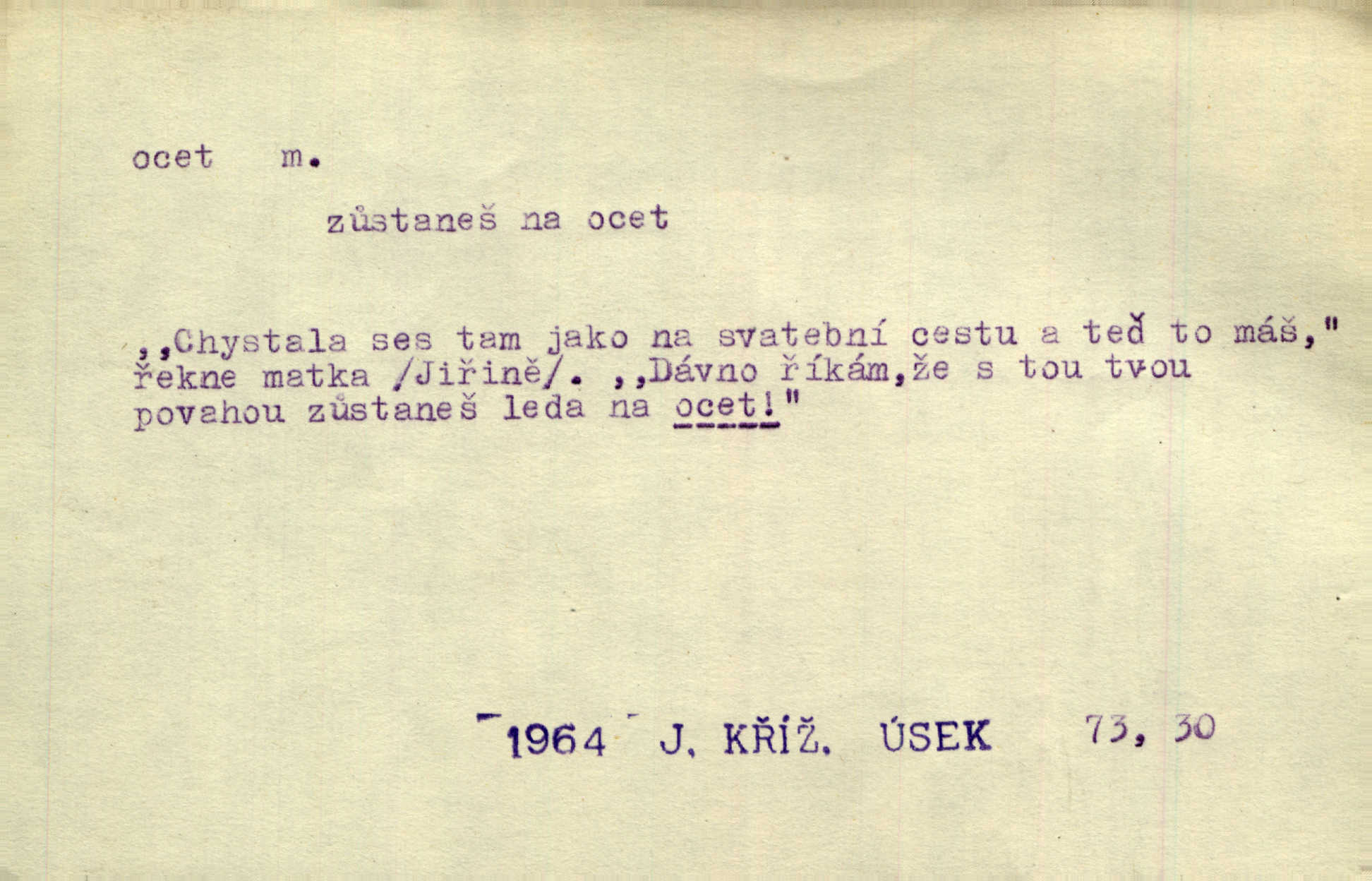 - ocet, -cta m. slabý roztok kyseliny octové, jehož se užívá v domácnosti, hl. v kuchařství. Přinášela ocet, kolínskou vodu a pokoušela se s contessinou, aby ho vzkřísily. Zey. Počala sháněti ocet k obkladu. Vach. Ustál. sp. Poslední slova vyplynula z dědečkových úst, jakoby se byl octa napil. Rais. Čas svrchovaný, abych se oženil, nechci-li zkysati na ocet stát se starým mládencem. Šmil. Nevezme-li si Anýžka ženicha, kterého já jí našel, zbude na ocet neprovdá se. Hol. Trnka nabídl rámě staré paní, Borovec slečně Mély. Doktor, pan Hajný a Jelínek zbyli na ocet nedostalo se na ně. Šmil. Nobl slečinky jsou také rády, když jim někdo pomůže z octa. Herrm. Teď stojí [slečna na plese] celou noc, nikdo si jí ani nevšimne, prodává ocet jeden kousek za druhým není brána k tanci. Her. Dobrá polovina tancechtivých děvčat točila v nich [plesech] ocet. Vrba. Ale jen opatrně! Abych si s honorací nerozlila ocet nepohněvala si ji. Jah. Mám u něho [představeného] rozlitý ocet; nevím, spravím-li si to ještě. Šal. Houby s octem ví takové děvče, jako je Štěpánka! nic. Ros. Kuch. vinný ocet vyráběný z vinných matolin. D něco, co má nějakou vlastnost octa. Přinutí tě, abys chlastal nějaké rýnské octy kyselá vína. Med. Přen. Tvář jeho se vyjasňovala víc a více, ocet a žluč vypařovaly se z ní ponenáhlu kyselost. Herrm. Ven vyhlédla tvář [představené] a úsměvem se stáhla, v němž s octem v zápasu byl sladký med. Vrch.