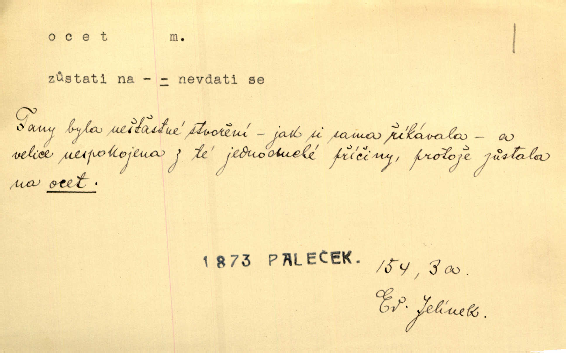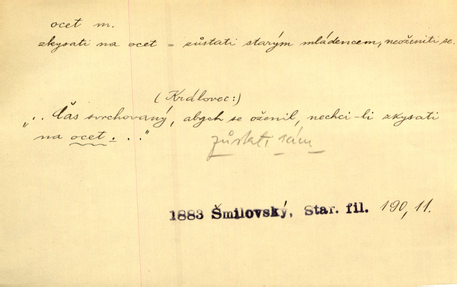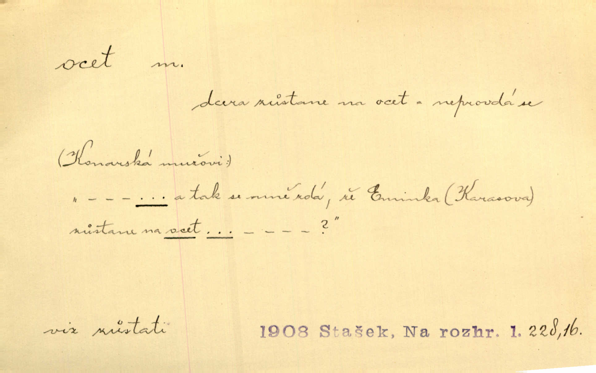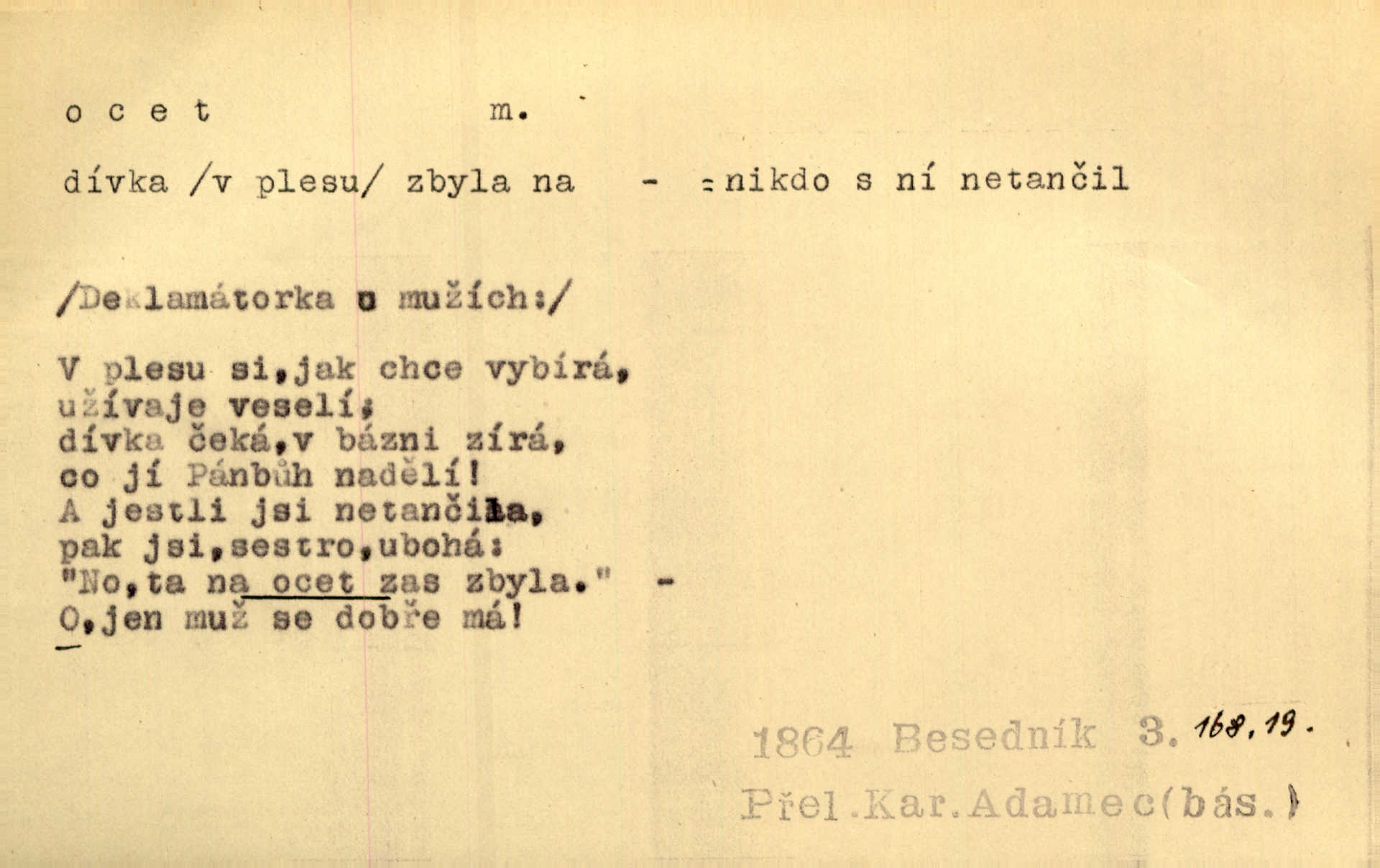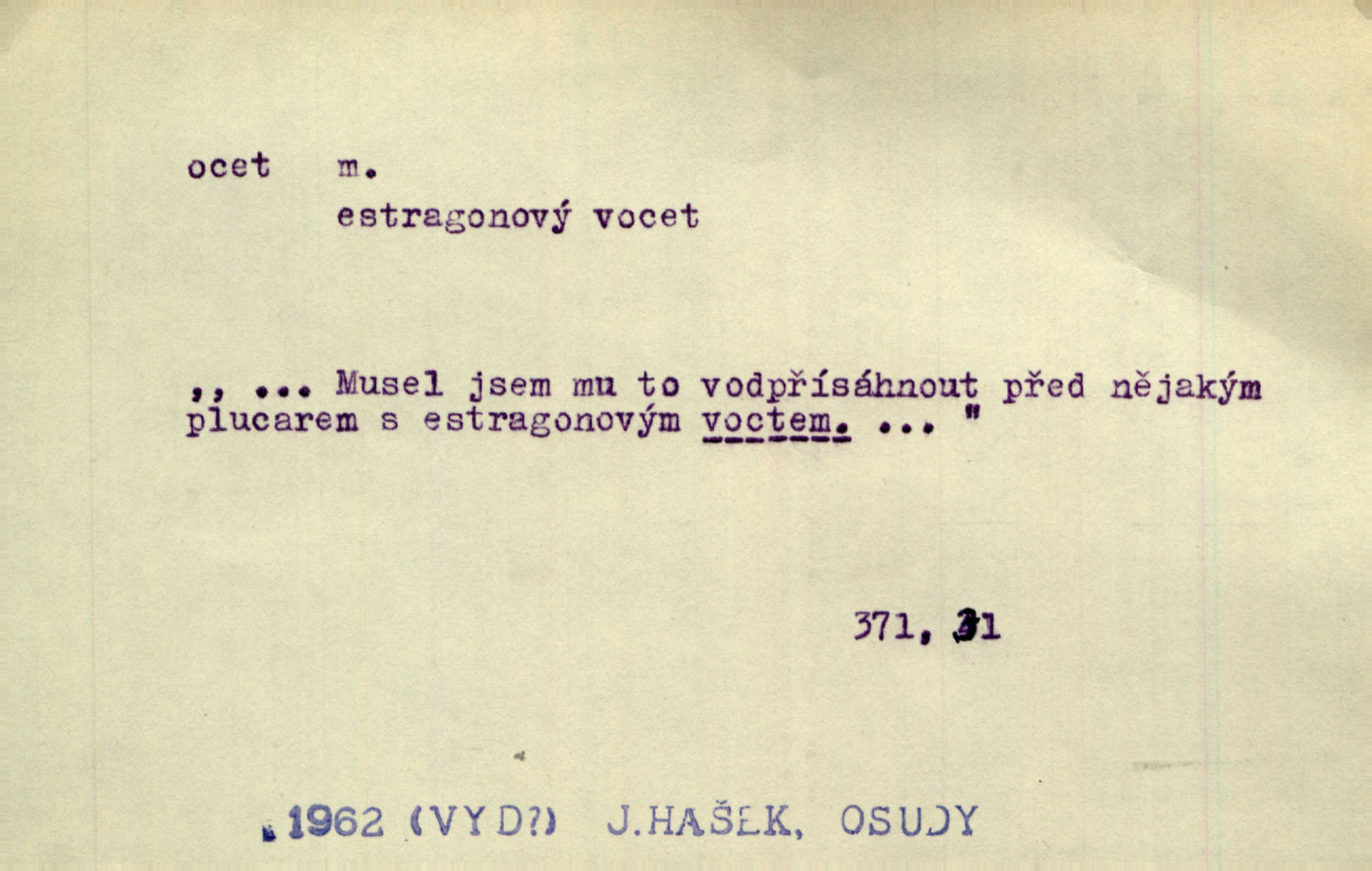 - ocet, -cta m. slabý roztok kyseliny octové, jehož se užívá v domácnosti, hl. v kuchařství. Přinášela ocet, kolínskou vodu a pokoušela se s contessinou, aby ho vzkřísily. Zey. Počala sháněti ocet k obkladu. Vach. Ustál. sp. Poslední slova vyplynula z dědečkových úst, jakoby se byl octa napil. Rais. Čas svrchovaný, abych se oženil, nechci-li zkysati na ocet stát se starým mládencem. Šmil. Nevezme-li si Anýžka ženicha, kterého já jí našel, zbude na ocet neprovdá se. Hol. Trnka nabídl rámě staré paní, Borovec slečně Mély. Doktor, pan Hajný a Jelínek zbyli na ocet nedostalo se na ně. Šmil. Nobl slečinky jsou také rády, když jim někdo pomůže z octa. Herrm. Teď stojí [slečna na plese] celou noc, nikdo si jí ani nevšimne, prodává ocet jeden kousek za druhým není brána k tanci. Her. Dobrá polovina tancechtivých děvčat točila v nich [plesech] ocet. Vrba. Ale jen opatrně! Abych si s honorací nerozlila ocet nepohněvala si ji. Jah. Mám u něho [představeného] rozlitý ocet; nevím, spravím-li si to ještě. Šal. Houby s octem ví takové děvče, jako je Štěpánka! nic. Ros. Kuch. vinný ocet vyráběný z vinných matolin. D něco, co má nějakou vlastnost octa. Přinutí tě, abys chlastal nějaké rýnské octy kyselá vína. Med. Přen. Tvář jeho se vyjasňovala víc a více, ocet a žluč vypařovaly se z ní ponenáhlu kyselost. Herrm. Ven vyhlédla tvář [představené] a úsměvem se stáhla, v němž s octem v zápasu byl sladký med. Vrch.