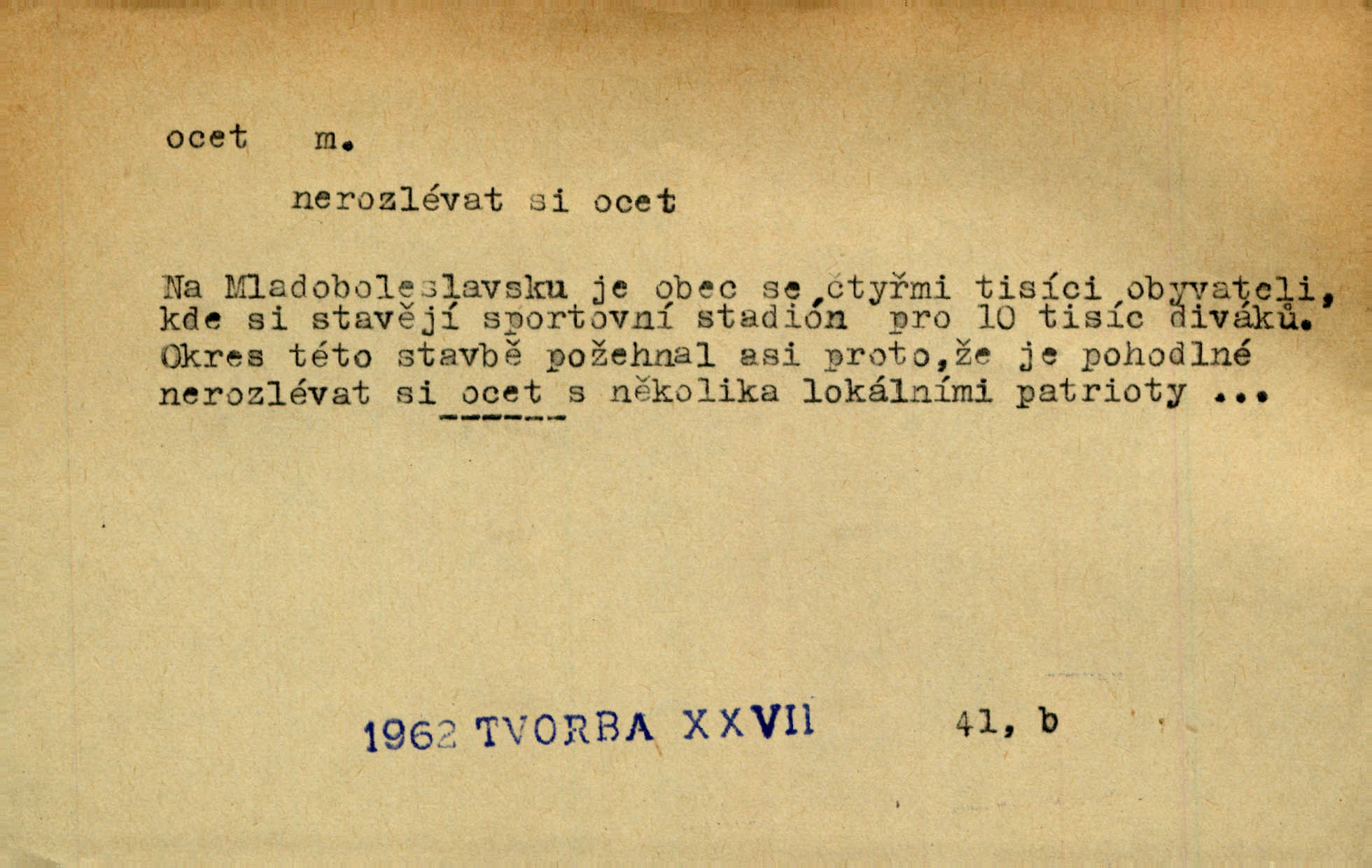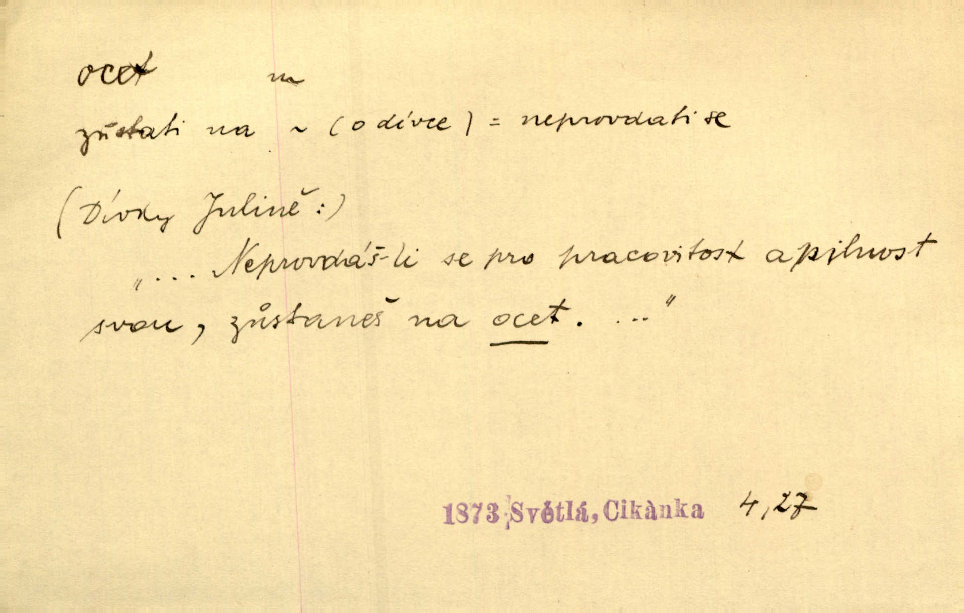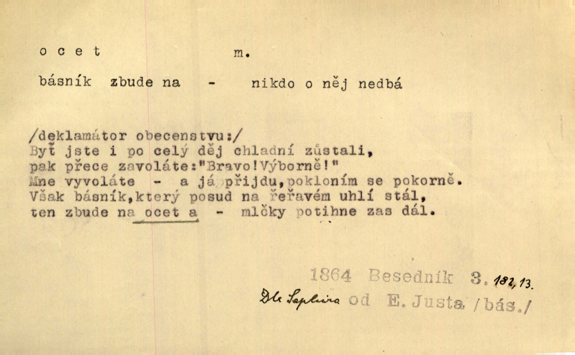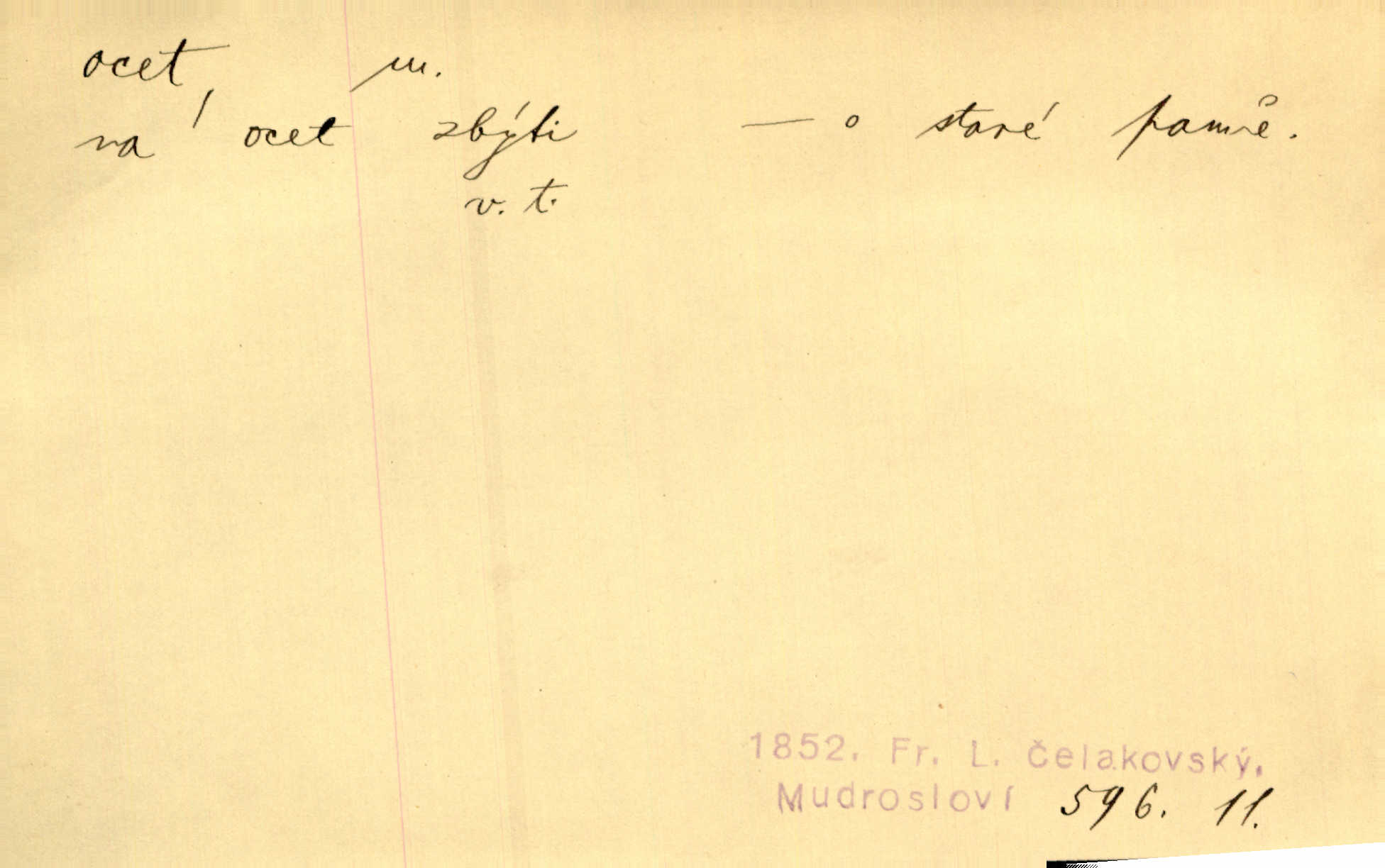 - ocet, -cta m. slabý roztok kyseliny octové, jehož se užívá v domácnosti, hl. v kuchařství. Přinášela ocet, kolínskou vodu a pokoušela se s contessinou, aby ho vzkřísily. Zey. Počala sháněti ocet k obkladu. Vach. Ustál. sp. Poslední slova vyplynula z dědečkových úst, jakoby se byl octa napil. Rais. Čas svrchovaný, abych se oženil, nechci-li zkysati na ocet stát se starým mládencem. Šmil. Nevezme-li si Anýžka ženicha, kterého já jí našel, zbude na ocet neprovdá se. Hol. Trnka nabídl rámě staré paní, Borovec slečně Mély. Doktor, pan Hajný a Jelínek zbyli na ocet nedostalo se na ně. Šmil. Nobl slečinky jsou také rády, když jim někdo pomůže z octa. Herrm. Teď stojí [slečna na plese] celou noc, nikdo si jí ani nevšimne, prodává ocet jeden kousek za druhým není brána k tanci. Her. Dobrá polovina tancechtivých děvčat točila v nich [plesech] ocet. Vrba. Ale jen opatrně! Abych si s honorací nerozlila ocet nepohněvala si ji. Jah. Mám u něho [představeného] rozlitý ocet; nevím, spravím-li si to ještě. Šal. Houby s octem ví takové děvče, jako je Štěpánka! nic. Ros. Kuch. vinný ocet vyráběný z vinných matolin. D něco, co má nějakou vlastnost octa. Přinutí tě, abys chlastal nějaké rýnské octy kyselá vína. Med. Přen. Tvář jeho se vyjasňovala víc a více, ocet a žluč vypařovaly se z ní ponenáhlu kyselost. Herrm. Ven vyhlédla tvář [představené] a úsměvem se stáhla, v němž s octem v zápasu byl sladký med. Vrch.