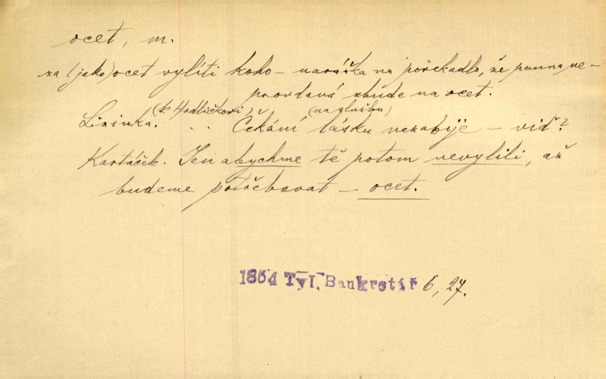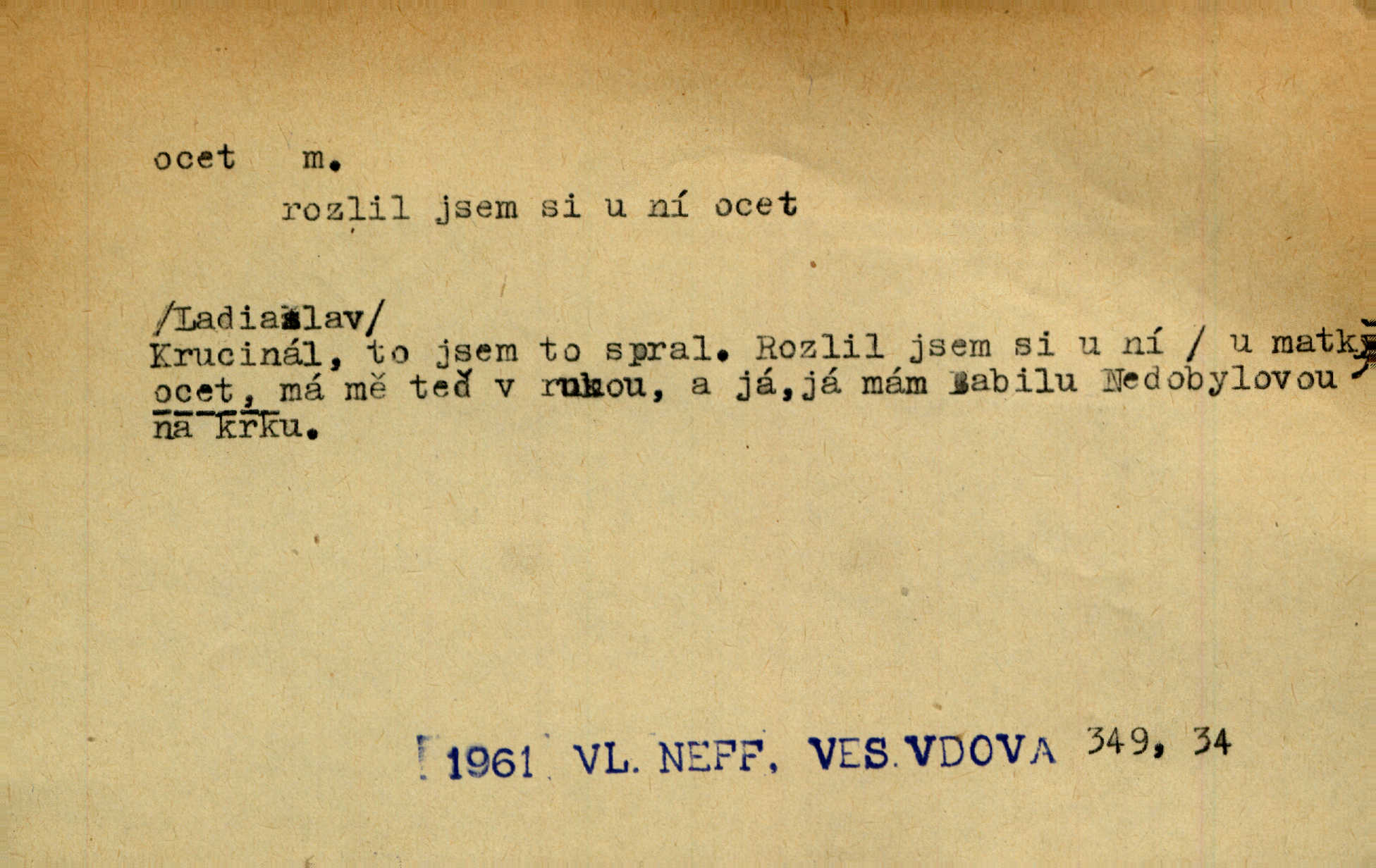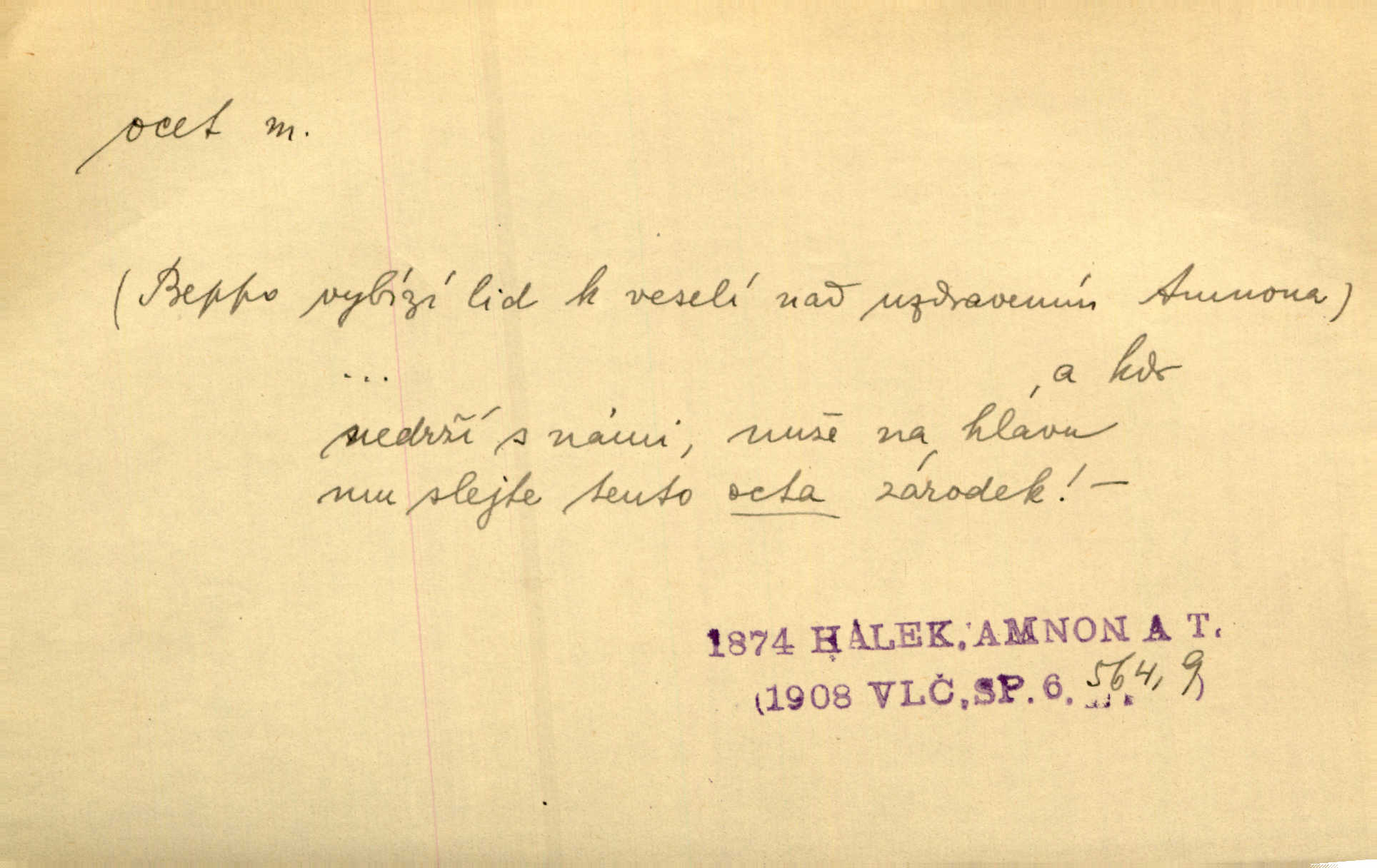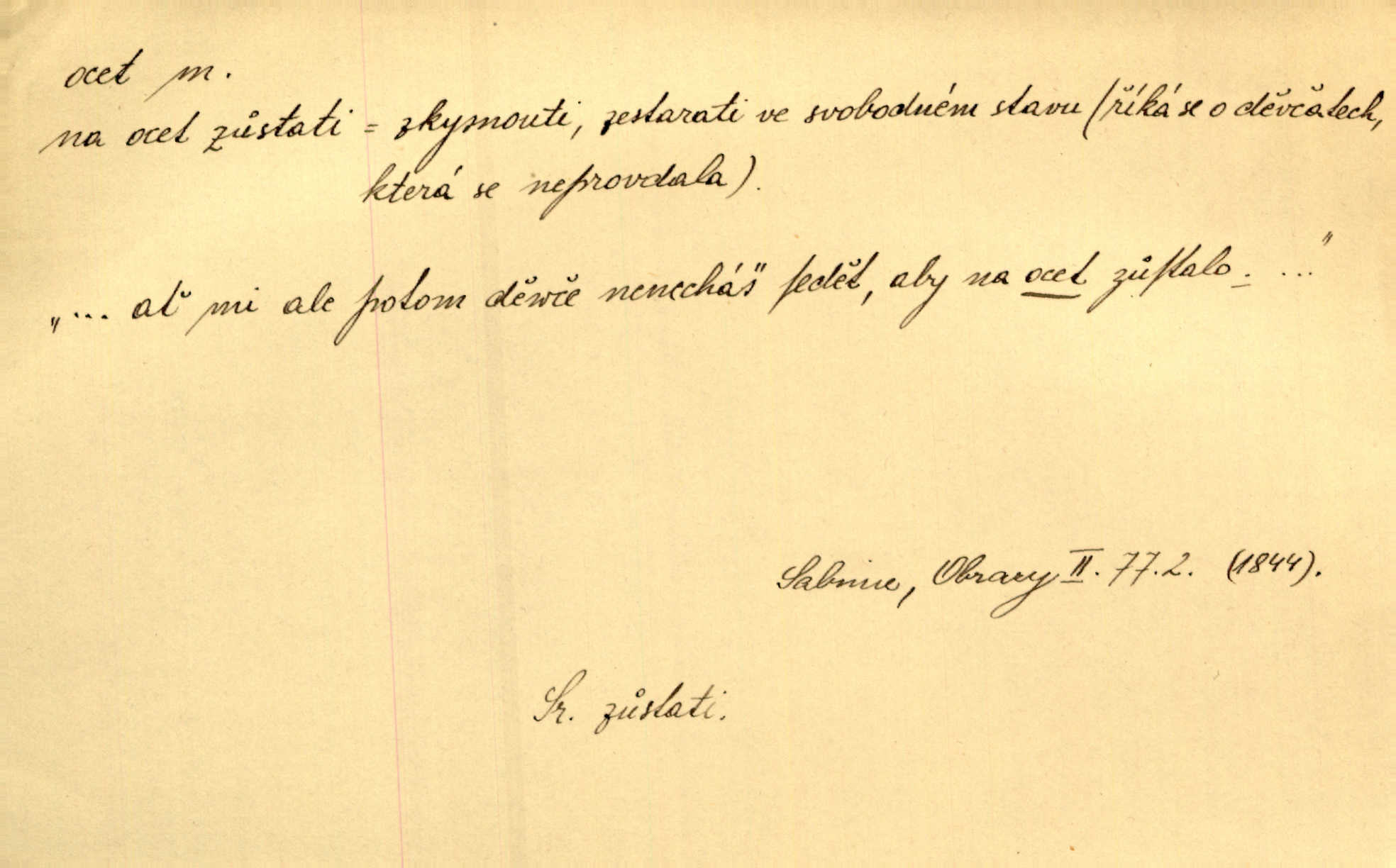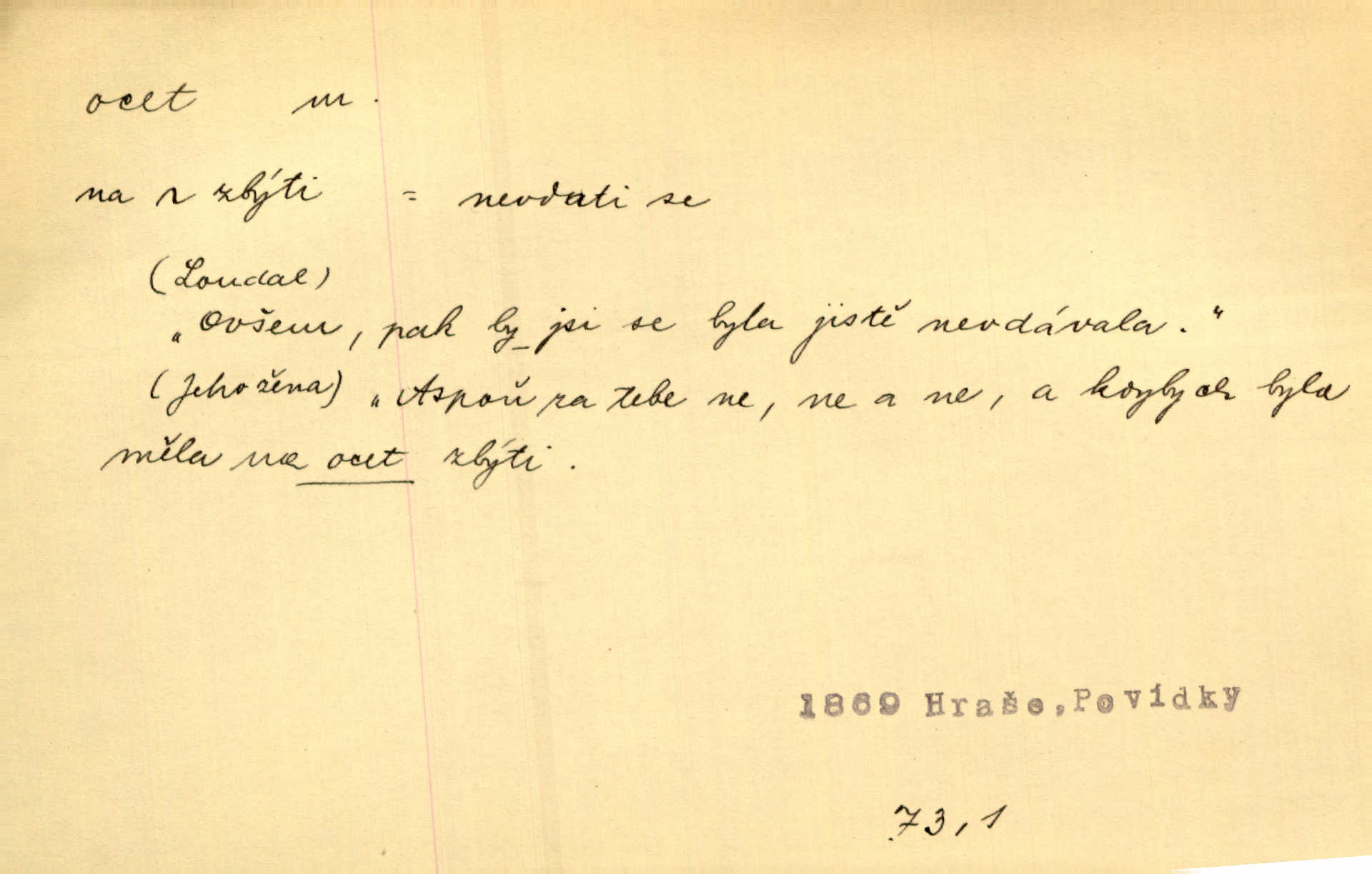 - ocet, -cta m. slabý roztok kyseliny octové, jehož se užívá v domácnosti, hl. v kuchařství. Přinášela ocet, kolínskou vodu a pokoušela se s contessinou, aby ho vzkřísily. Zey. Počala sháněti ocet k obkladu. Vach. Ustál. sp. Poslední slova vyplynula z dědečkových úst, jakoby se byl octa napil. Rais. Čas svrchovaný, abych se oženil, nechci-li zkysati na ocet stát se starým mládencem. Šmil. Nevezme-li si Anýžka ženicha, kterého já jí našel, zbude na ocet neprovdá se. Hol. Trnka nabídl rámě staré paní, Borovec slečně Mély. Doktor, pan Hajný a Jelínek zbyli na ocet nedostalo se na ně. Šmil. Nobl slečinky jsou také rády, když jim někdo pomůže z octa. Herrm. Teď stojí [slečna na plese] celou noc, nikdo si jí ani nevšimne, prodává ocet jeden kousek za druhým není brána k tanci. Her. Dobrá polovina tancechtivých děvčat točila v nich [plesech] ocet. Vrba. Ale jen opatrně! Abych si s honorací nerozlila ocet nepohněvala si ji. Jah. Mám u něho [představeného] rozlitý ocet; nevím, spravím-li si to ještě. Šal. Houby s octem ví takové děvče, jako je Štěpánka! nic. Ros. Kuch. vinný ocet vyráběný z vinných matolin. D něco, co má nějakou vlastnost octa. Přinutí tě, abys chlastal nějaké rýnské octy kyselá vína. Med. Přen. Tvář jeho se vyjasňovala víc a více, ocet a žluč vypařovaly se z ní ponenáhlu kyselost. Herrm. Ven vyhlédla tvář [představené] a úsměvem se stáhla, v němž s octem v zápasu byl sladký med. Vrch.