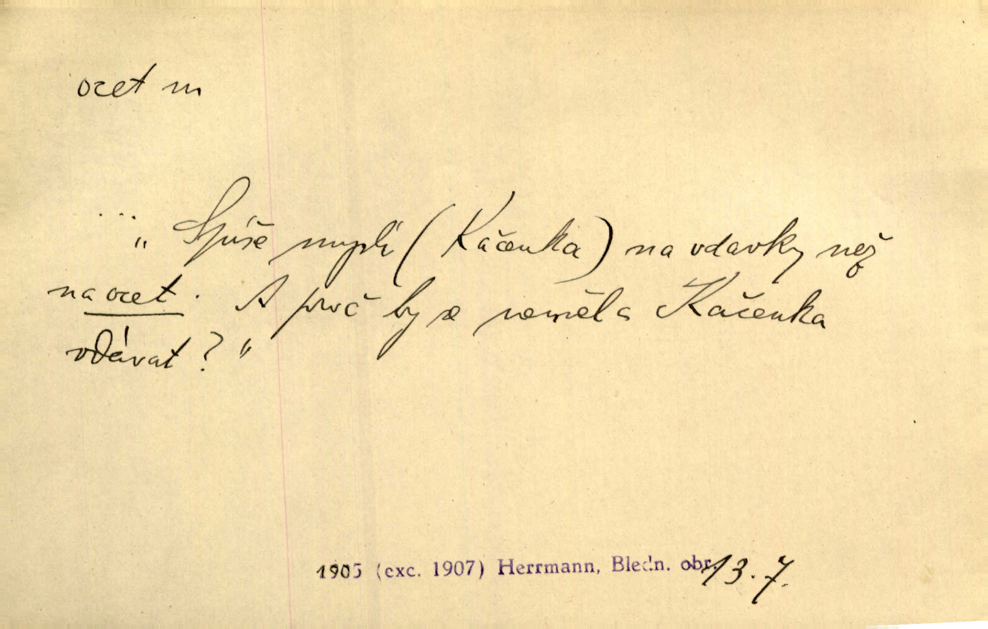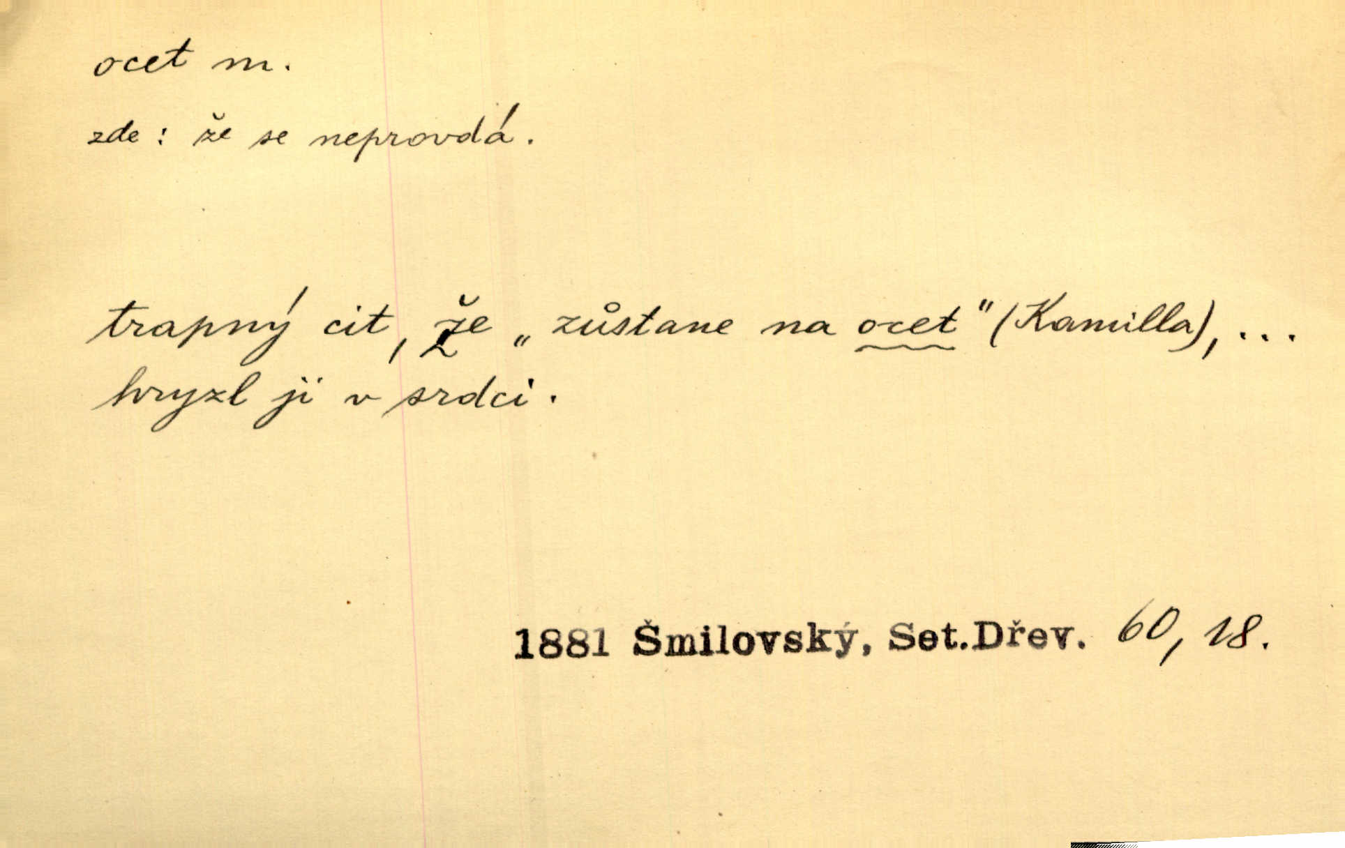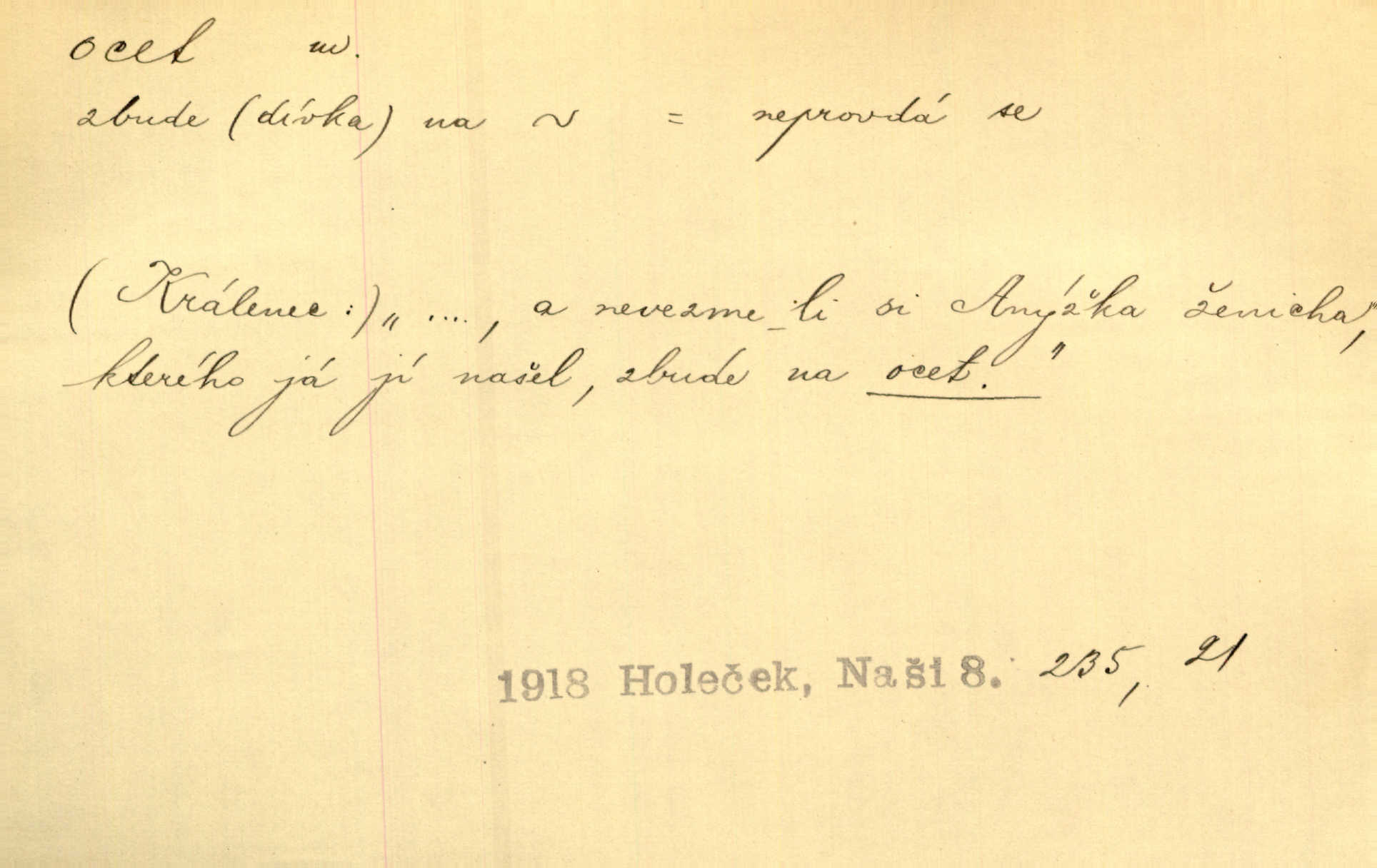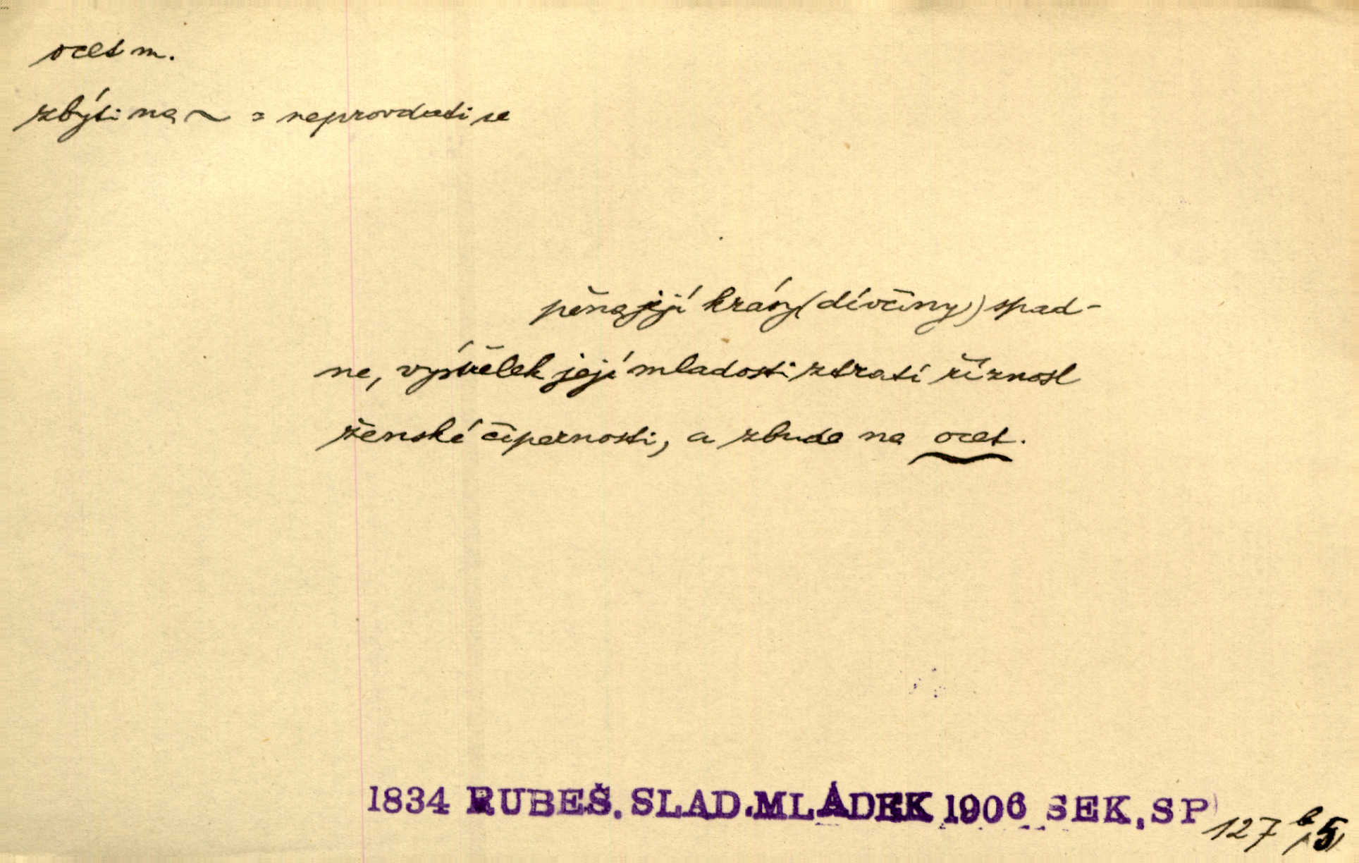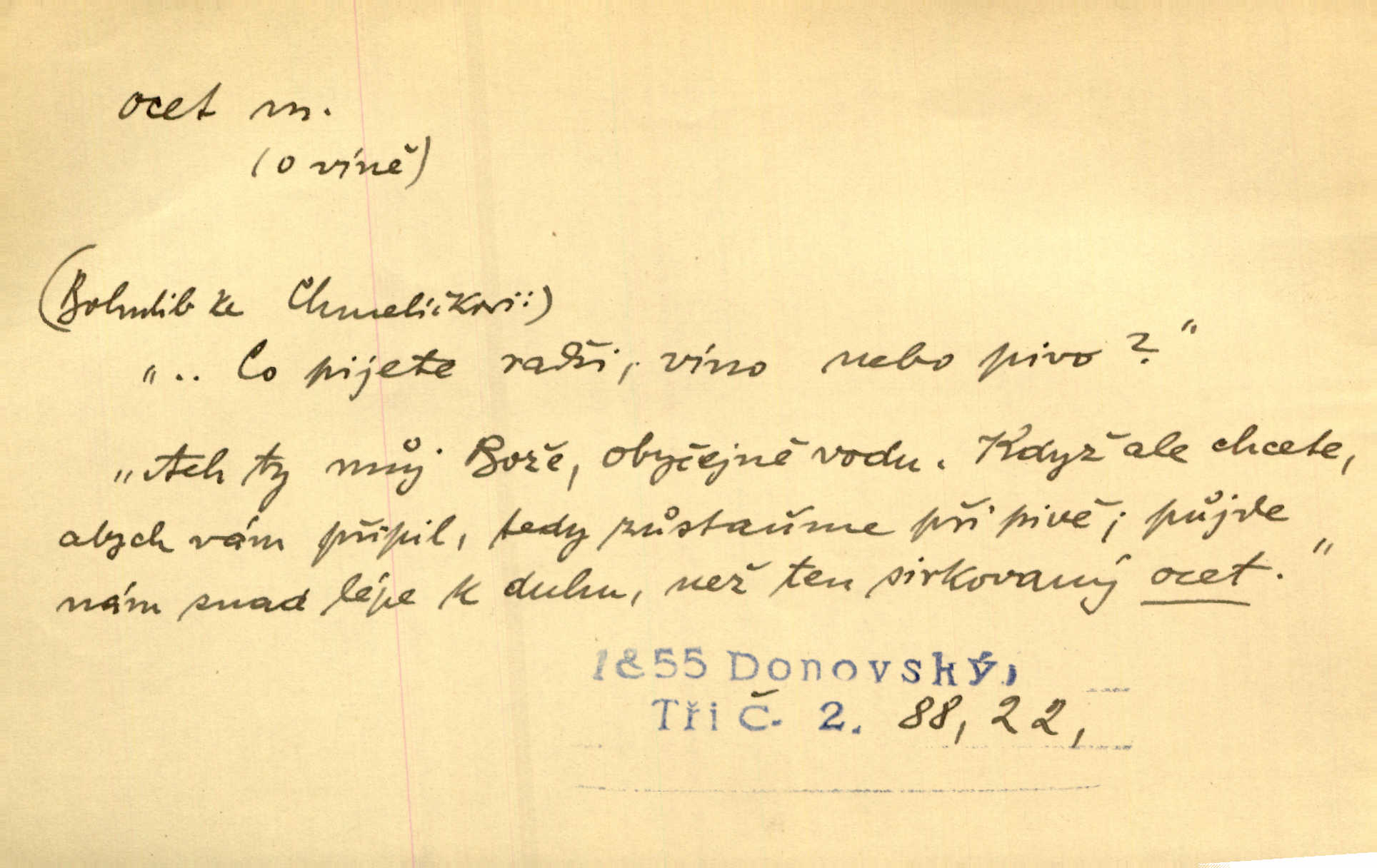 - ocet, -cta m. slabý roztok kyseliny octové, jehož se užívá v domácnosti, hl. v kuchařství. Přinášela ocet, kolínskou vodu a pokoušela se s contessinou, aby ho vzkřísily. Zey. Počala sháněti ocet k obkladu. Vach. Ustál. sp. Poslední slova vyplynula z dědečkových úst, jakoby se byl octa napil. Rais. Čas svrchovaný, abych se oženil, nechci-li zkysati na ocet stát se starým mládencem. Šmil. Nevezme-li si Anýžka ženicha, kterého já jí našel, zbude na ocet neprovdá se. Hol. Trnka nabídl rámě staré paní, Borovec slečně Mély. Doktor, pan Hajný a Jelínek zbyli na ocet nedostalo se na ně. Šmil. Nobl slečinky jsou také rády, když jim někdo pomůže z octa. Herrm. Teď stojí [slečna na plese] celou noc, nikdo si jí ani nevšimne, prodává ocet jeden kousek za druhým není brána k tanci. Her. Dobrá polovina tancechtivých děvčat točila v nich [plesech] ocet. Vrba. Ale jen opatrně! Abych si s honorací nerozlila ocet nepohněvala si ji. Jah. Mám u něho [představeného] rozlitý ocet; nevím, spravím-li si to ještě. Šal. Houby s octem ví takové děvče, jako je Štěpánka! nic. Ros. Kuch. vinný ocet vyráběný z vinných matolin. D něco, co má nějakou vlastnost octa. Přinutí tě, abys chlastal nějaké rýnské octy kyselá vína. Med. Přen. Tvář jeho se vyjasňovala víc a více, ocet a žluč vypařovaly se z ní ponenáhlu kyselost. Herrm. Ven vyhlédla tvář [představené] a úsměvem se stáhla, v němž s octem v zápasu byl sladký med. Vrch.