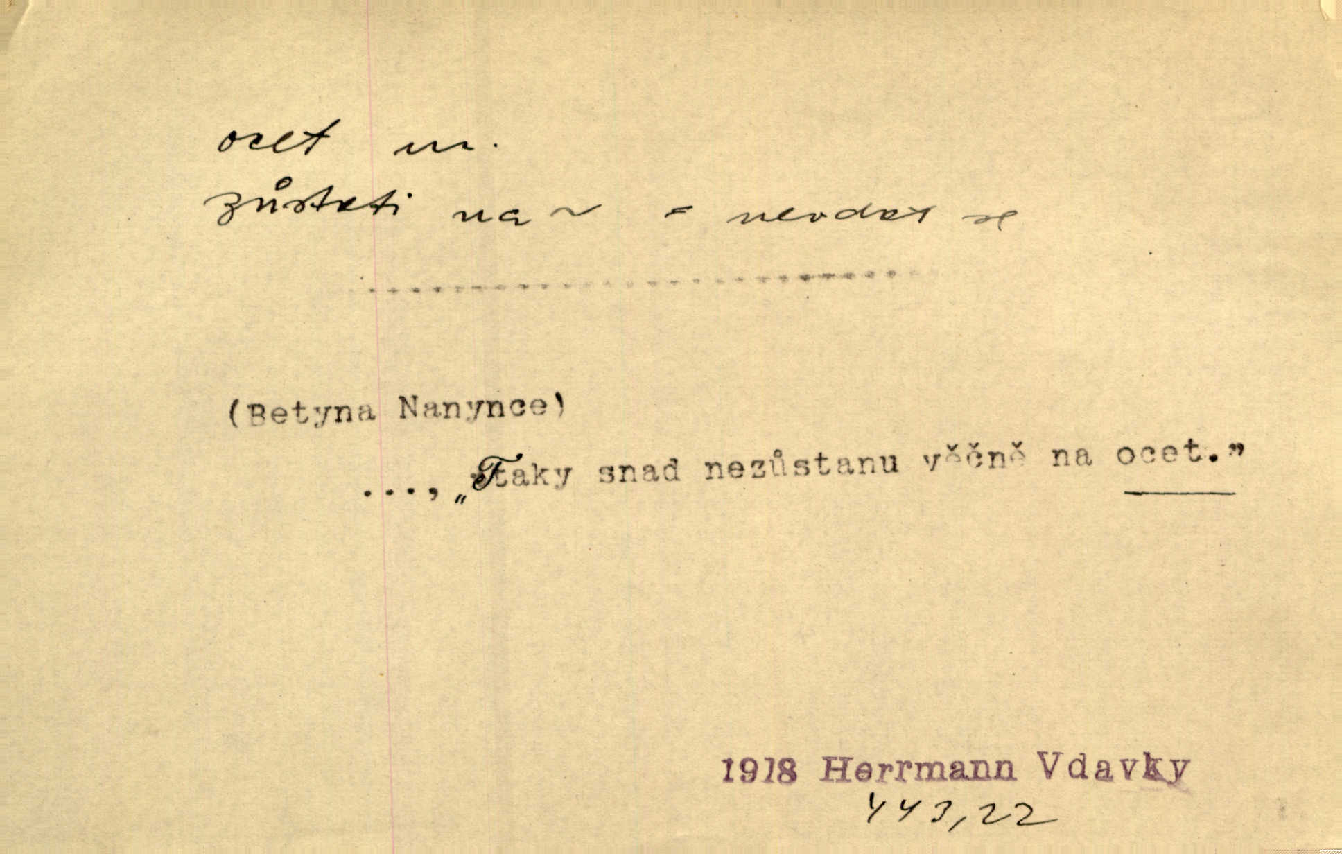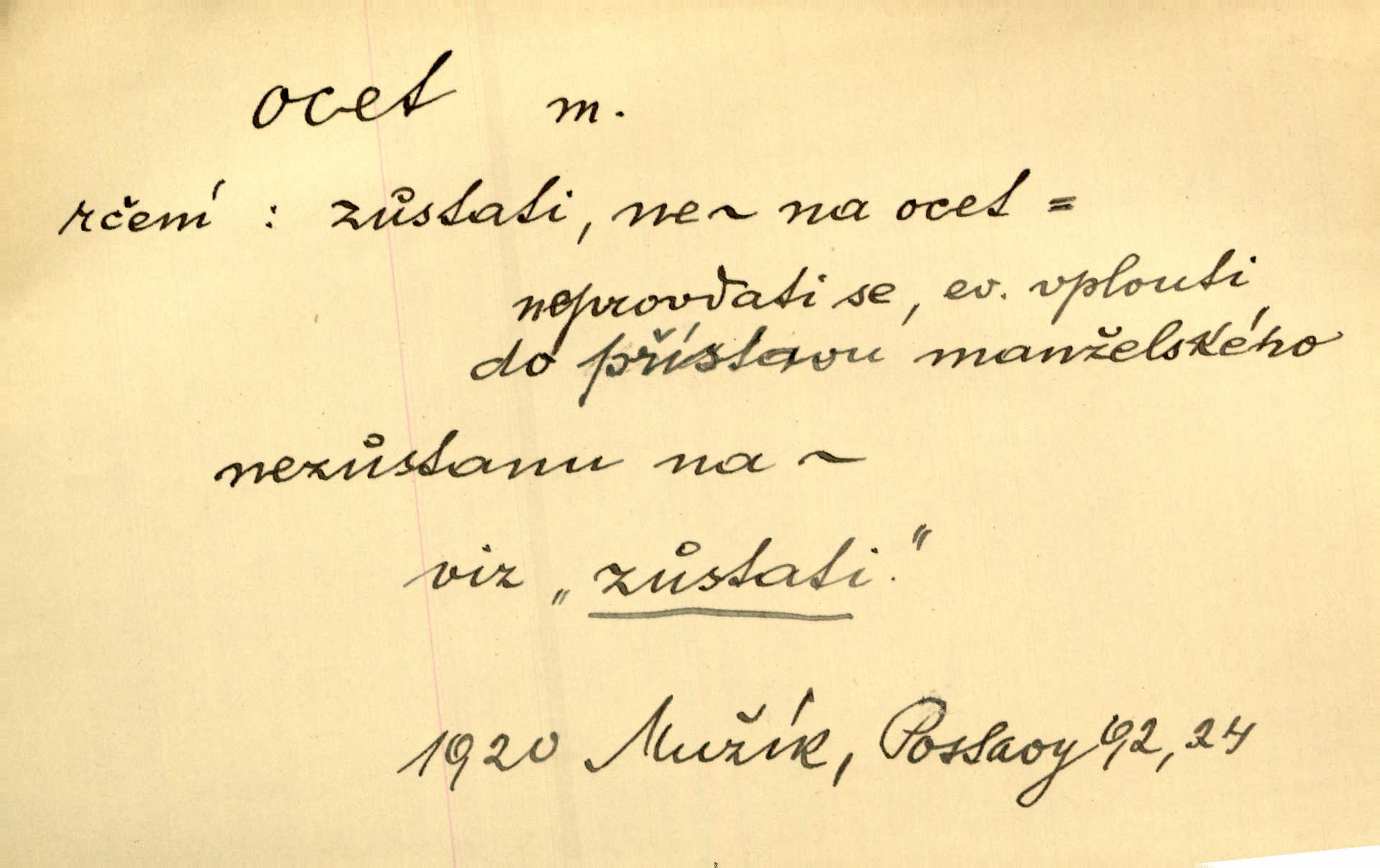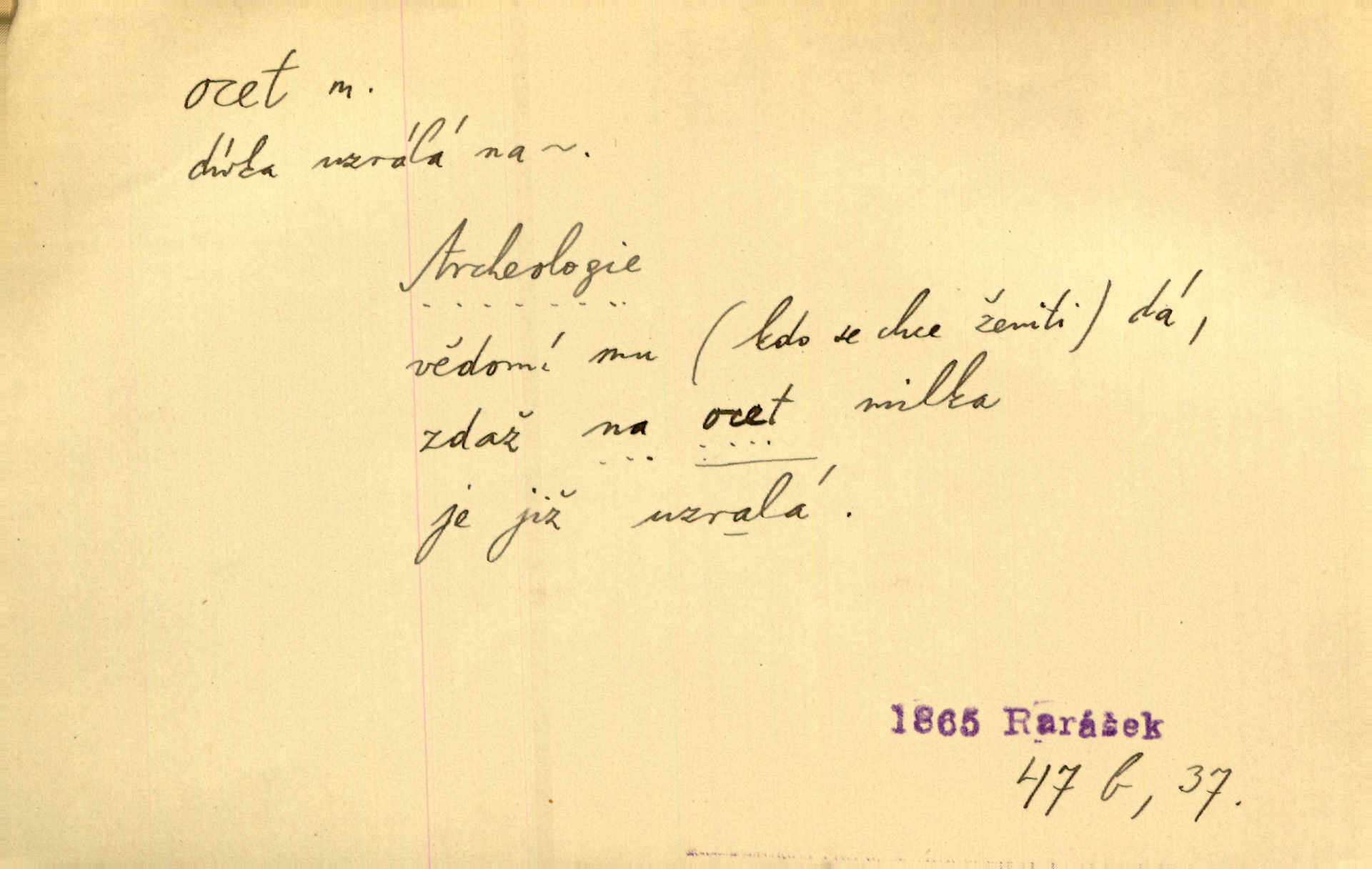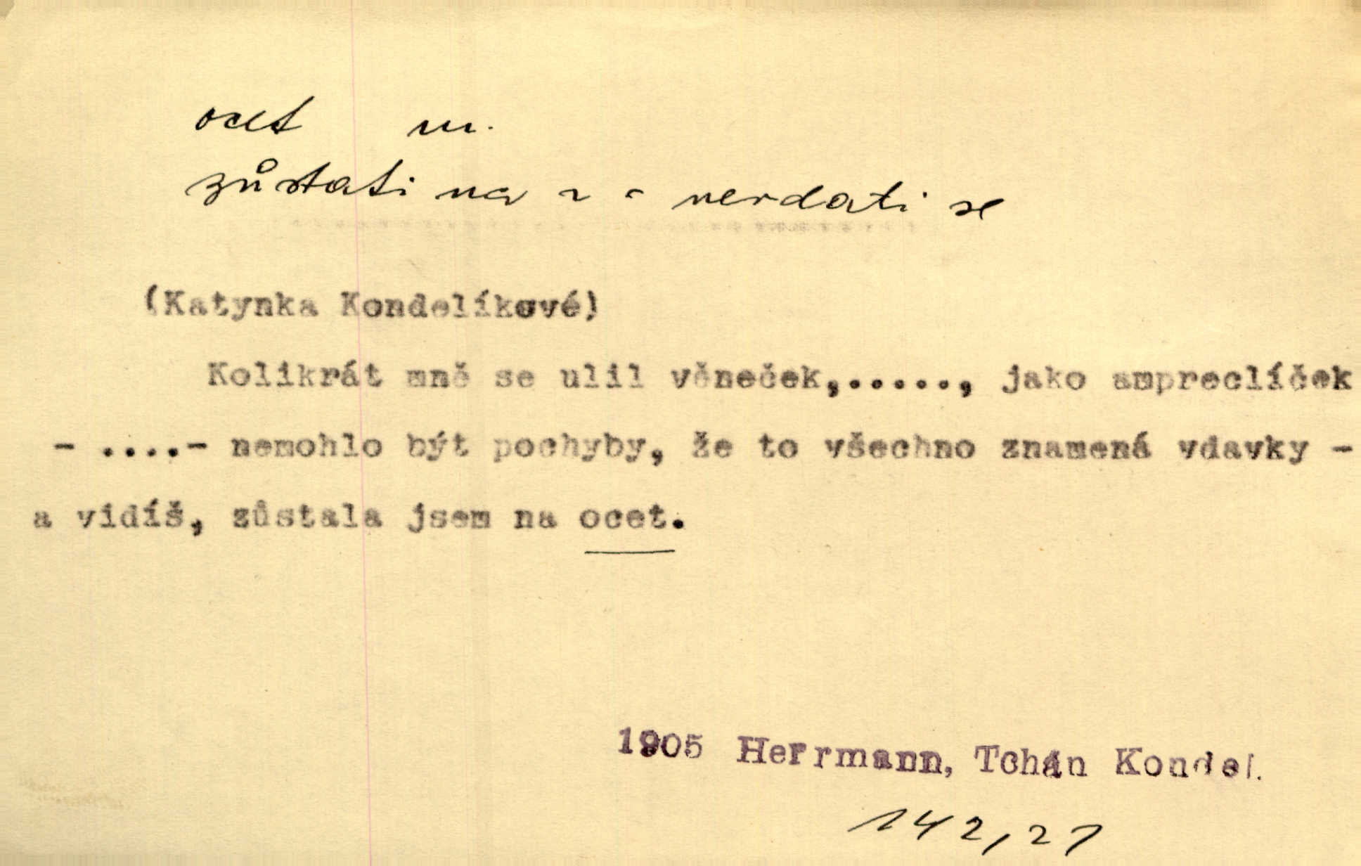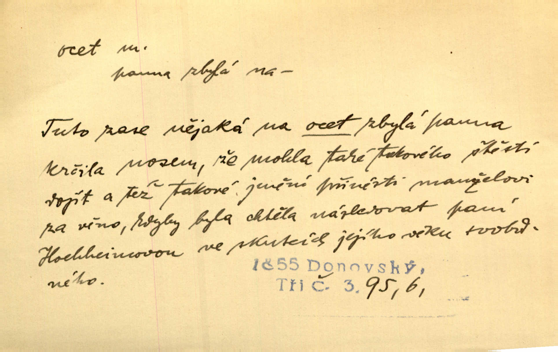 - ocet, -cta m. slabý roztok kyseliny octové, jehož se užívá v domácnosti, hl. v kuchařství. Přinášela ocet, kolínskou vodu a pokoušela se s contessinou, aby ho vzkřísily. Zey. Počala sháněti ocet k obkladu. Vach. Ustál. sp. Poslední slova vyplynula z dědečkových úst, jakoby se byl octa napil. Rais. Čas svrchovaný, abych se oženil, nechci-li zkysati na ocet stát se starým mládencem. Šmil. Nevezme-li si Anýžka ženicha, kterého já jí našel, zbude na ocet neprovdá se. Hol. Trnka nabídl rámě staré paní, Borovec slečně Mély. Doktor, pan Hajný a Jelínek zbyli na ocet nedostalo se na ně. Šmil. Nobl slečinky jsou také rády, když jim někdo pomůže z octa. Herrm. Teď stojí [slečna na plese] celou noc, nikdo si jí ani nevšimne, prodává ocet jeden kousek za druhým není brána k tanci. Her. Dobrá polovina tancechtivých děvčat točila v nich [plesech] ocet. Vrba. Ale jen opatrně! Abych si s honorací nerozlila ocet nepohněvala si ji. Jah. Mám u něho [představeného] rozlitý ocet; nevím, spravím-li si to ještě. Šal. Houby s octem ví takové děvče, jako je Štěpánka! nic. Ros. Kuch. vinný ocet vyráběný z vinných matolin. D něco, co má nějakou vlastnost octa. Přinutí tě, abys chlastal nějaké rýnské octy kyselá vína. Med. Přen. Tvář jeho se vyjasňovala víc a více, ocet a žluč vypařovaly se z ní ponenáhlu kyselost. Herrm. Ven vyhlédla tvář [představené] a úsměvem se stáhla, v němž s octem v zápasu byl sladký med. Vrch.